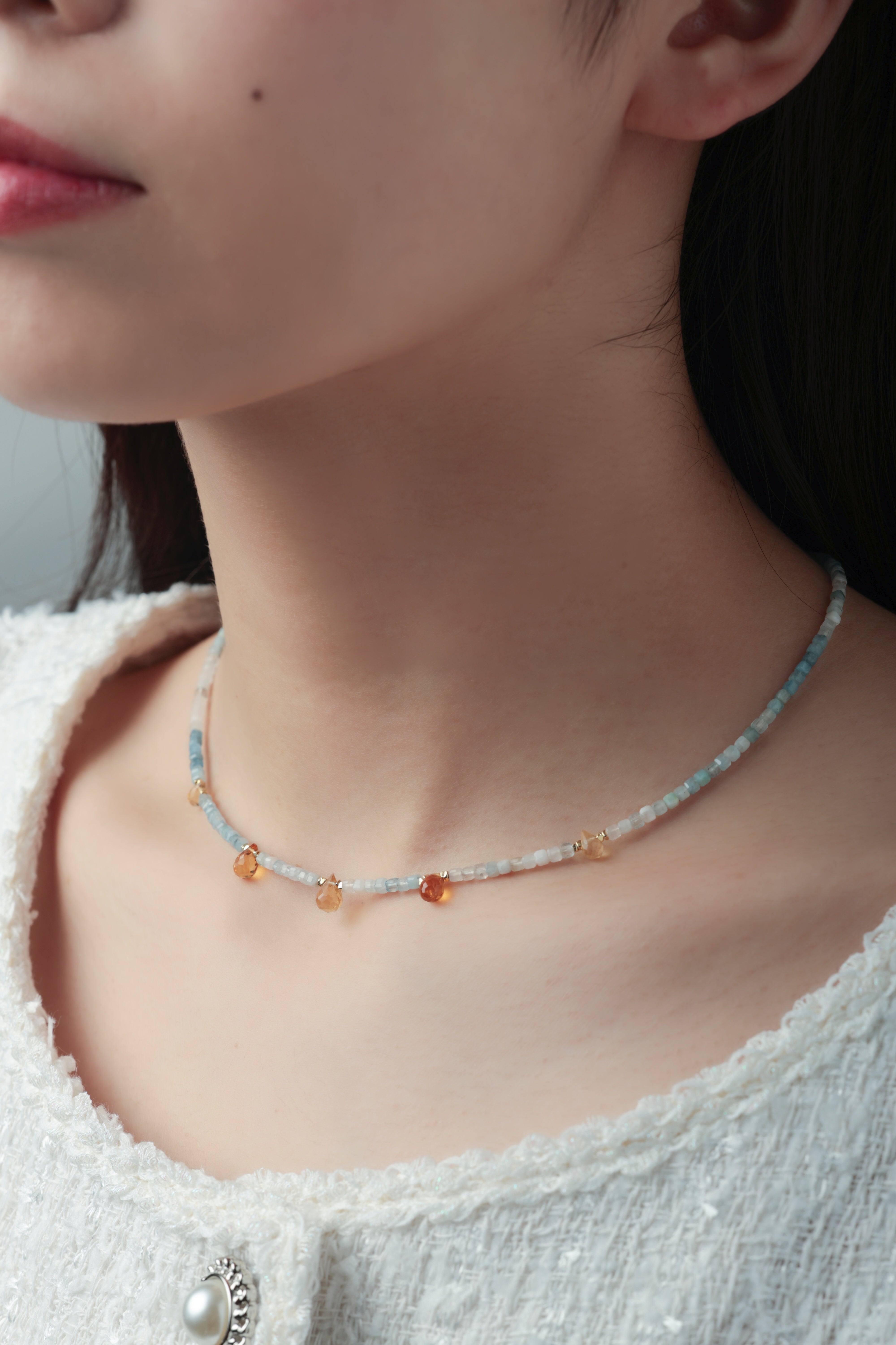 顔まわりのピアスと、首元のネックレスを「青のグラデーション」で揃えることで、統一感のある洗練された印象に。