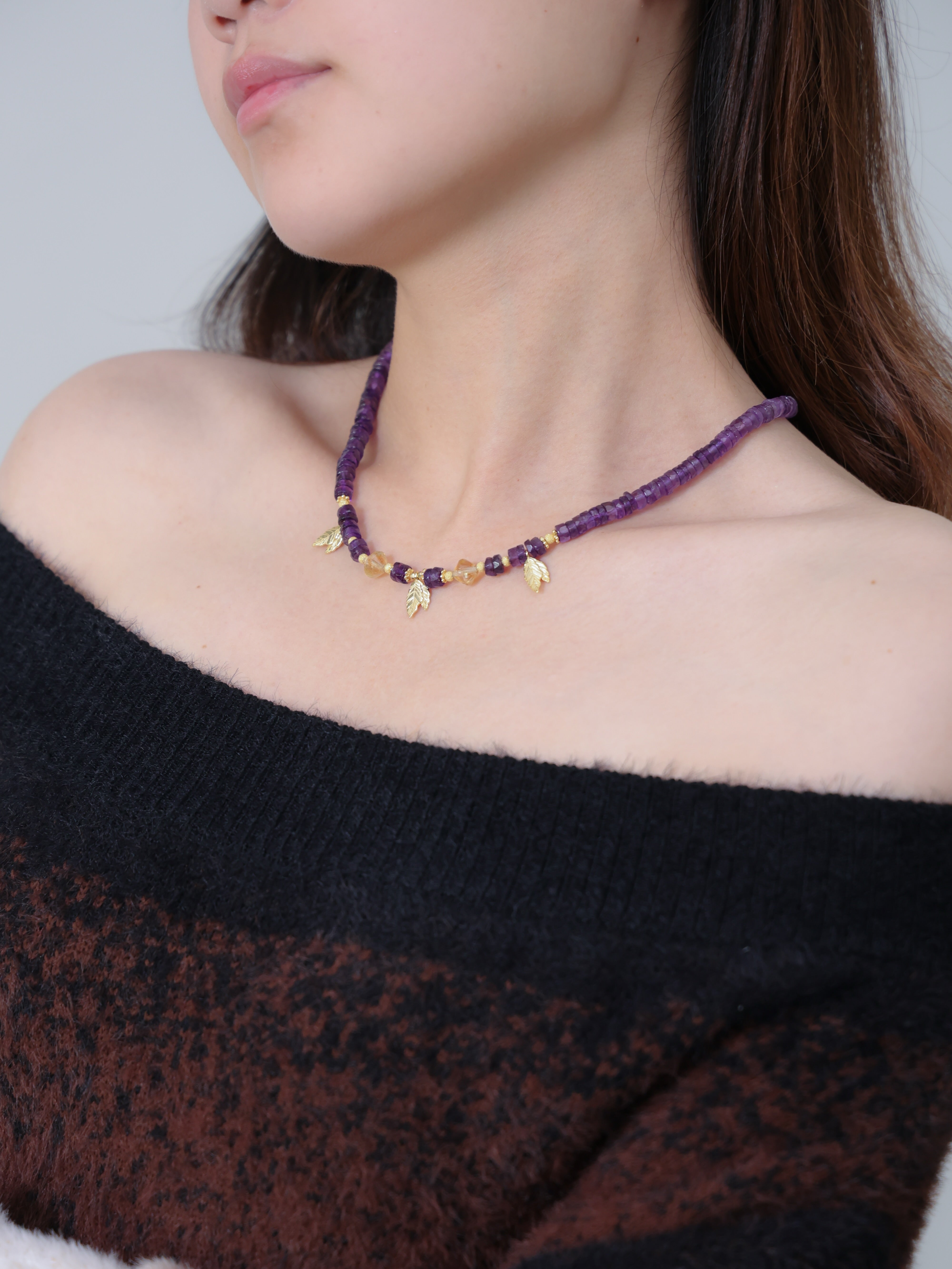 【2月・11月 誕生石】アメジスト シトリン ネックレス | 葉モチーフ 上品 K14メッキ