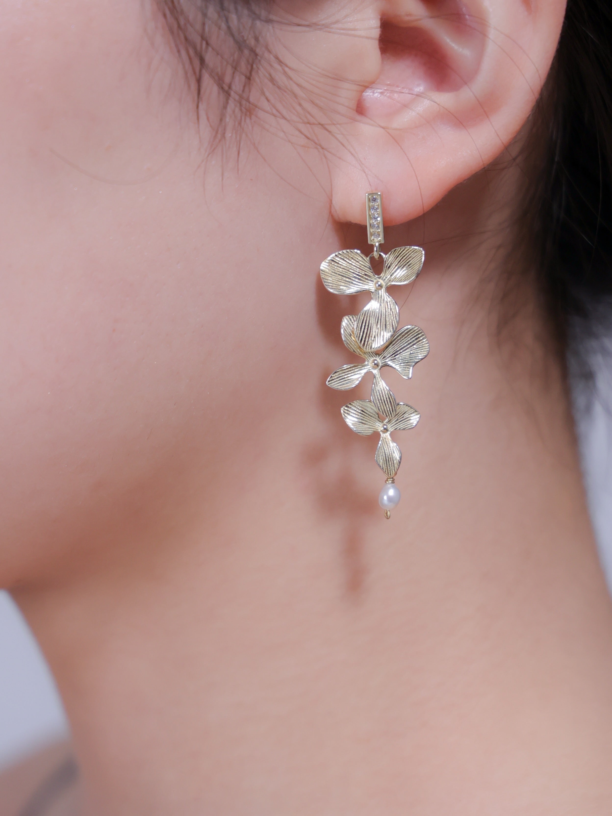 【花モチーフ】3輪のマットフラワー & パール ロングピアス | 揺れる花束 (ゴールド/シルバー)