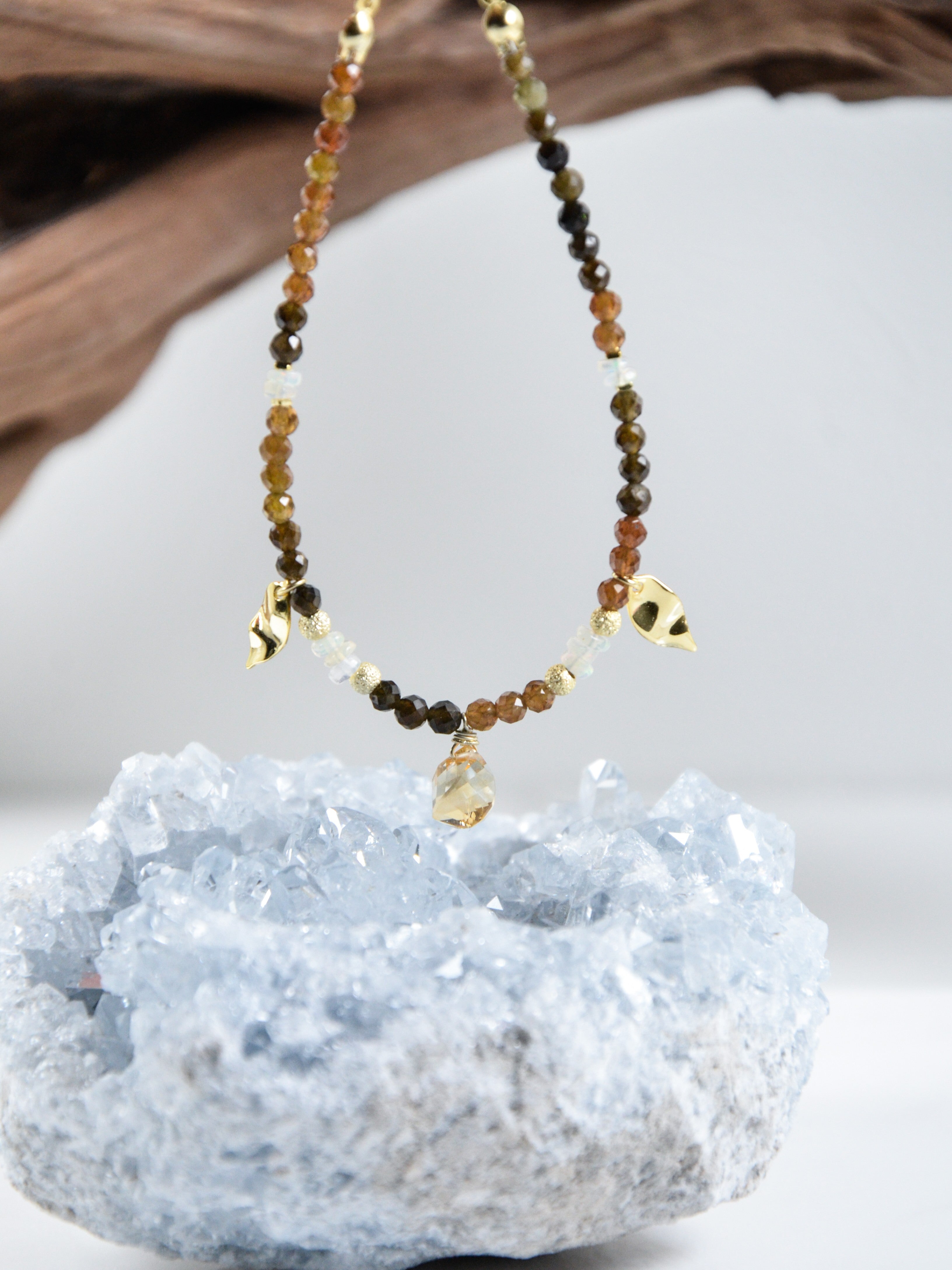 【お守り・華奢】マルチカラー 天然石 ネックレス | リーフ K14メッキ