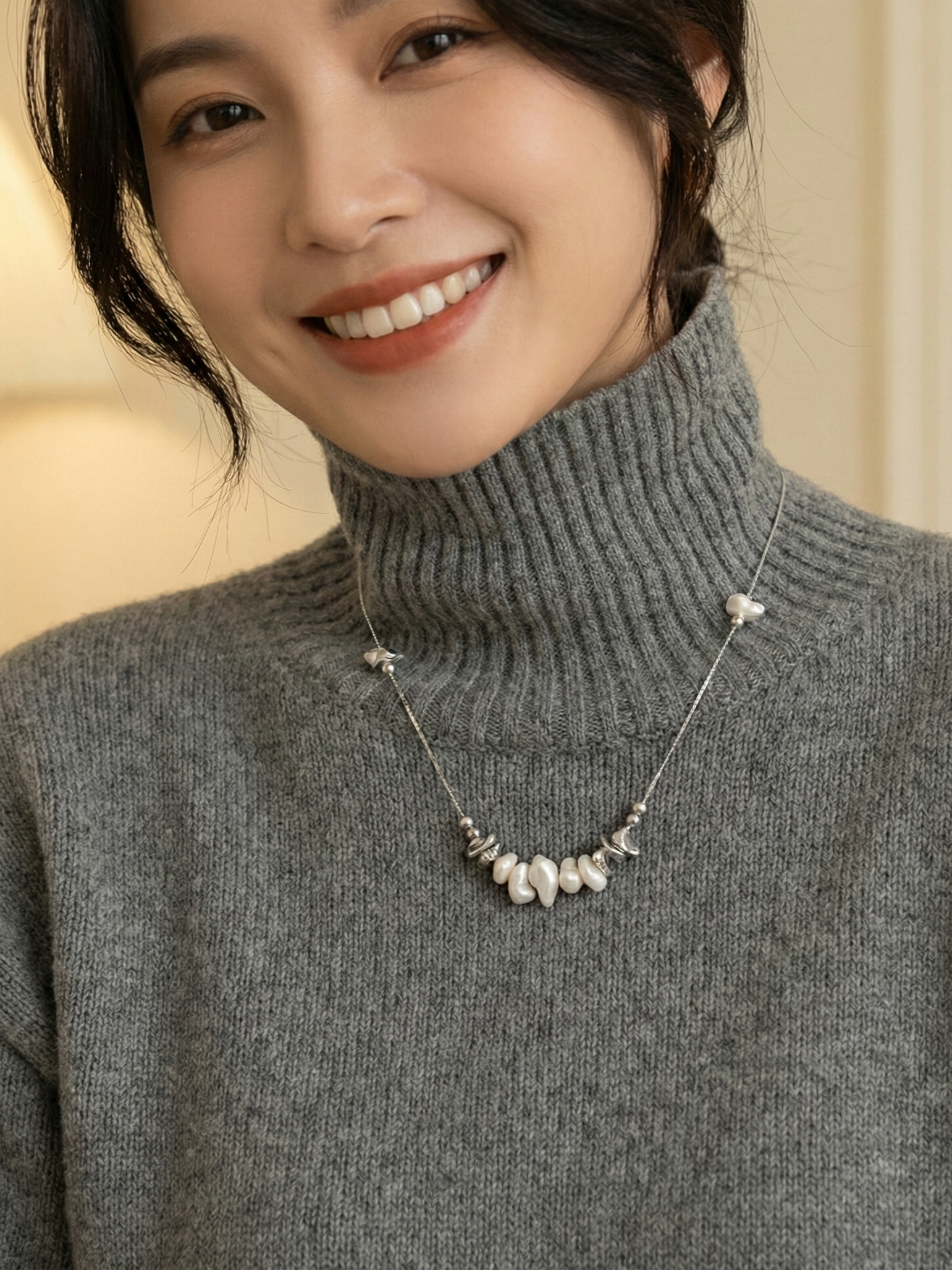 LUCINEのネックレスは、天然石や淡水パールの表情を活かし、神戸のアトリエで一点ずつ仕立てています。肌に触れる金具は S925・14kgf を中心に採用。日常にも特別な日にも、上品でタイムレスな輝きを。