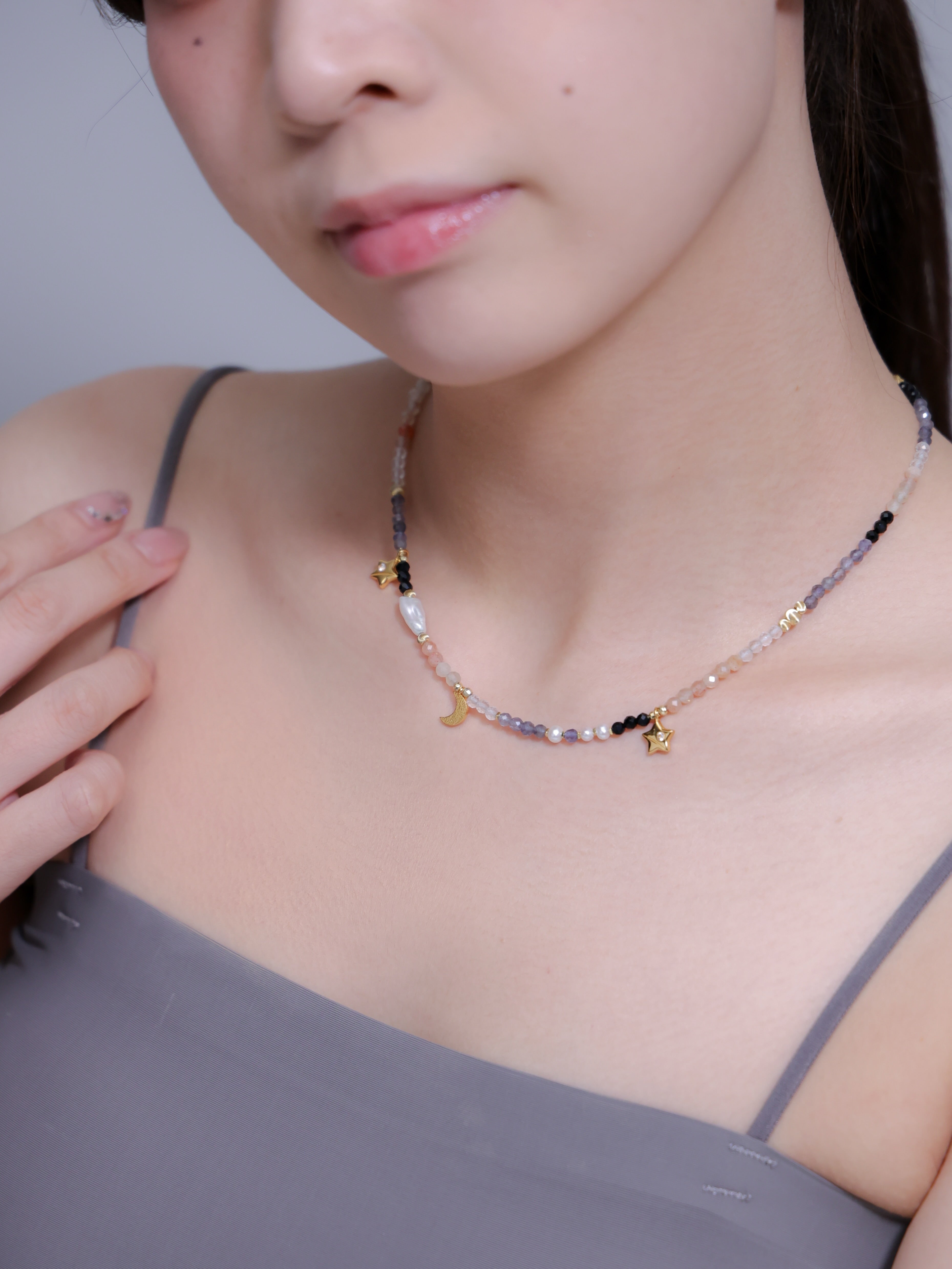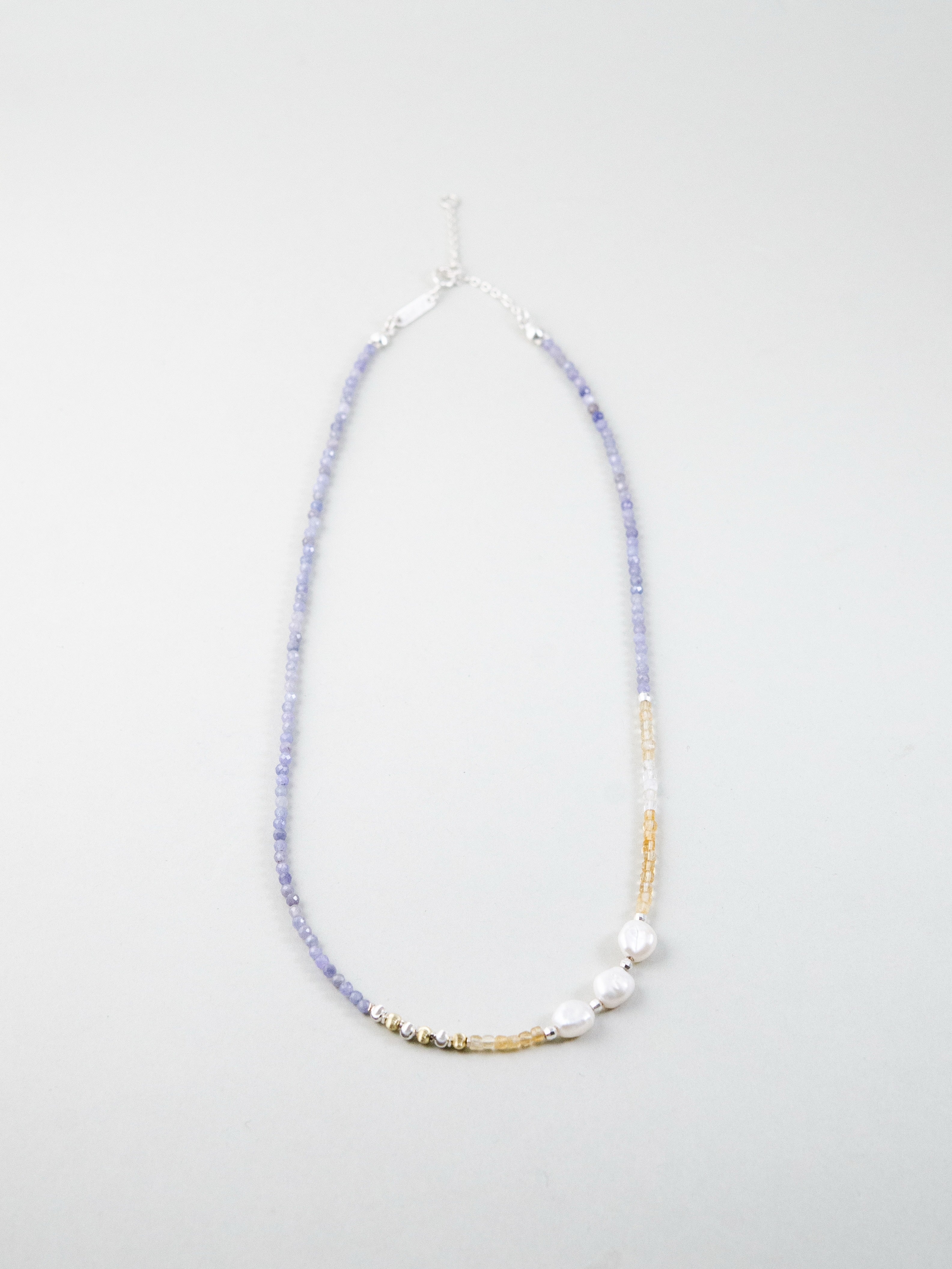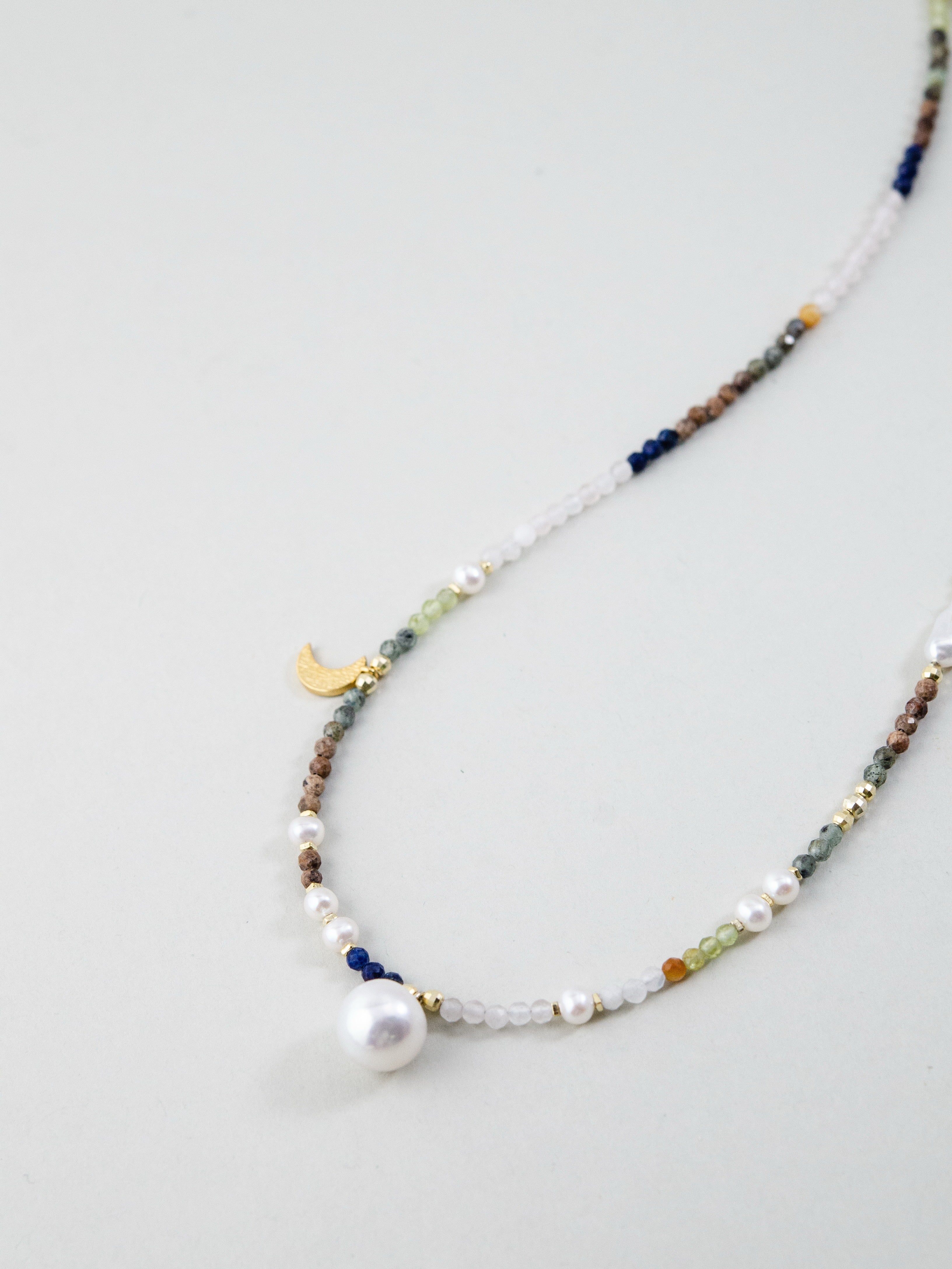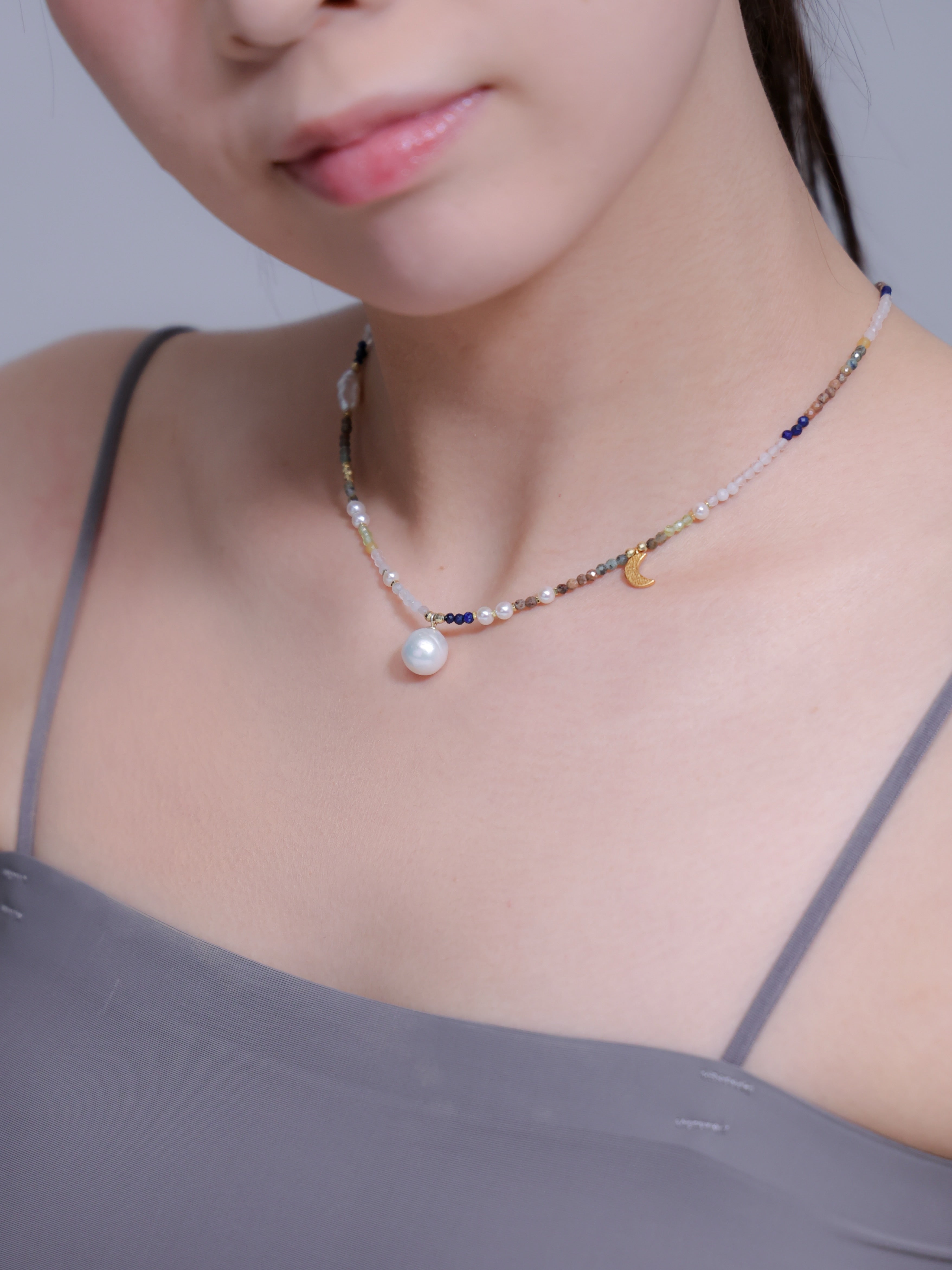 LUCINEのネックレスは、天然石や淡水パールの表情を活かし、神戸のアトリエで一点ずつ仕立てています。肌に触れる金具は S925・14kgf を中心に採用。日常にも特別な日にも、上品でタイムレスな輝きを。