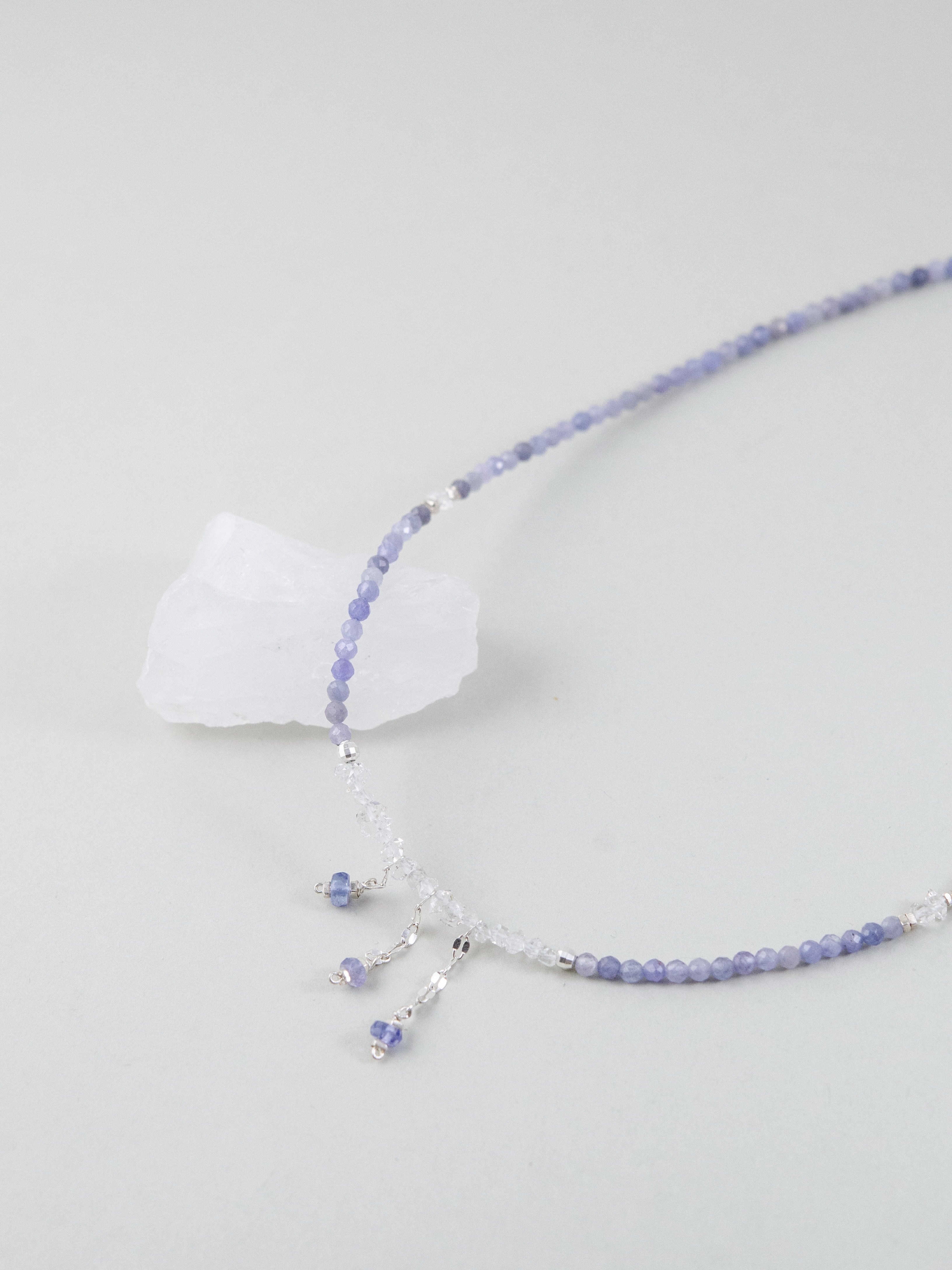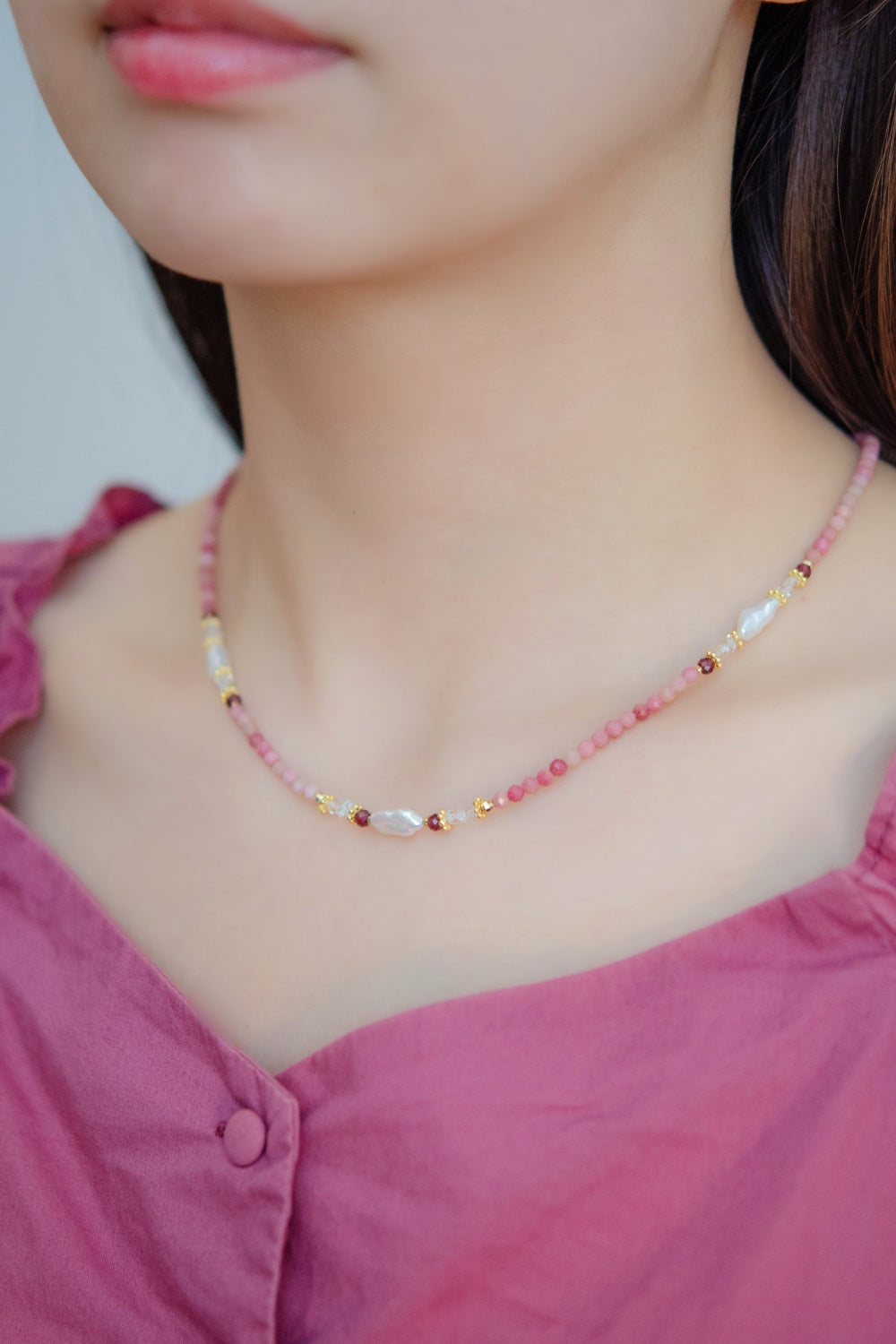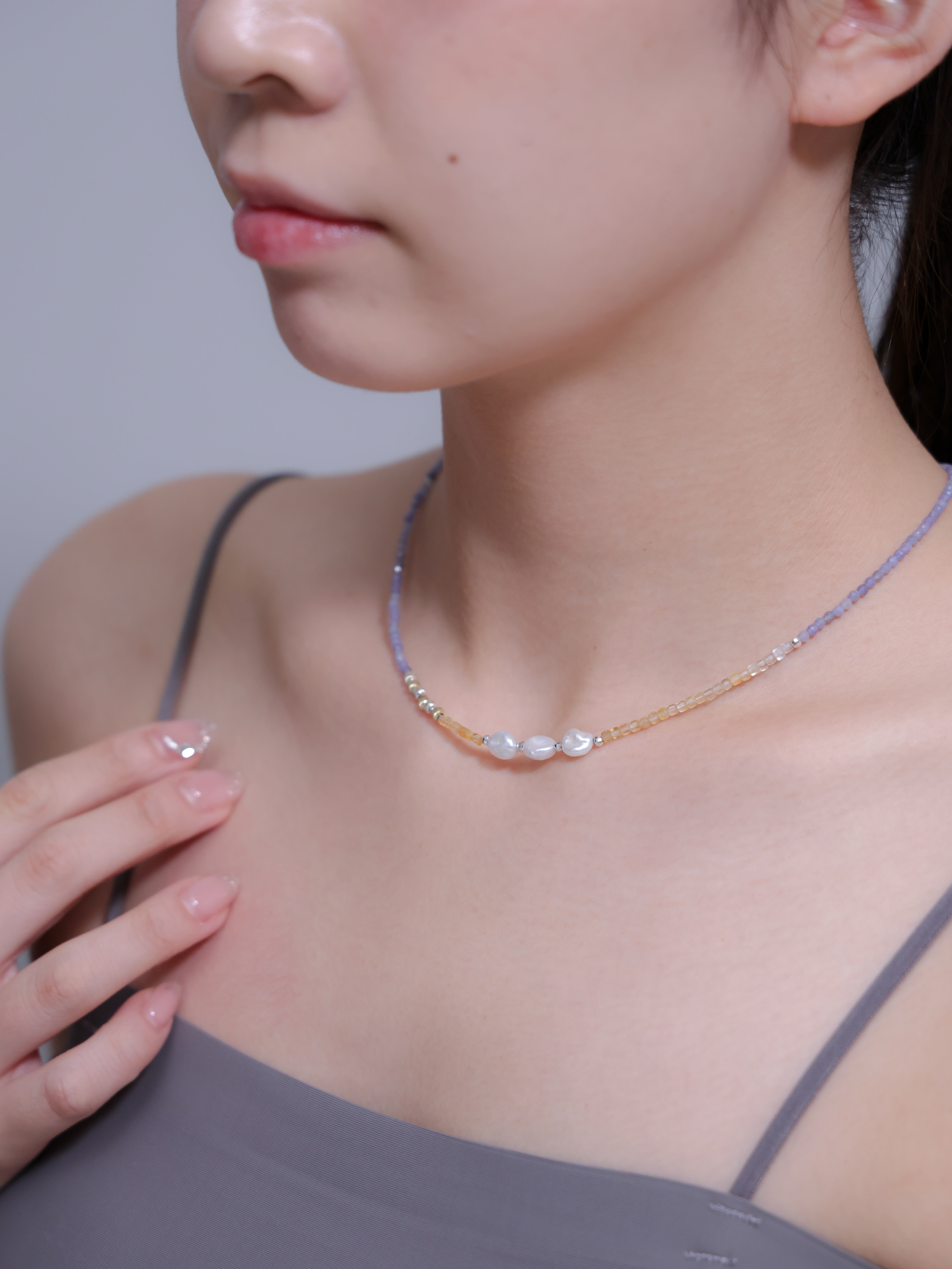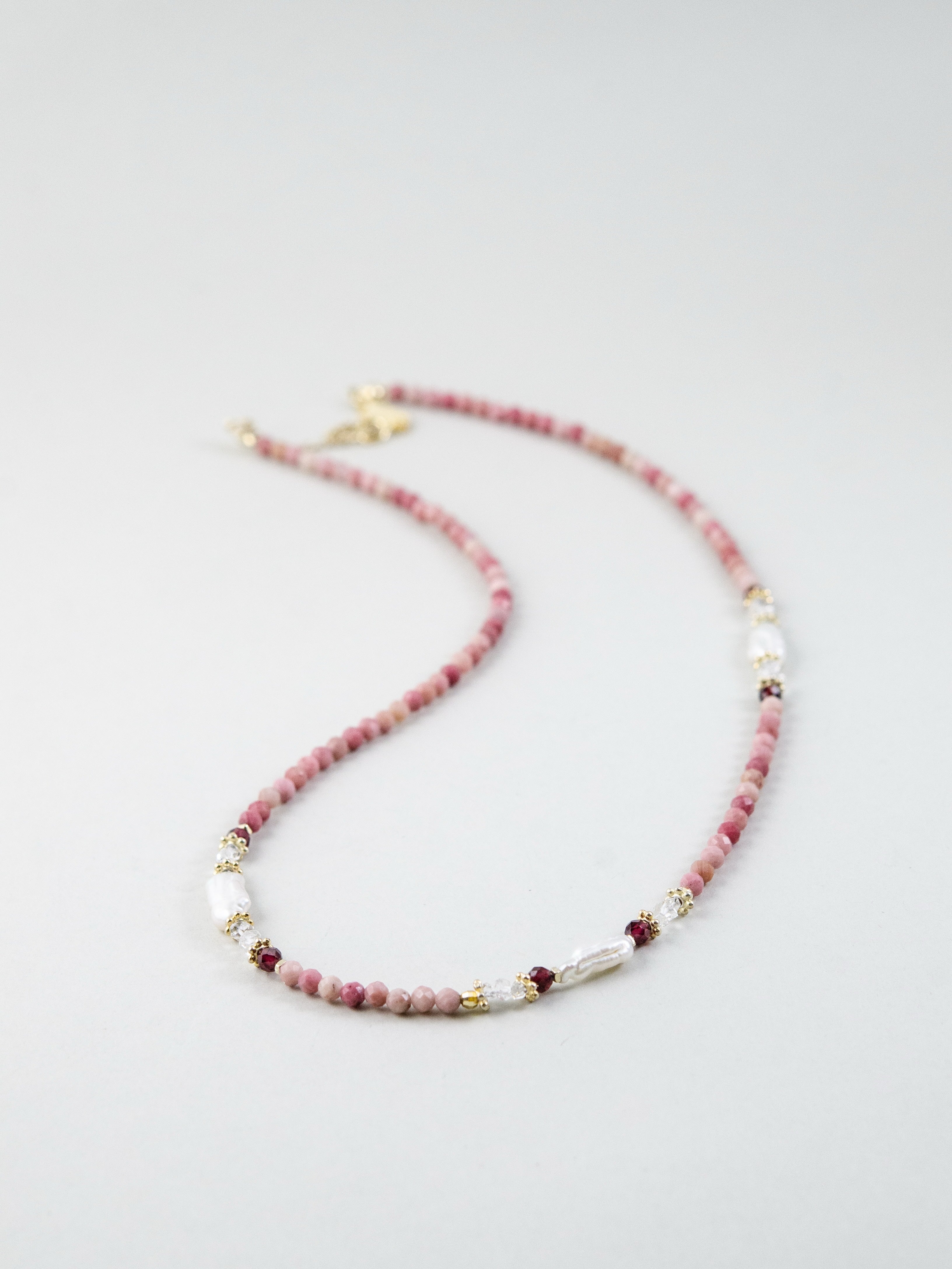 LUCINEのネックレスは、天然石や淡水パールの表情を活かし、神戸のアトリエで一点ずつ仕立てています。肌に触れる金具は S925・14kgf を中心に採用。日常にも特別な日にも、上品でタイムレスな輝きを。