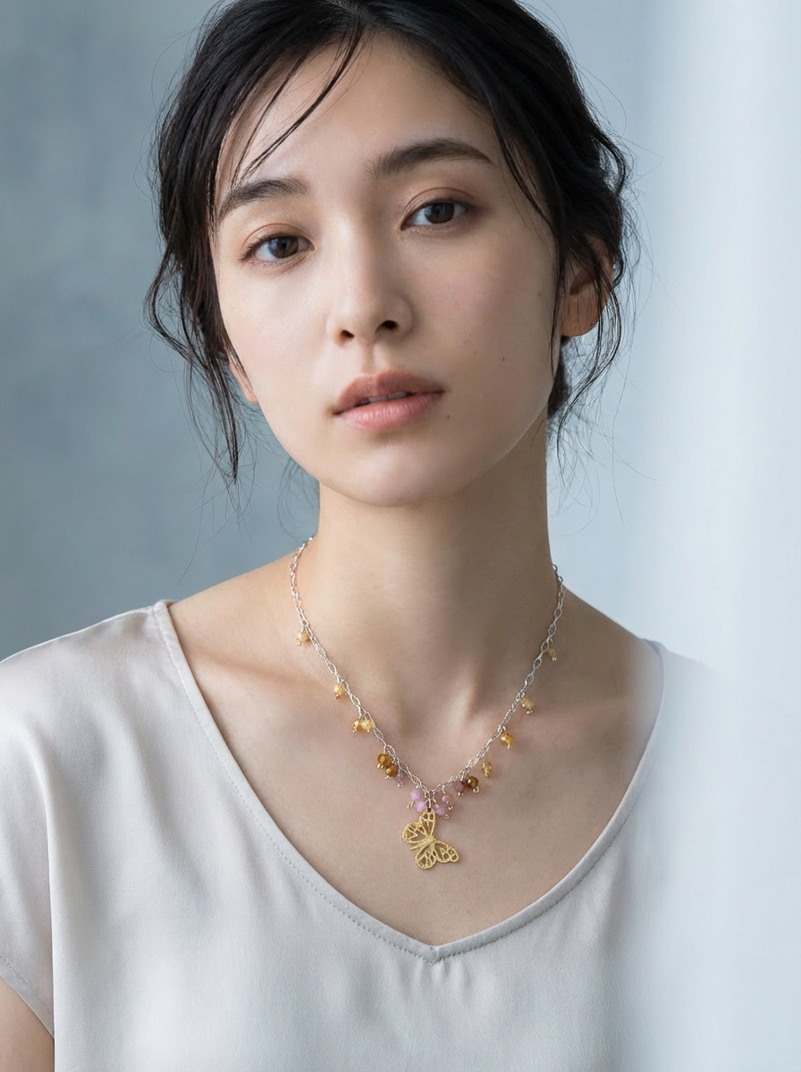 トルマリン & バタフライ チェーンネックレス - 【花に舞う蝶】可憐な天然石とミックスメタルの輝き / SV925