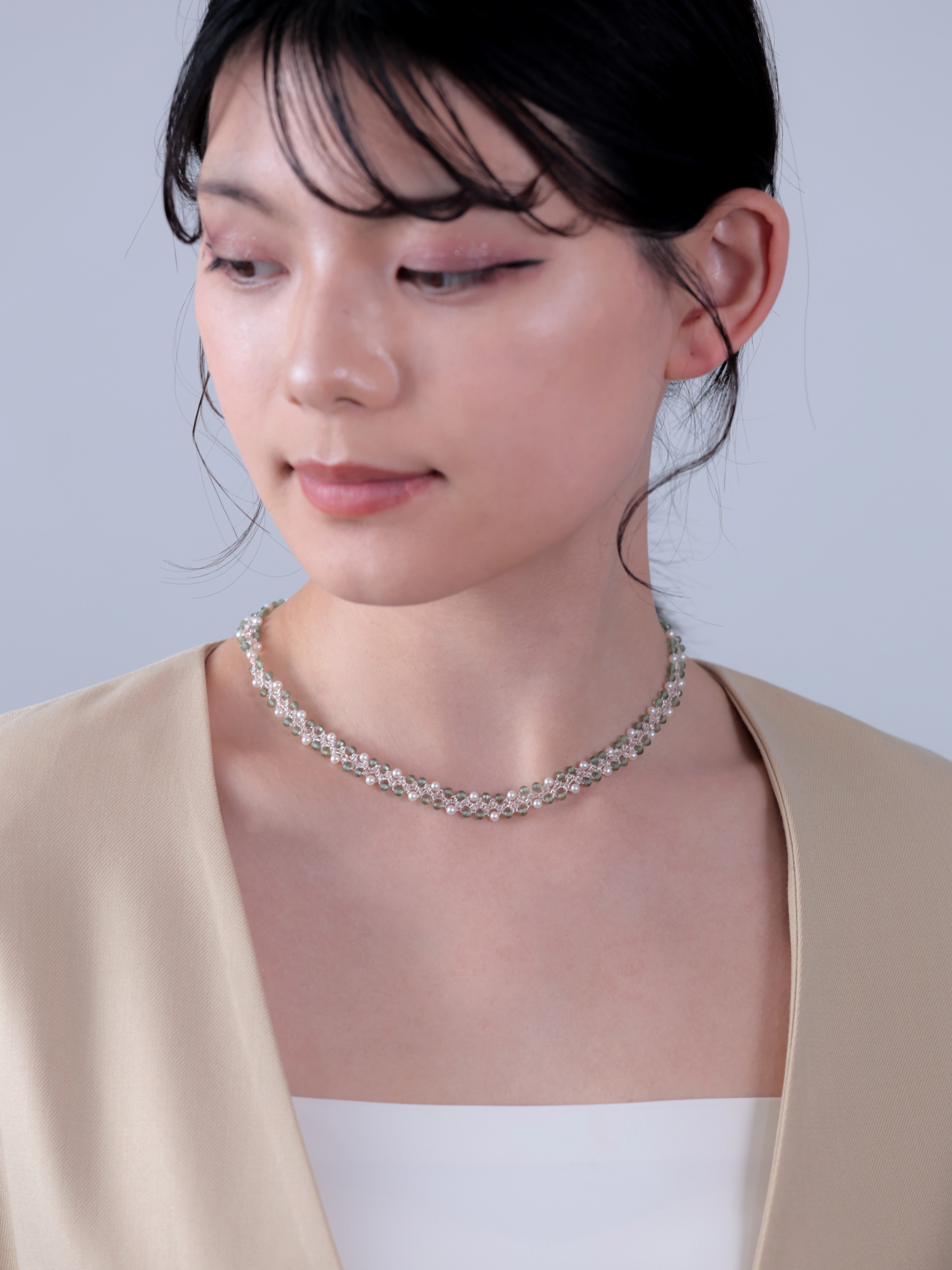ダイオプサイド×パール タティングレース ネックレス - 【若葉のしずく】 繊細な手編みアーチ / 40cm