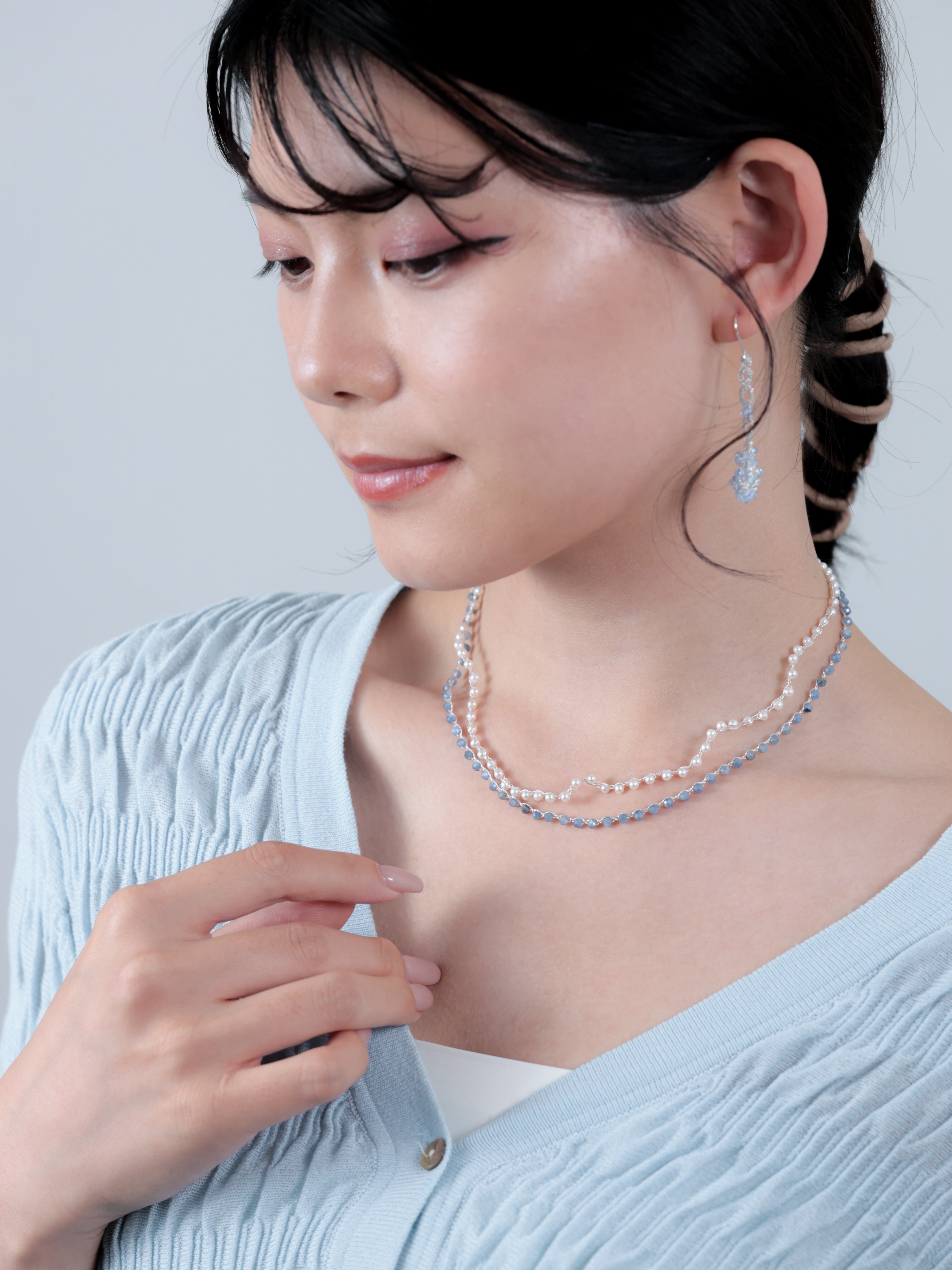 カイヤナイト × 淡水パール 2連 ロングネックレス - 【深海の月光】銀糸のクロッシェ / 85cm