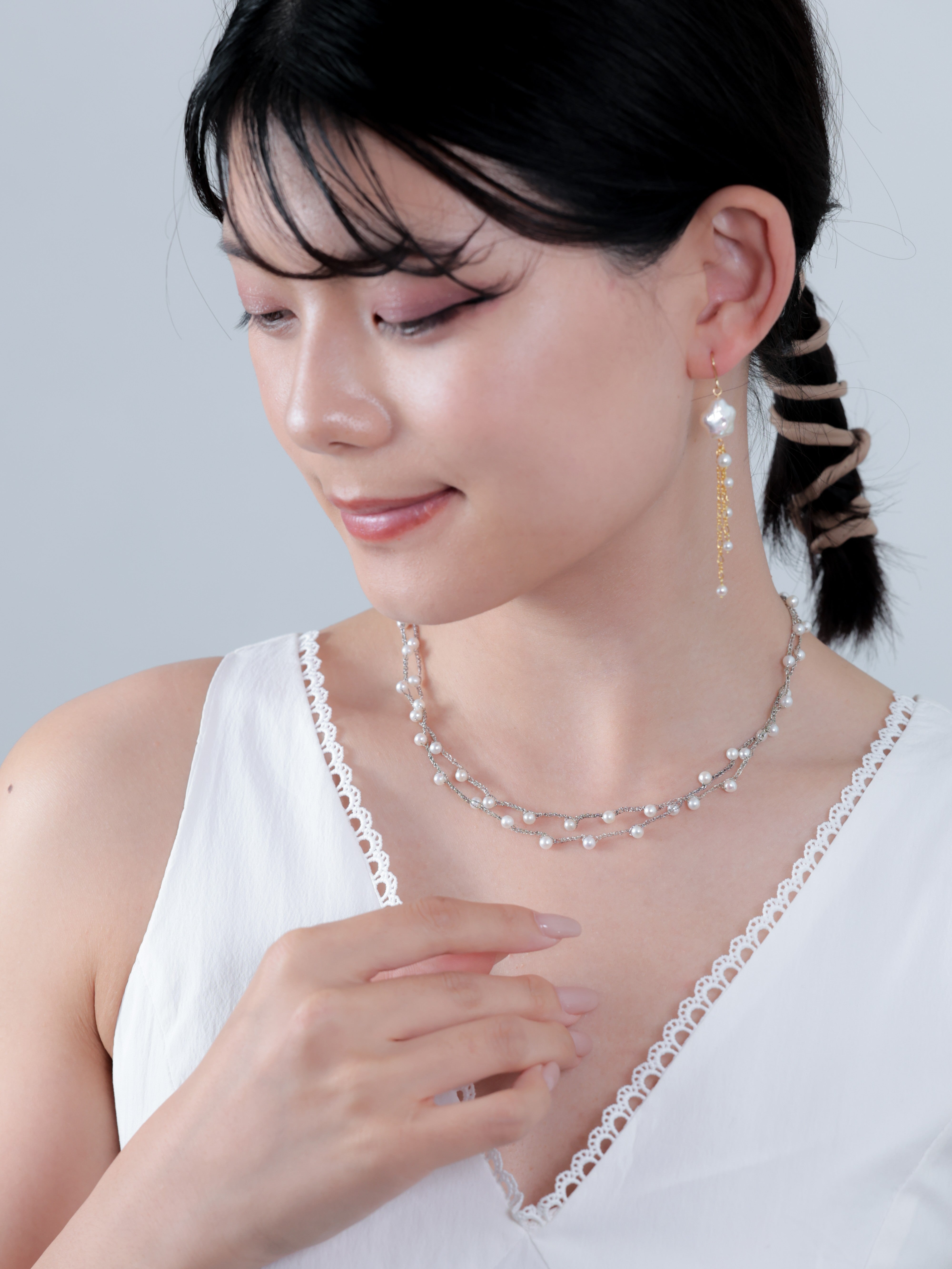 淡水パール 2連ロングネックレス - 【白雪の円舞曲】銀糸のタティングレース / 95cm