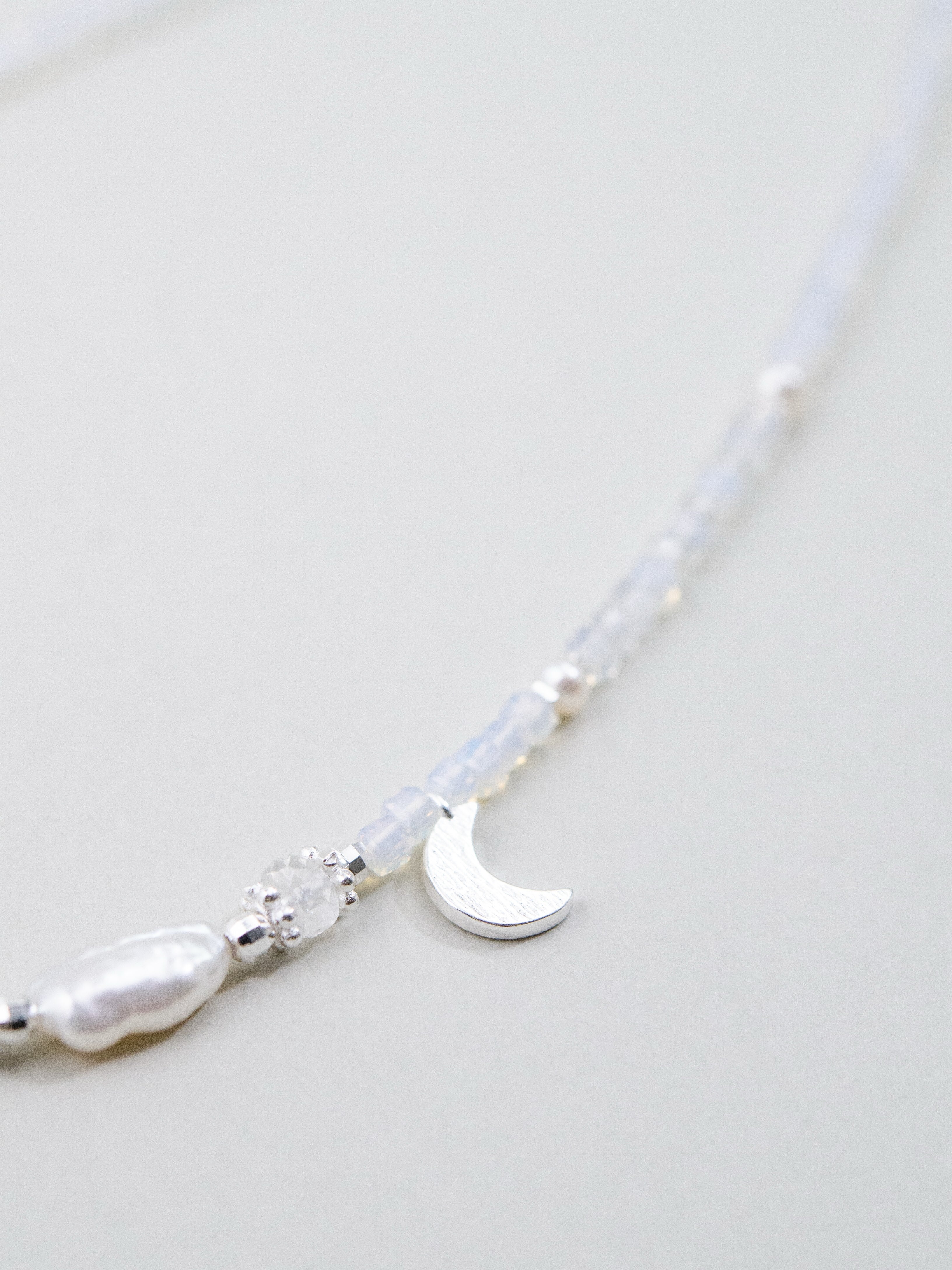 ラピスラズリの群青、ムーンストーンの青白いシラー、淡水パールのやわらかな艶——天然石の表情をいかしたジュエリーです。神戸のアトリエで一点ずつ丁寧に仕立てています。