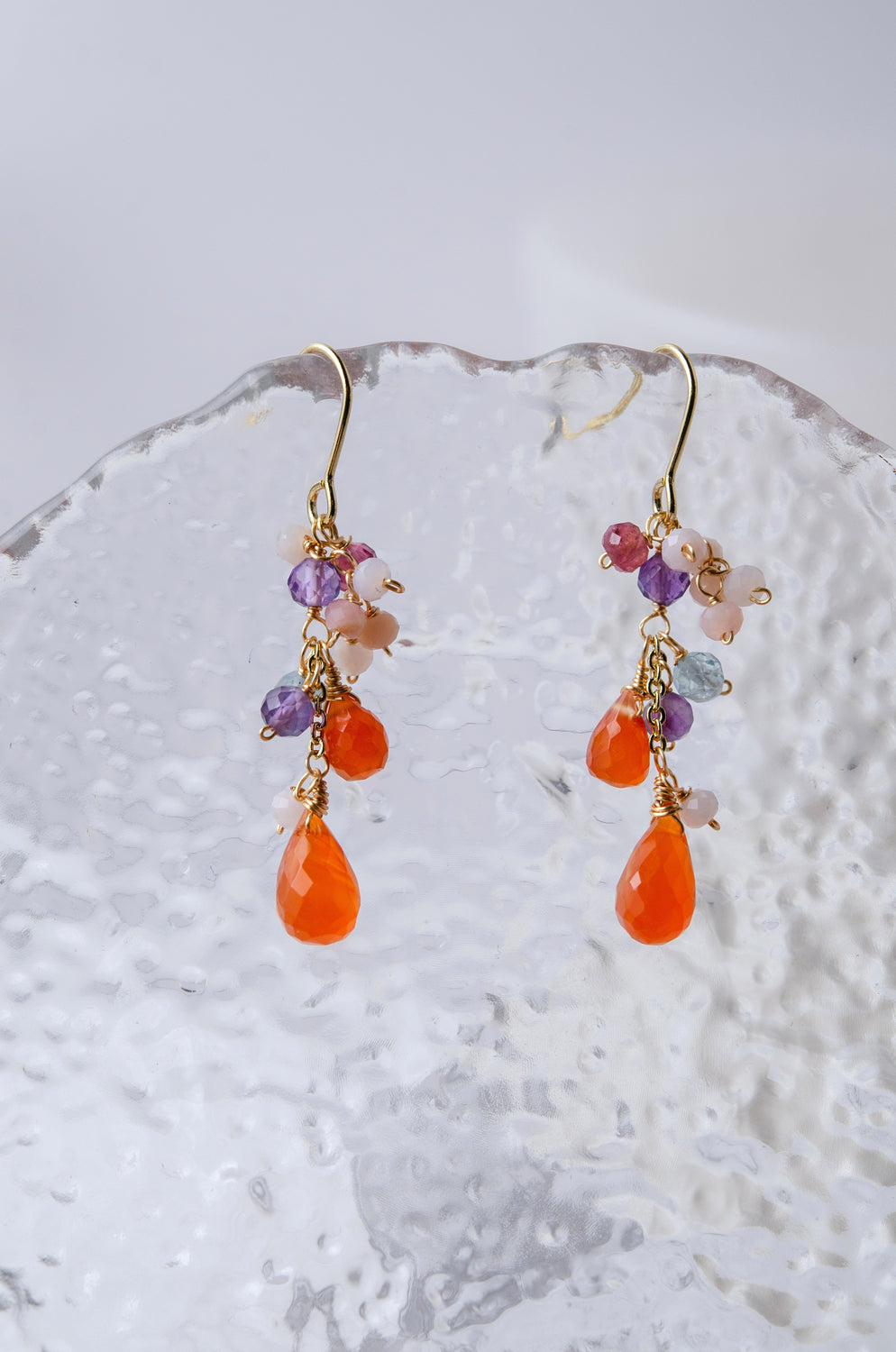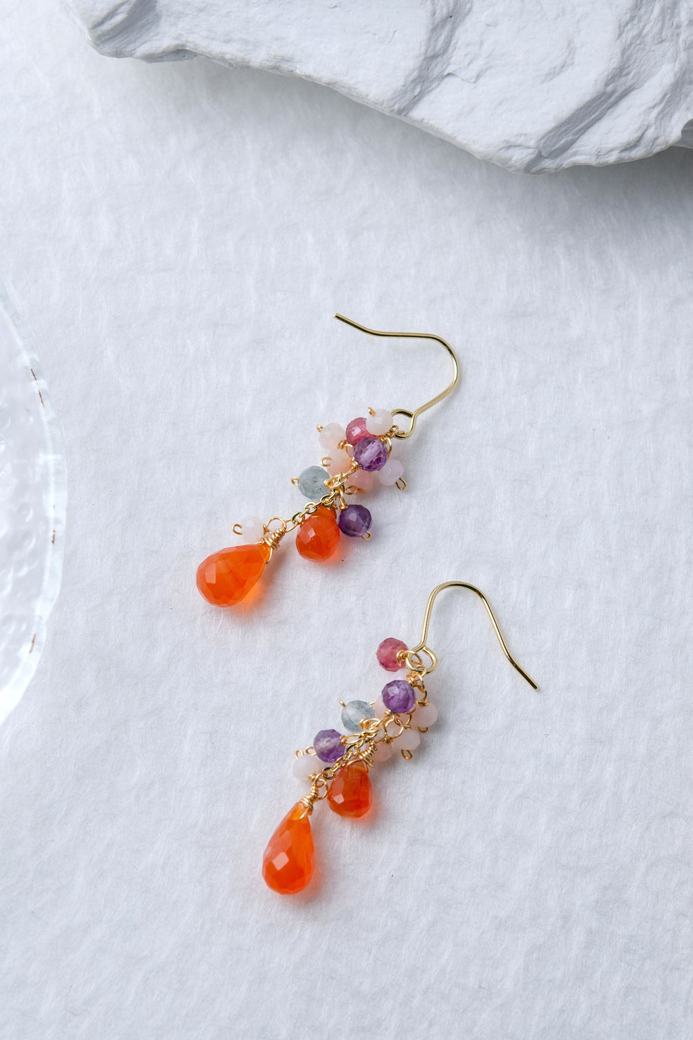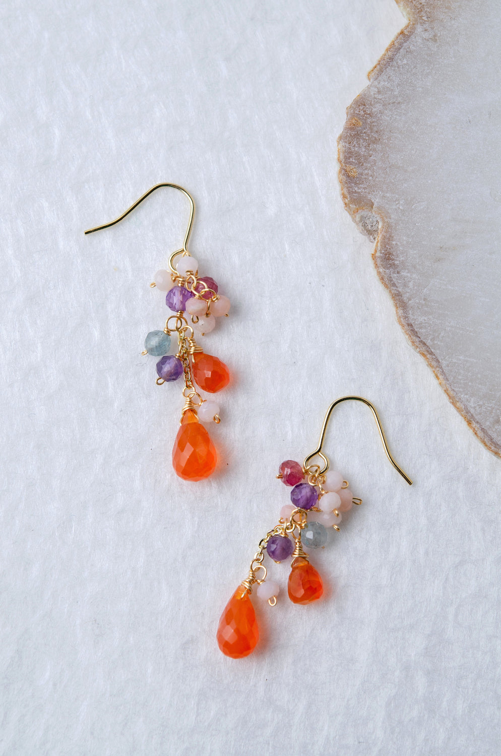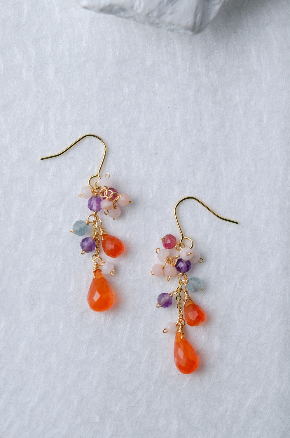 🌿 에디자인 컨셉 <br>열정적인 오렌지 카네리안을 주역으로 투명감 넘치는 플로라이트와 부드러운 색조의 오팔을 맞춘, 풍부한 귀걸이입니다.