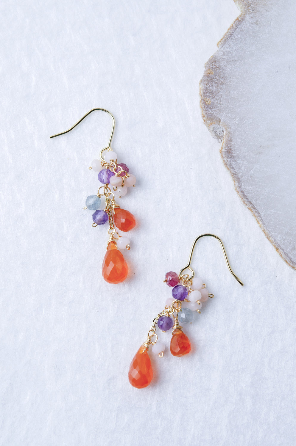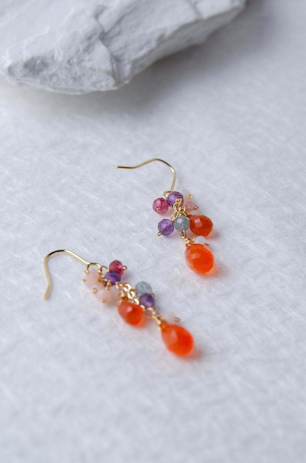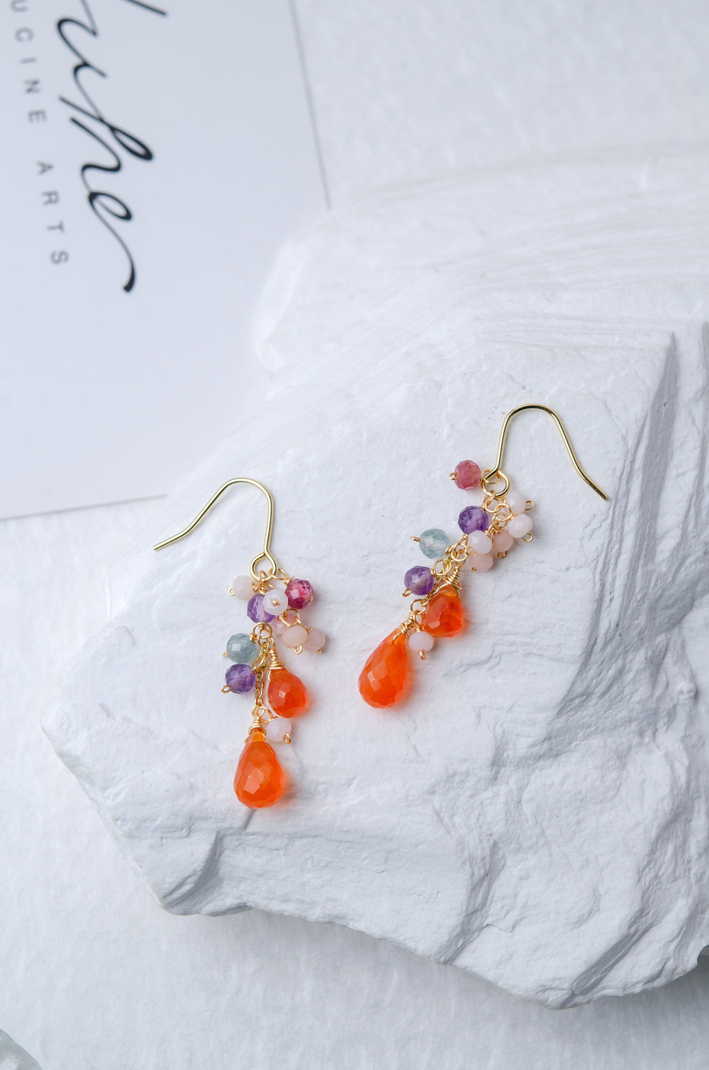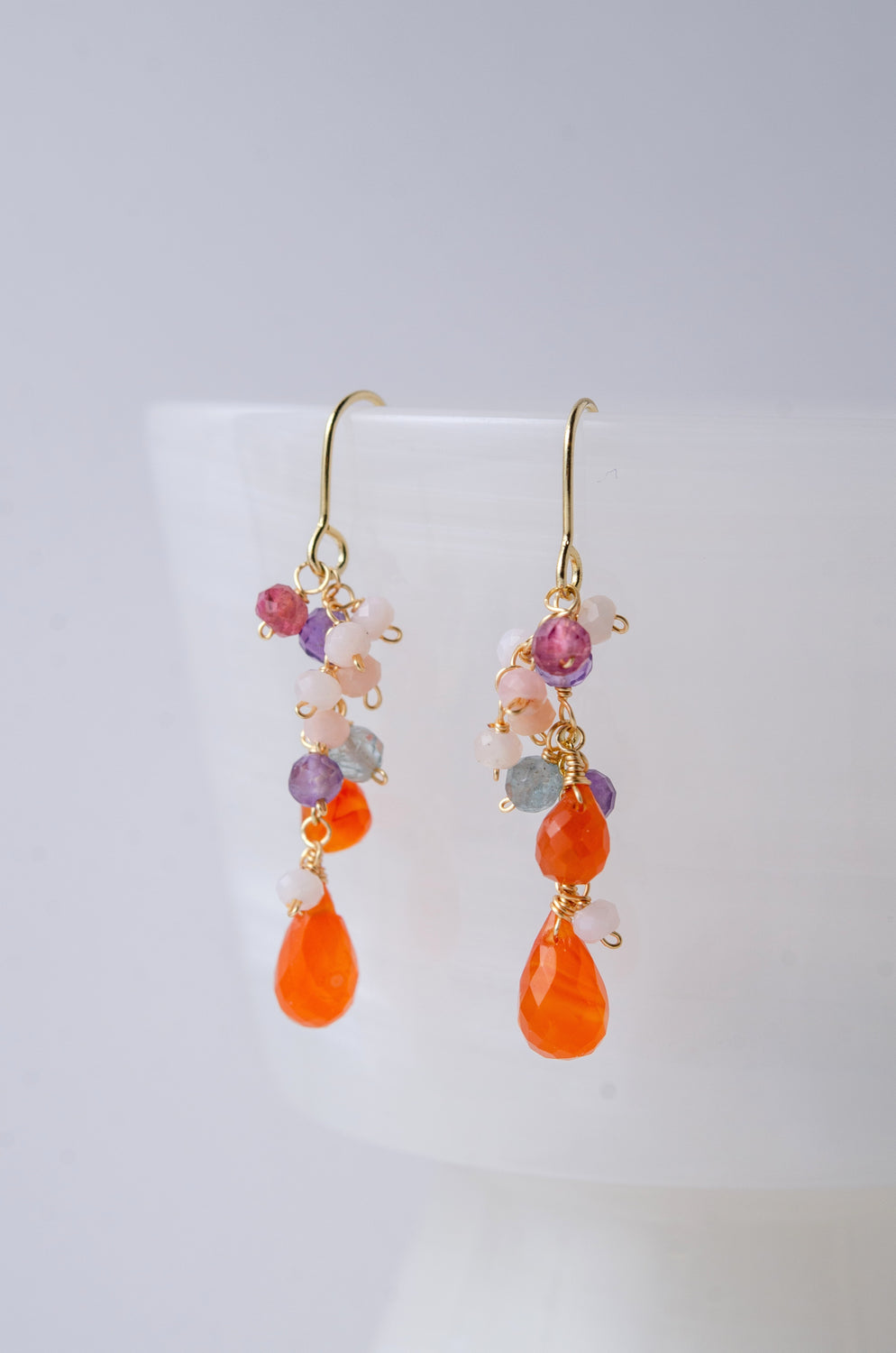 🌿 에디자인 컨셉 <br>열정적인 오렌지 카네리안을 주역으로 투명감 넘치는 플로라이트와 부드러운 색조의 오팔을 맞춘, 풍부한 귀걸이입니다.