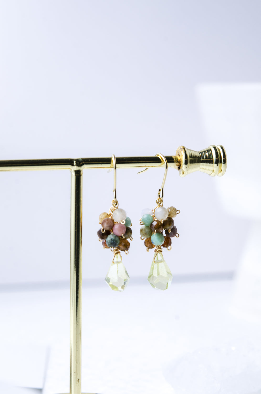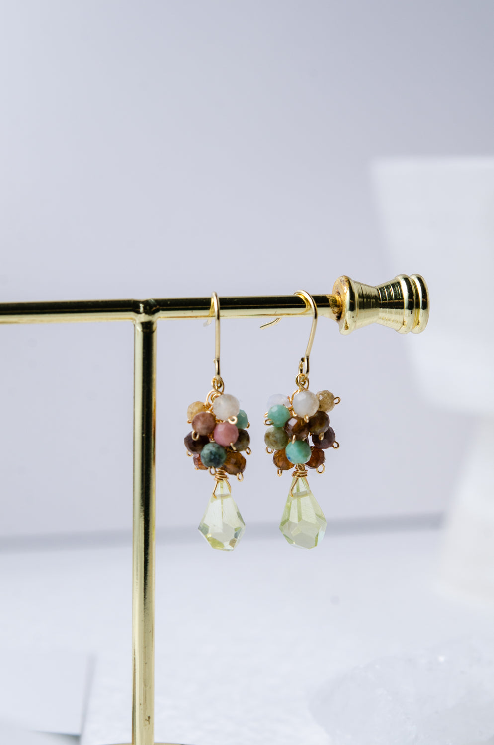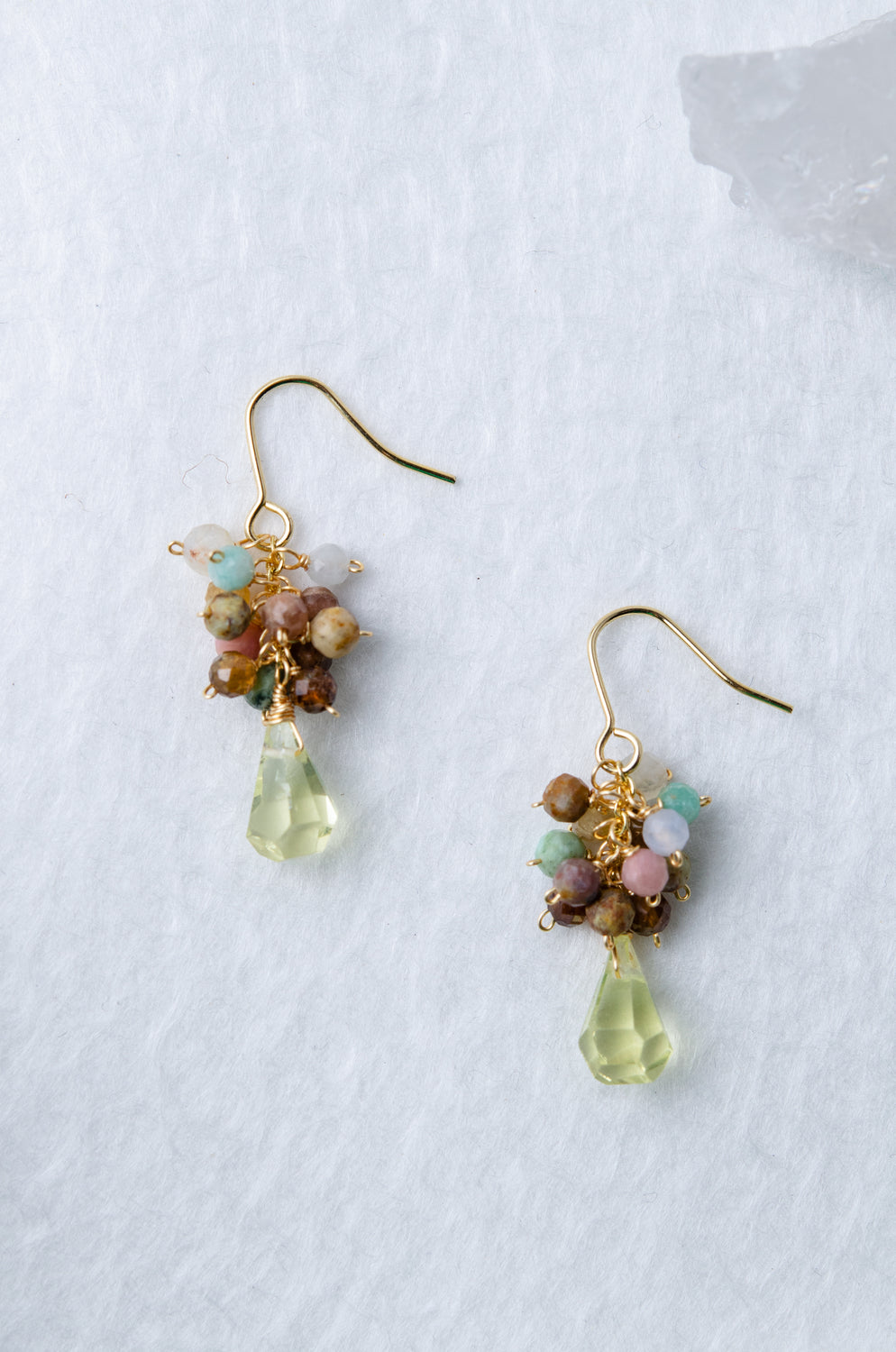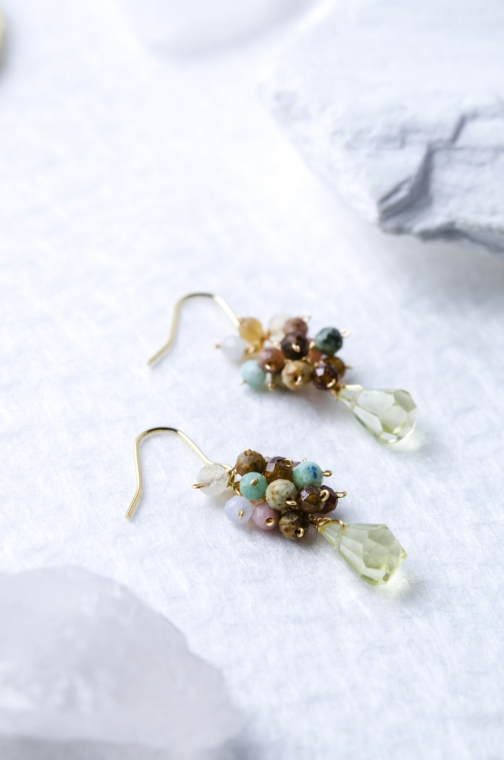 뉘앙스 컬러의 천연석을 묶어 흔들릴 때마다 부드러운 색채가 귓가에 퍼집니다.