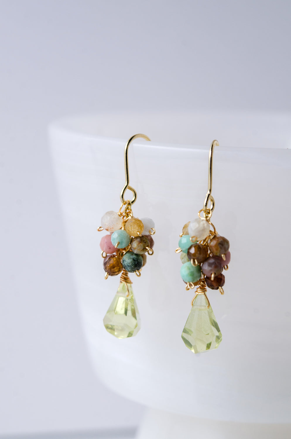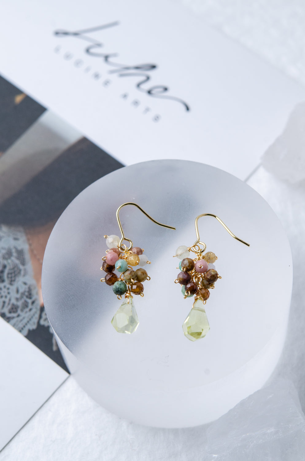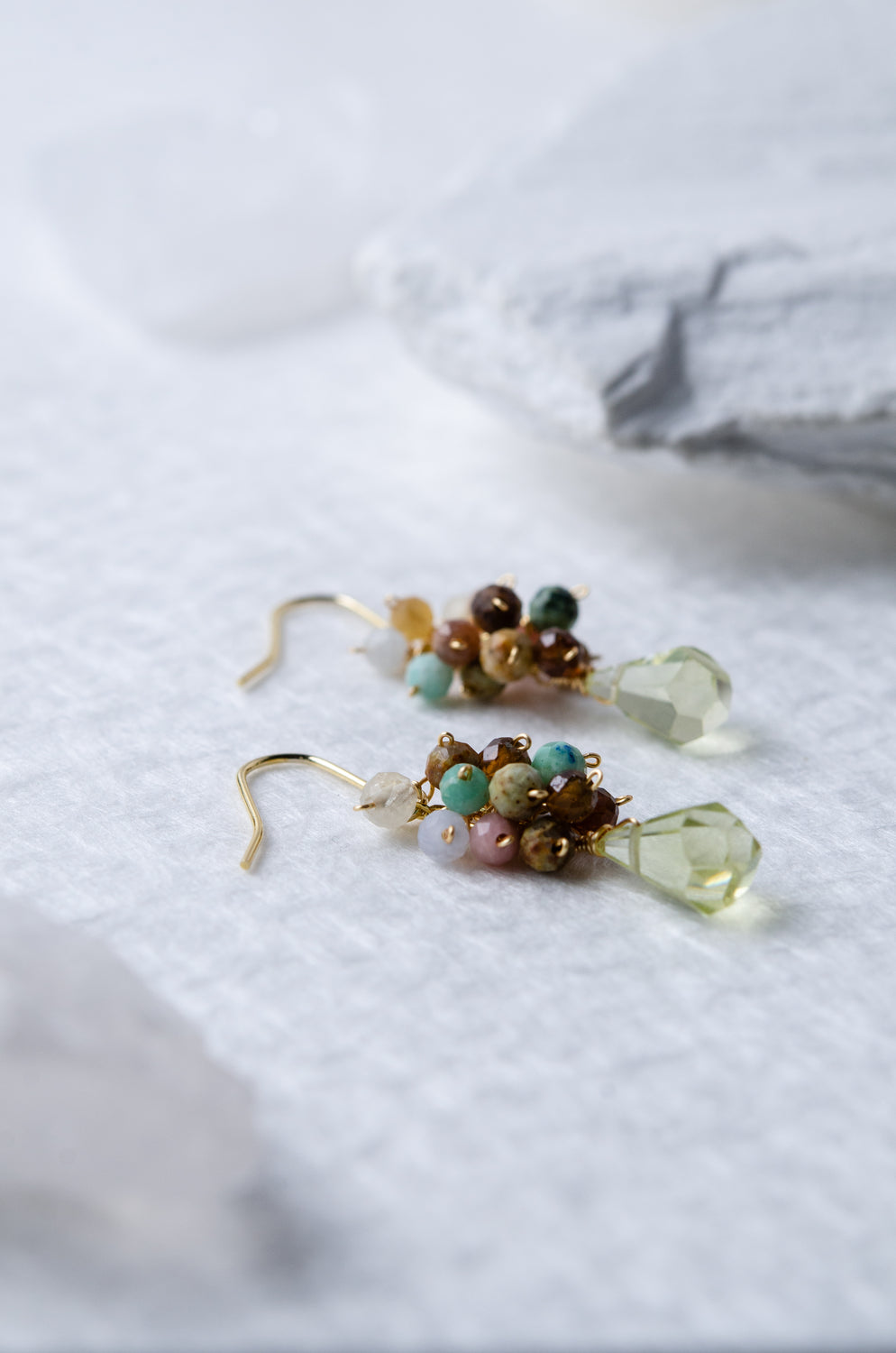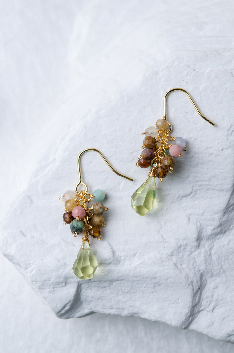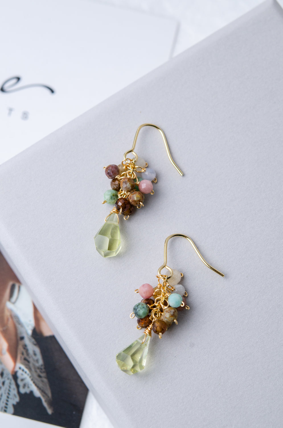 뉘앙스 컬러의 천연석을 묶어 흔들릴 때마다 부드러운 색채가 귓가에 퍼집니다.