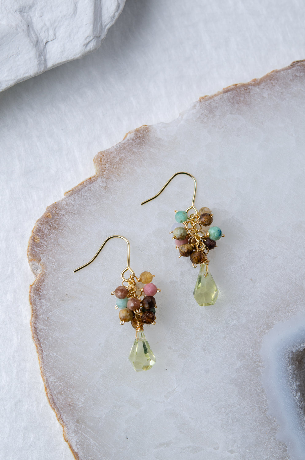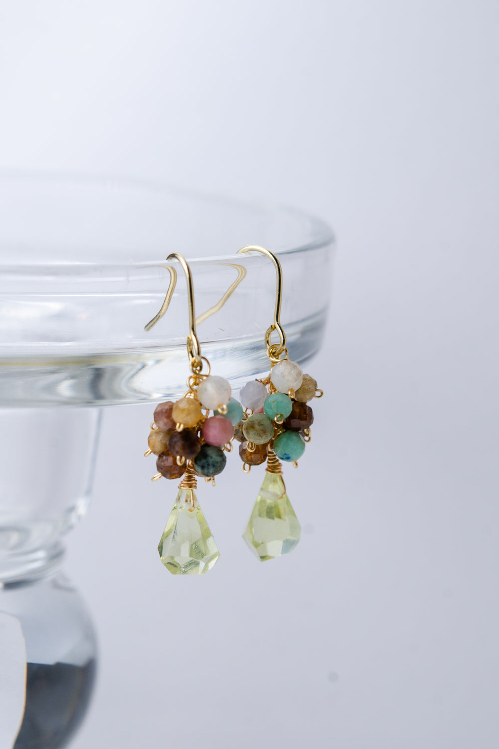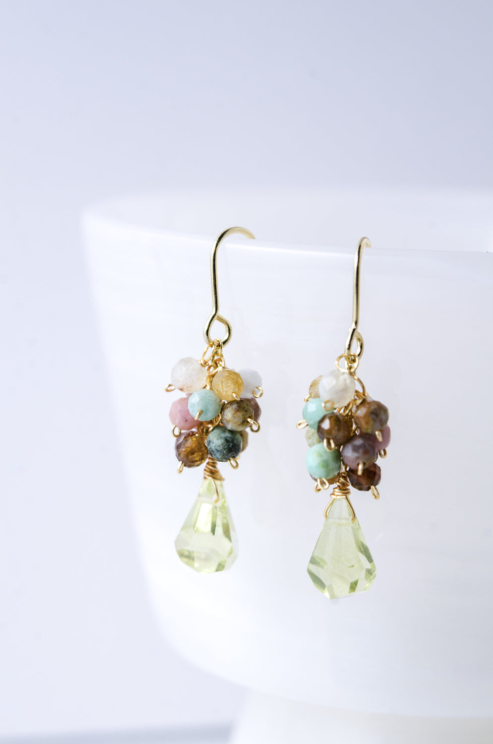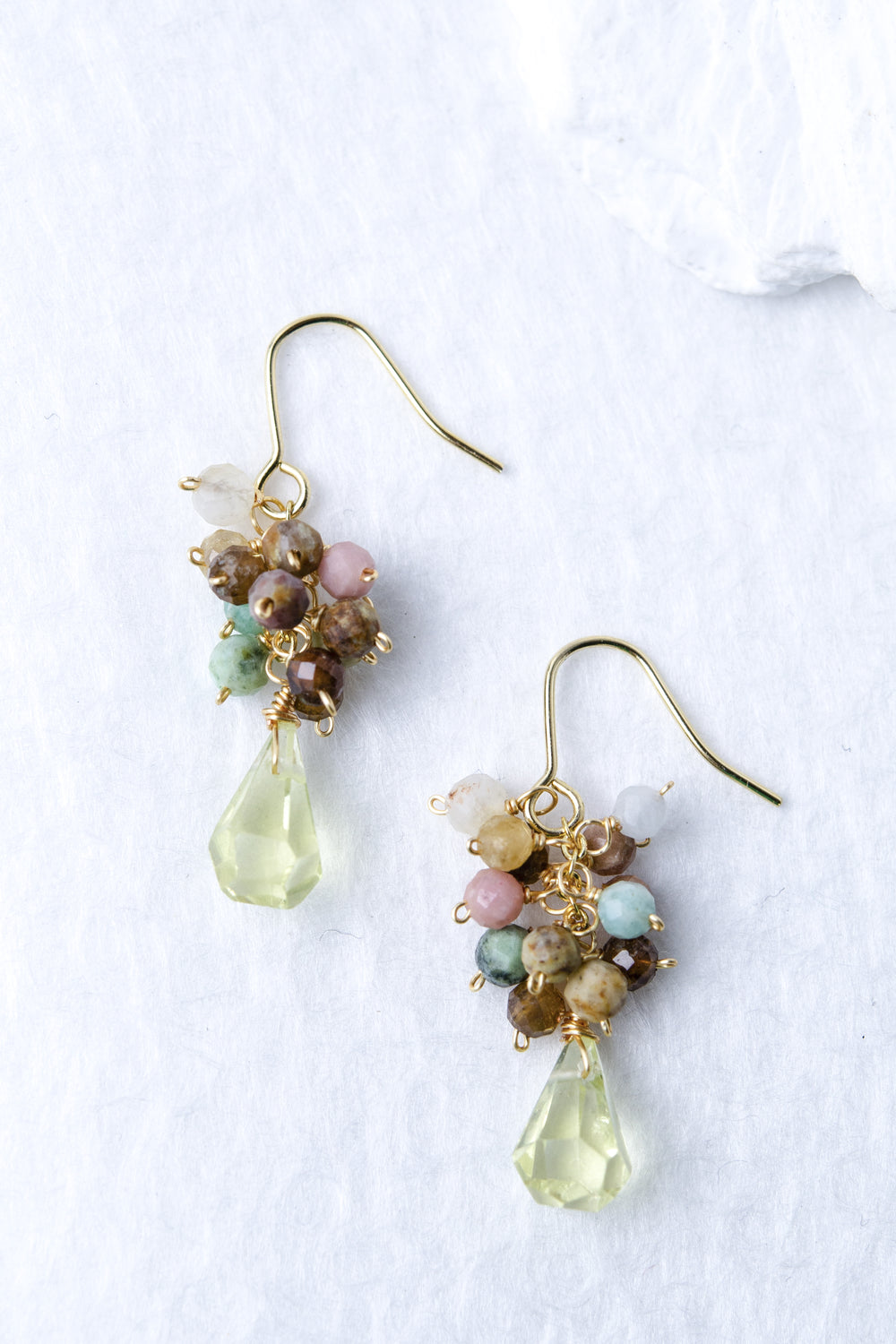 뉘앙스 컬러의 천연석을 묶어 흔들릴 때마다 부드러운 색채가 귓가에 퍼집니다.