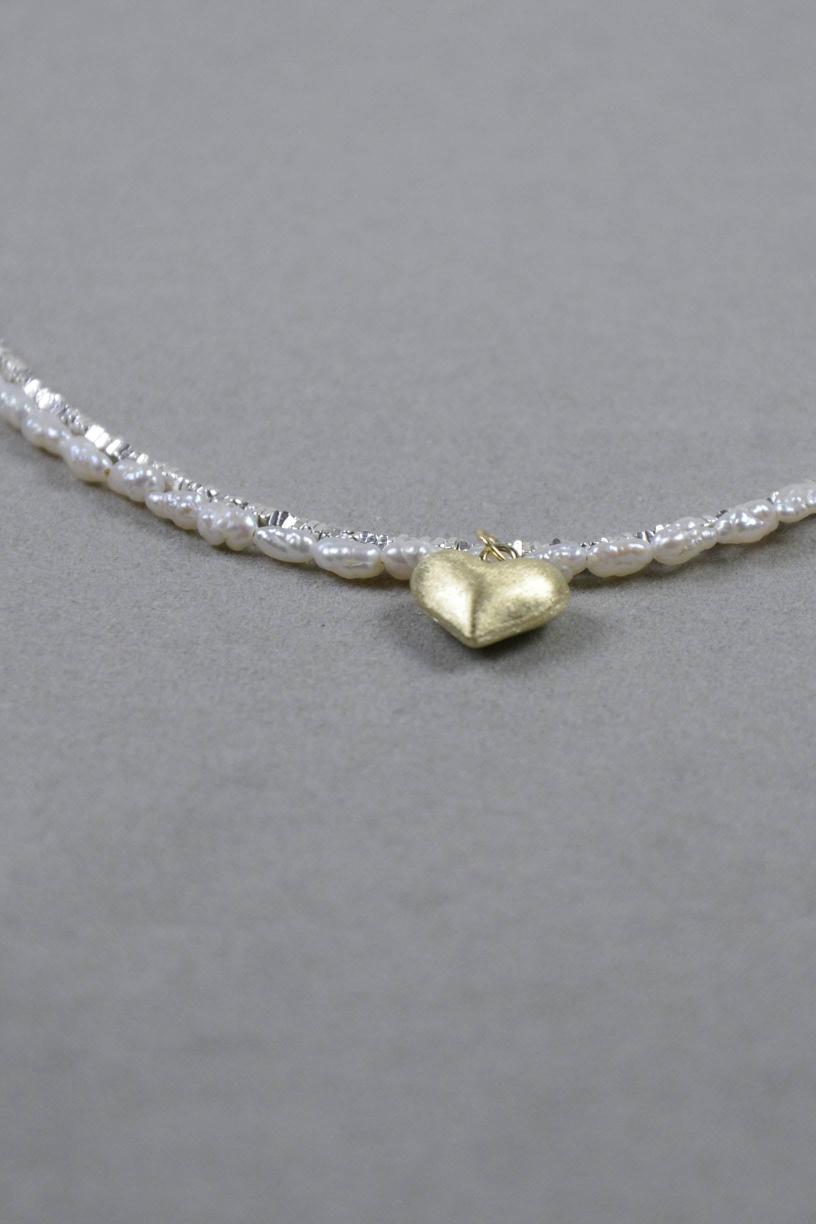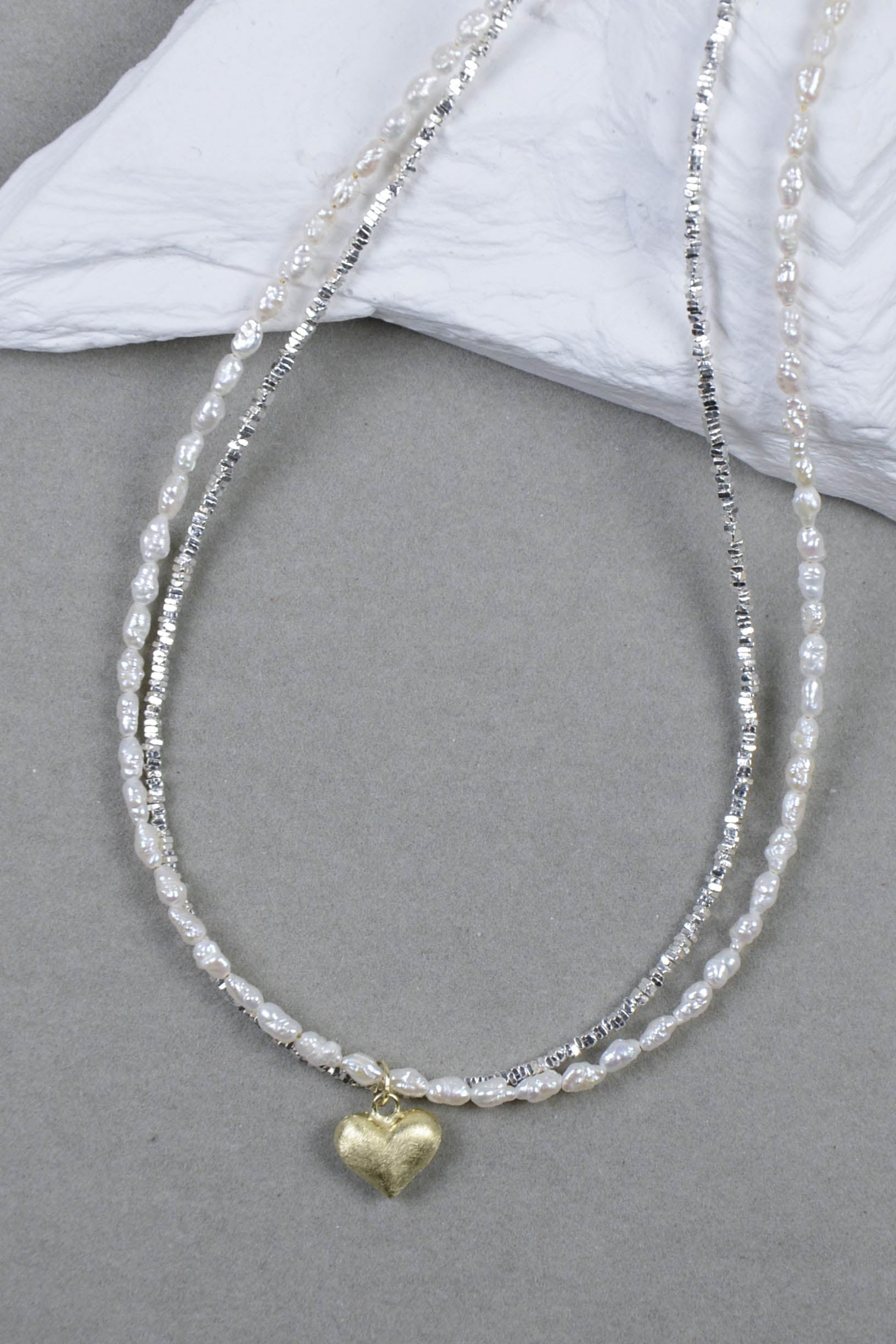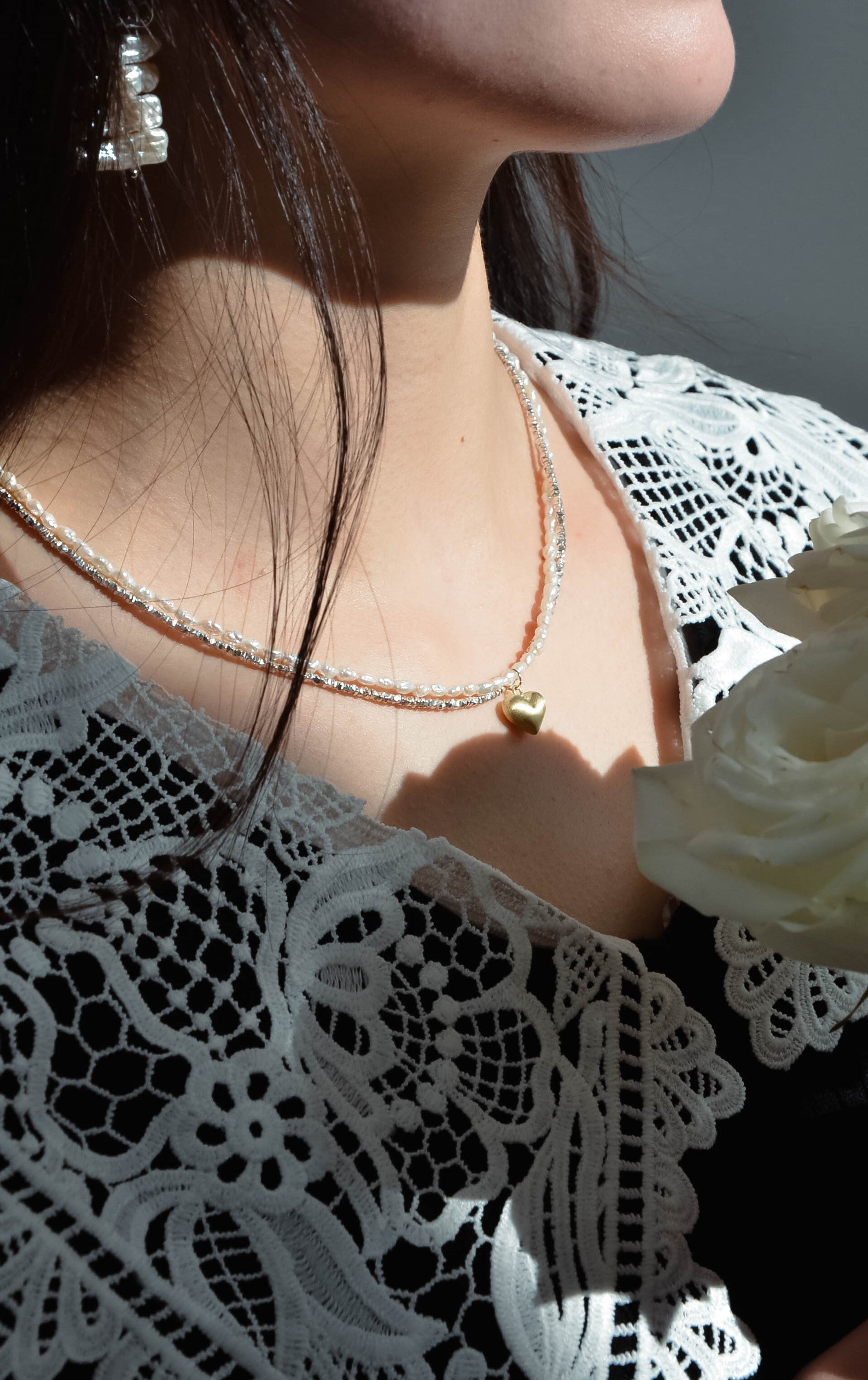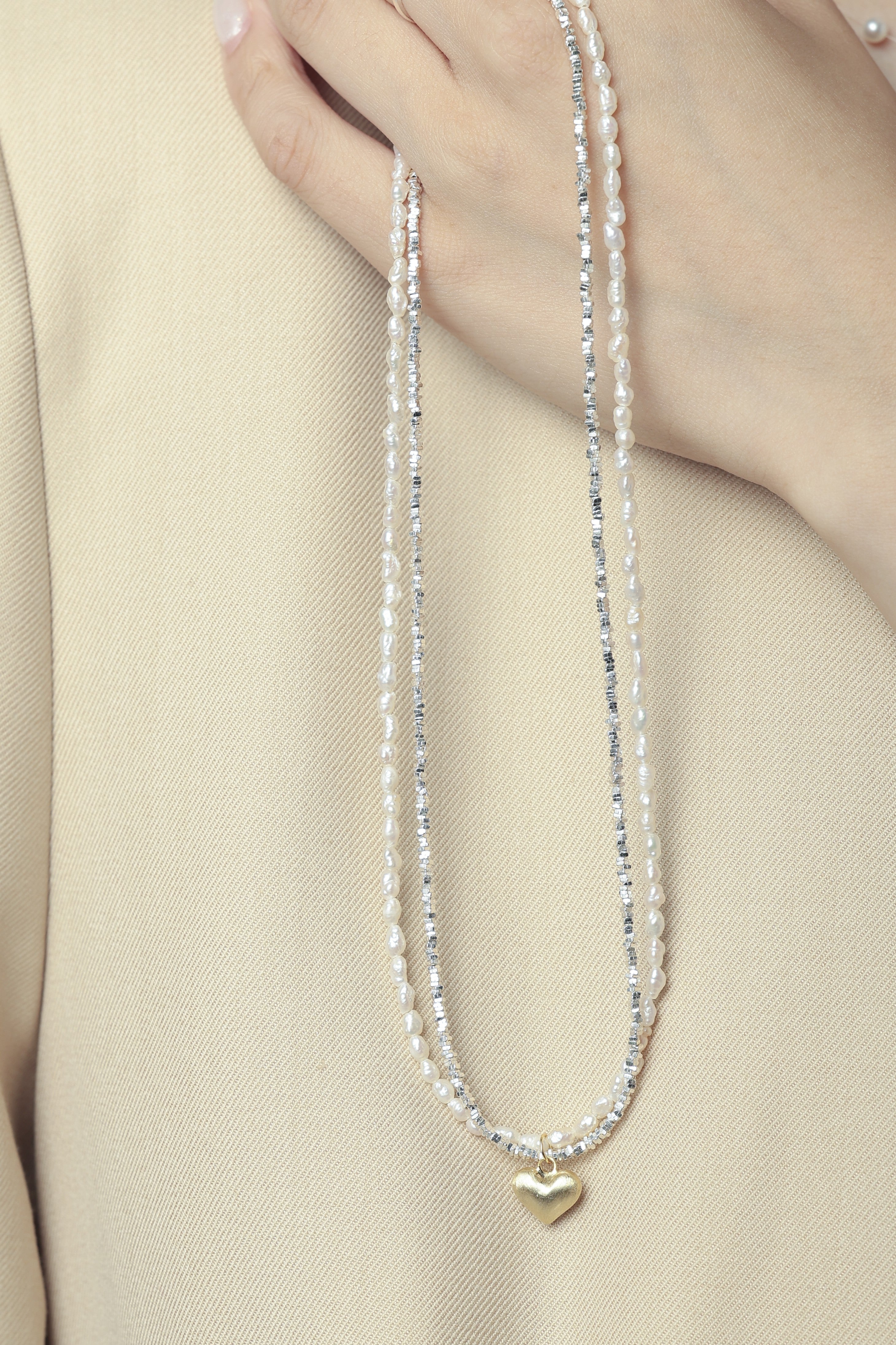 ナチュラルな淡水パールとシルバービーズを組み合わせた、清楚でミニマルな2連ネックレス。柔らかな艶をもつパールと、控えめに光るビーズのコントラストが美しく、ゴールドのハートチャームがやさしいアクセントを添えます。日常に溶け込む上品さと温もりを感じるデザインです。