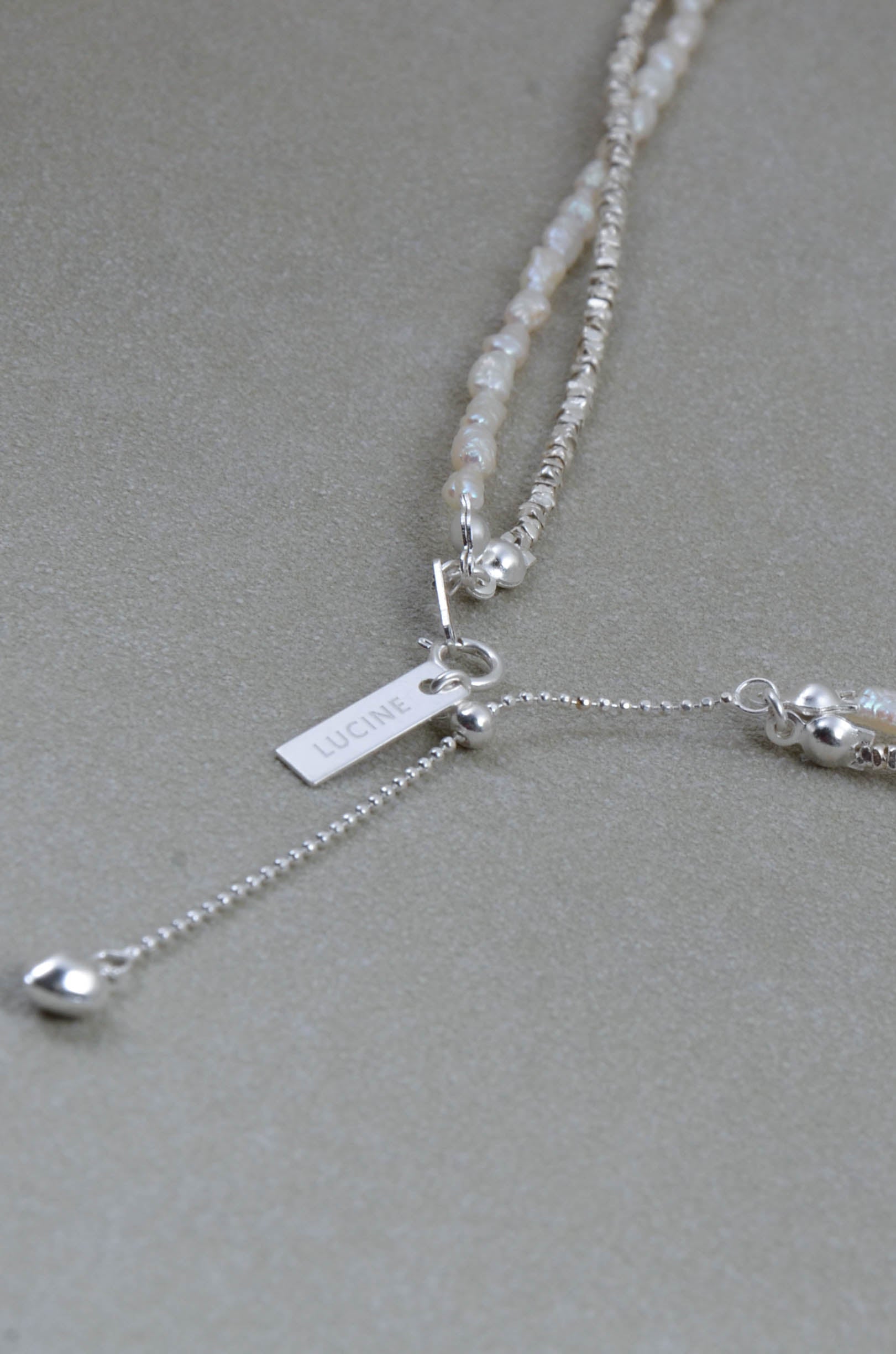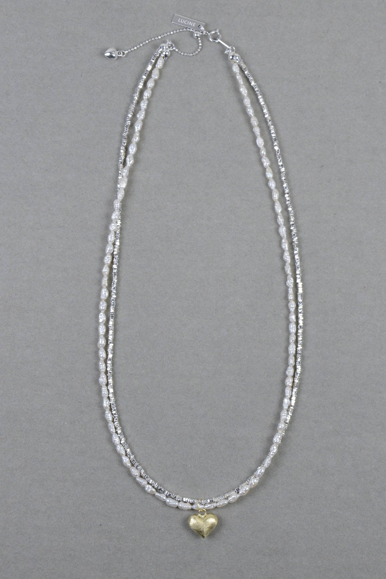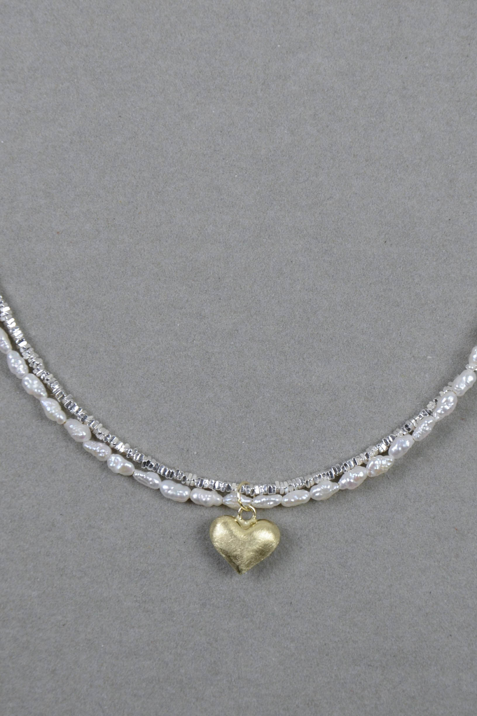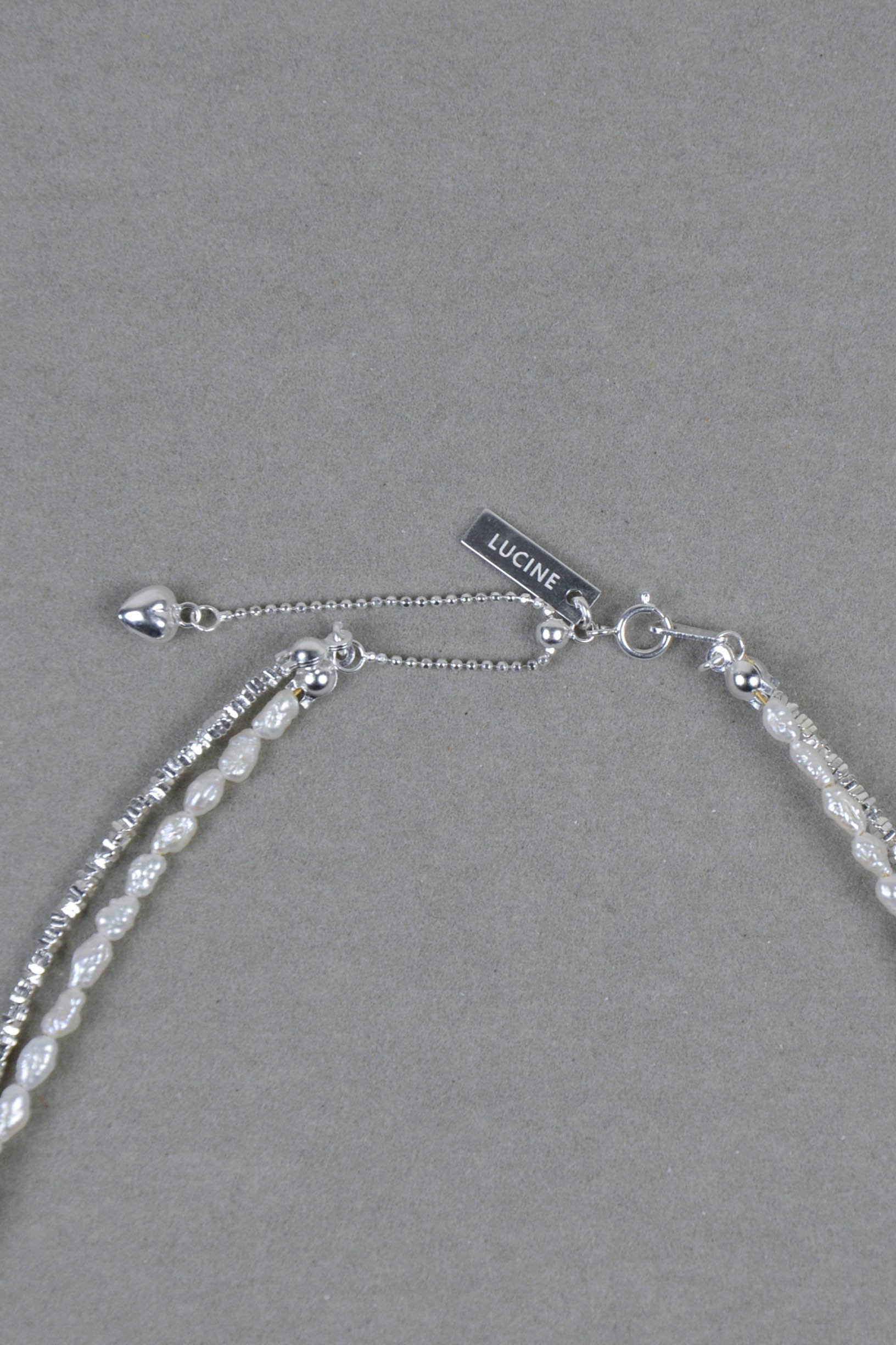 ナチュラルな淡水パールとシルバービーズを組み合わせた、清楚でミニマルな2連ネックレス。柔らかな艶をもつパールと、控えめに光るビーズのコントラストが美しく、ゴールドのハートチャームがやさしいアクセントを添えます。日常に溶け込む上品さと温もりを感じるデザインです。