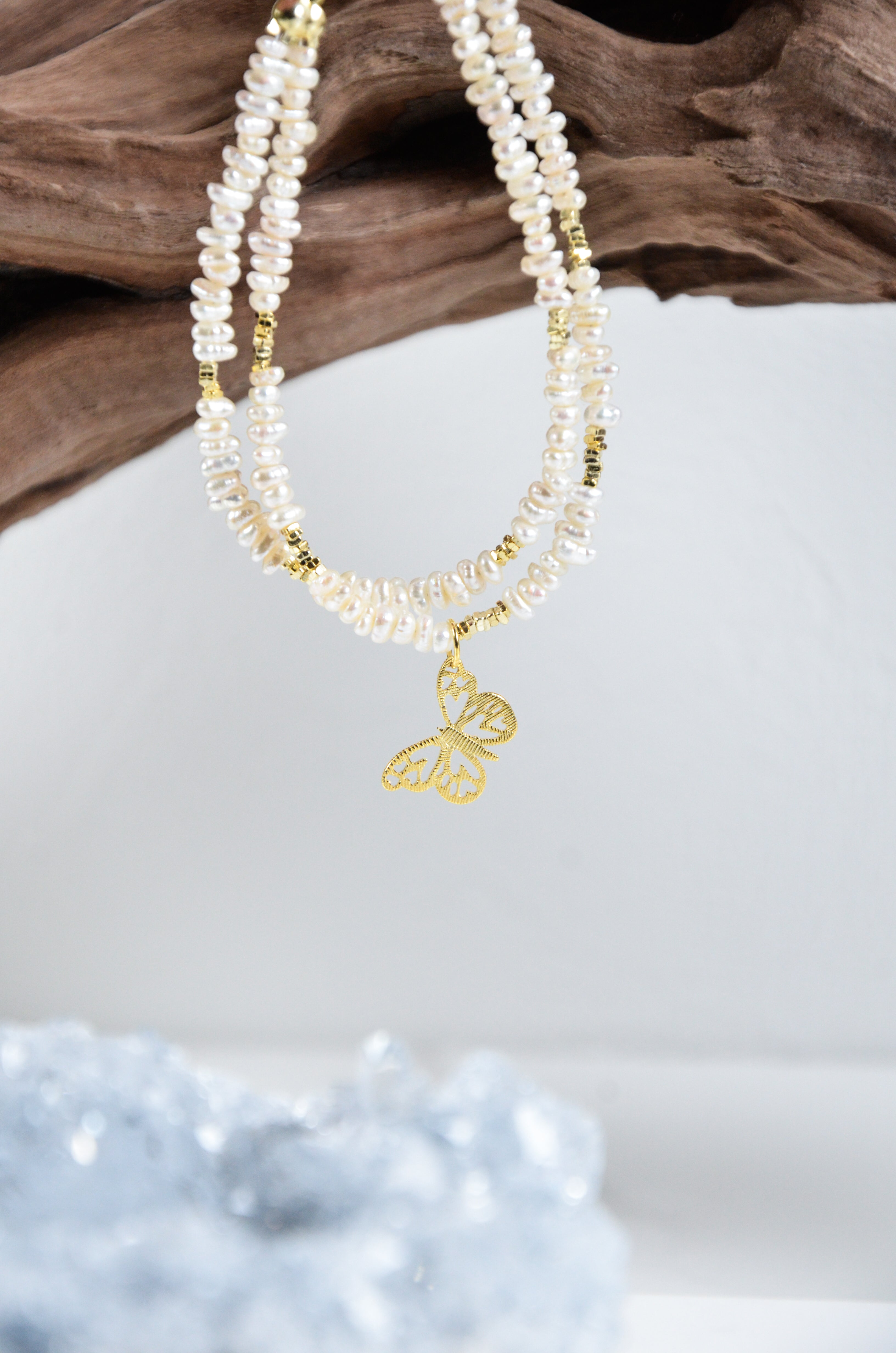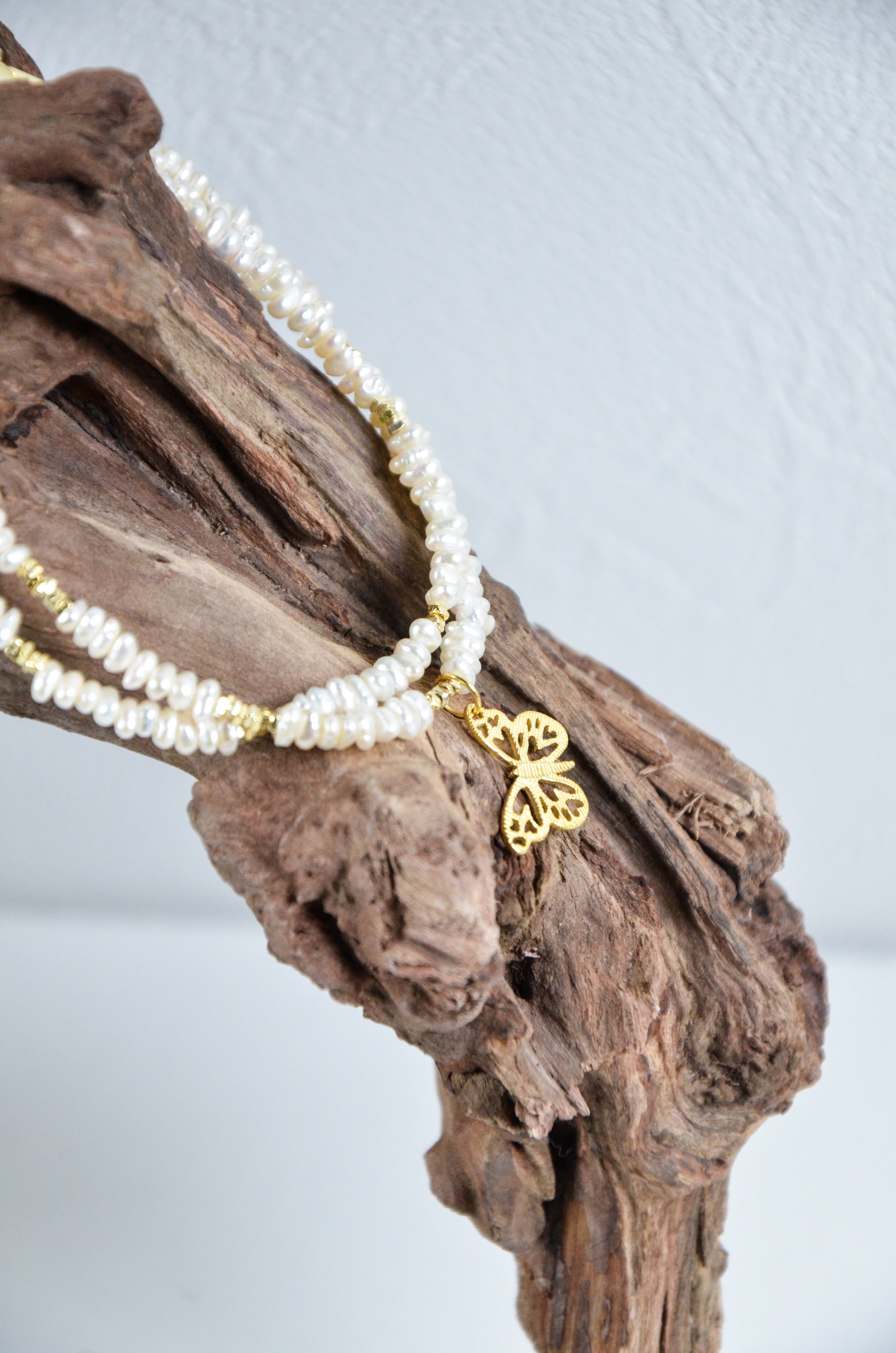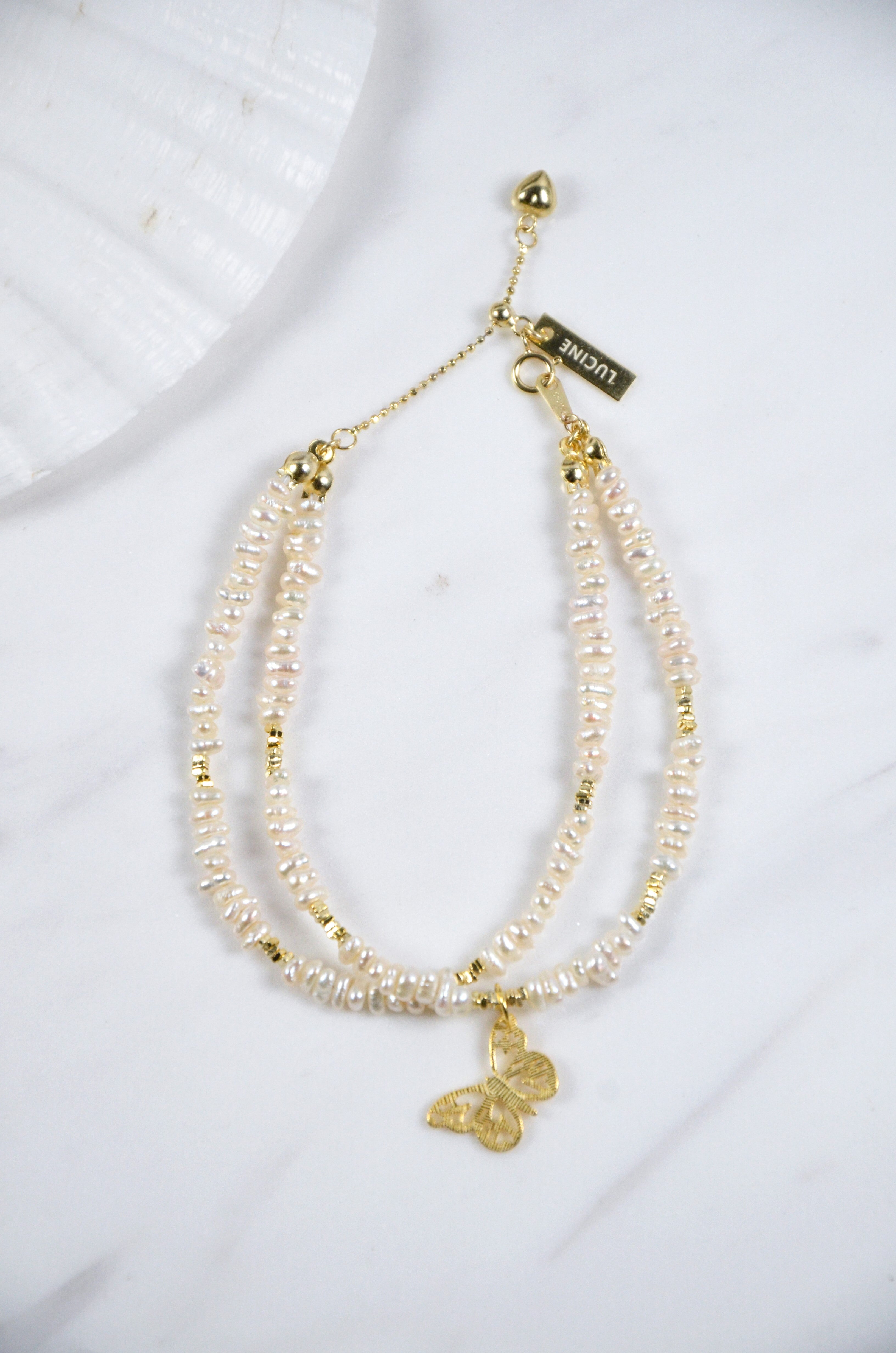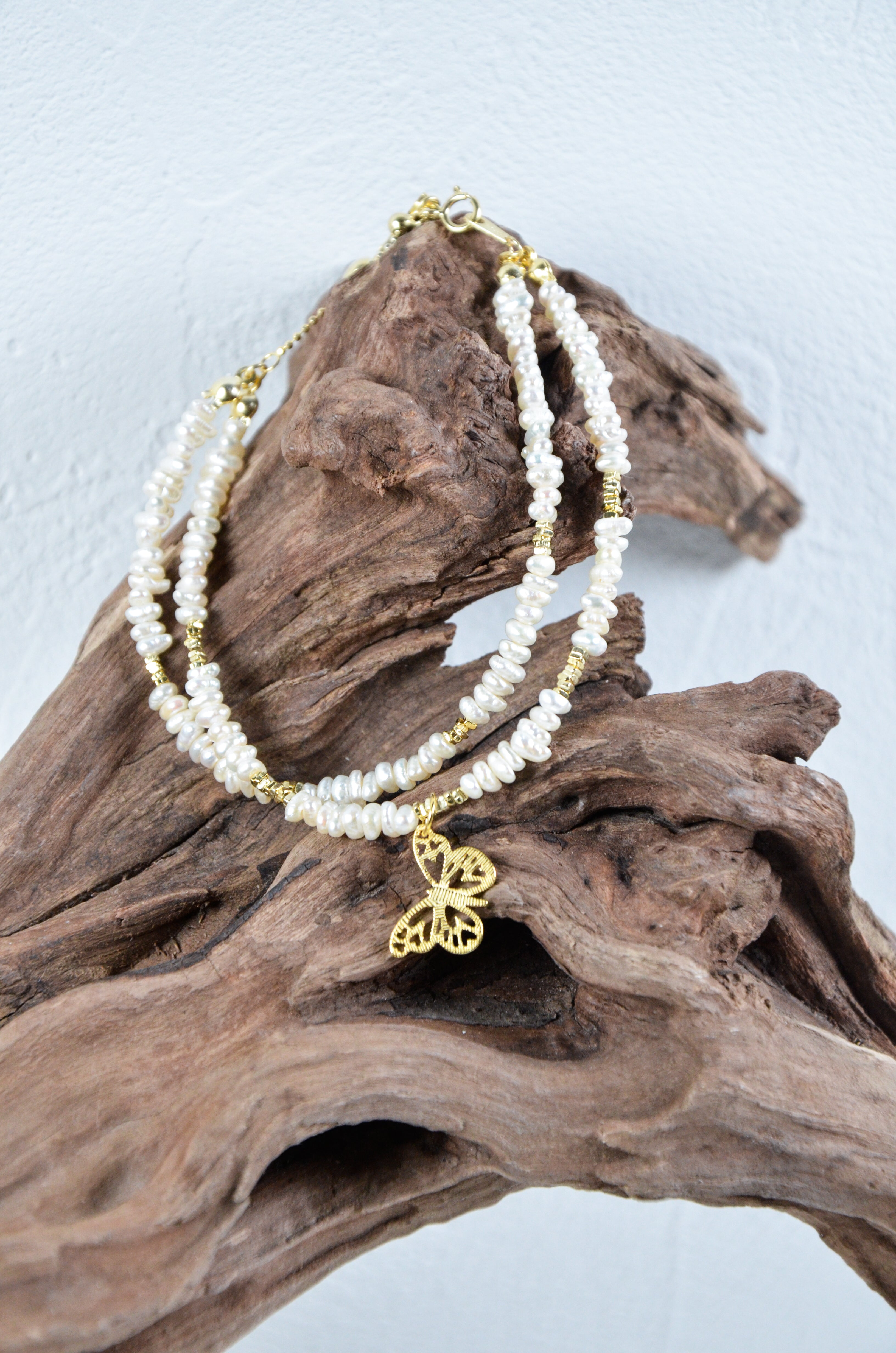 繊細な淡水パールを二重に重ね、可憐なゴールドの蝶モチーフをあしらったブレスレットです。「軽やかに羽ばたく日常の中の美しさ」をテーマに、女性らしさと上品な華やかさを手元に添えます。蝶のモチーフは変化と幸運の象徴として、日々にそっと寄り添い、天然淡水パールの二重構造が立体感と柔らかな輝きを演出。