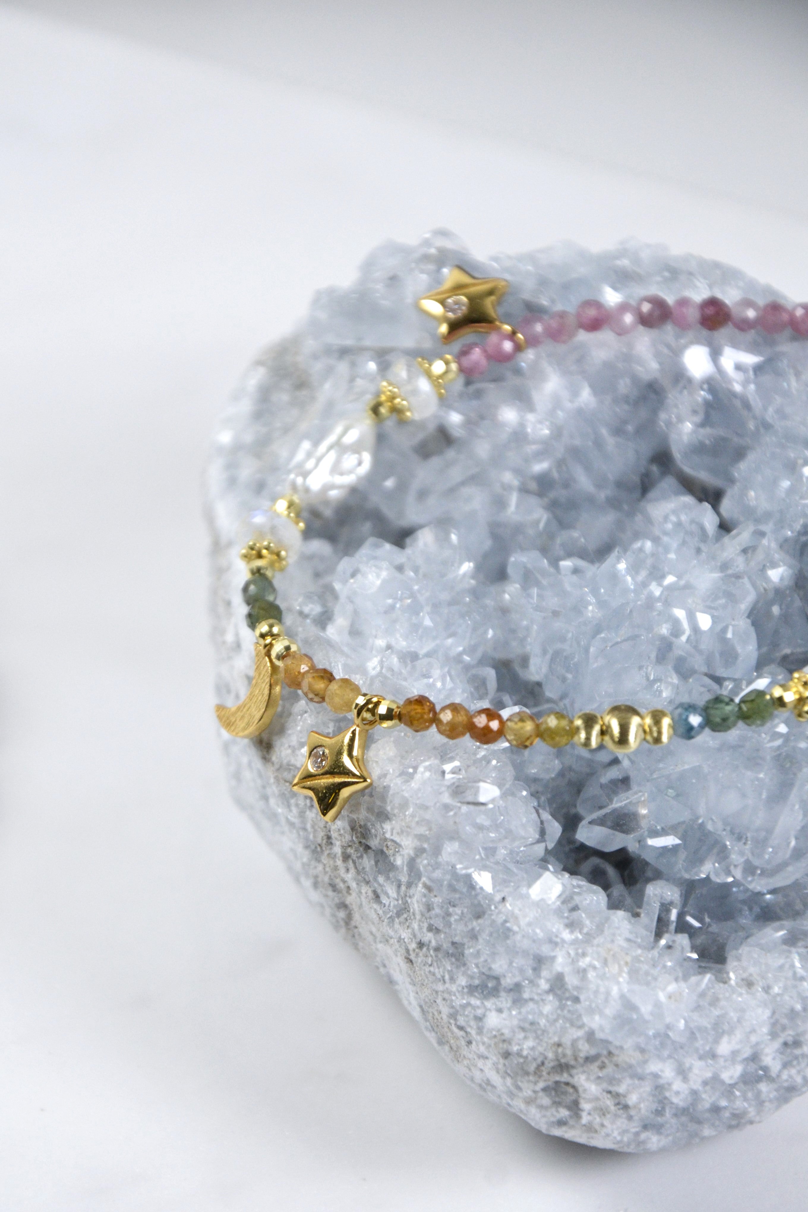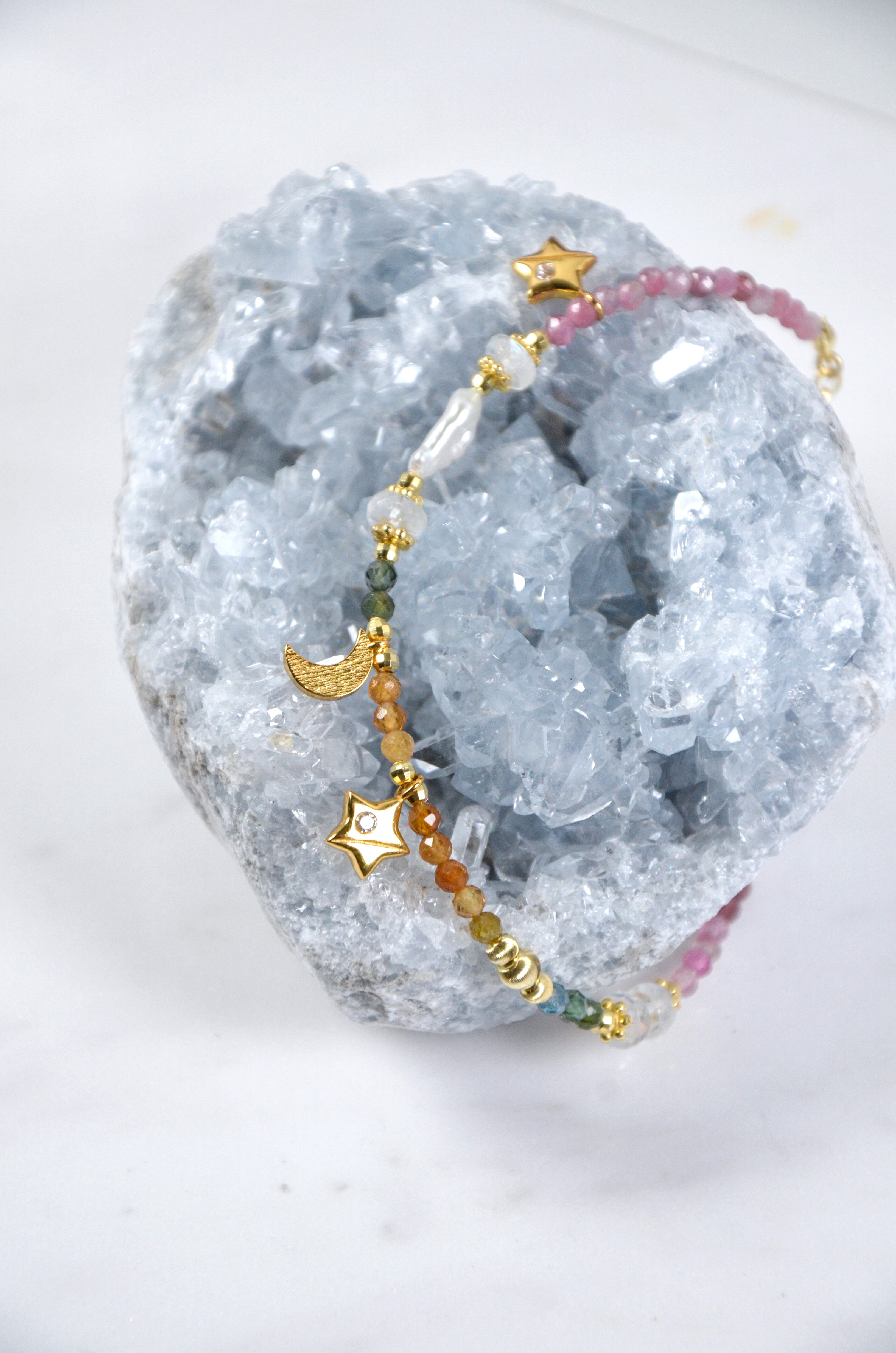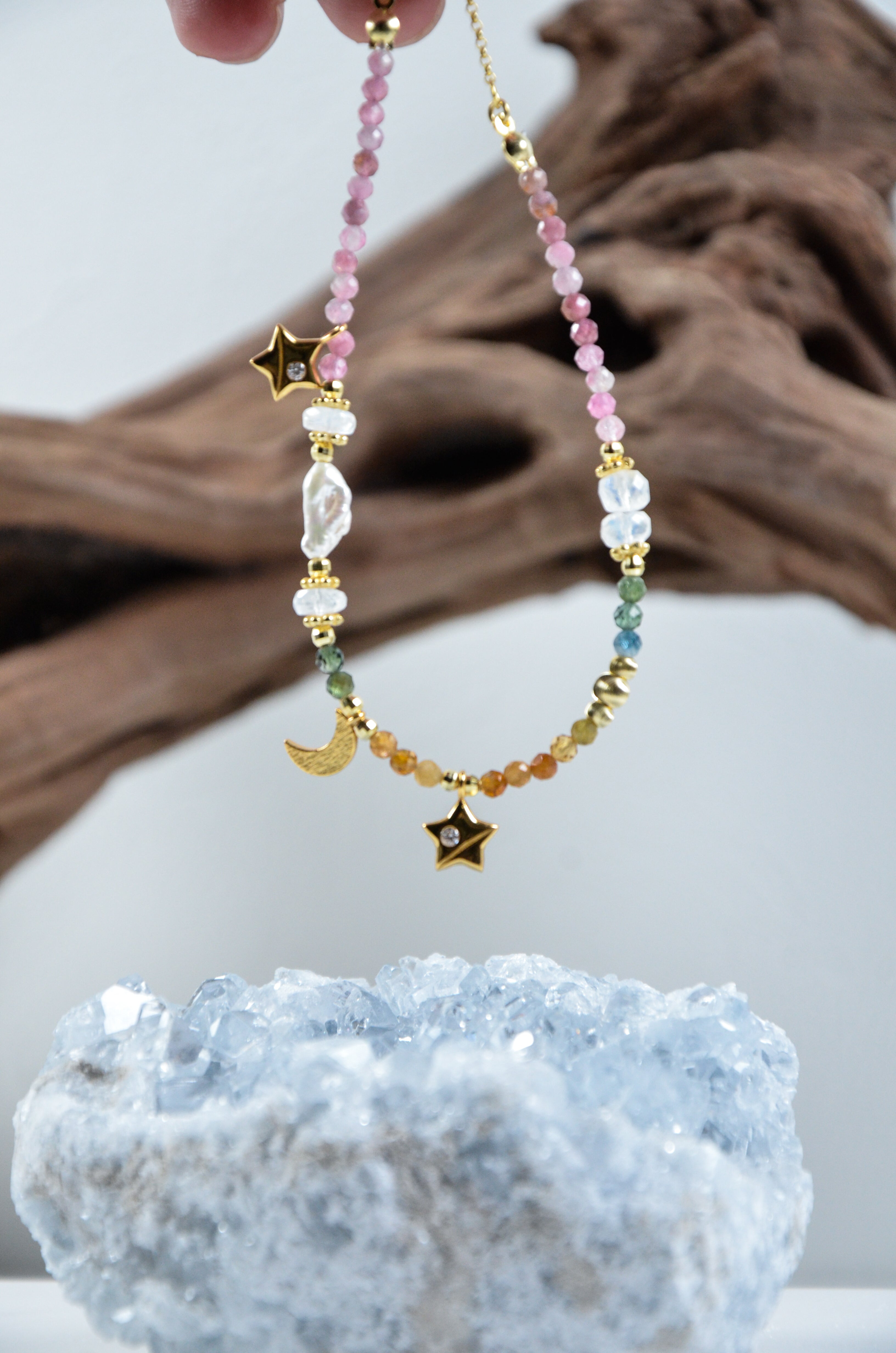 色とりどりの天然石を一つに集めた、夢のようなブレスレットです。優しいピンクのトルマリン、多彩なグリーン・イエロー系の碧玉、そして神秘的なムーンストーンが織りなすグラデーションに、月と星のチャームを添えて夜空のファンタジーを表現。「宇宙と自分をつなぐ色」をテーマに、直感と癒しを感じさせる一本に仕上げました。