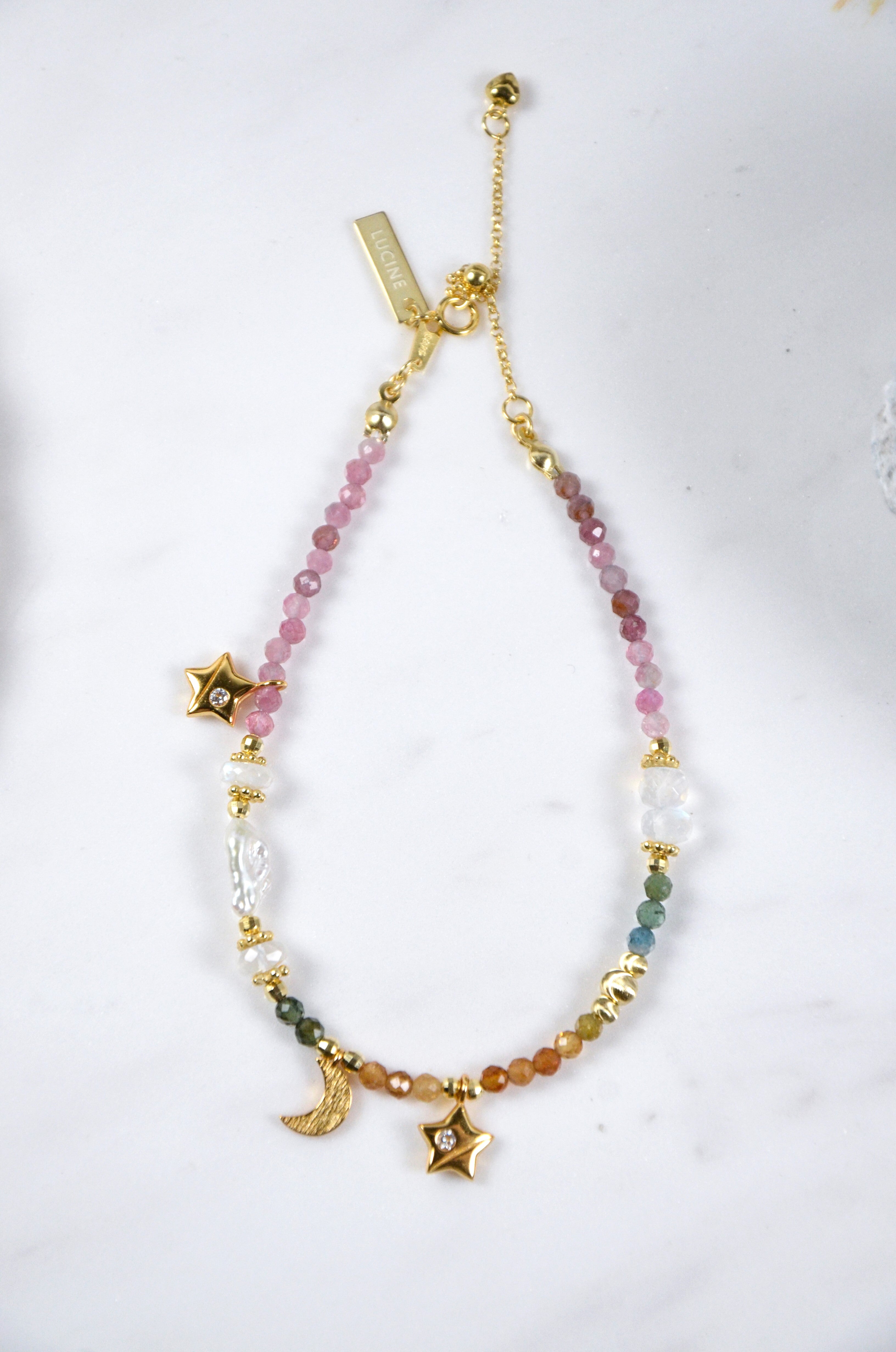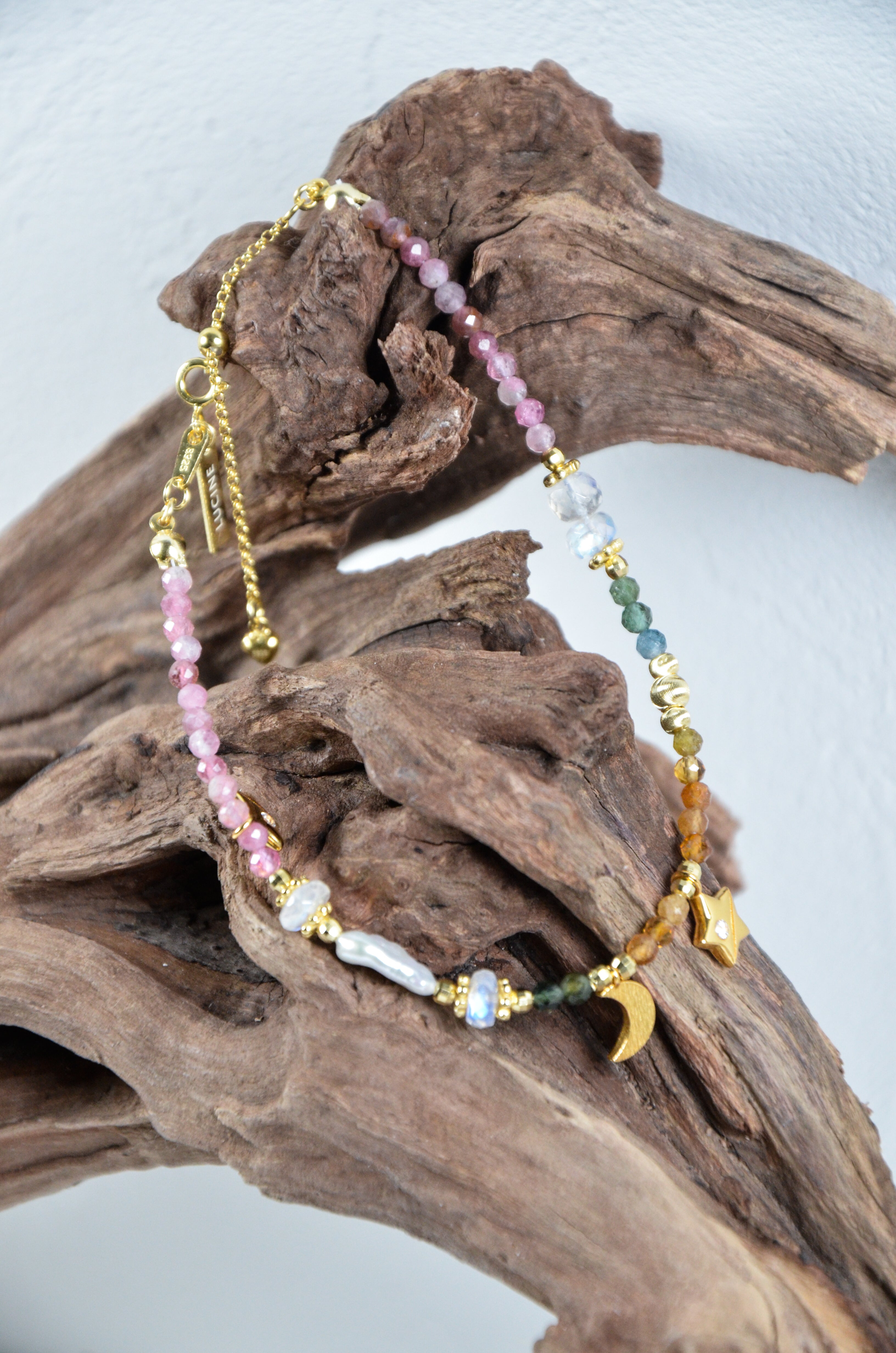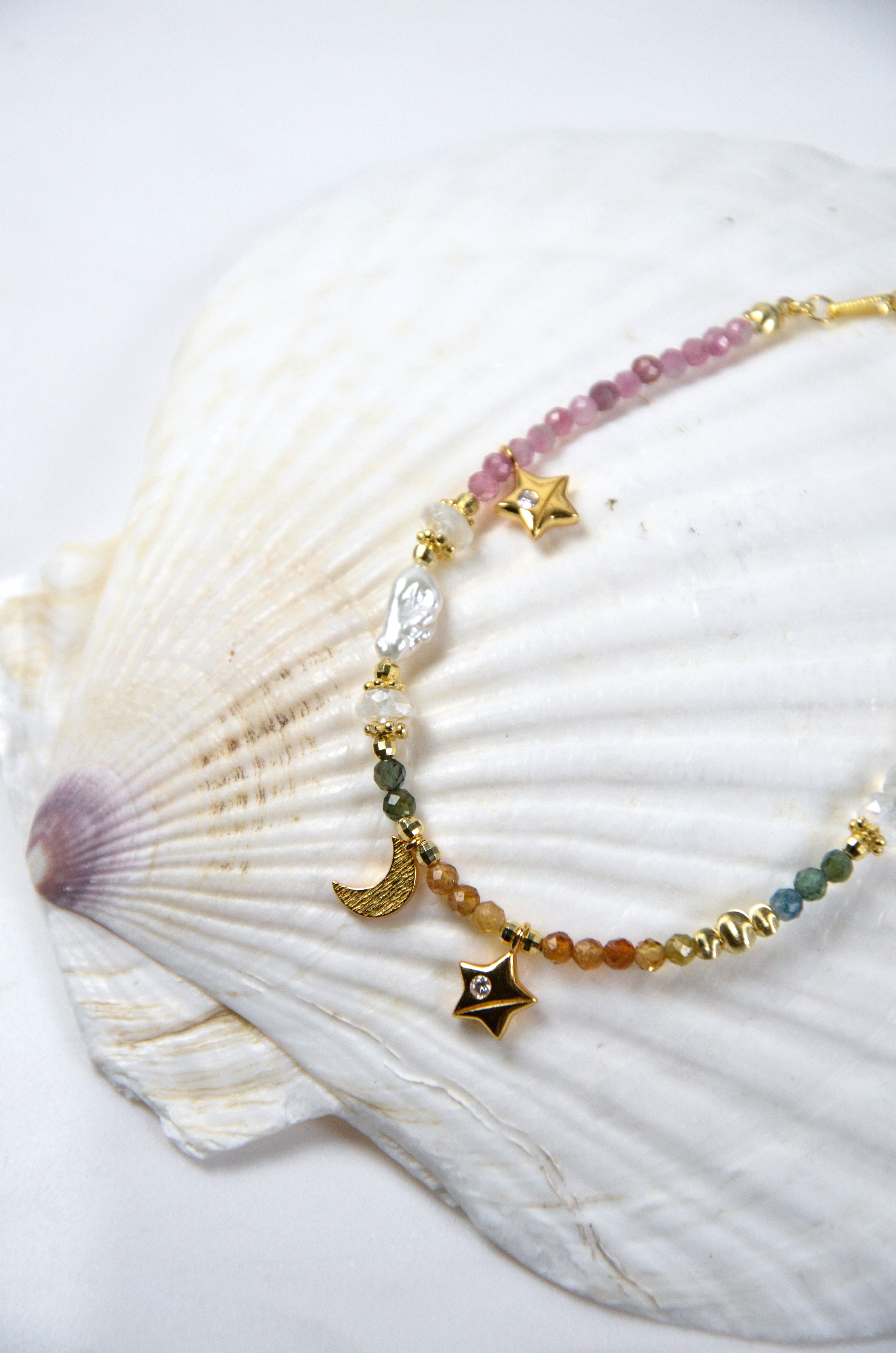 色とりどりの天然石を一つに集めた、夢のようなブレスレットです。優しいピンクのトルマリン、多彩なグリーン・イエロー系の碧玉、そして神秘的なムーンストーンが織りなすグラデーションに、月と星のチャームを添えて夜空のファンタジーを表現。「宇宙と自分をつなぐ色」をテーマに、直感と癒しを感じさせる一本に仕上げました。