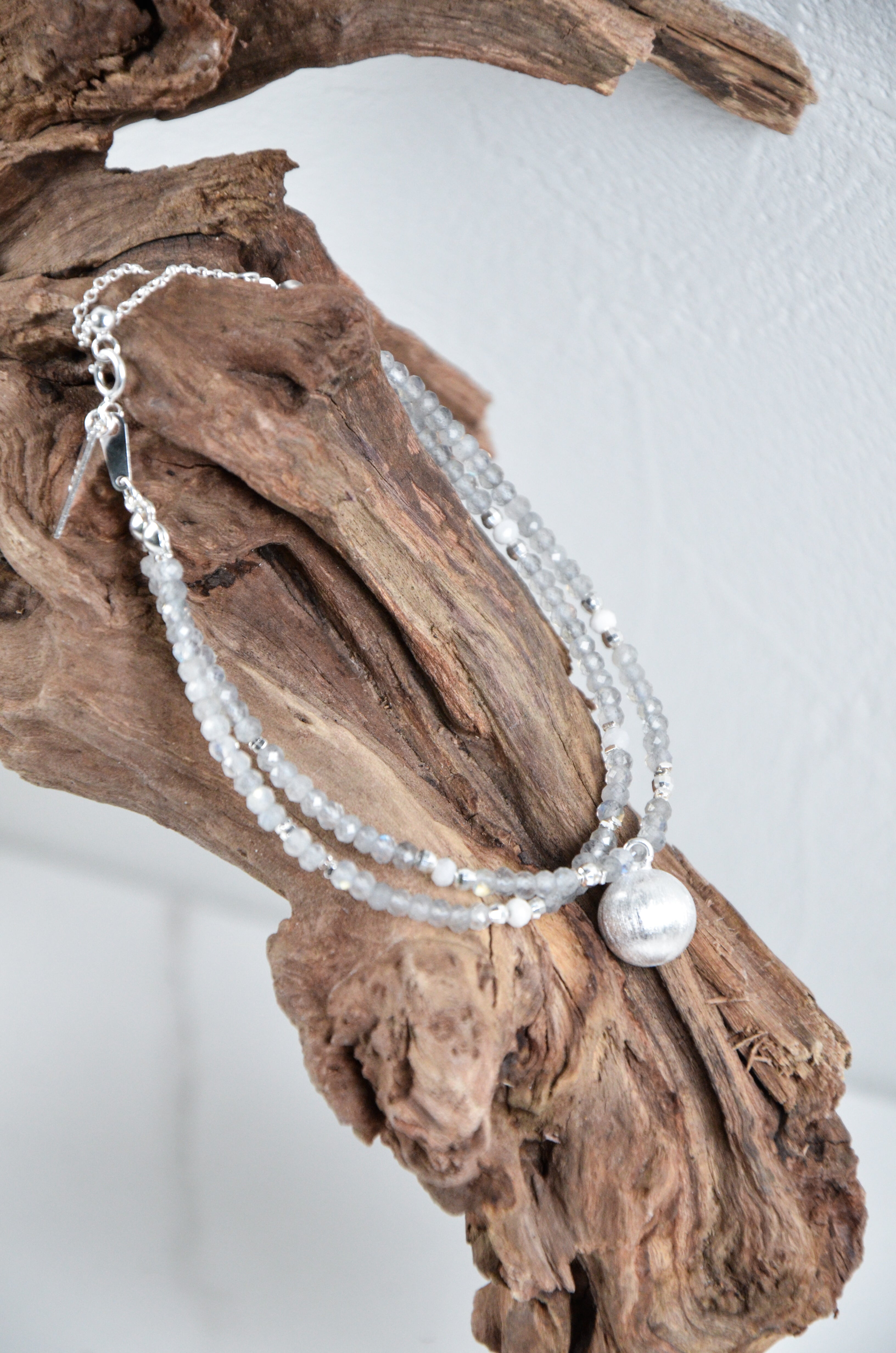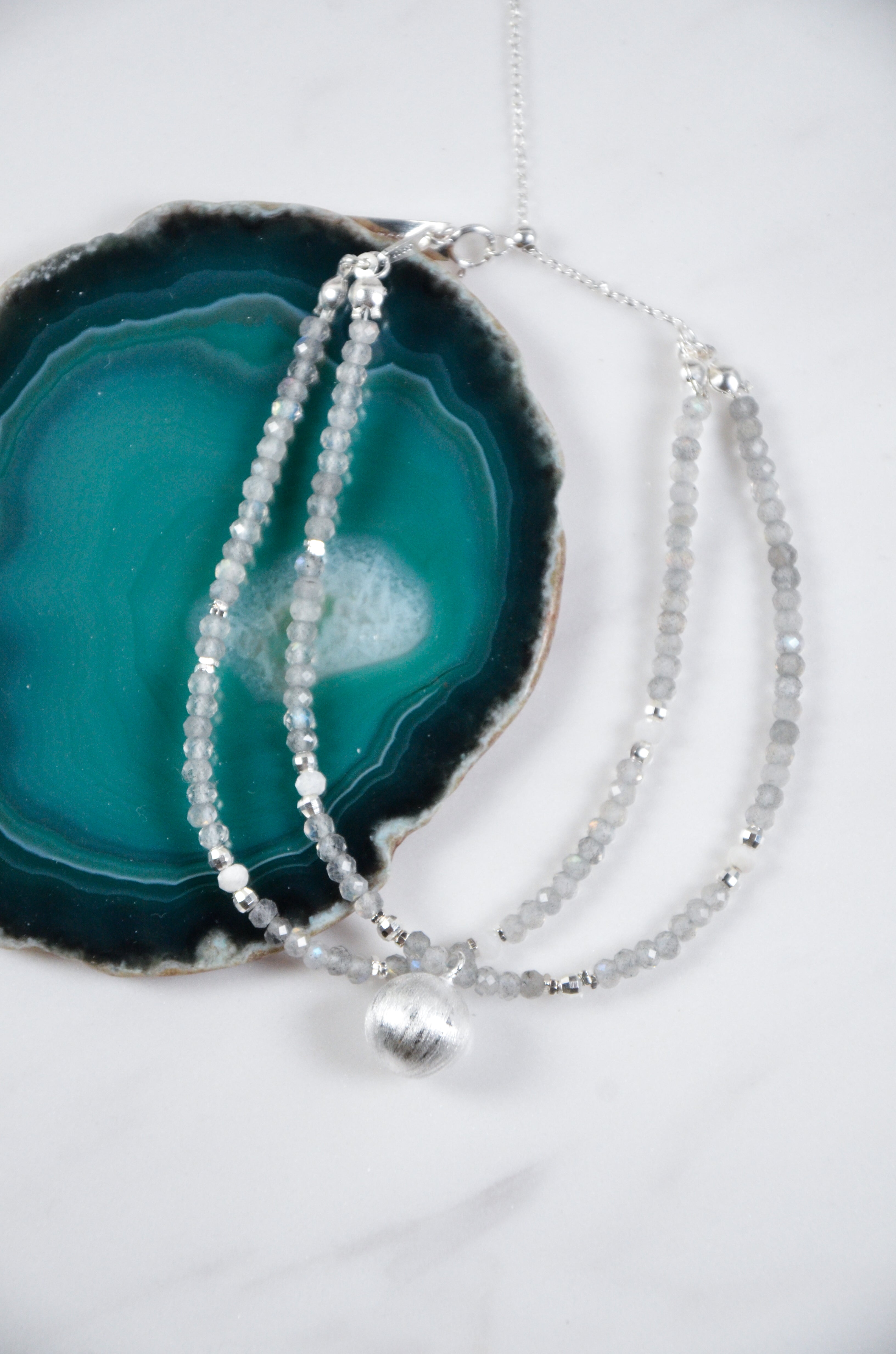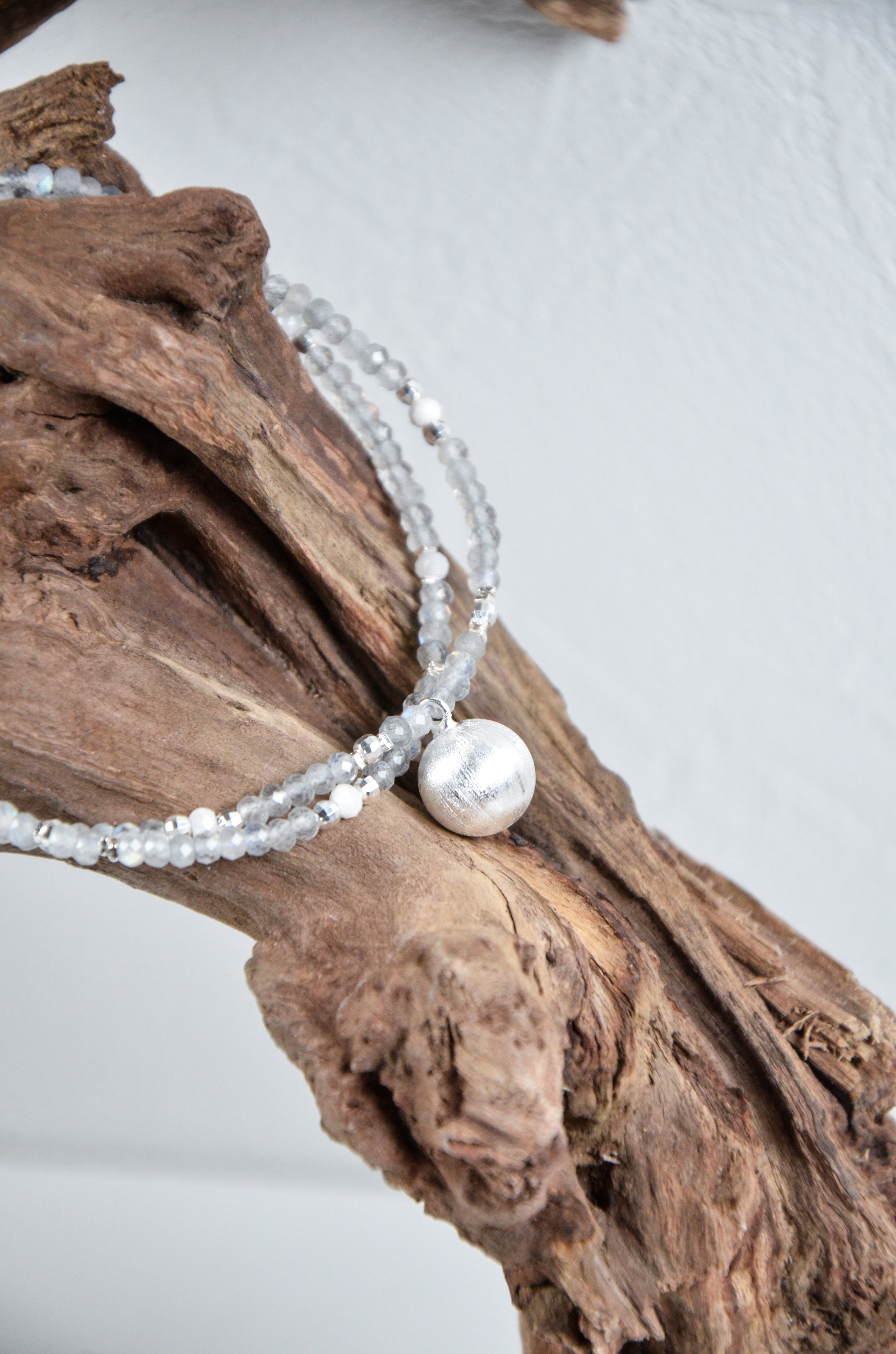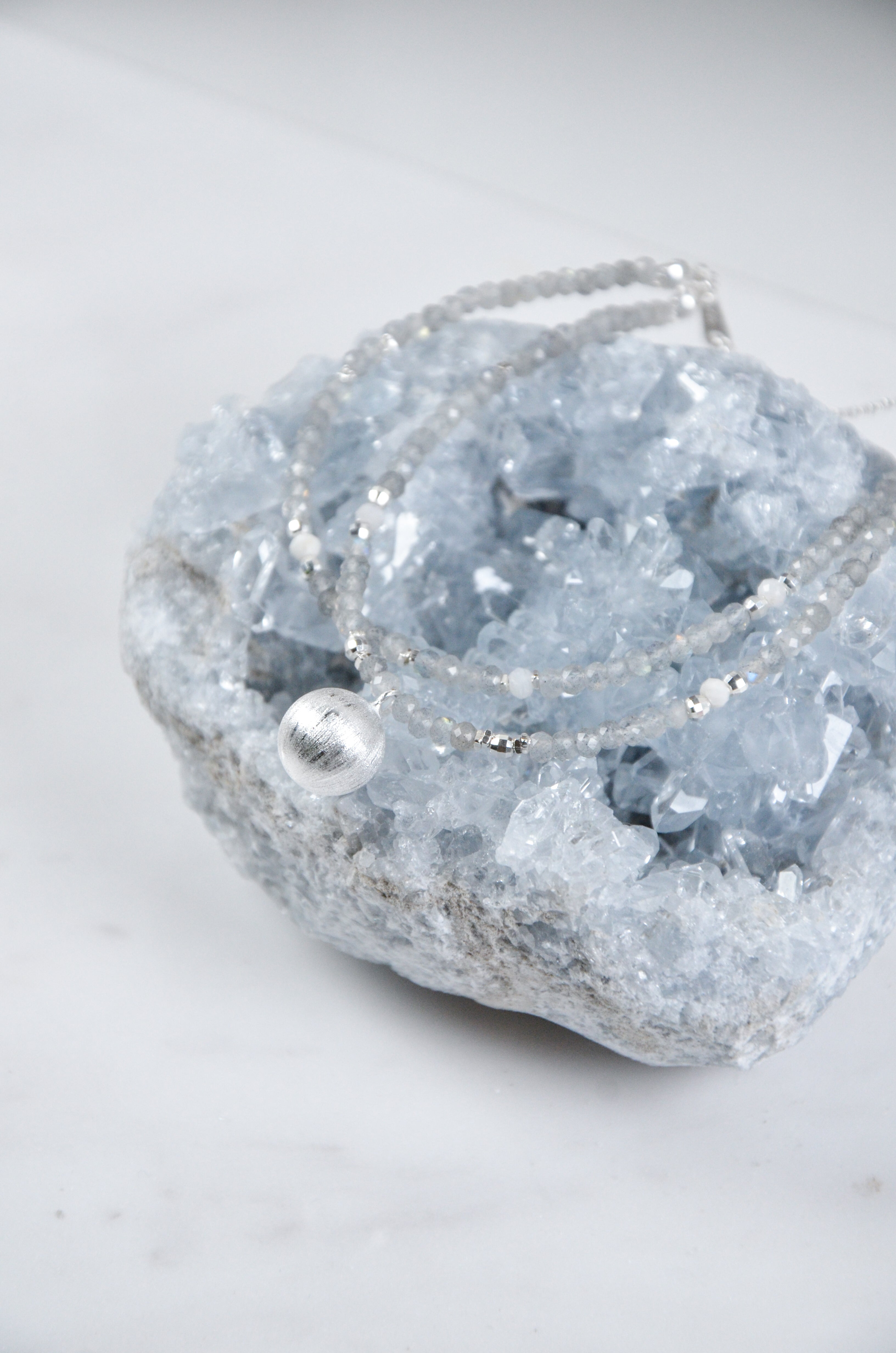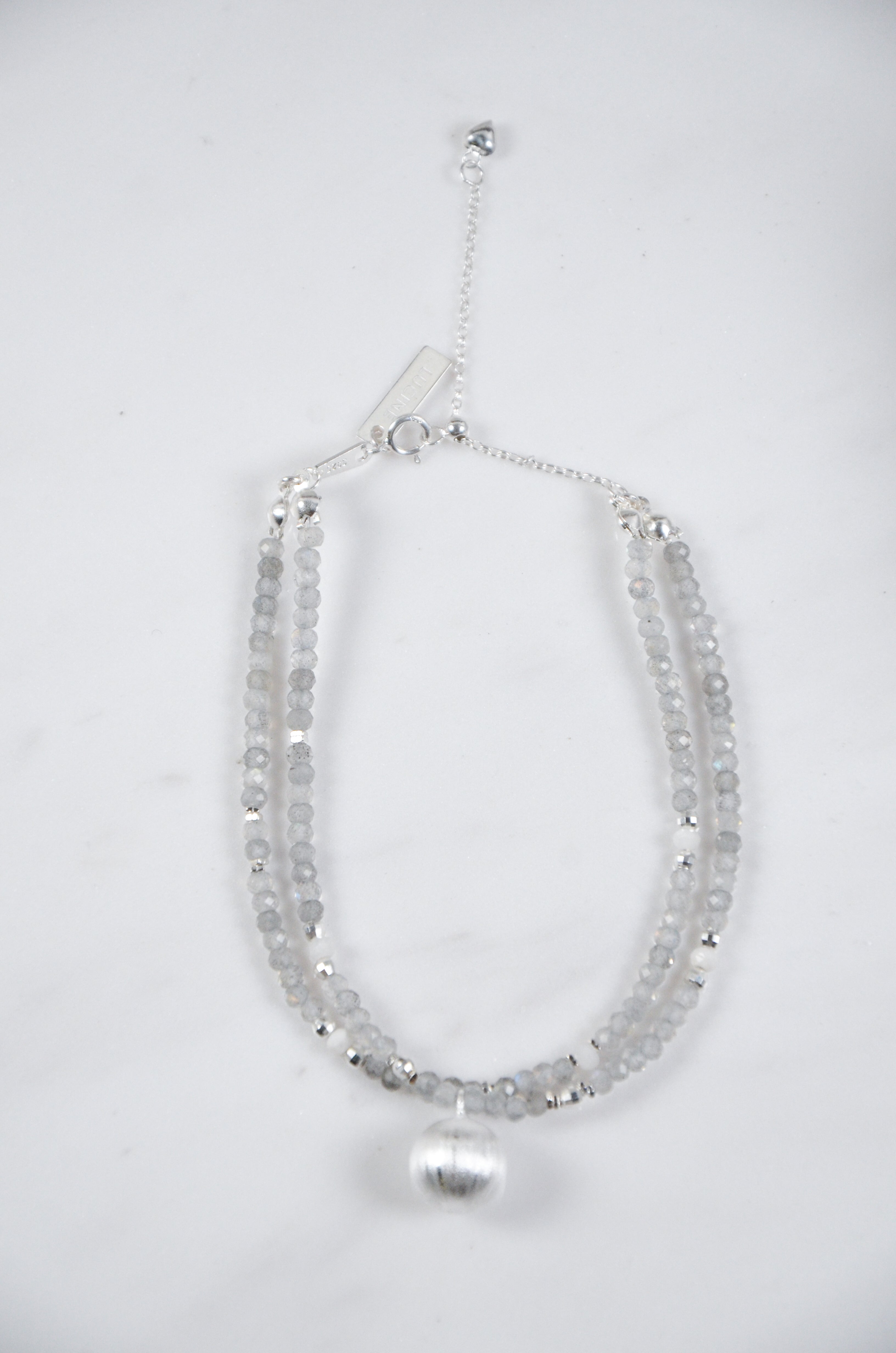 内なる光を秘めたグレームーンストーンをベースに、マットな質感が印象的なシルバーラウンドチャームを一点添えた、ミニマルで洗練されたブレスレットです。「静寂の中の輝き」をテーマに、控えめながらも確かな個性を放つデザイン。グレームーンストーンは内面の輝きを象徴する神秘的な天然石で、シルバーのラウンドチャームは落ち着いたマット加工により上品な印象を演出。