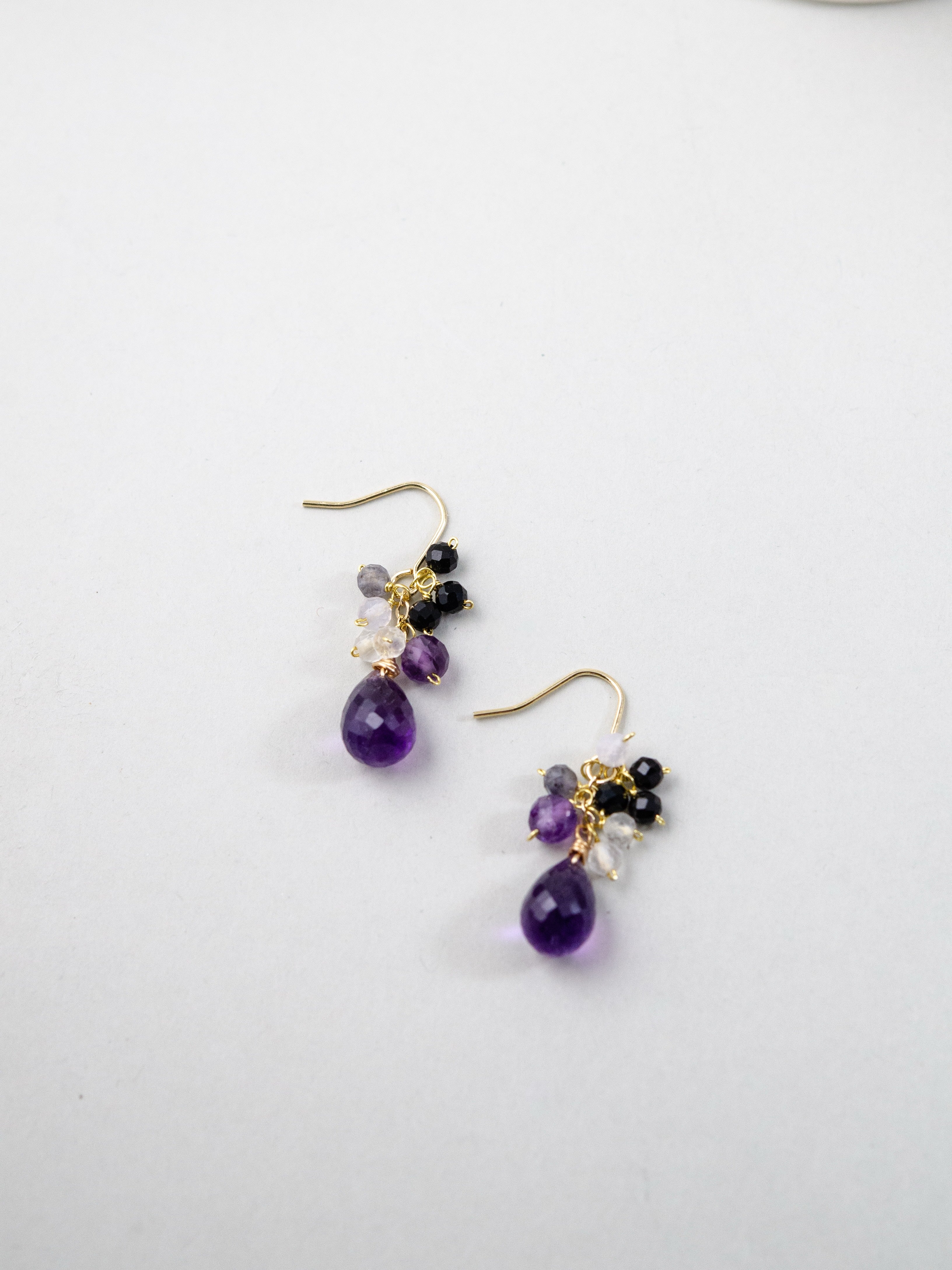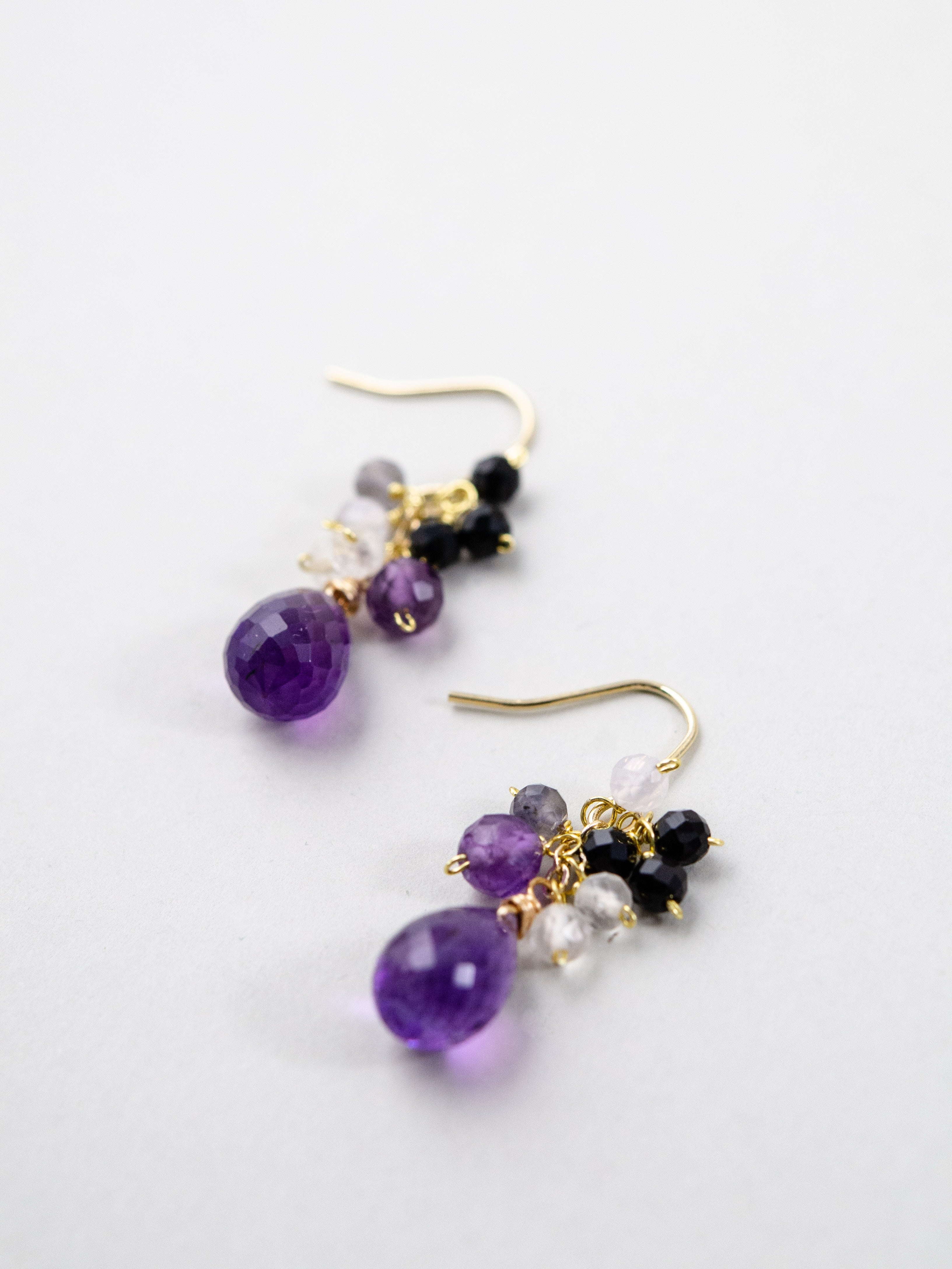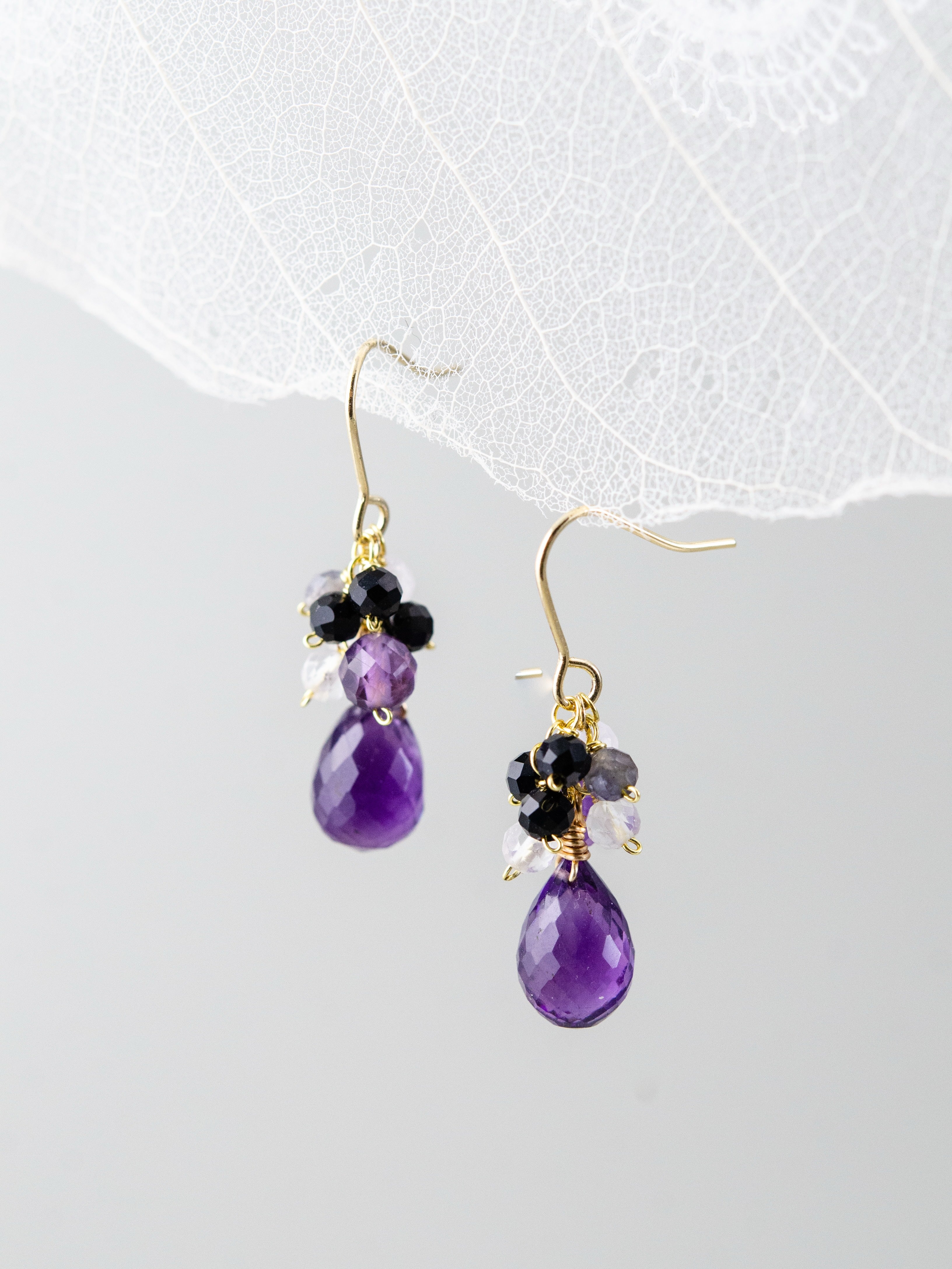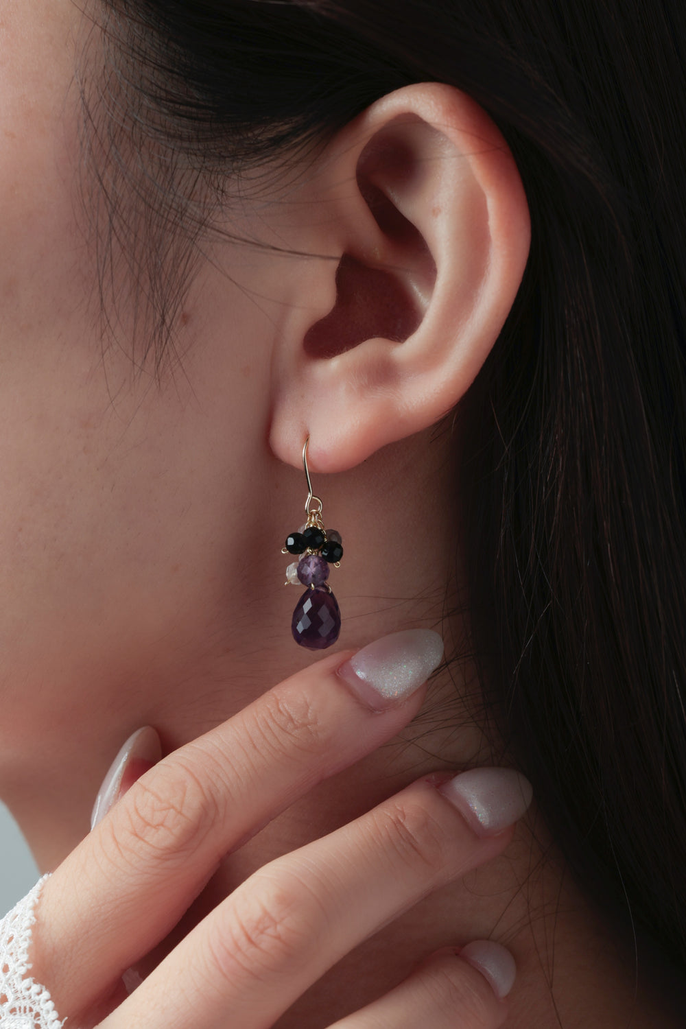 濃淡のアメジストとブラックオブシディアンを組み合わせたイヤリング。大粒のドロップカットアメジストが耳元で軽やかに揺れ、静かで上品な輝きを演出します。天然石ならではの色合いや内包物の違いにより、一点ものの個性を楽しめるデザインです。