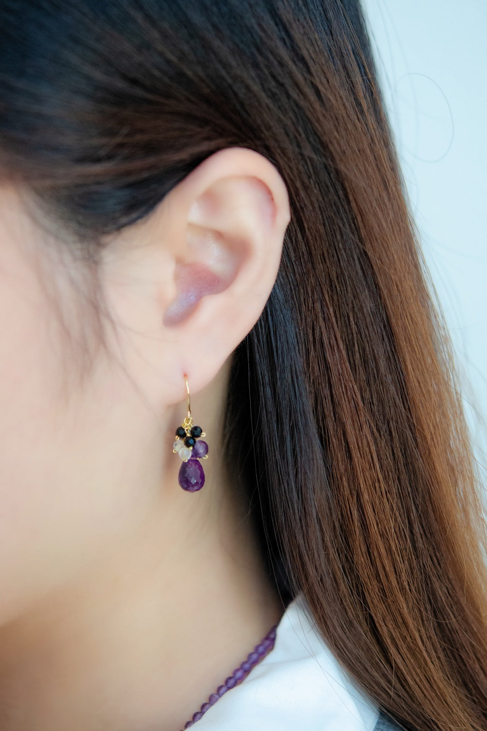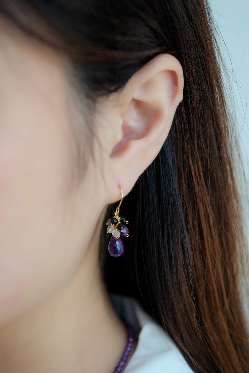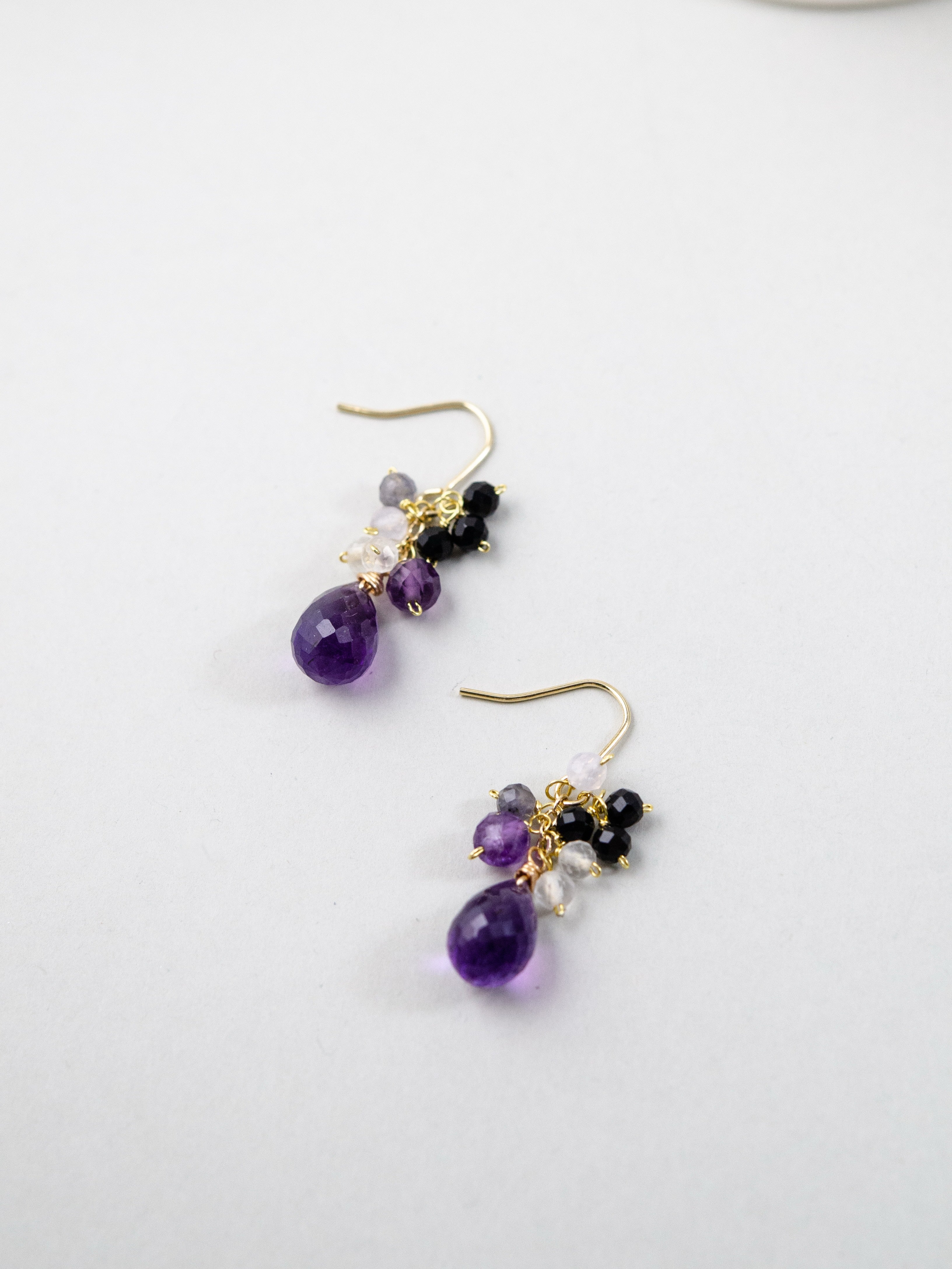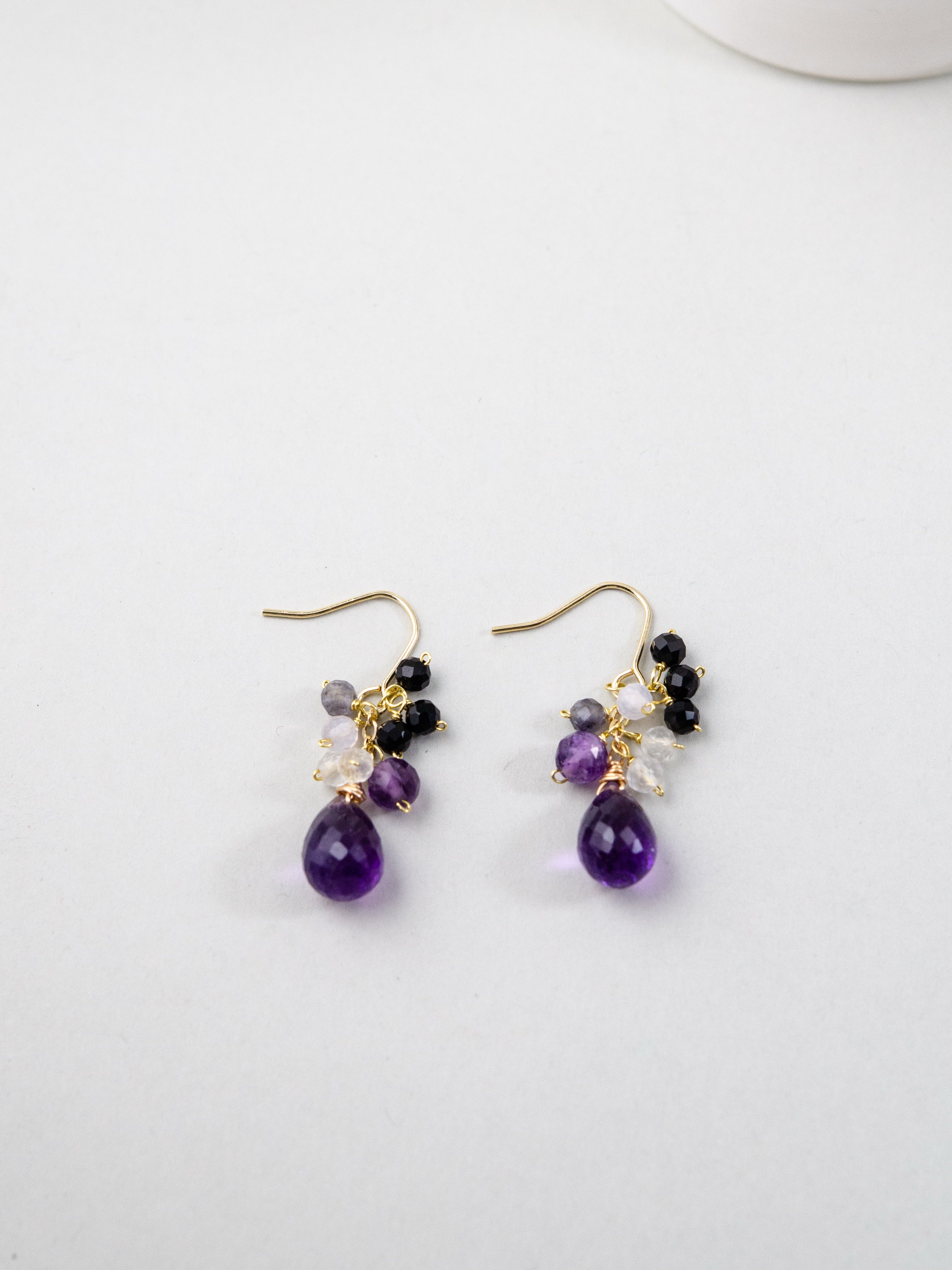 濃淡のアメジストとブラックオブシディアンを組み合わせたイヤリング。大粒のドロップカットアメジストが耳元で軽やかに揺れ、静かで上品な輝きを演出します。天然石ならではの色合いや内包物の違いにより、一点ものの個性を楽しめるデザインです。