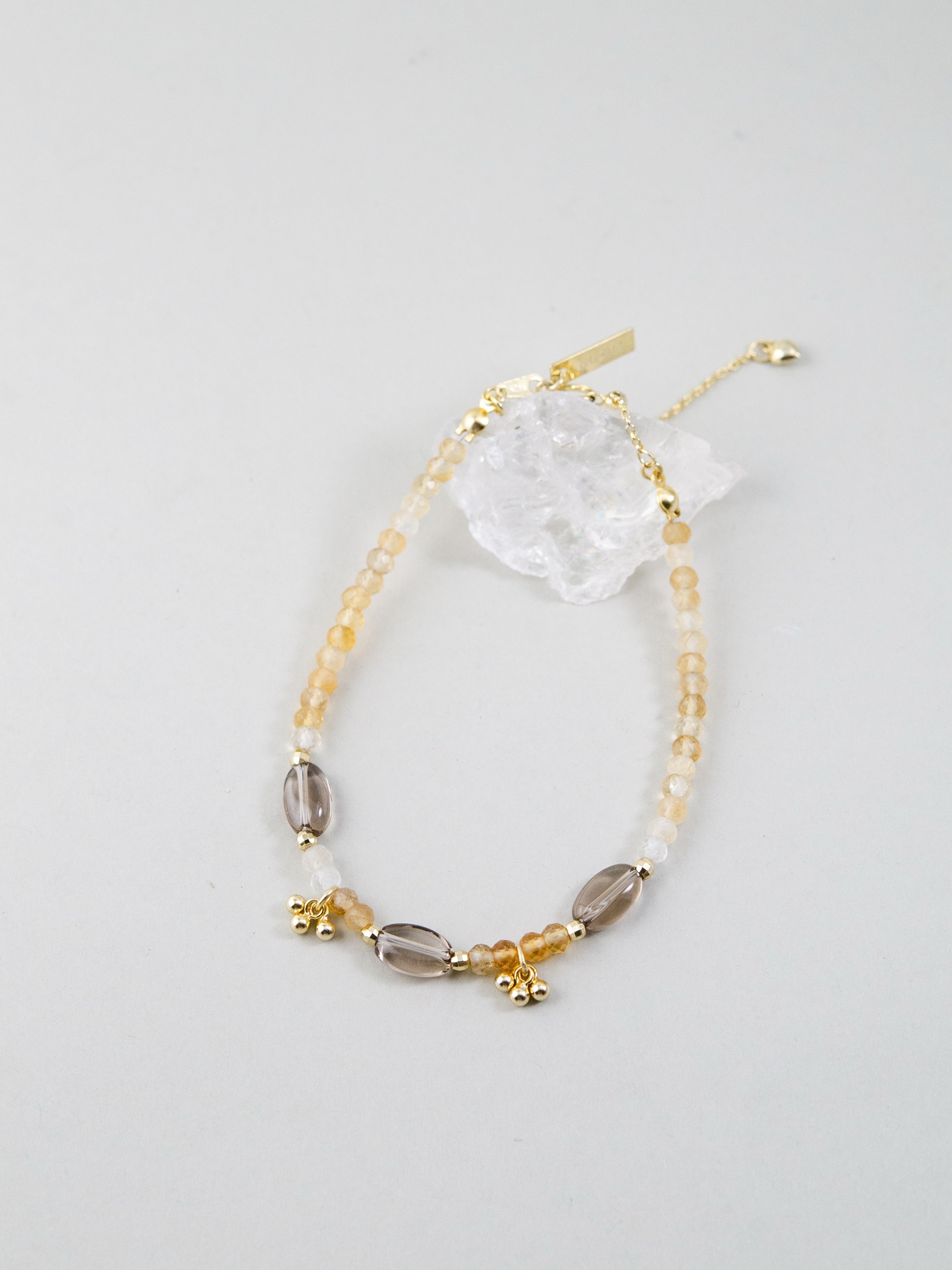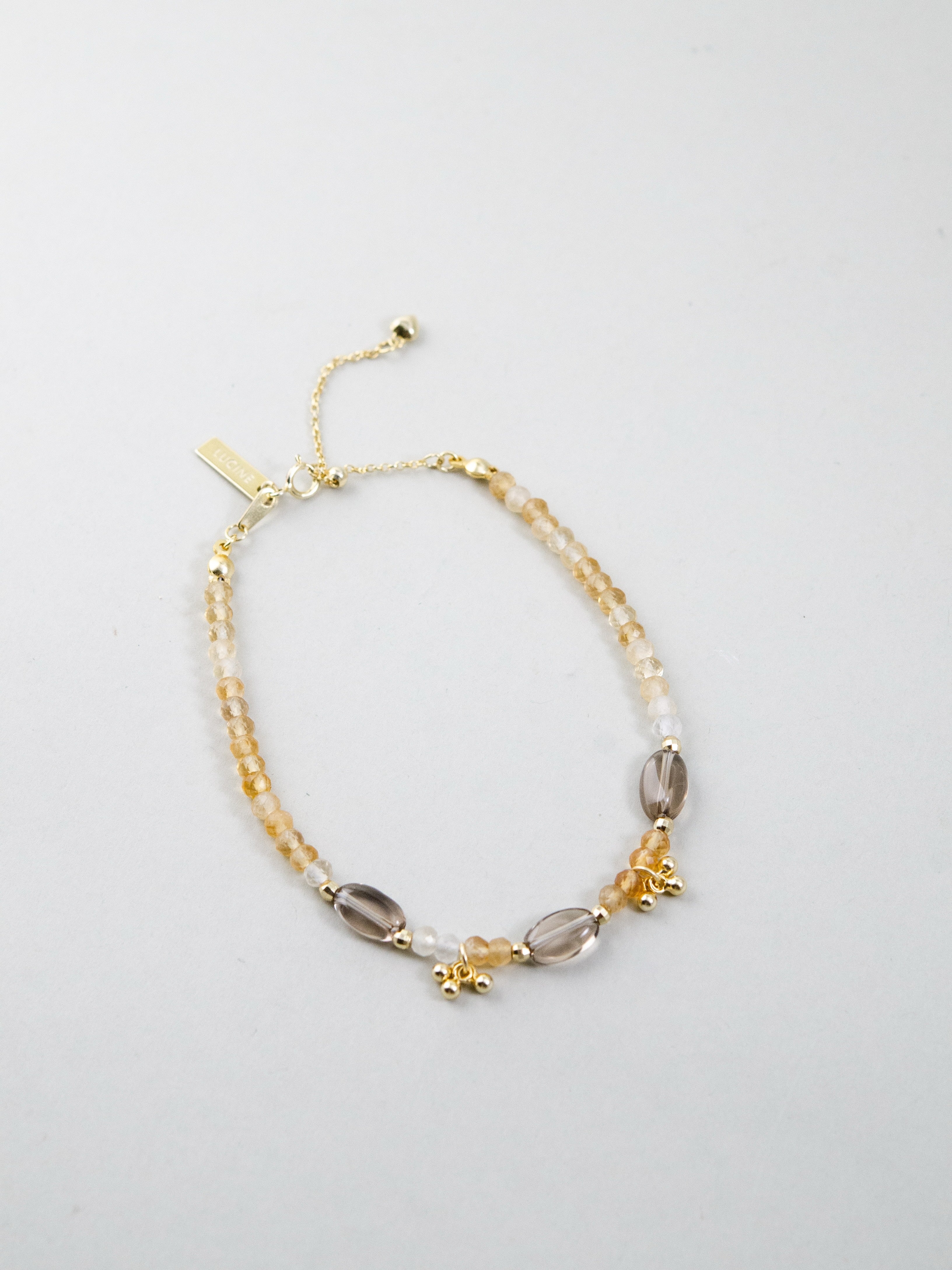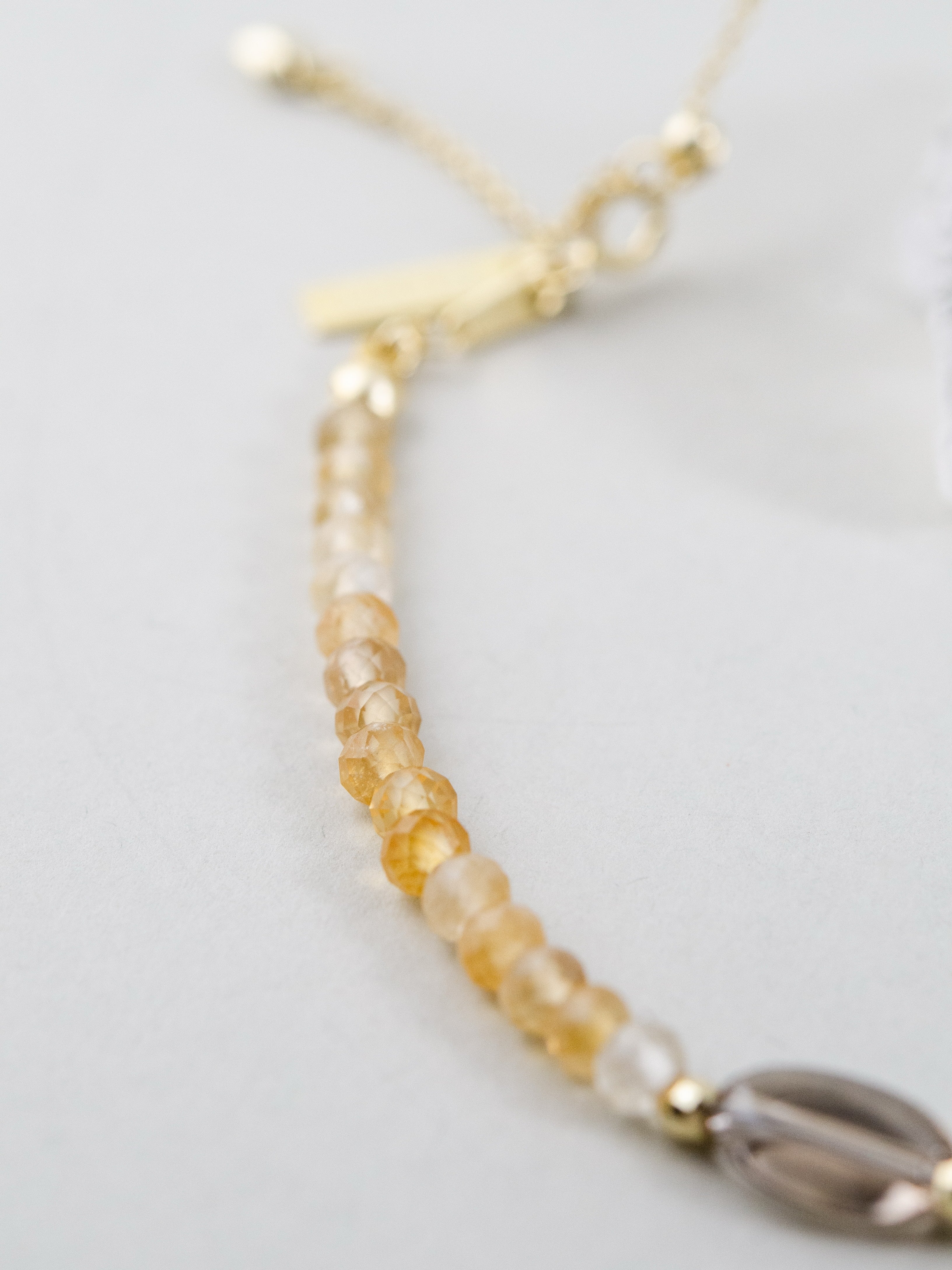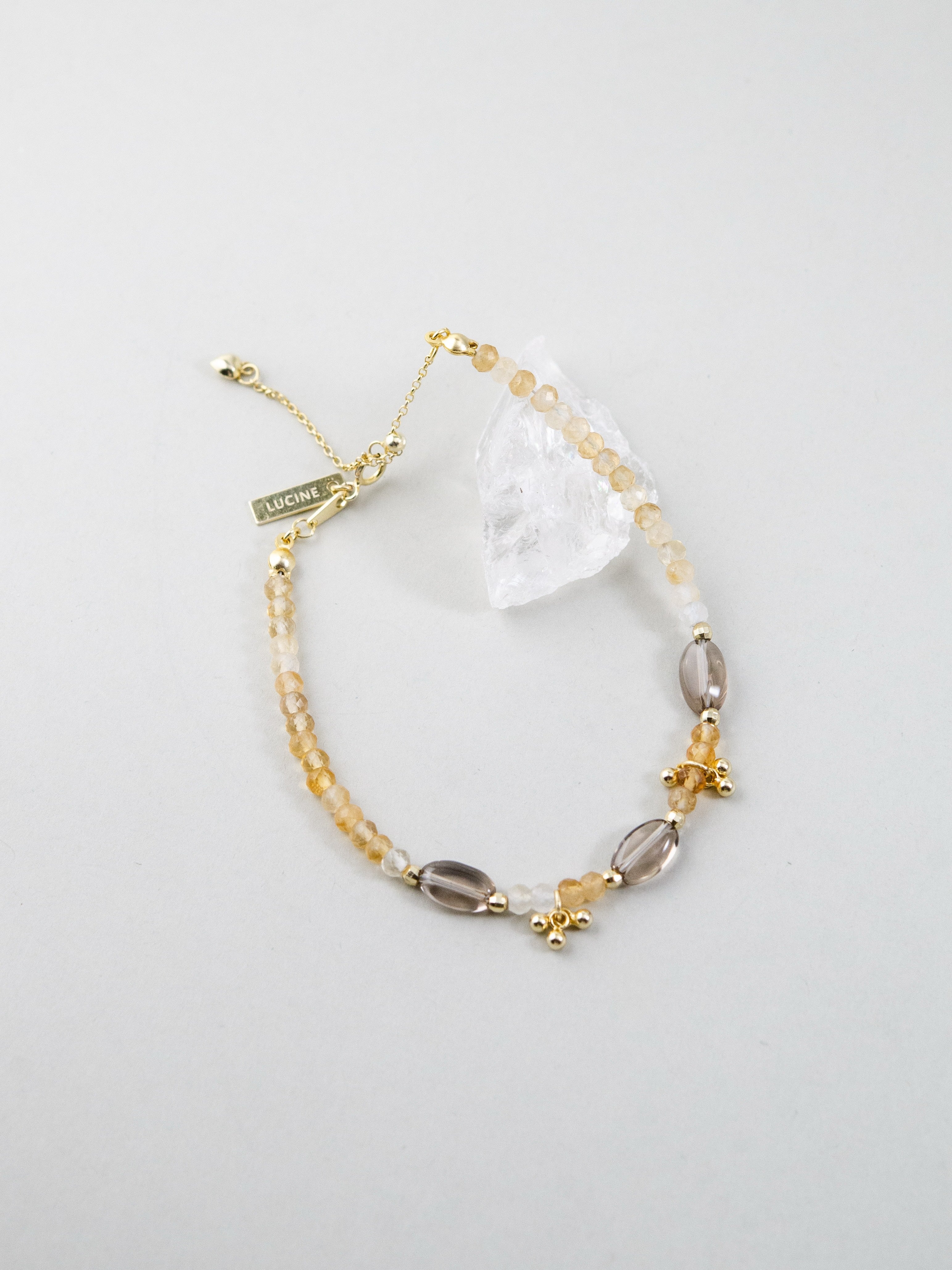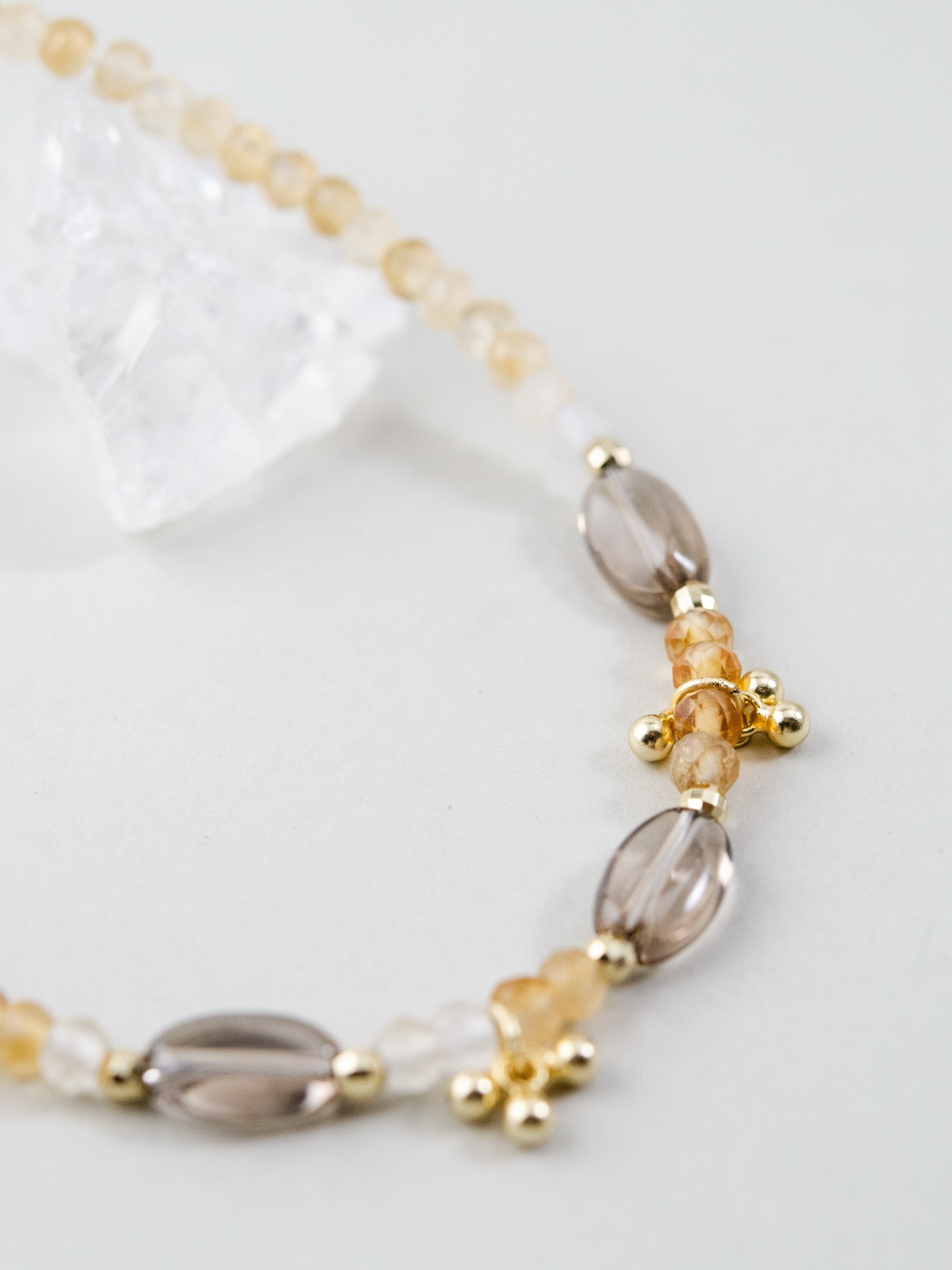 柔らかなイエローの天然シトリンと落ち着いたスモーキークォーツを組み合わせたあたたかみのあるブレスレットです。太陽の光を思わせる明るさと大地のような安定感を手元に宿し、ナチュラルで上品な輝きが日々のスタイルにそっと彩りを添えます。