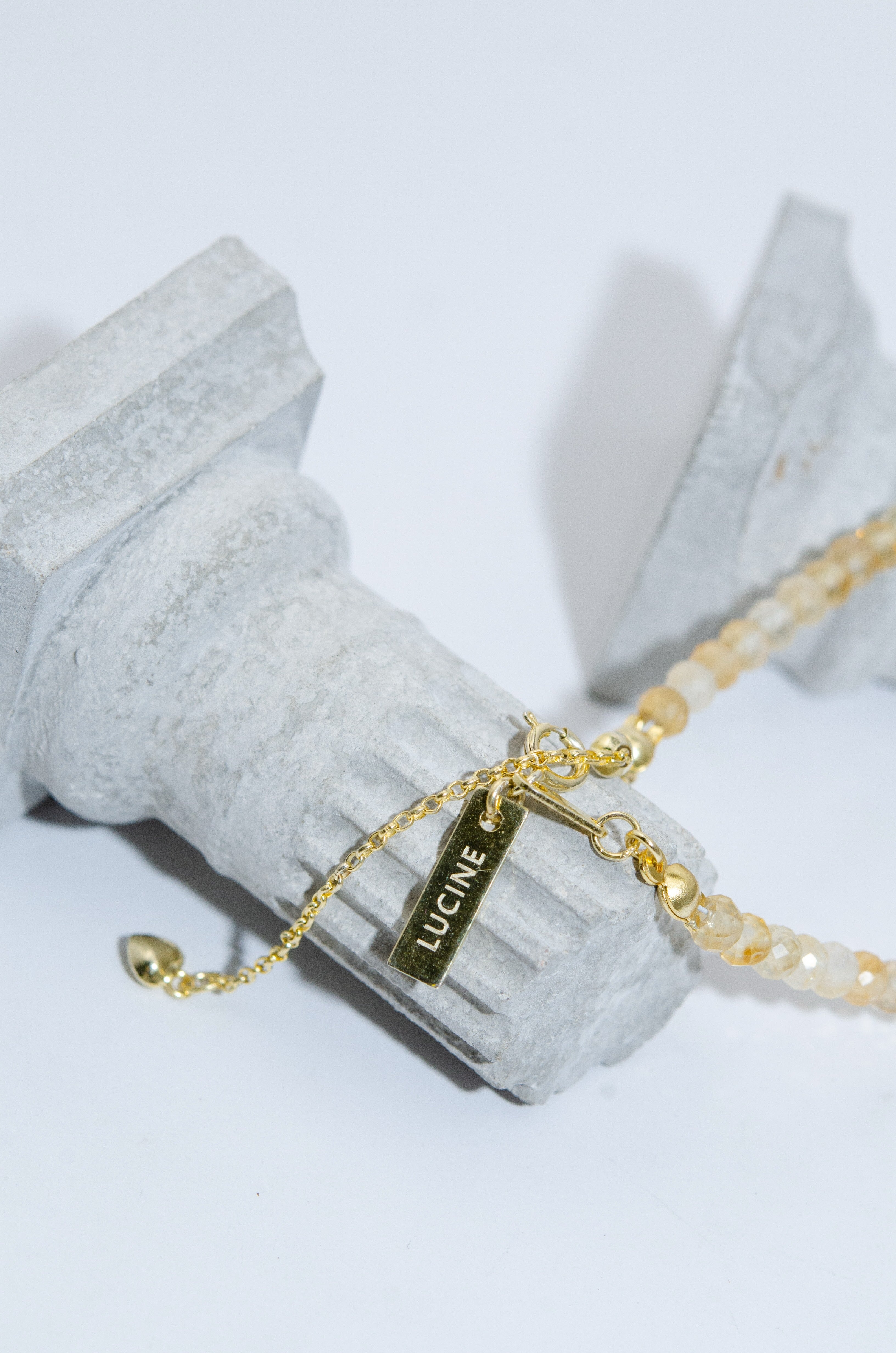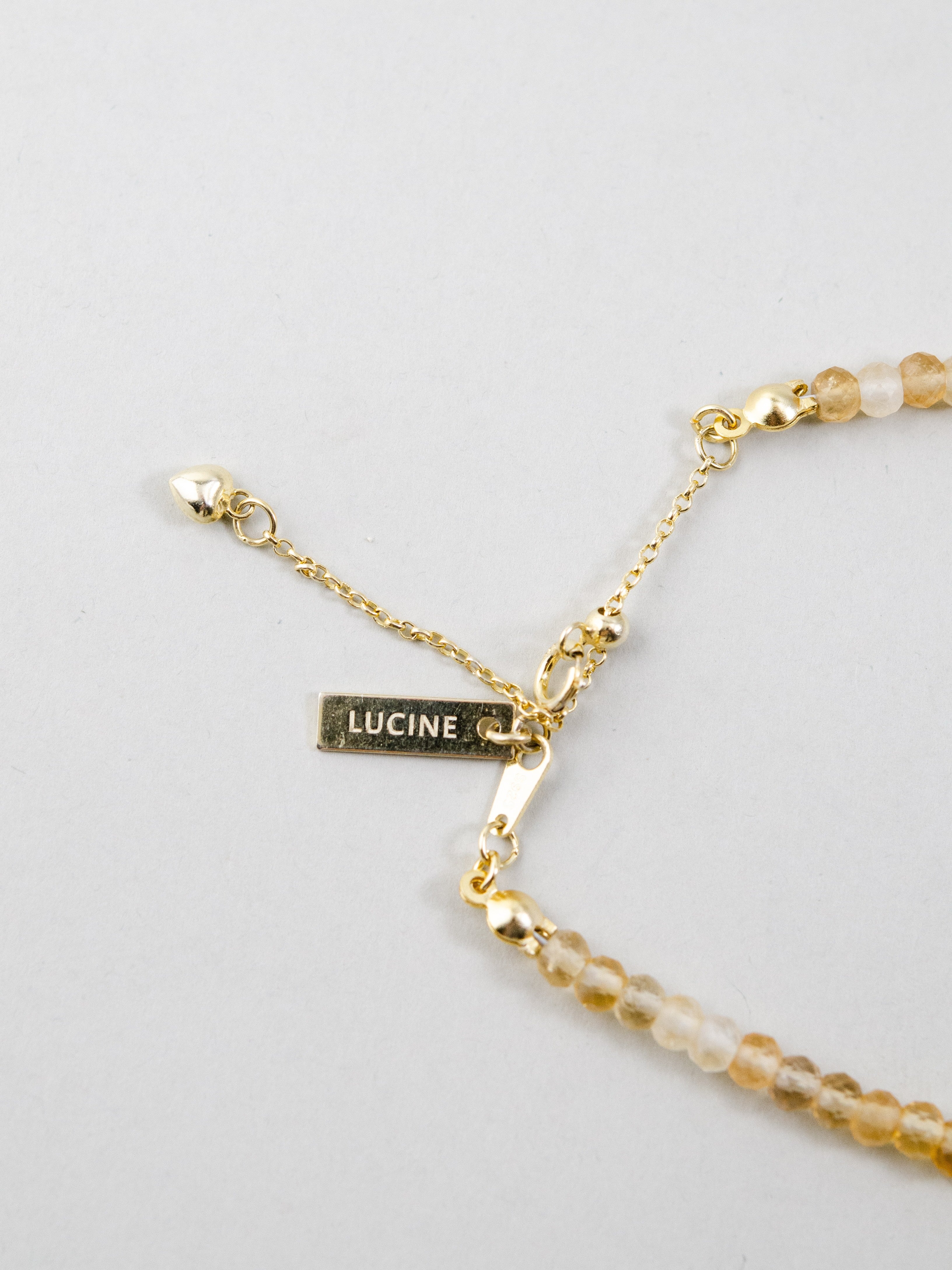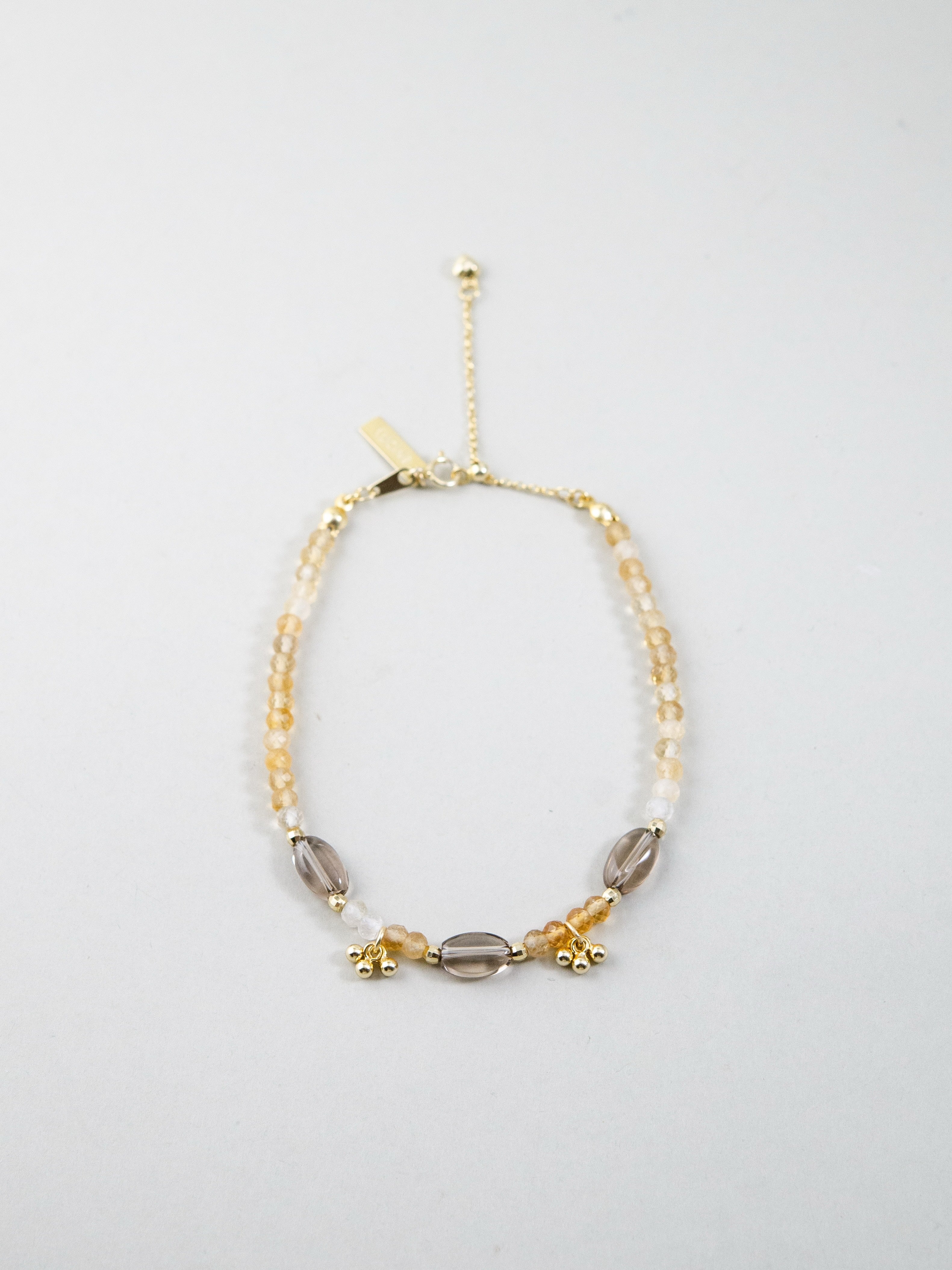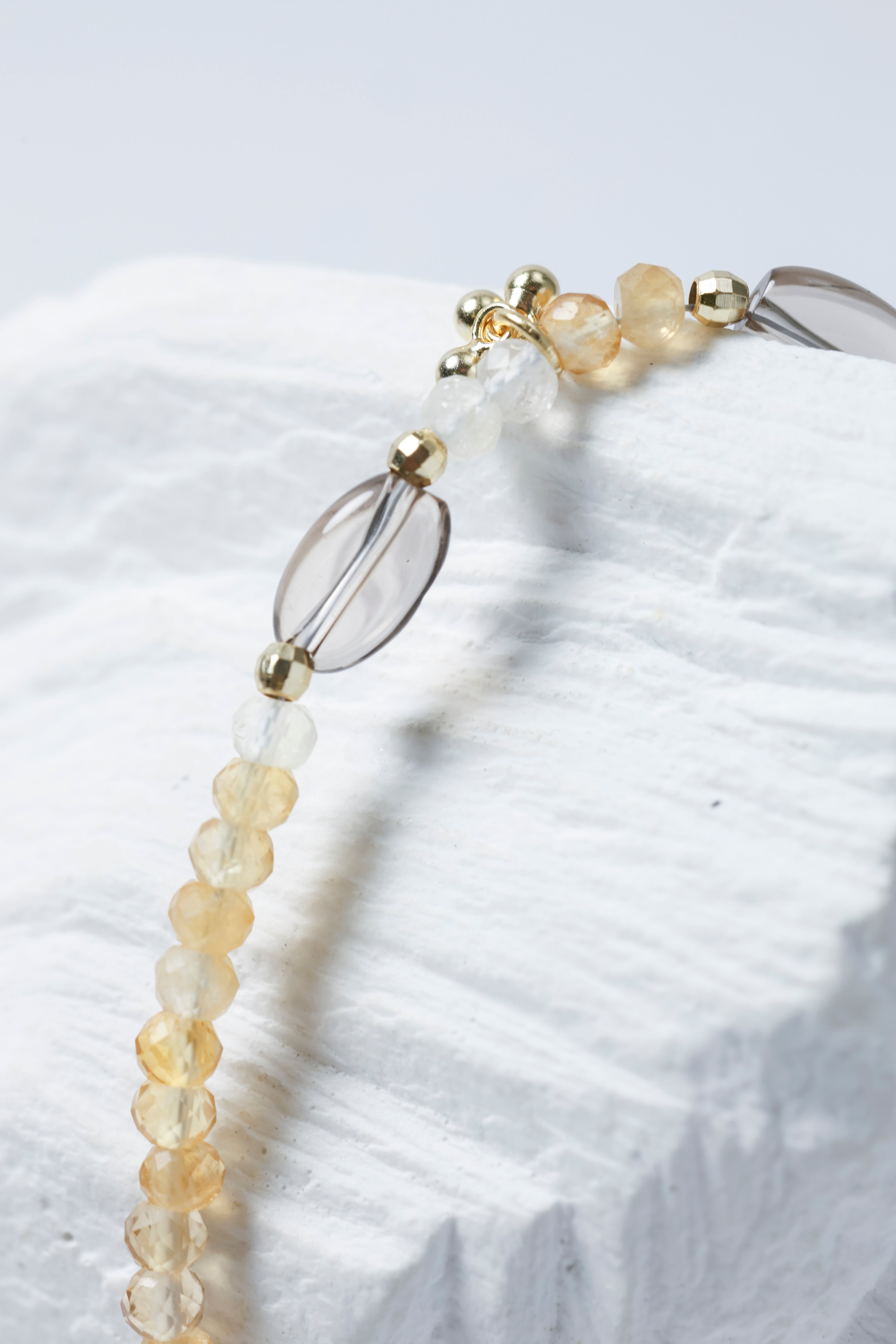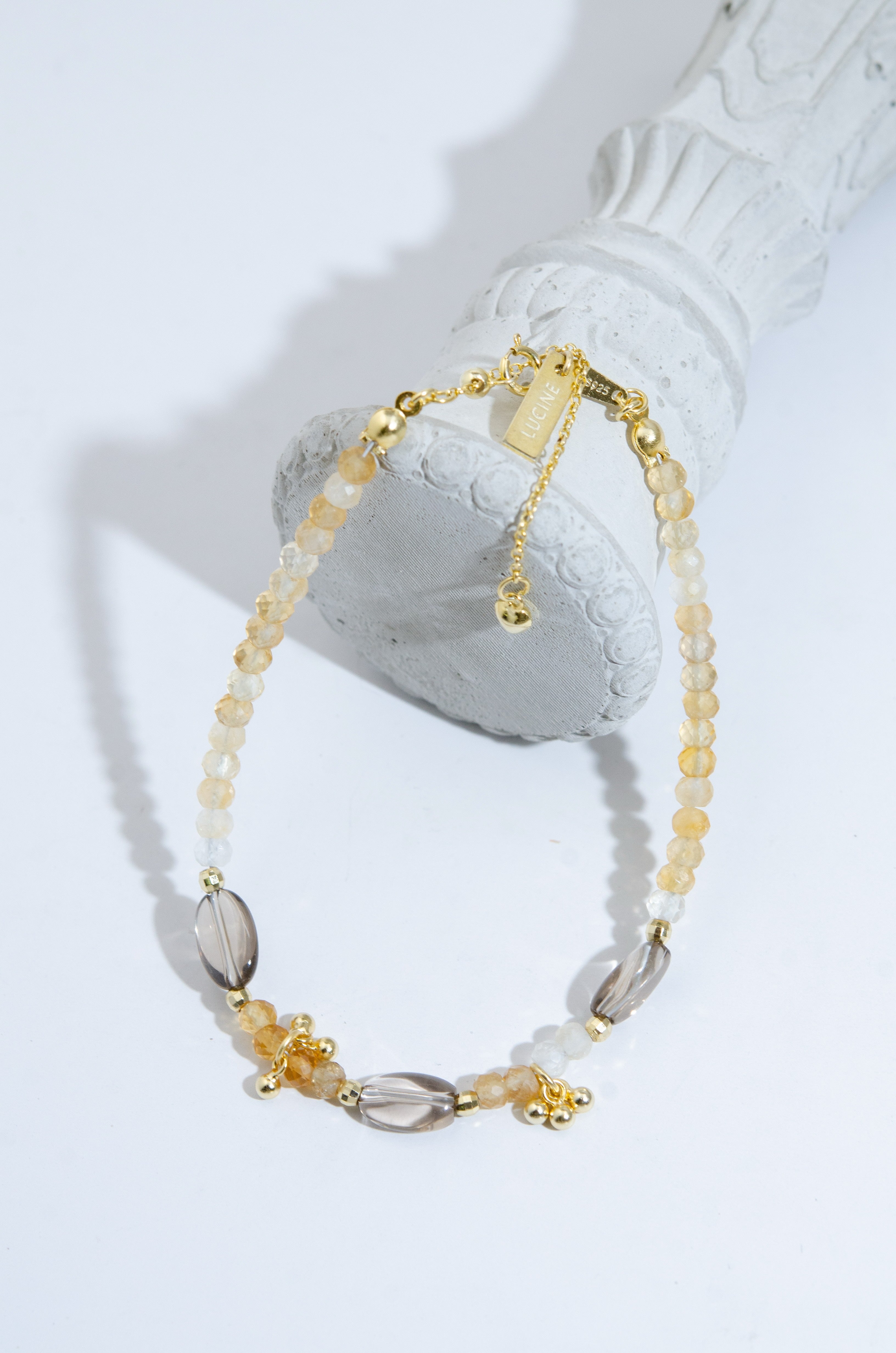 柔らかなイエローの天然シトリンと落ち着いたスモーキークォーツを組み合わせたあたたかみのあるブレスレットです。太陽の光を思わせる明るさと大地のような安定感を手元に宿し、ナチュラルで上品な輝きが日々のスタイルにそっと彩りを添えます。