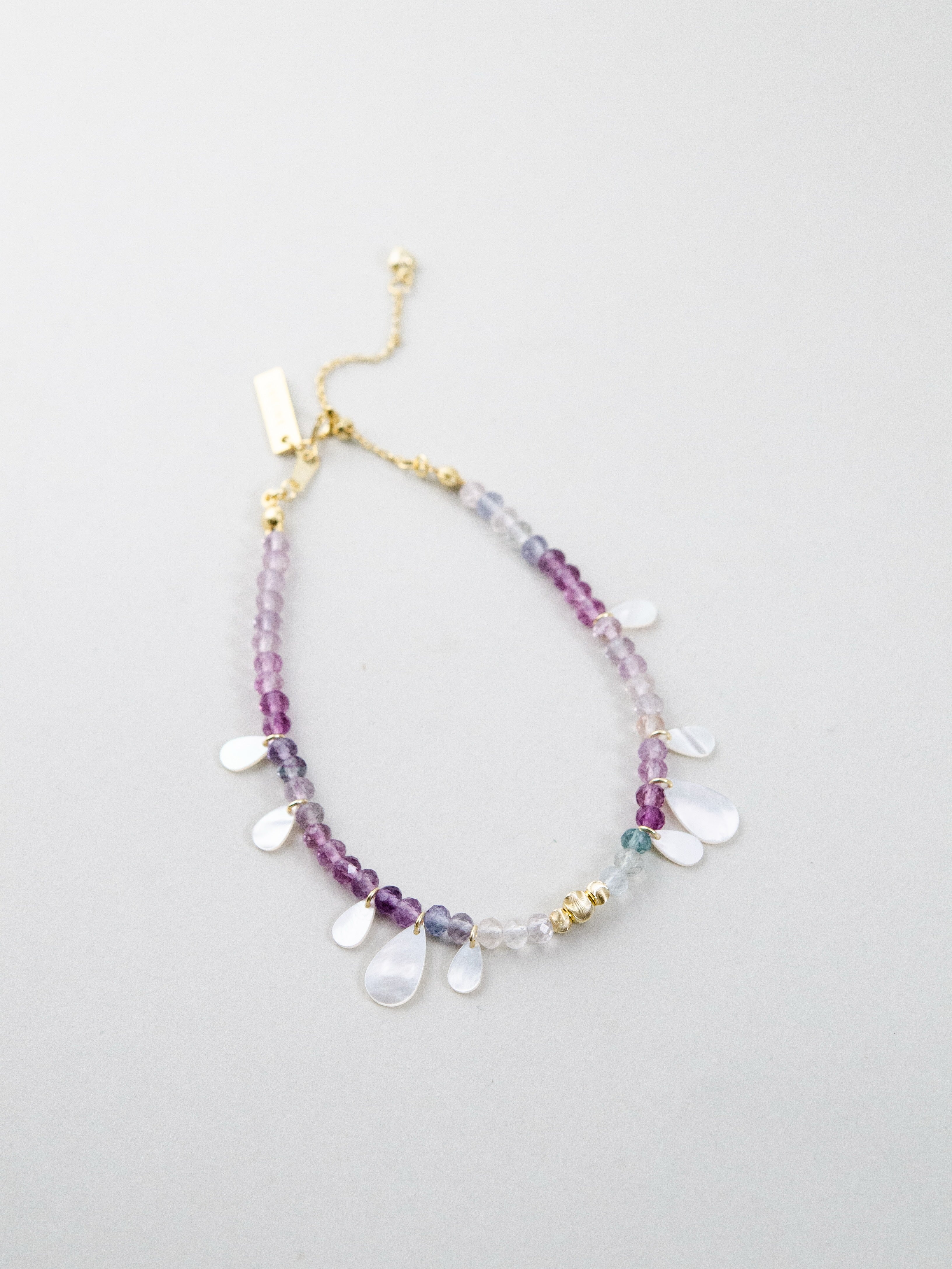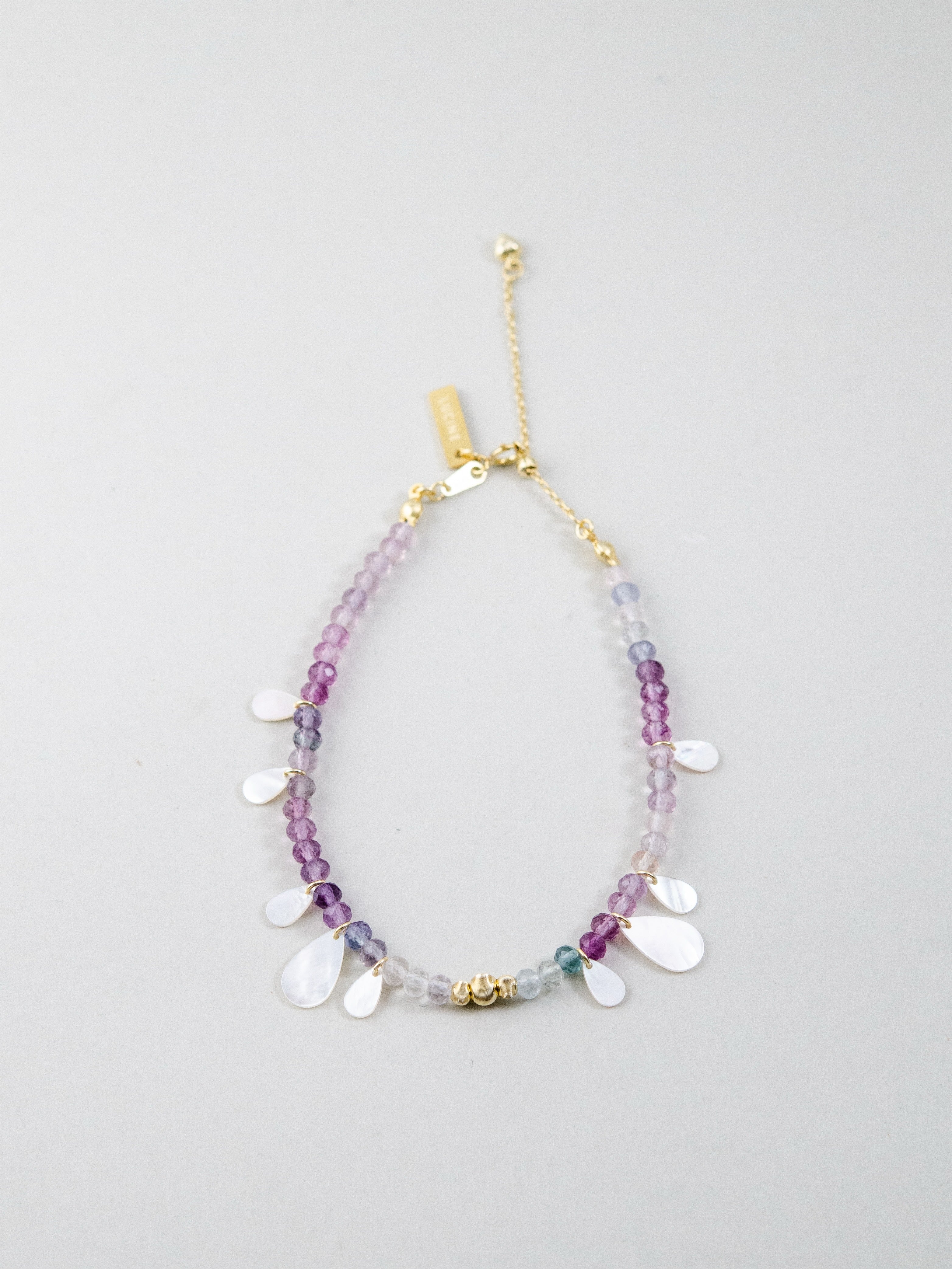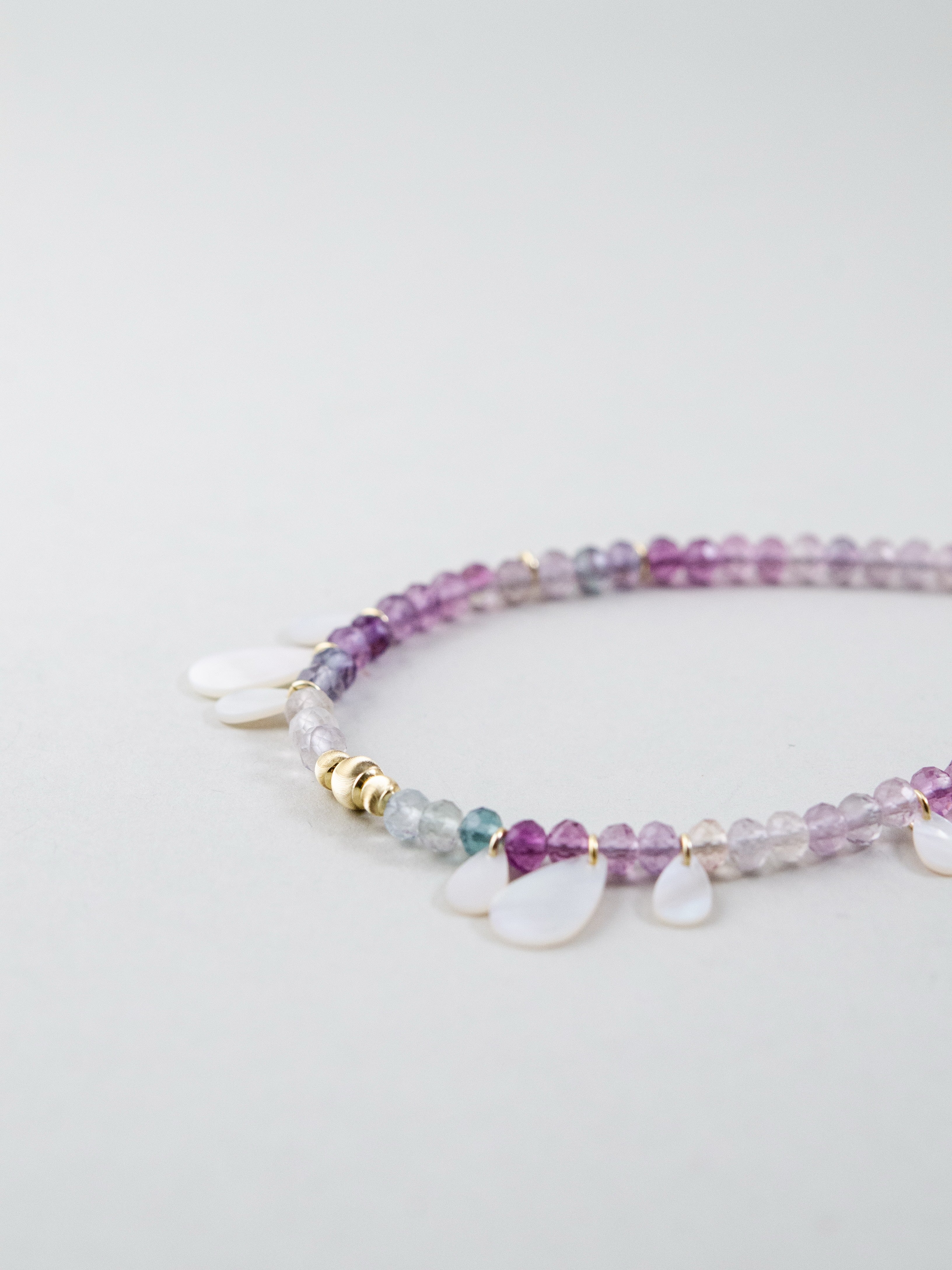 淡いパープルやグリーンが溶け合うフローライトに、水滴のような艶めくシェルを散りばめた、みずみずしい印象のブレスレットです。フローライトは思考をクリアにし集中力を高めるとされ、心を落ち着けたい時にもおすすめ。白蝶貝のシェルは光を受けてやさしく輝き、水滴の形が軽やかさをプラスしています。軽やかで優しい輝きは、日常から特別な日まで幅広く寄り添います。