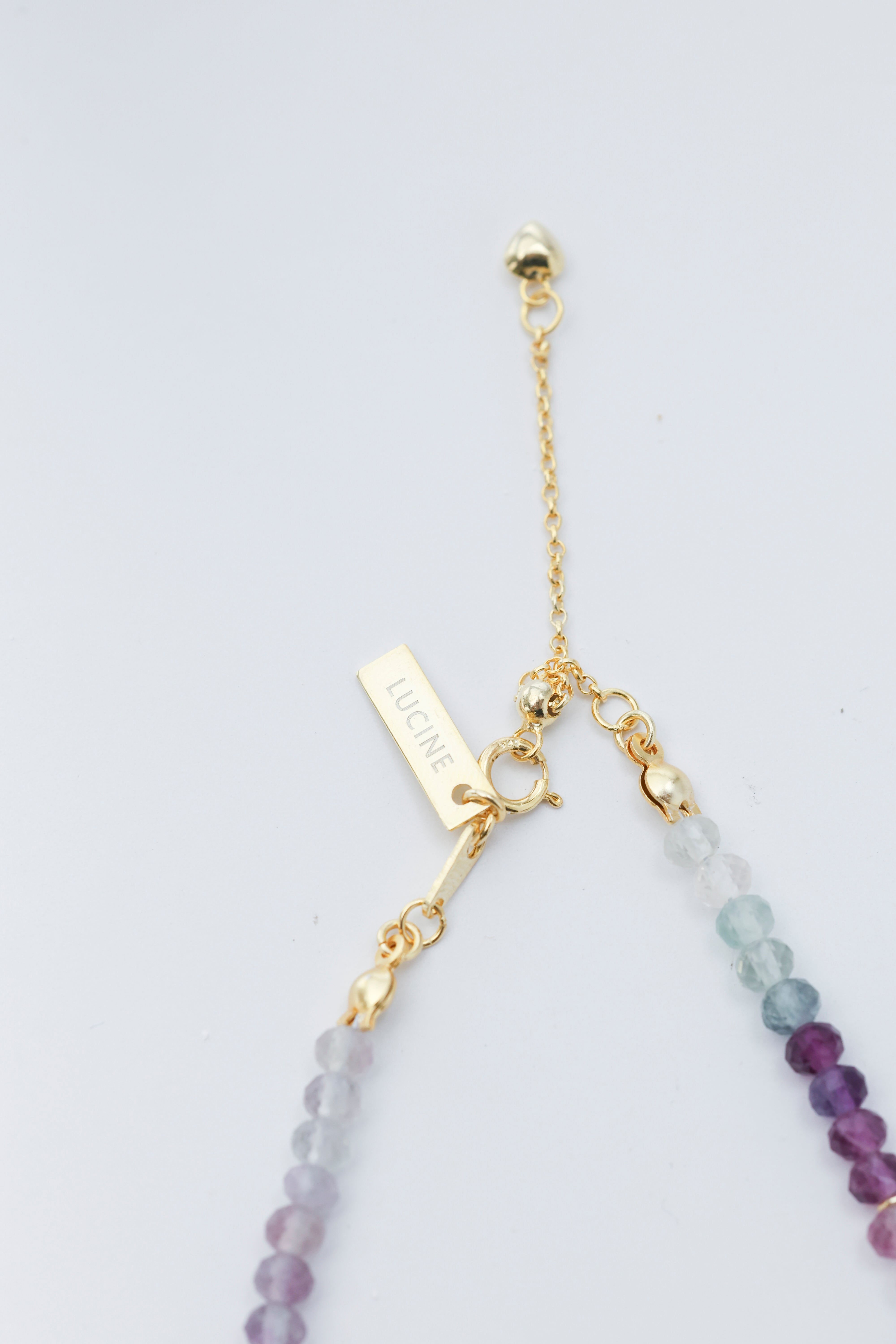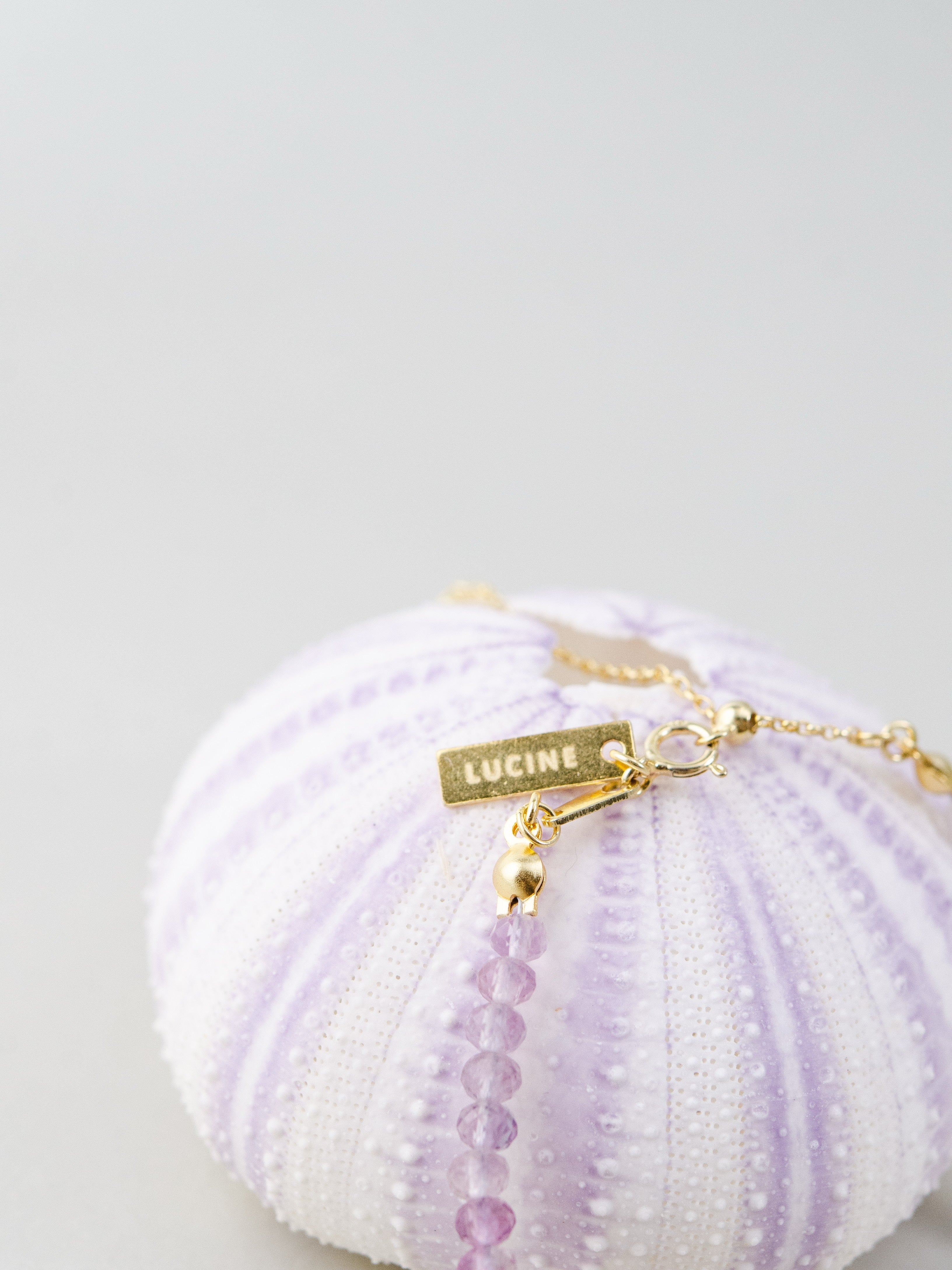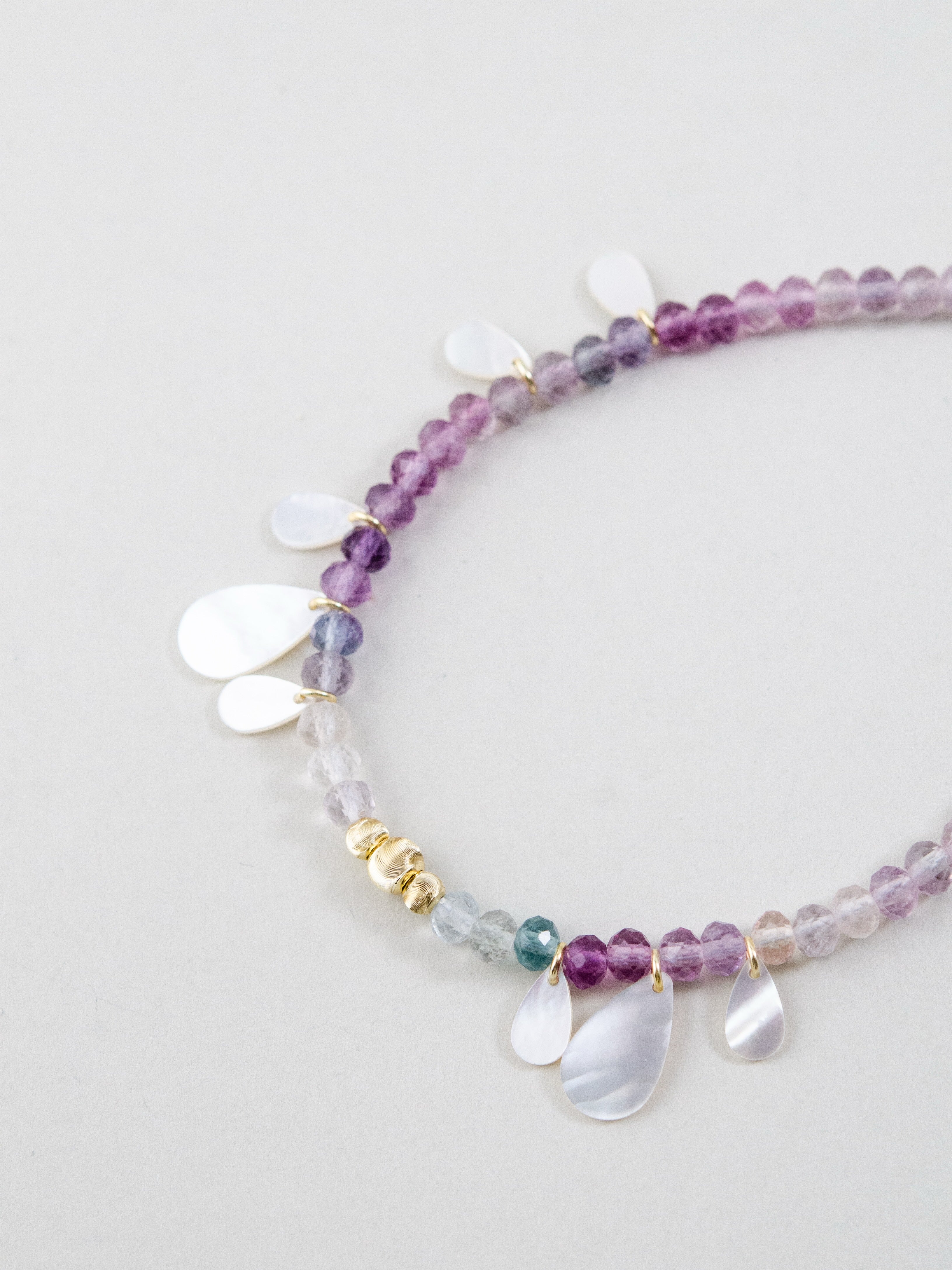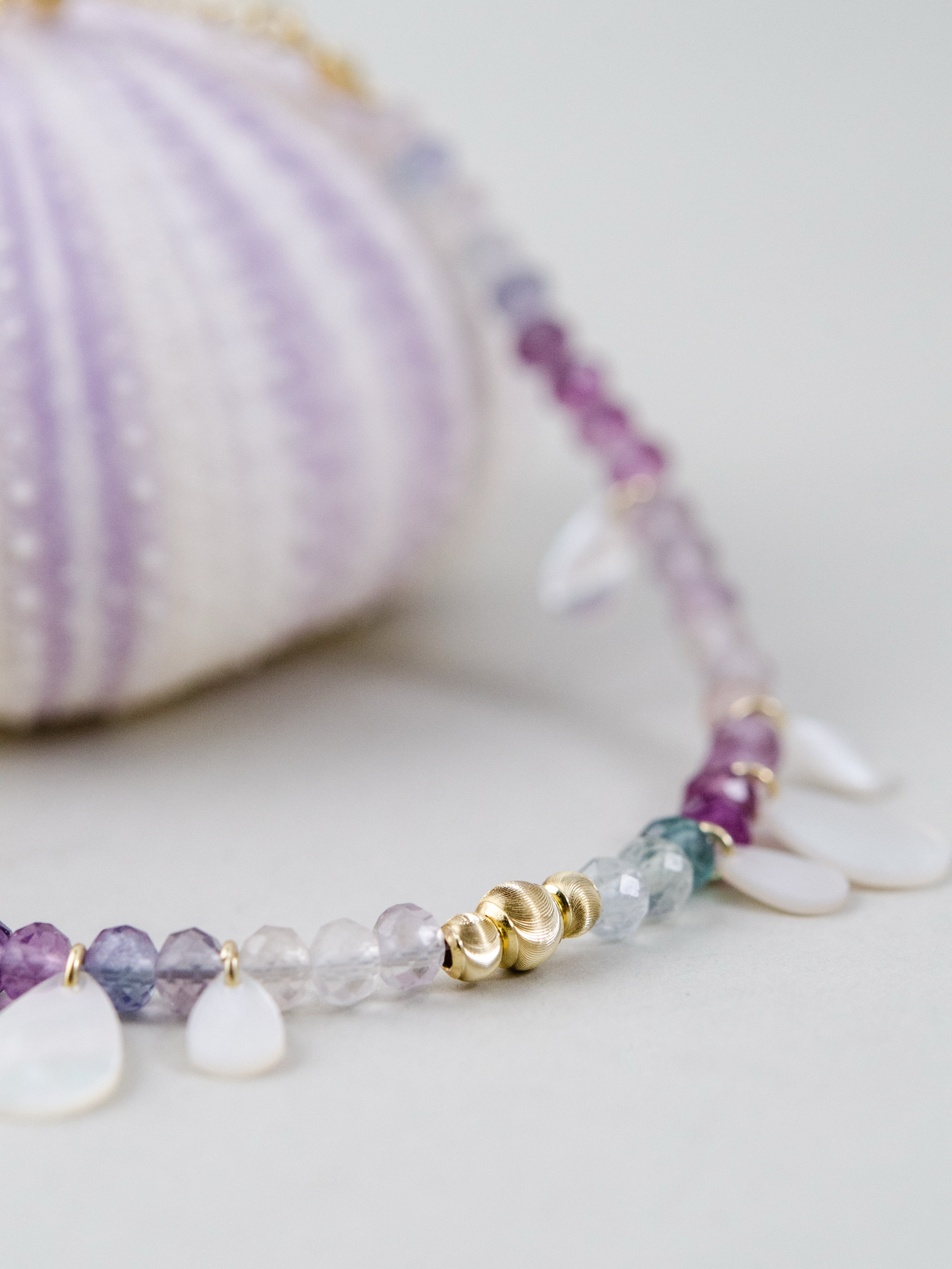 淡いパープルやグリーンが溶け合うフローライトに、水滴のような艶めくシェルを散りばめた、みずみずしい印象のブレスレットです。フローライトは思考をクリアにし集中力を高めるとされ、心を落ち着けたい時にもおすすめ。白蝶貝のシェルは光を受けてやさしく輝き、水滴の形が軽やかさをプラスしています。軽やかで優しい輝きは、日常から特別な日まで幅広く寄り添います。