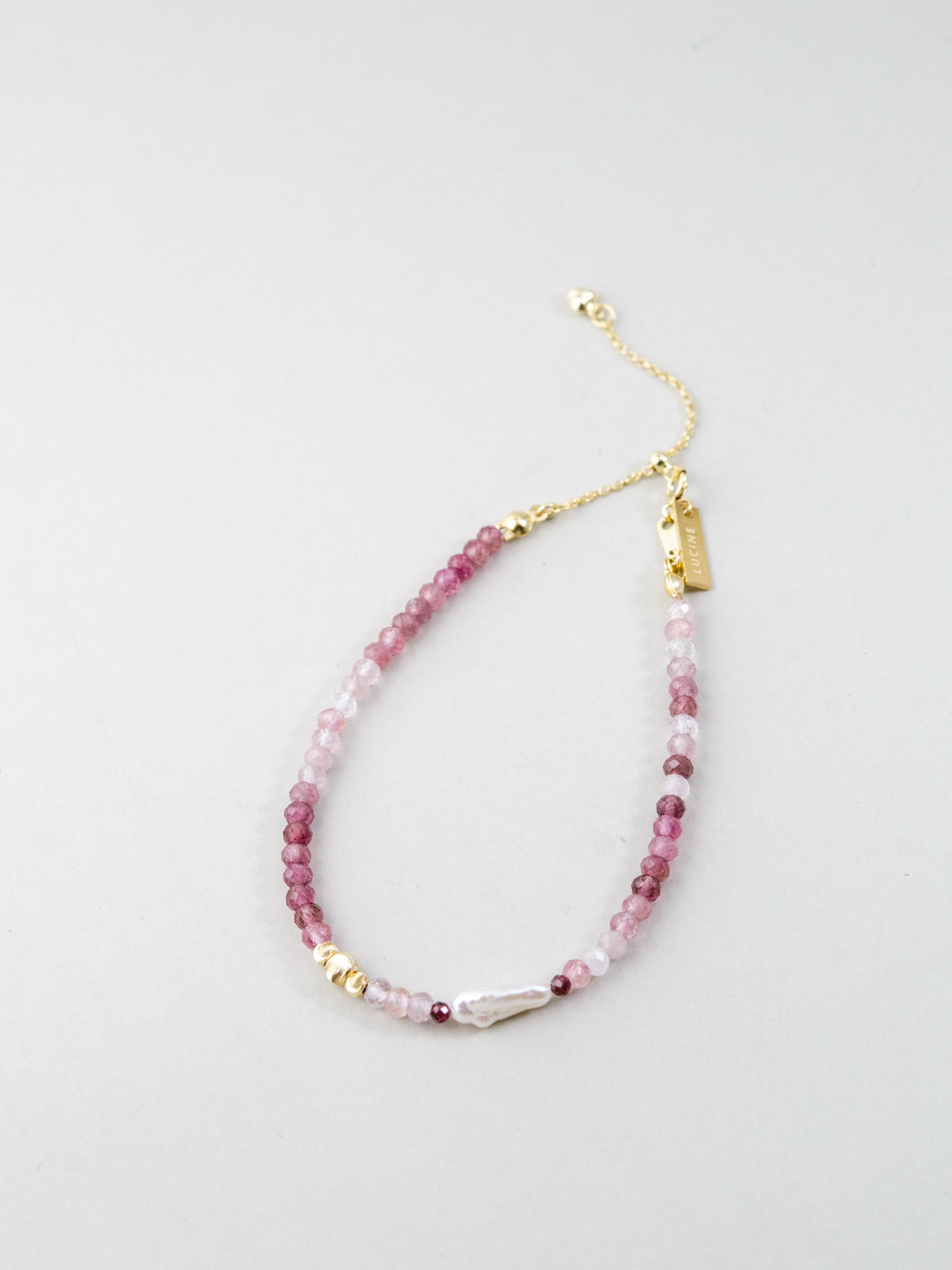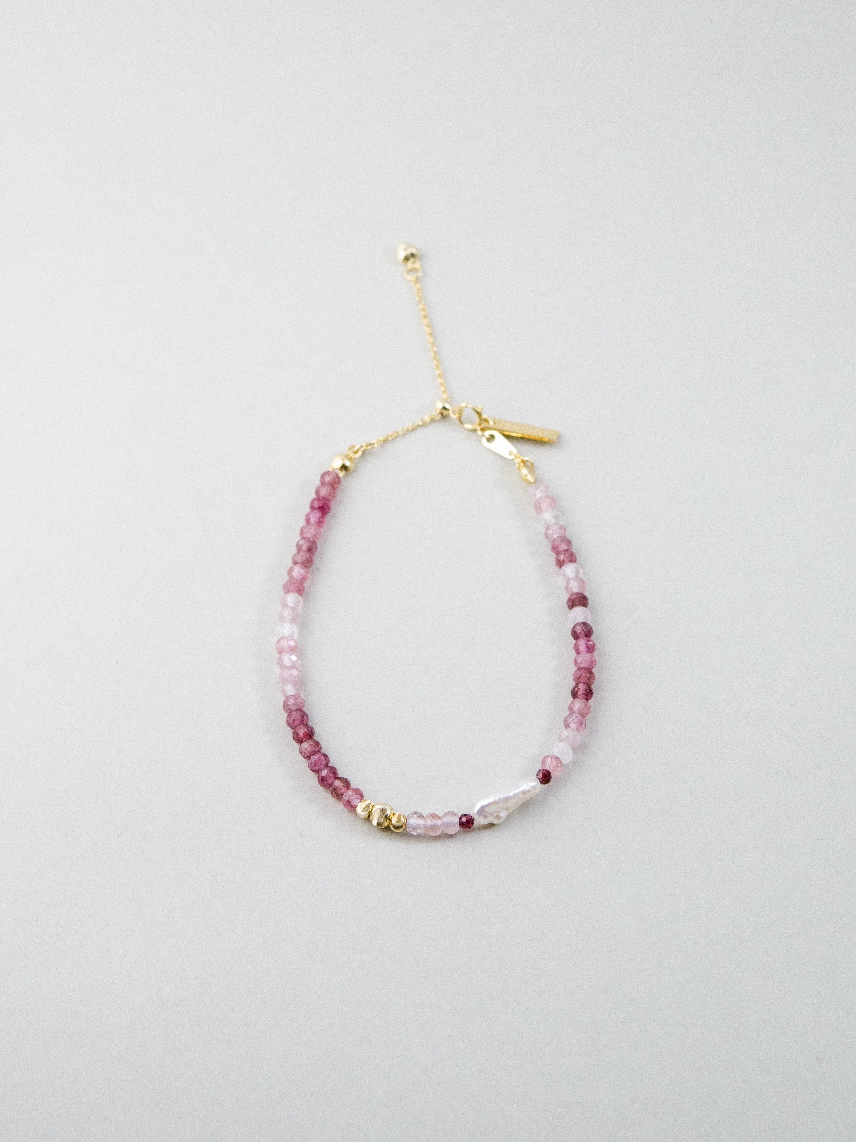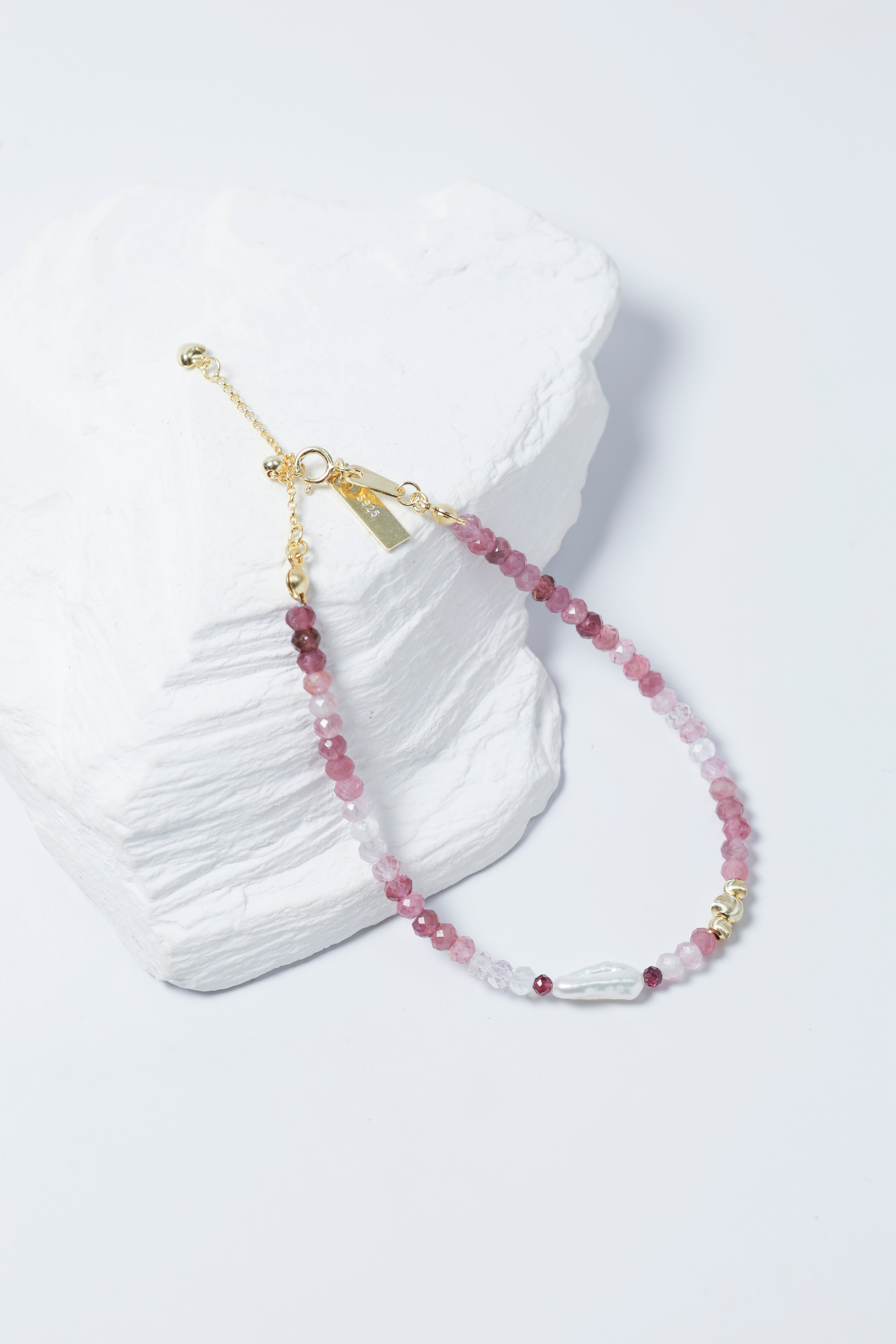 やさしいピンクカラーの天然トルマリンをベースに、個性的なバロックパールを一粒あしらった上品なブレスレットです。一粒ずつ表情の異なる天然石とバロックパールが、世界にひとつだけの輝きを手元にもたらします。ピンクトルマリンは愛情や優しさを象徴し、心を前向きに整えるとされ、バロックパールは自然な形が魅力の一点物として個性と柔らかさを添えます。