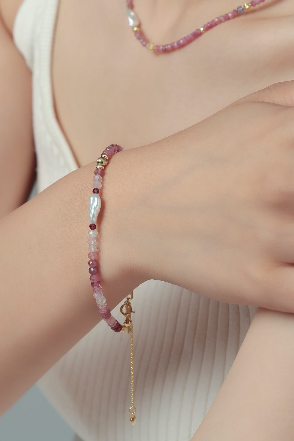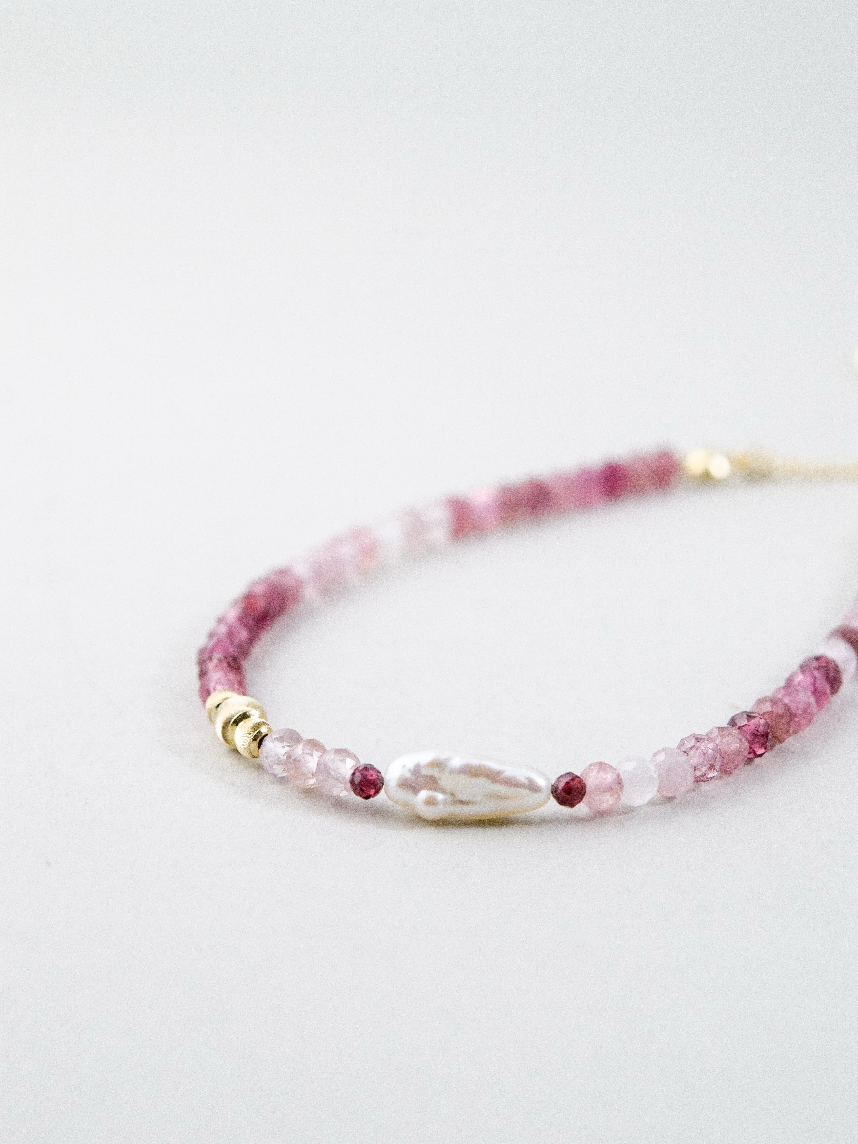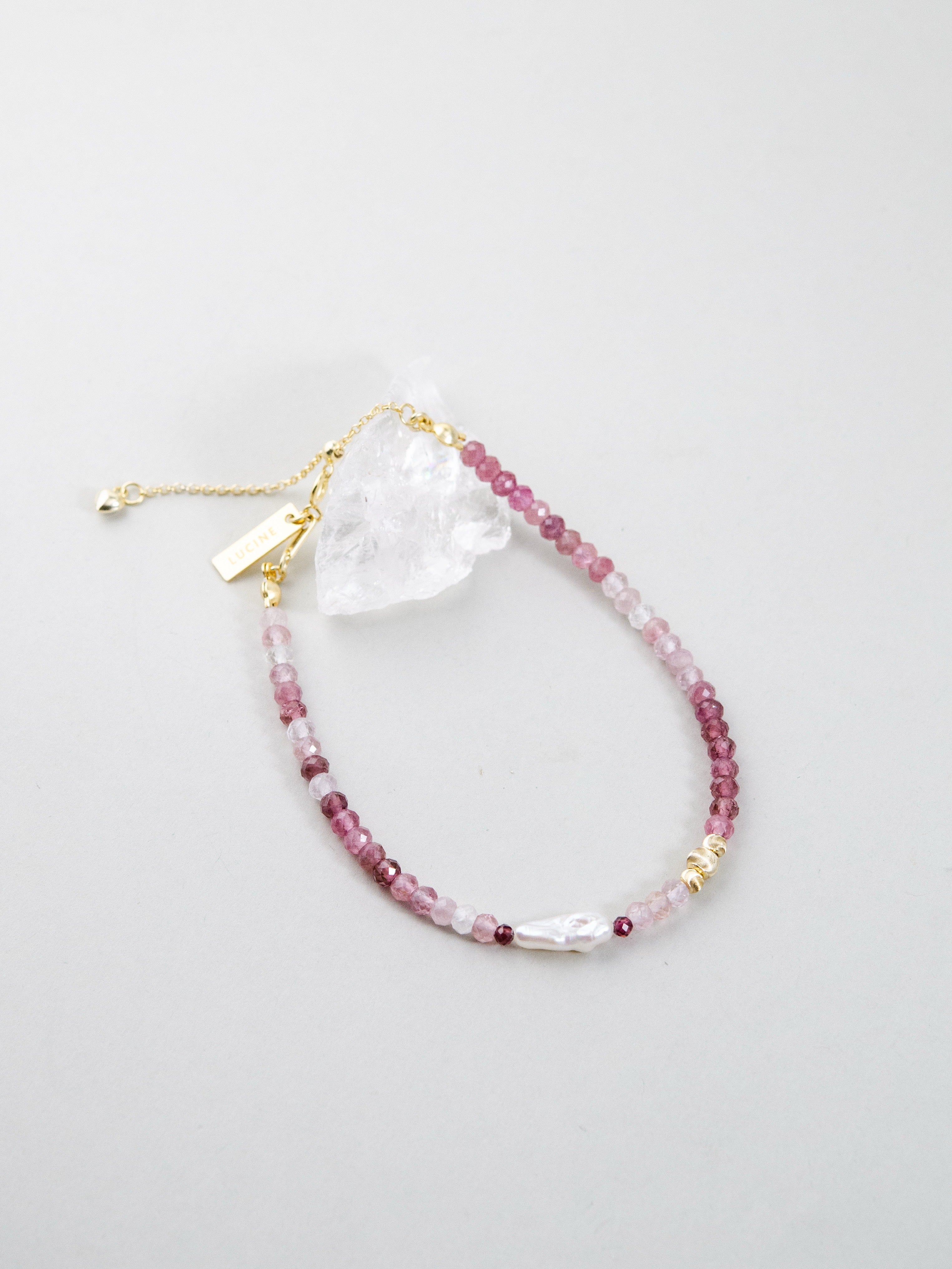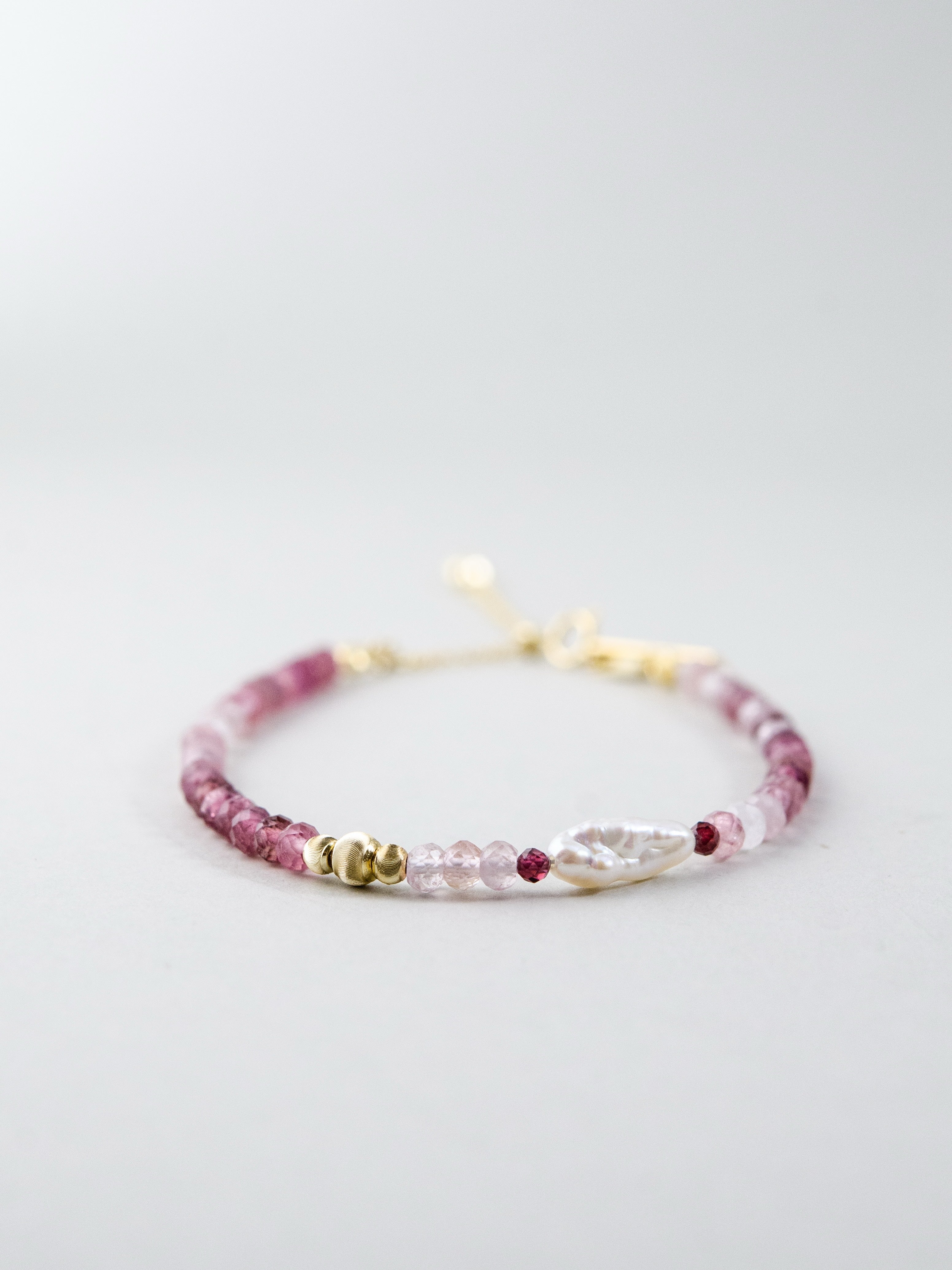 やさしいピンクカラーの天然トルマリンをベースに、個性的なバロックパールを一粒あしらった上品なブレスレットです。一粒ずつ表情の異なる天然石とバロックパールが、世界にひとつだけの輝きを手元にもたらします。ピンクトルマリンは愛情や優しさを象徴し、心を前向きに整えるとされ、バロックパールは自然な形が魅力の一点物として個性と柔らかさを添えます。