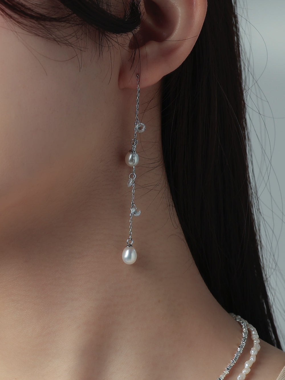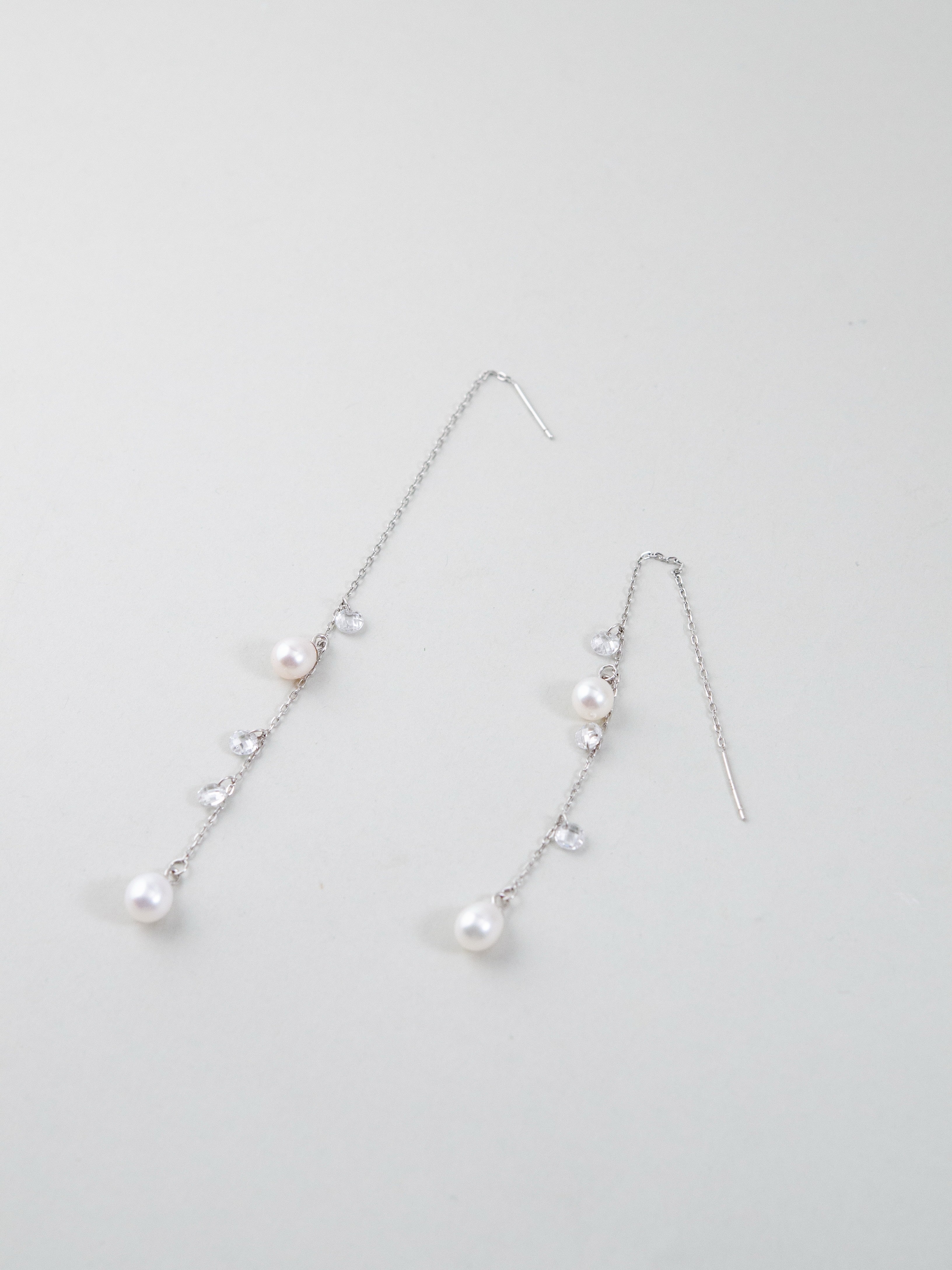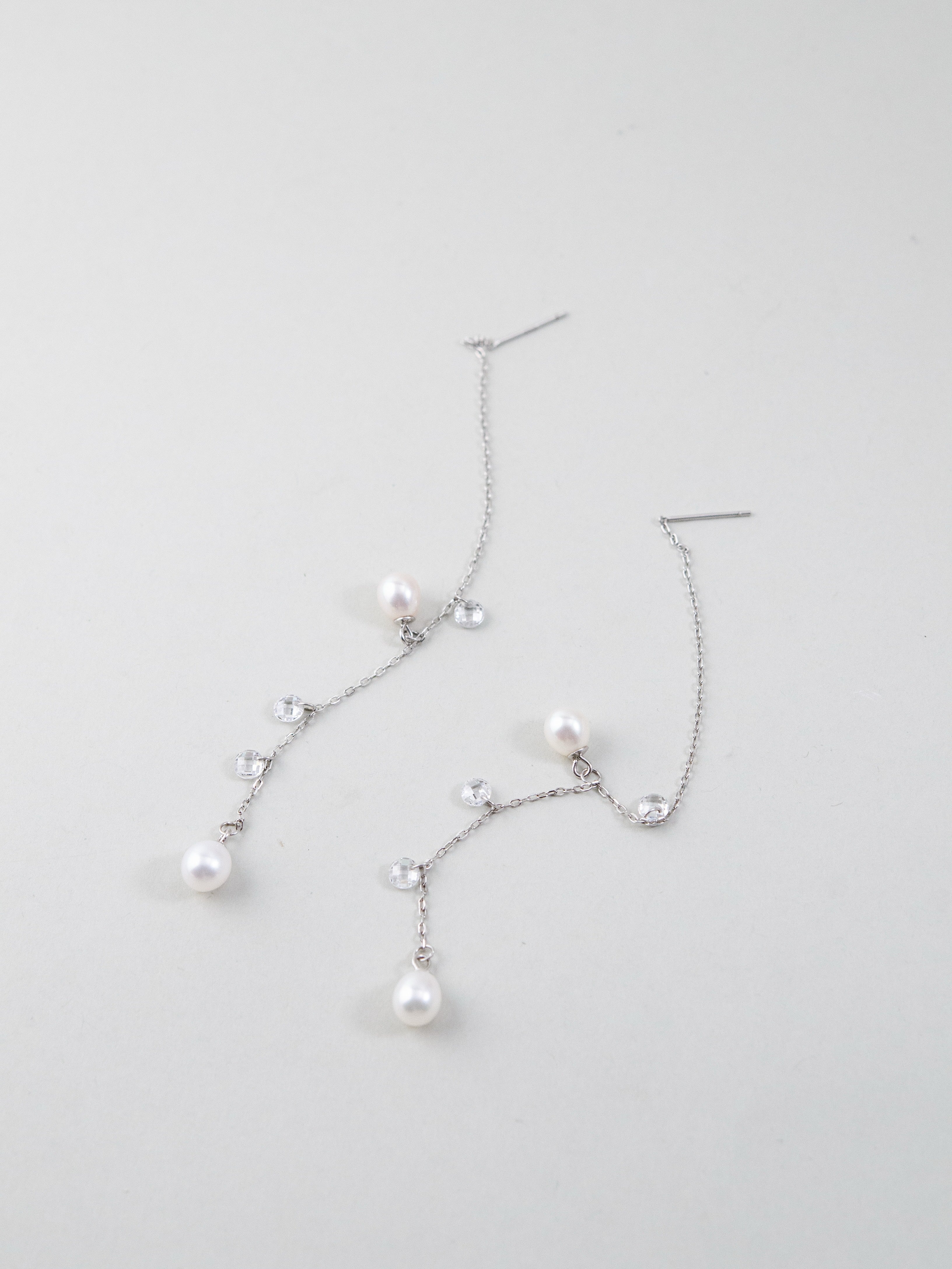ミニマルな美しさを追求したピアスで、繊細なシルバーチェーンに淡水パールとカットガラスビーズをあしらい、朝露のような透明感を耳元に演出します。天然淡水パールの柔らかな艶とカットガラスのきらめきが、上品かつ華やかな印象をプラス。