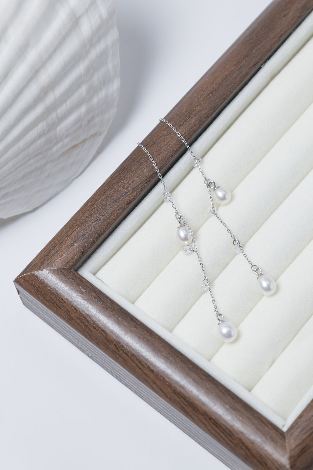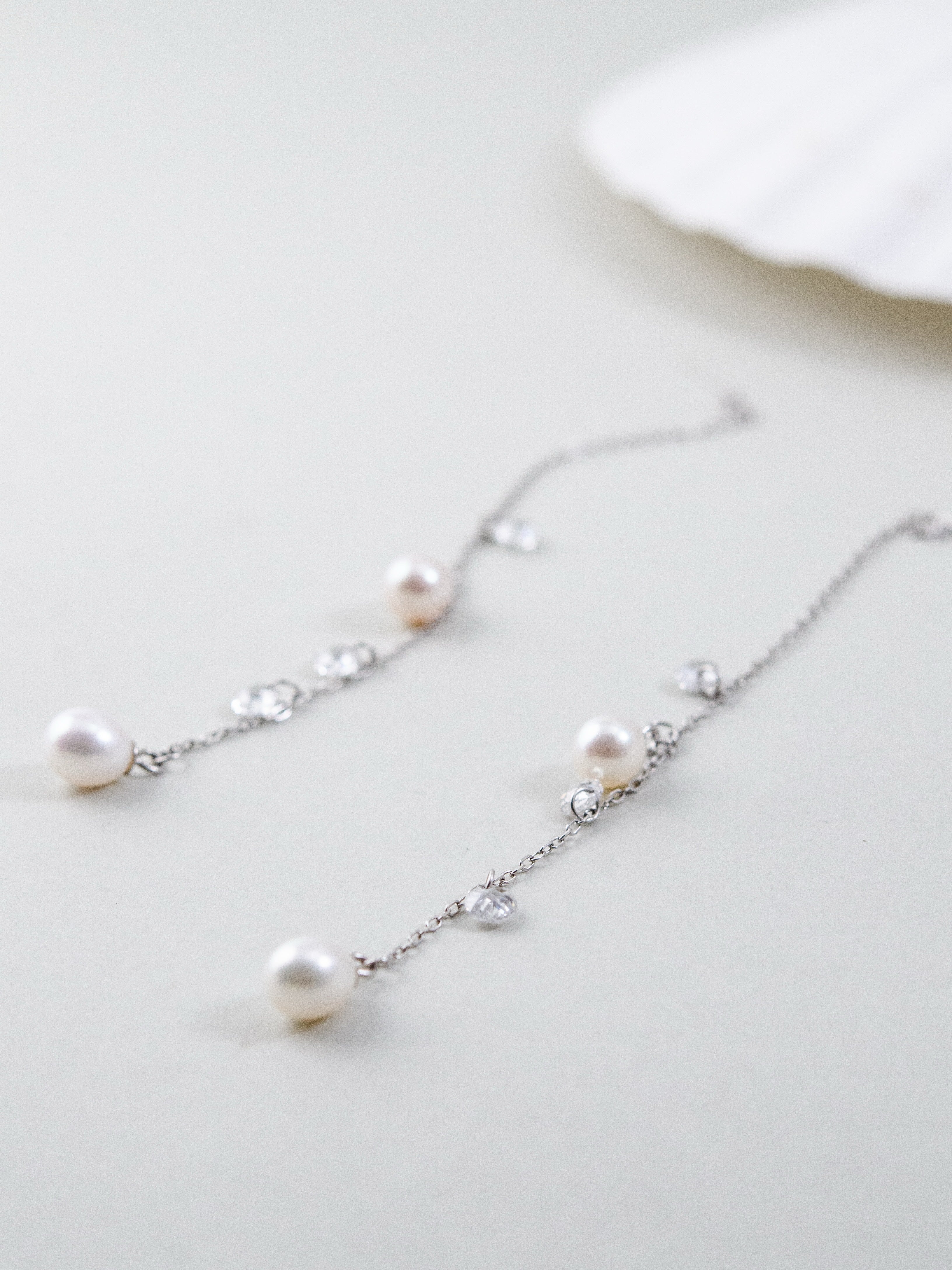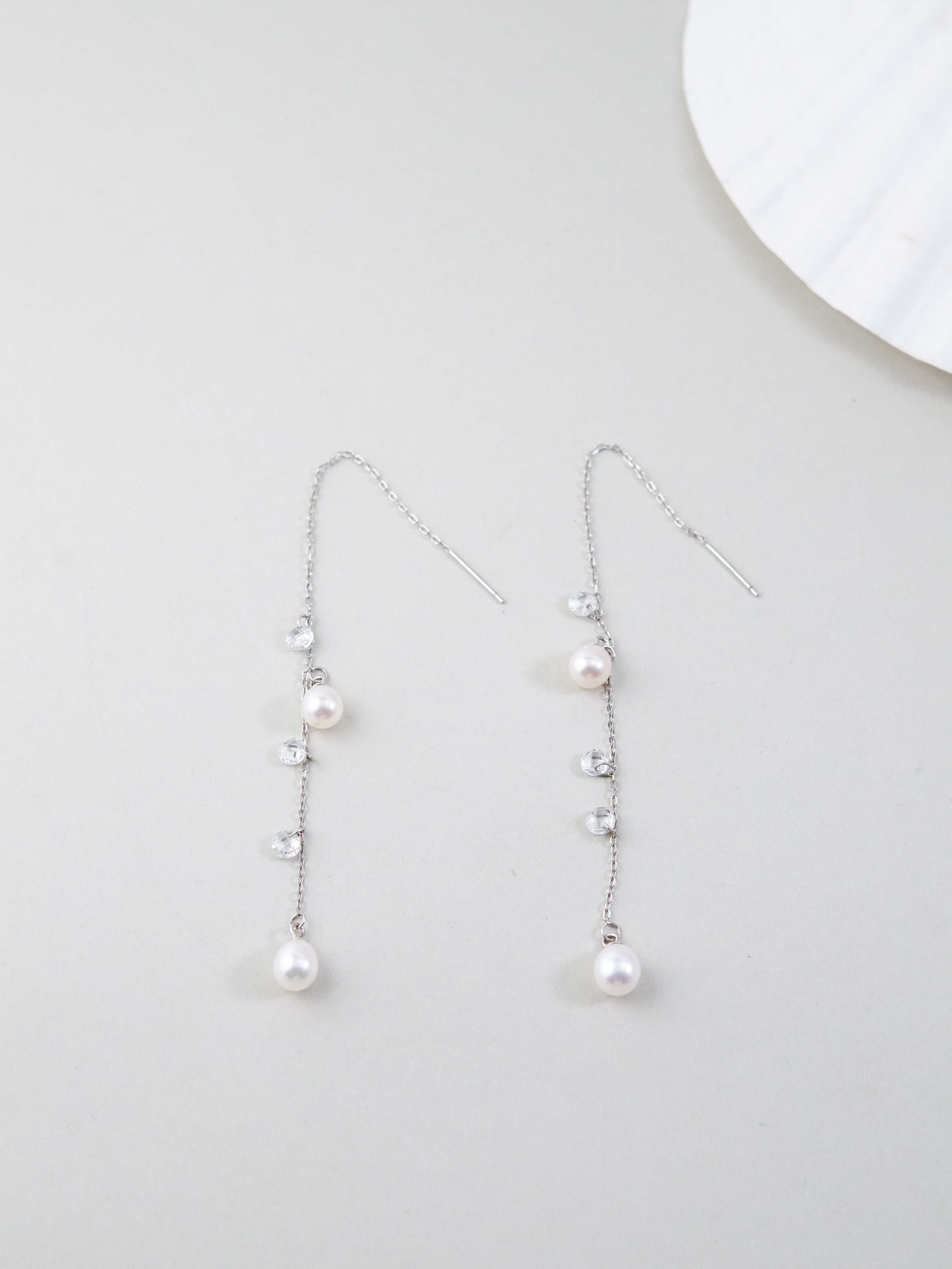 ミニマルな美しさを追求したピアスで、繊細なシルバーチェーンに淡水パールとカットガラスビーズをあしらい、朝露のような透明感を耳元に演出します。天然淡水パールの柔らかな艶とカットガラスのきらめきが、上品かつ華やかな印象をプラス。