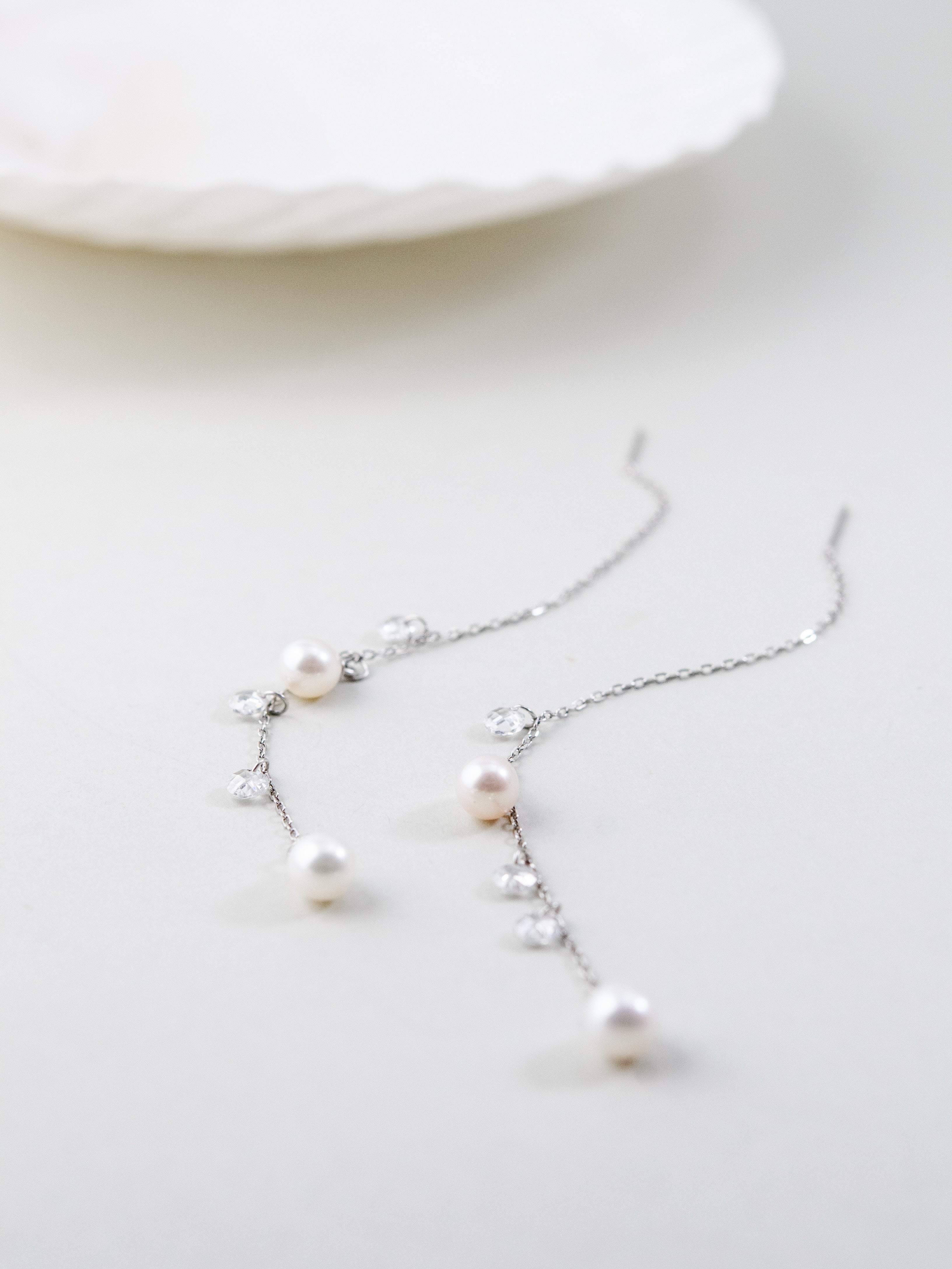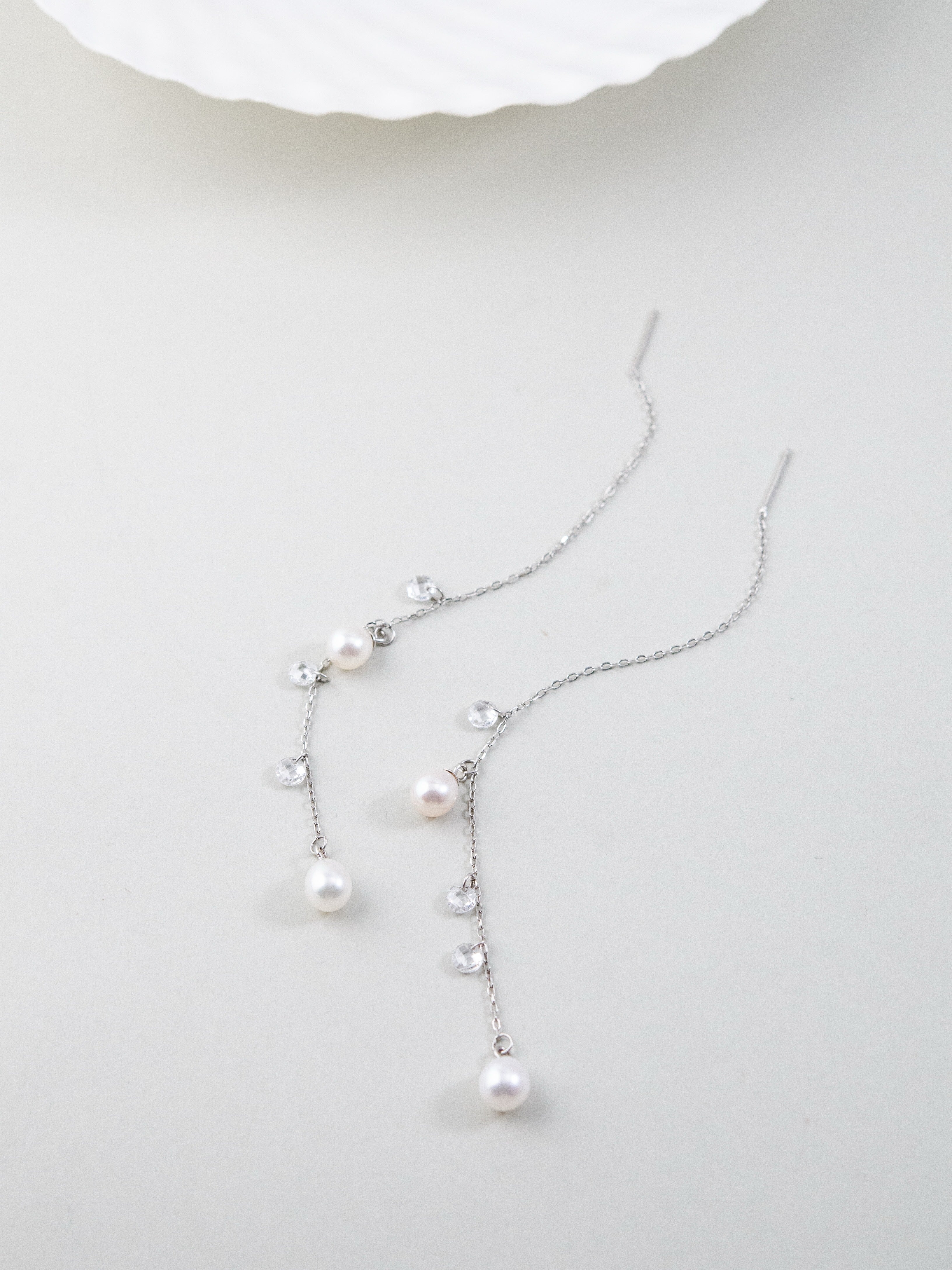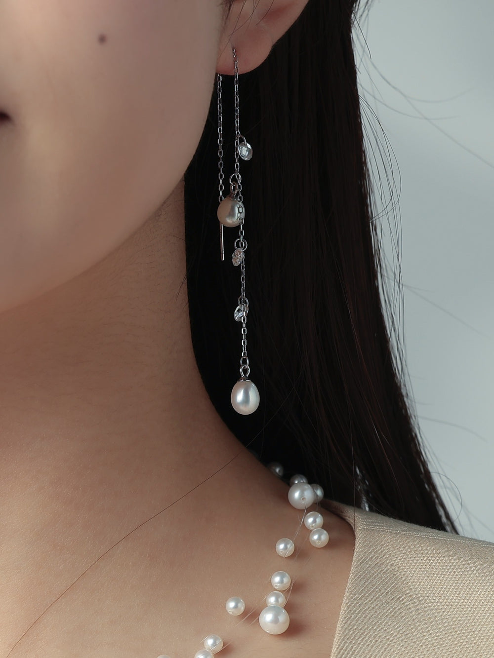 淡水パールとクリアビーズの組み合わせが、ナチュラルで繊細な印象を与え、オフィススタイルにも、カジュアルやデートコーデにもマッチします。スレッド式で長さを調整できるため、顔まわりをすっきり見せたい日や、柔らかな印象を演出したい日など、シーンに合わせた着け方が楽しめる万能デザインです。