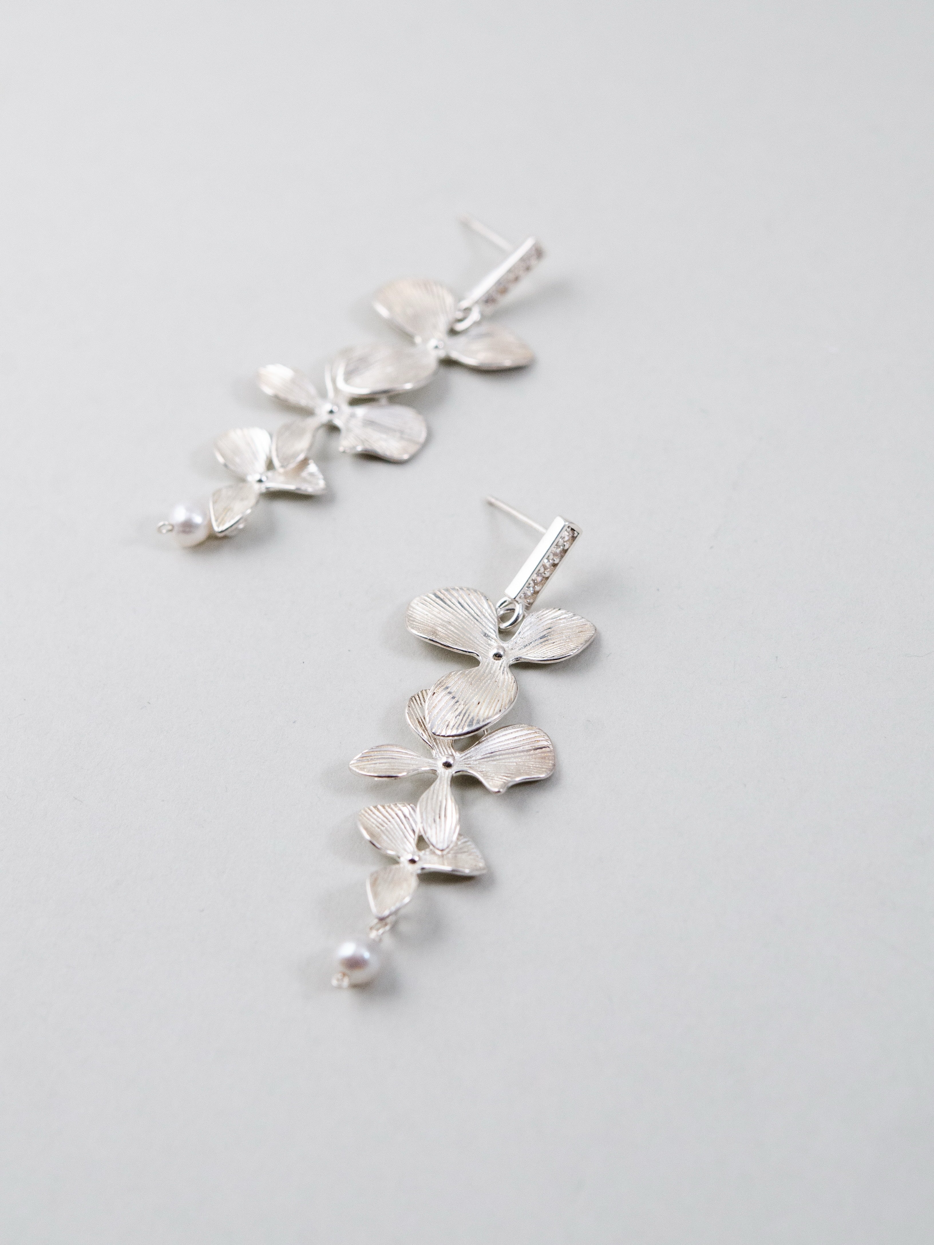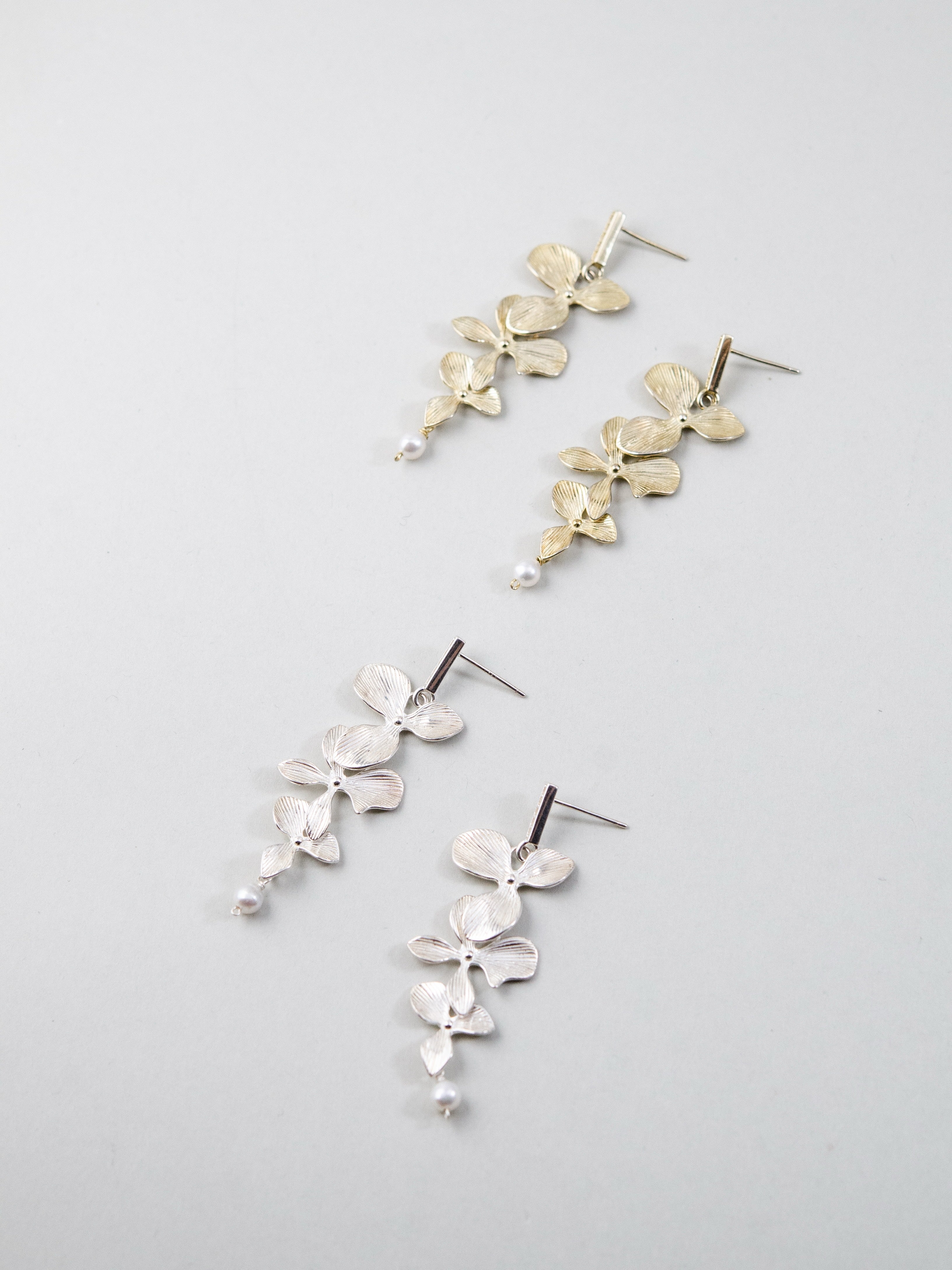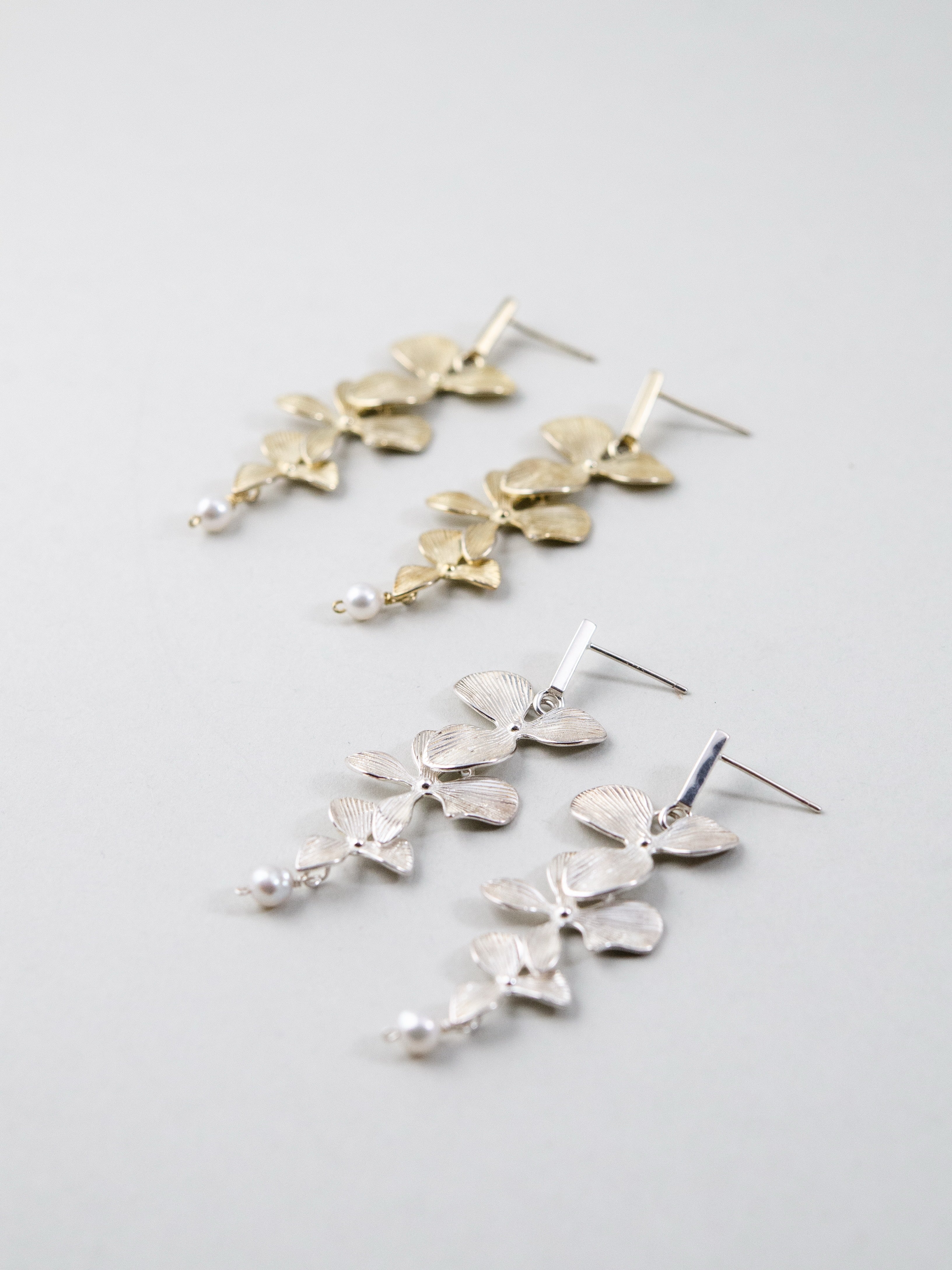 満開の紫陽花をモチーフに、三輪の花びらを立体的に重ねたデザインピアスです。細やかな彫り込みが施された花びらは光を柔らかく反射し、下部で揺れる淡水パール風ビーズが女性らしい華やかさをプラス。繊細さと上品さを兼ね備えた、季節を問わず楽しめる一品です。