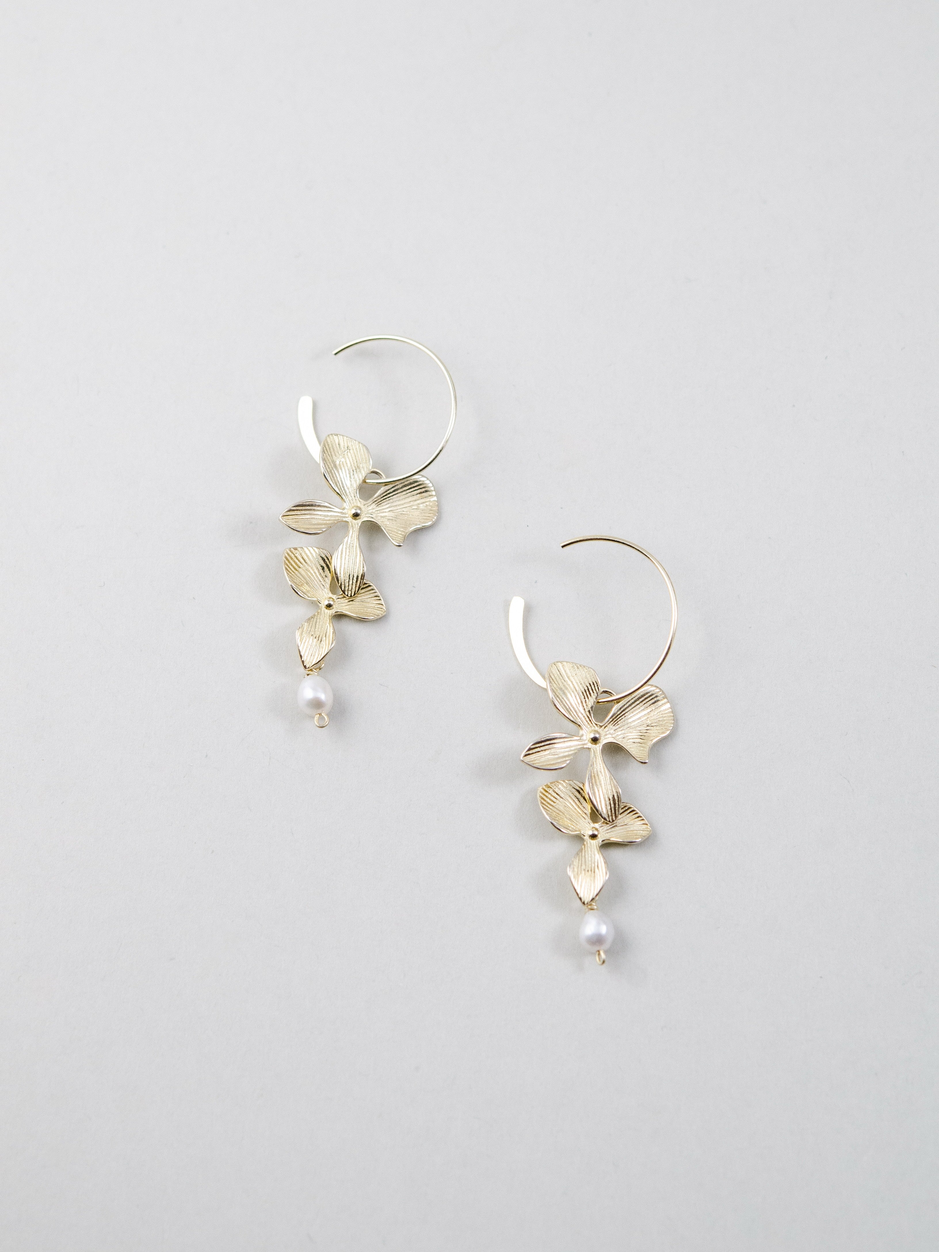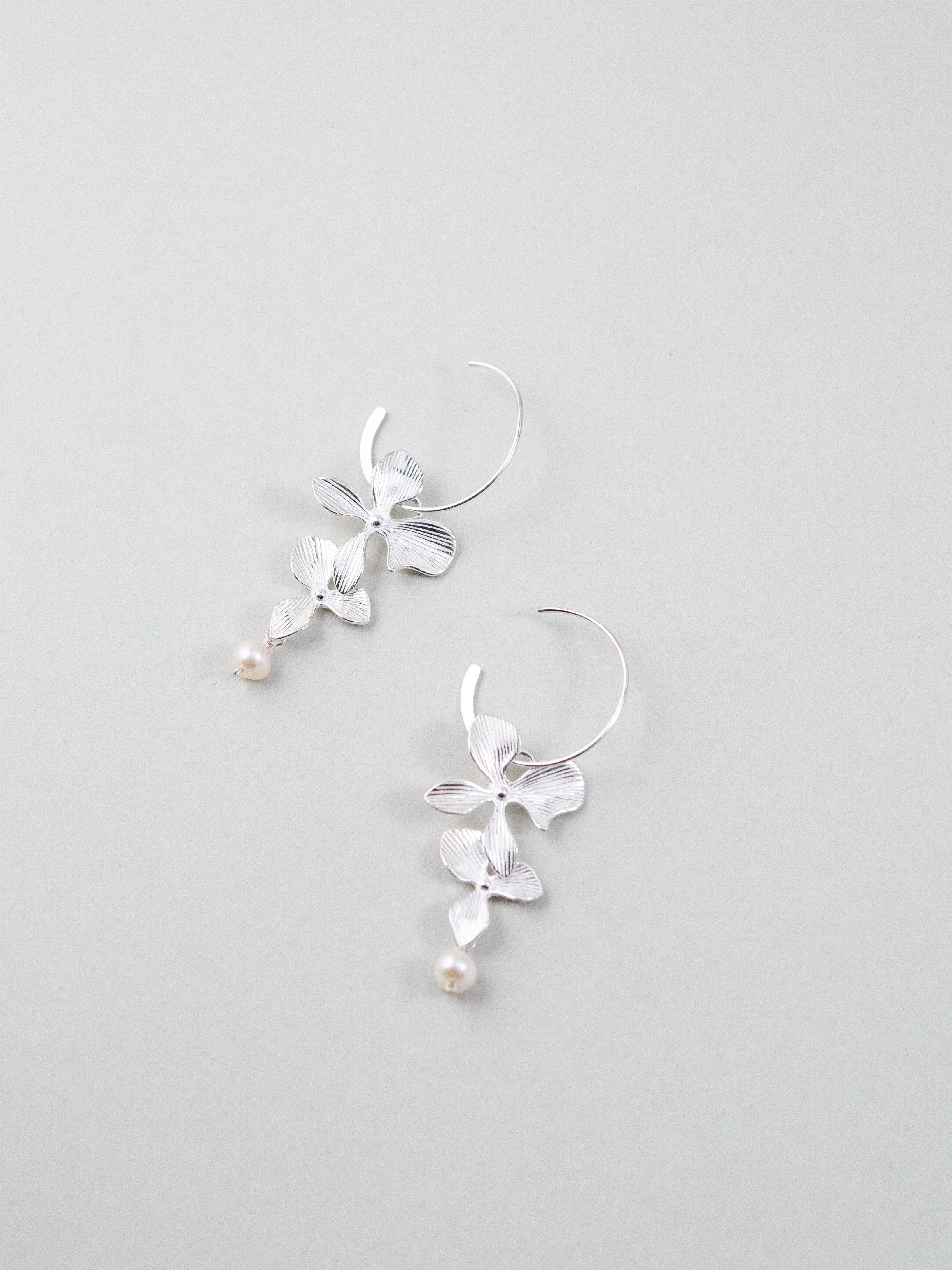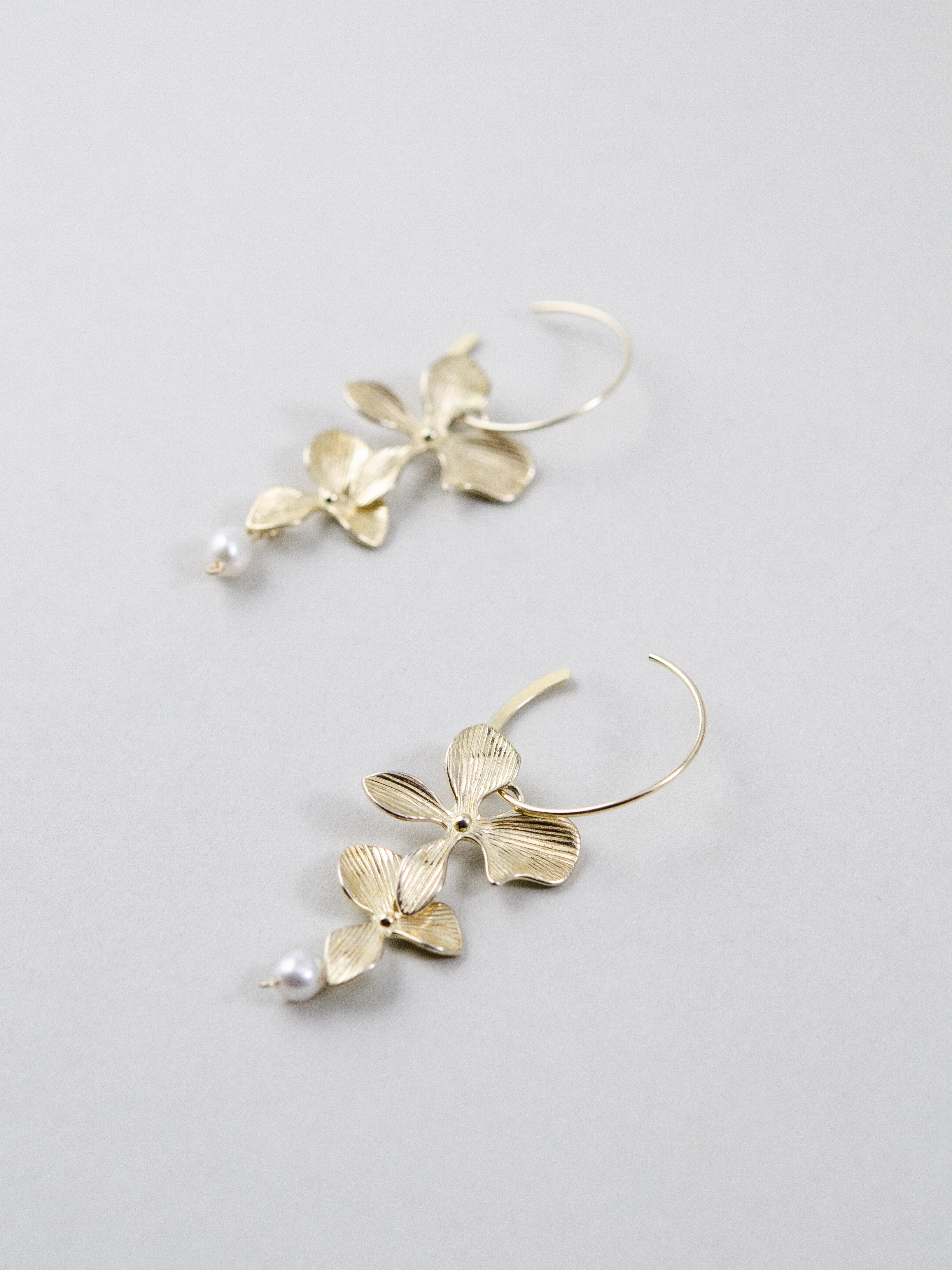 雨上がりに咲く紫陽花のやさしさと上品さを、2輪の花モチーフで繊細に表現したピアスです。ほどよいボリューム感が顔まわりを華やかに見せ、揺れる一粒の淡水パールが女性らしい柔らかさと気品を添えます。2輪の立体的な花びらが光を受けて優しくきらめき、上品ながらも印象的なデザインに仕上がっています。