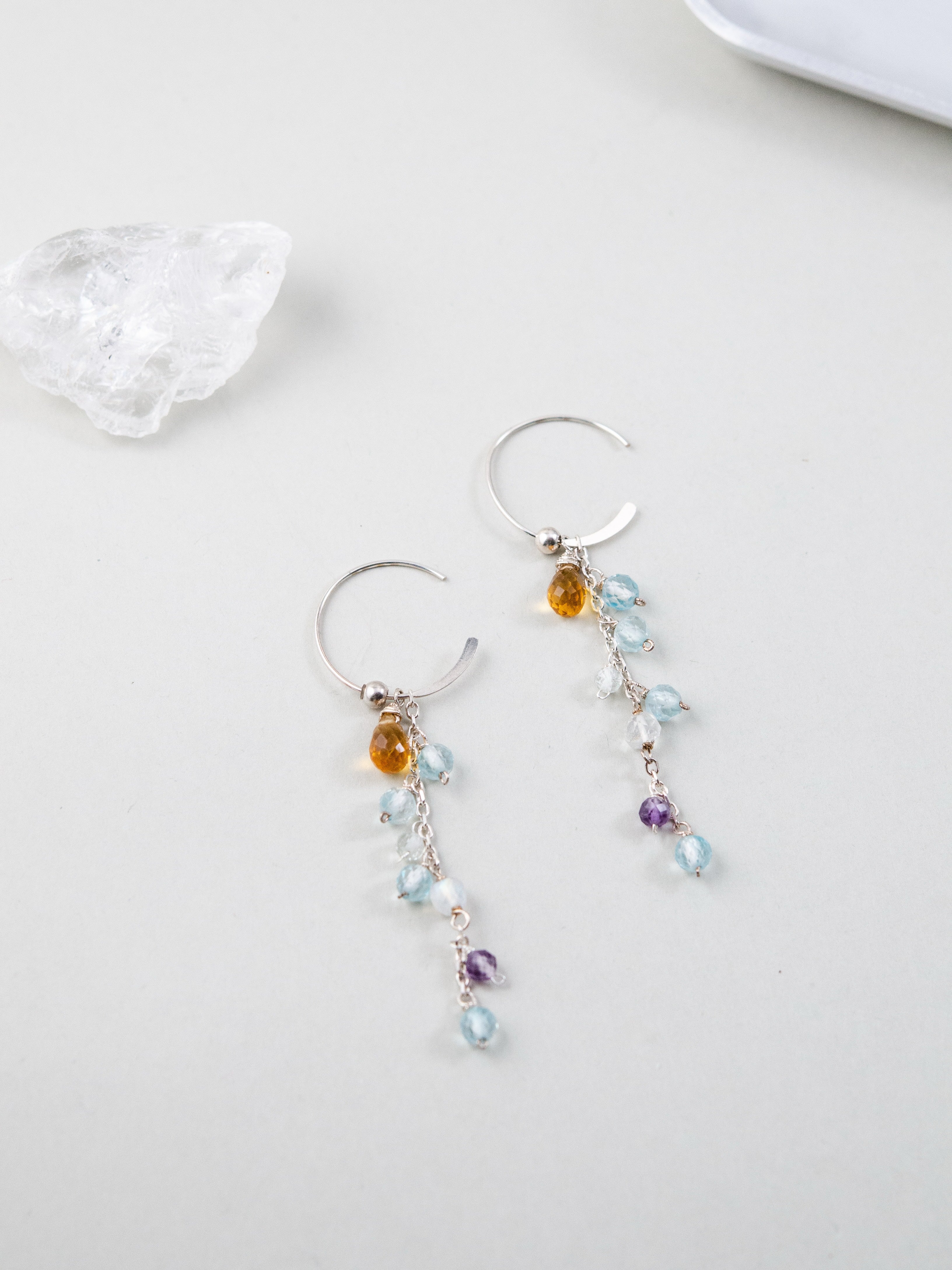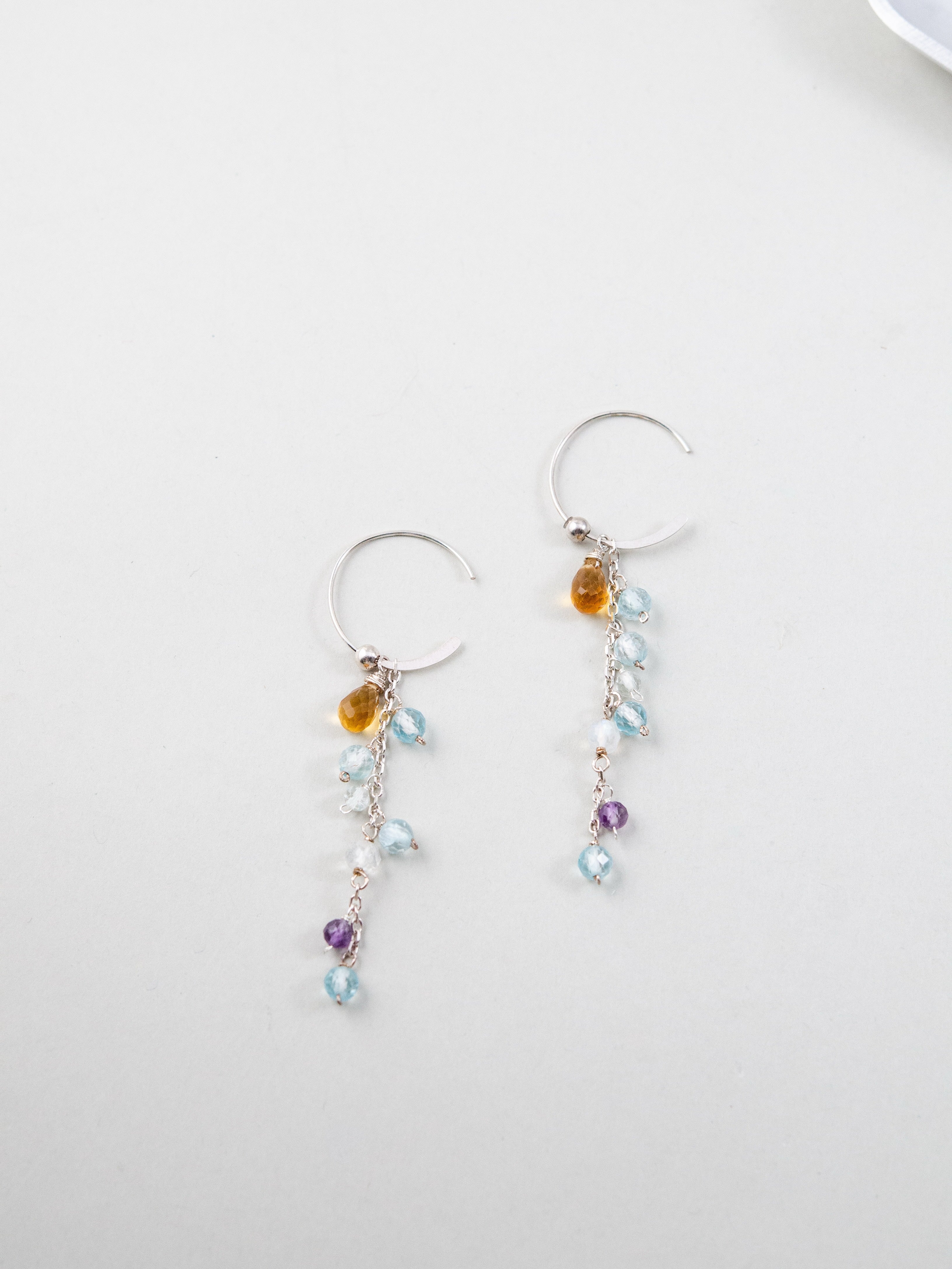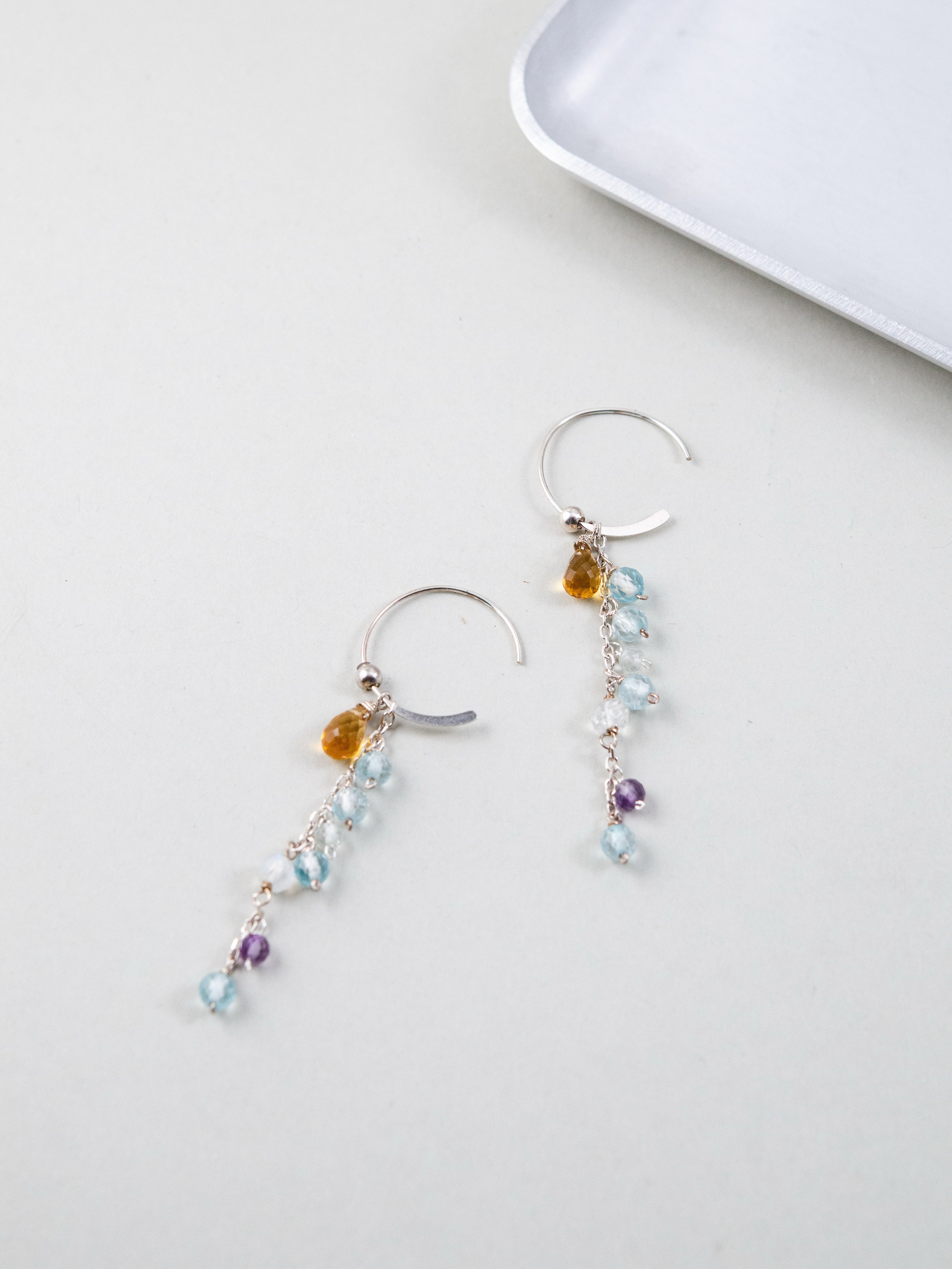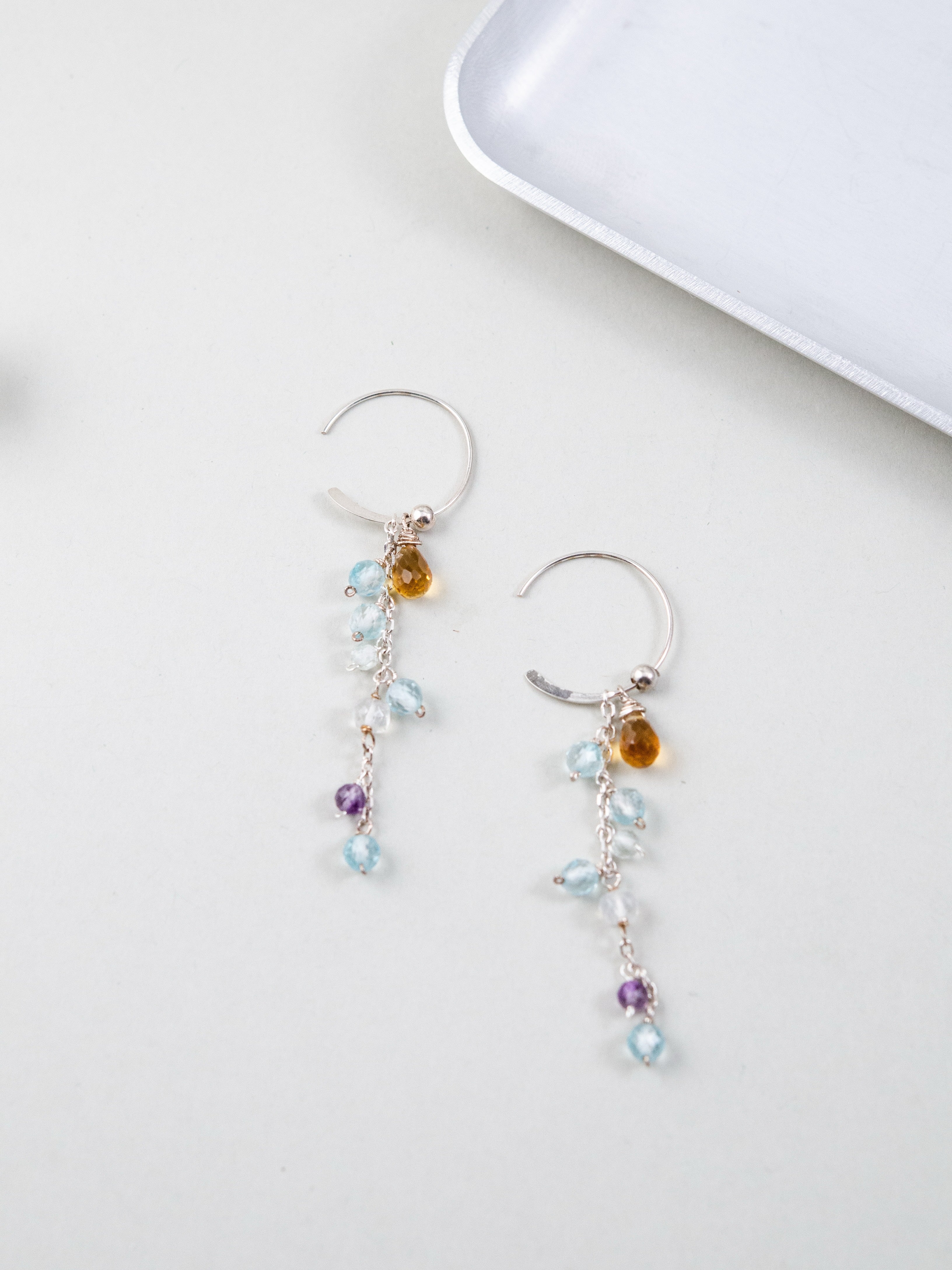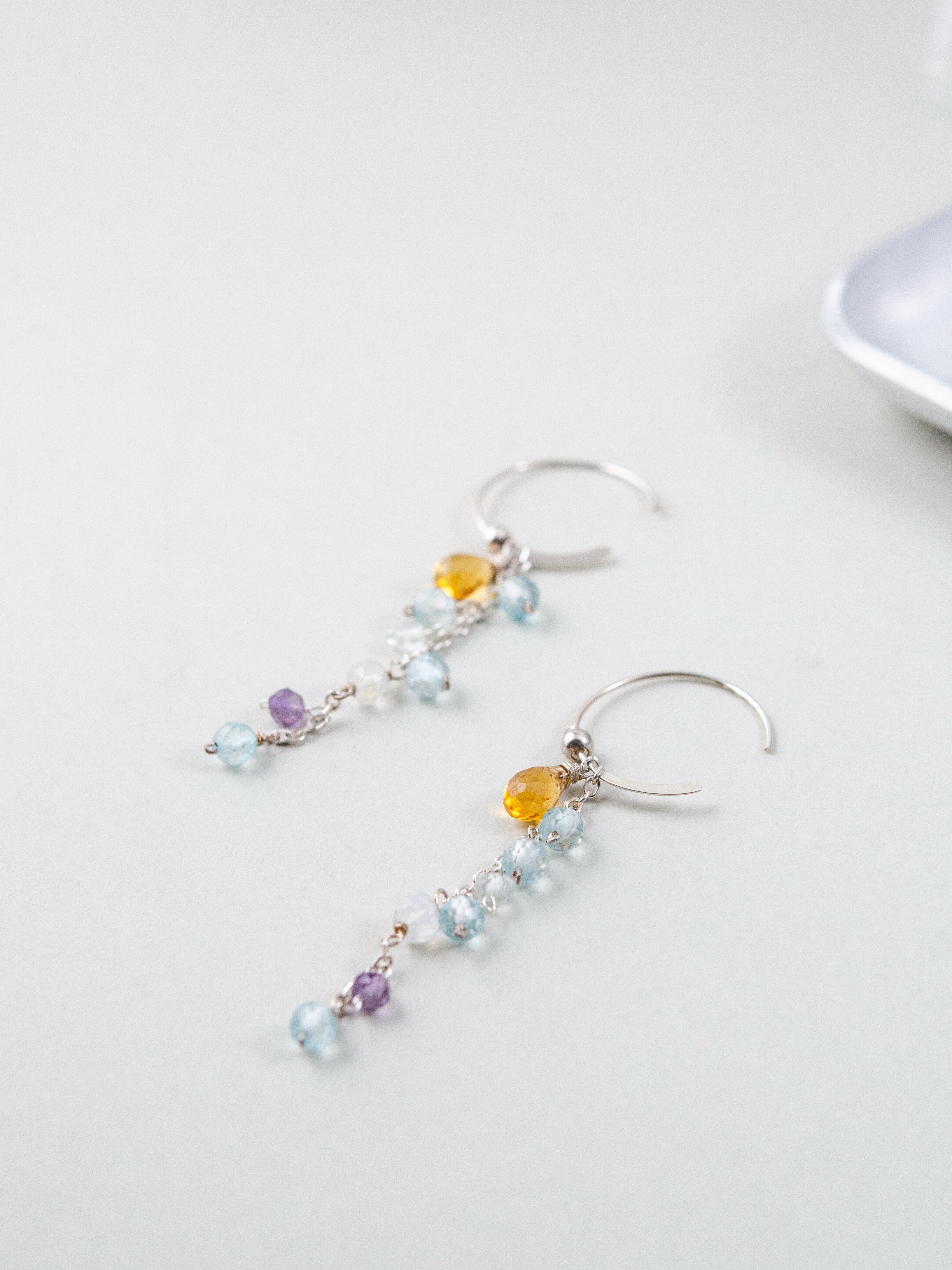 「朝の海辺」をテーマに、アクアマリン・シトリン・アメジストを組み合わせたピアス。澄んだブルーのアクアマリンが心の平穏を、温かみのあるシトリンが自信とポジティブなエネルギーを、アメジストが内なる守護を象徴。深いブルーから柔らかなゴールドへの色のグラデーションが、夏の朝の海辺の光と風を思わせる幻想的な印象を演出します。