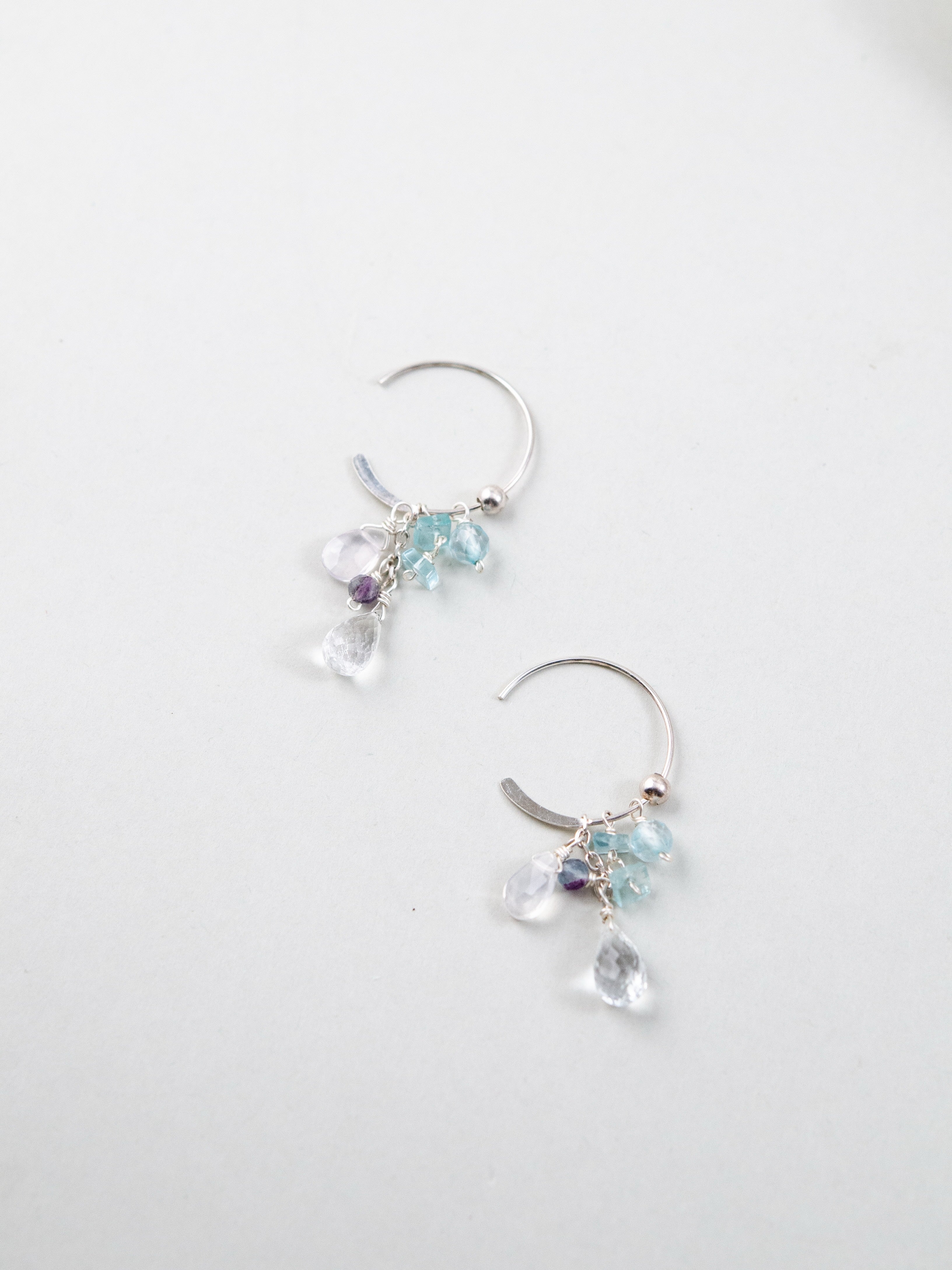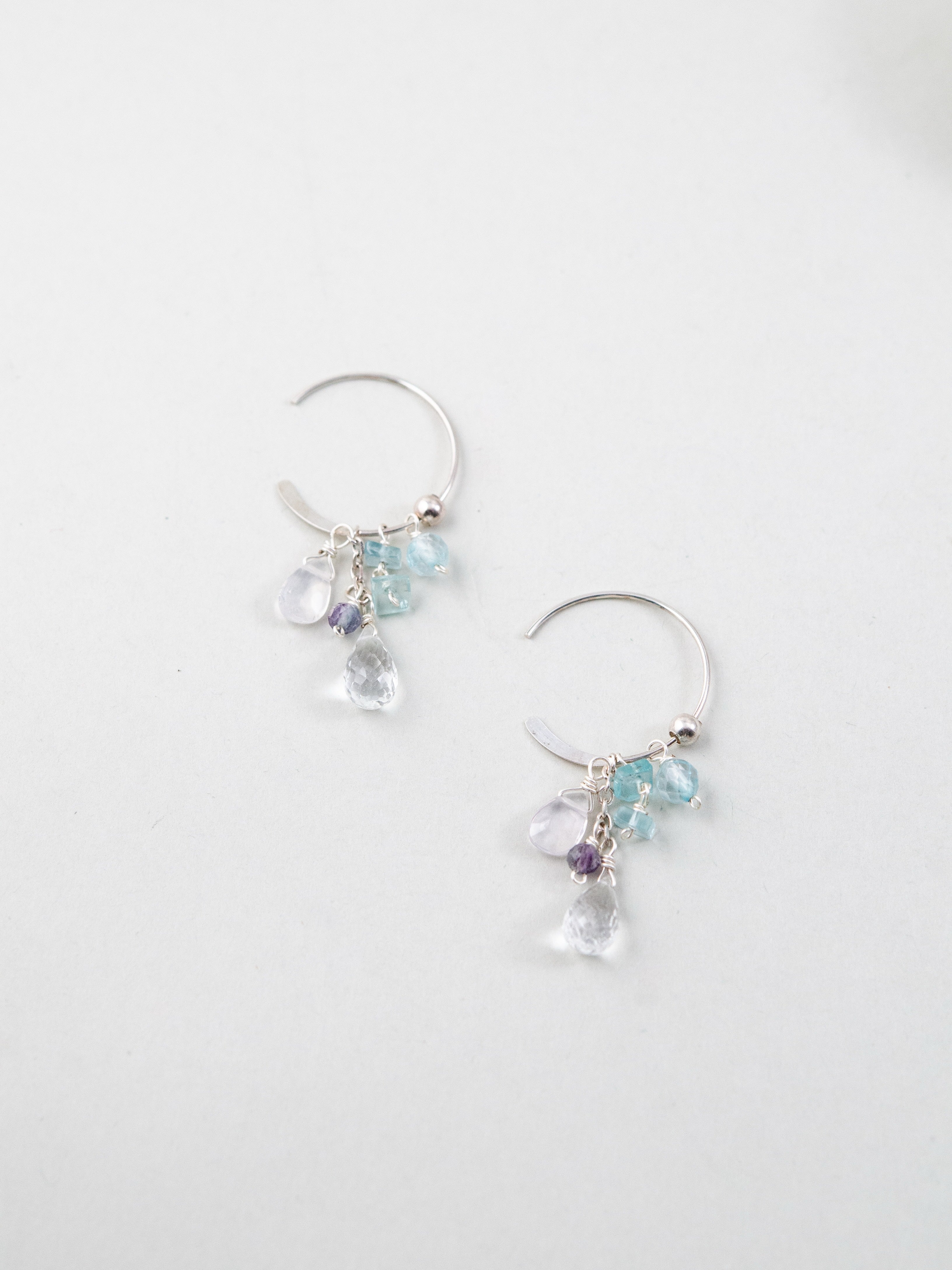 「水のささやき」をテーマに、アクアマリン・ローズクォーツ・ロッククリスタルの3種のクリスタルを組み合わせたピアス。滴型カットの天然石が揺れるたびに透明感あふれる輝きを放ち、耳元に静けさと優しさを添えます。