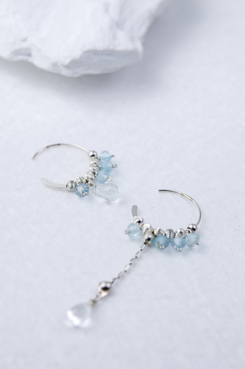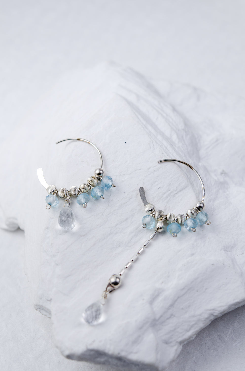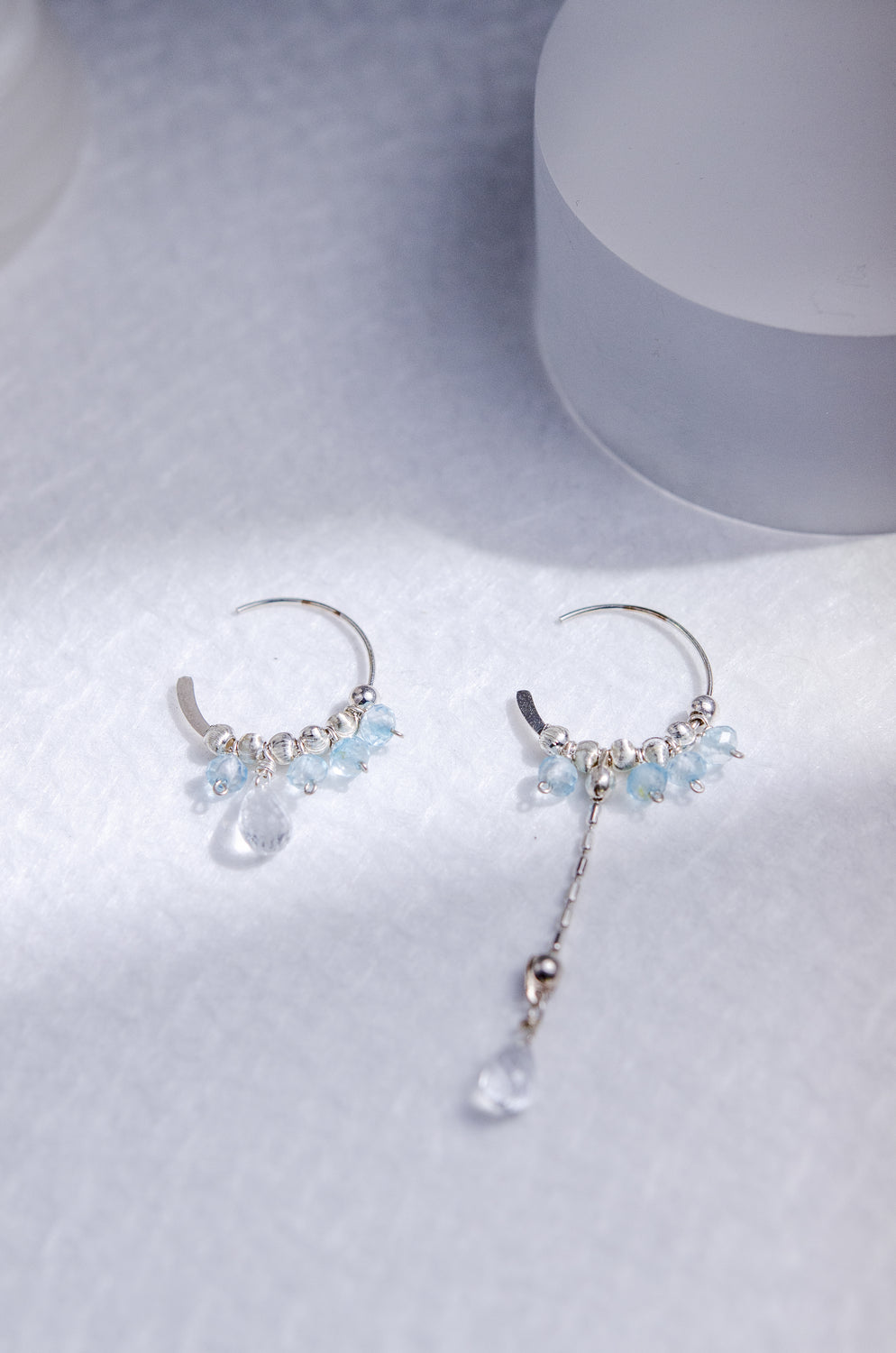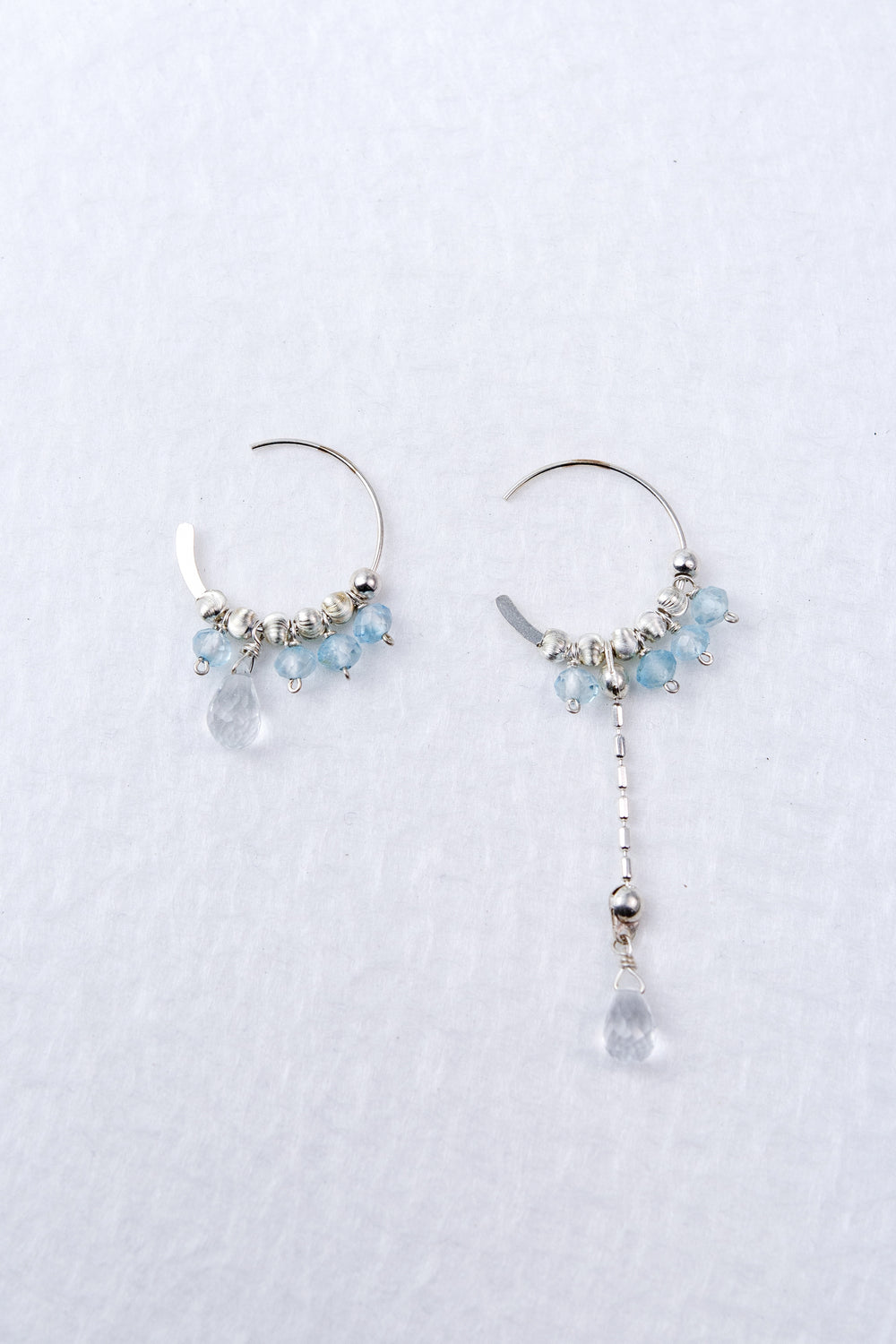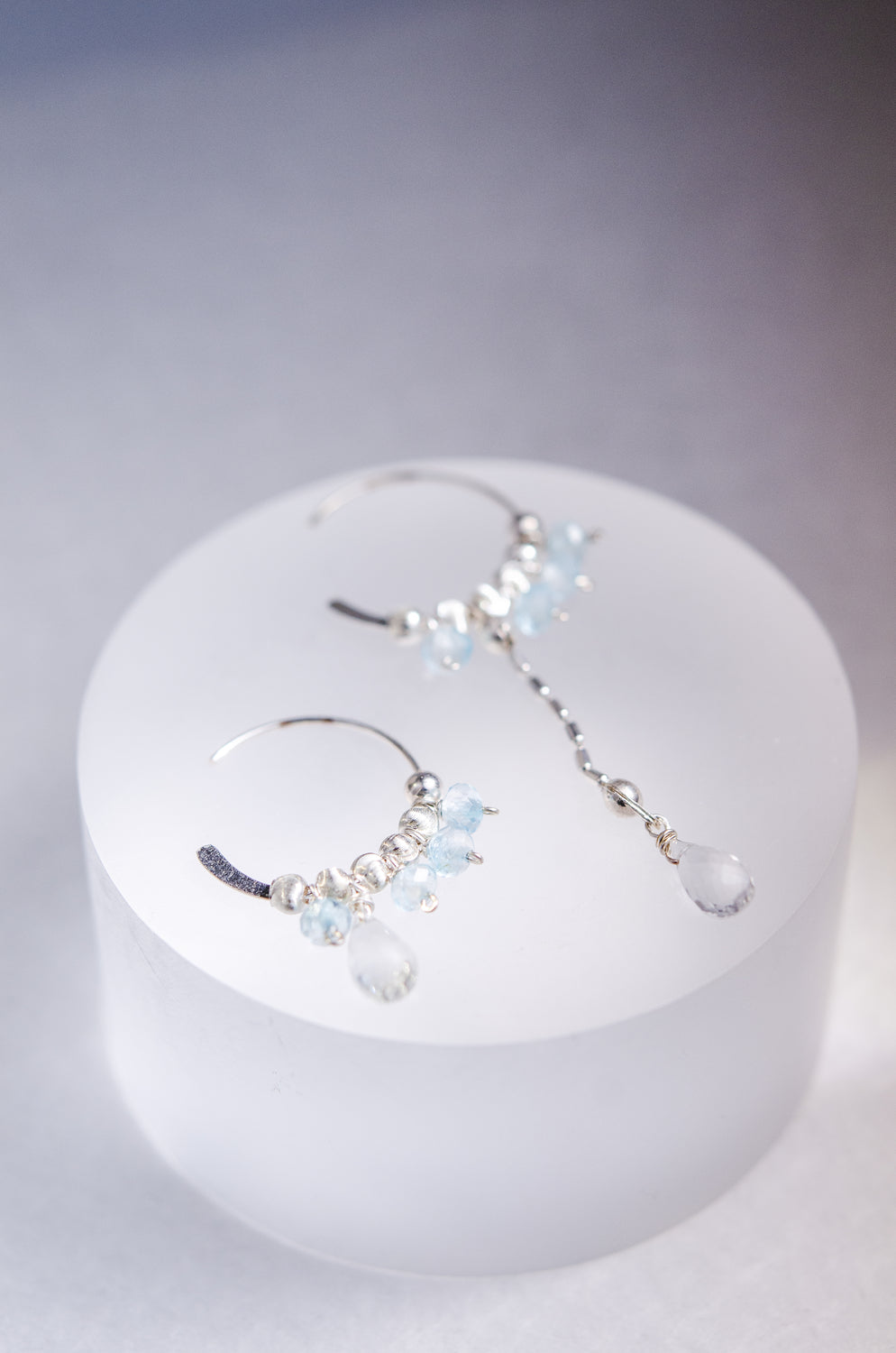 非対称デザインで片側の揺れが個性をプラス。アクアマリンの「幸せな結婚」や「癒し」の象徴としての魅力と、ホワイトクォーツの上品な輝きが耳元に清楚でフェミニンな雰囲気をもたらします。