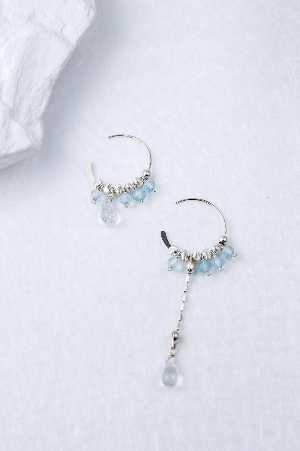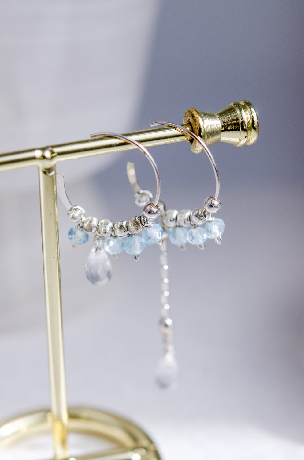 透明感のあるアクアマリンとホワイトクォーツを組み合わせたイヤリング。澄み渡る海を思わせる優しいブルーが耳元に涼やかさを添え、爽やかで洗練された印象を演出します。