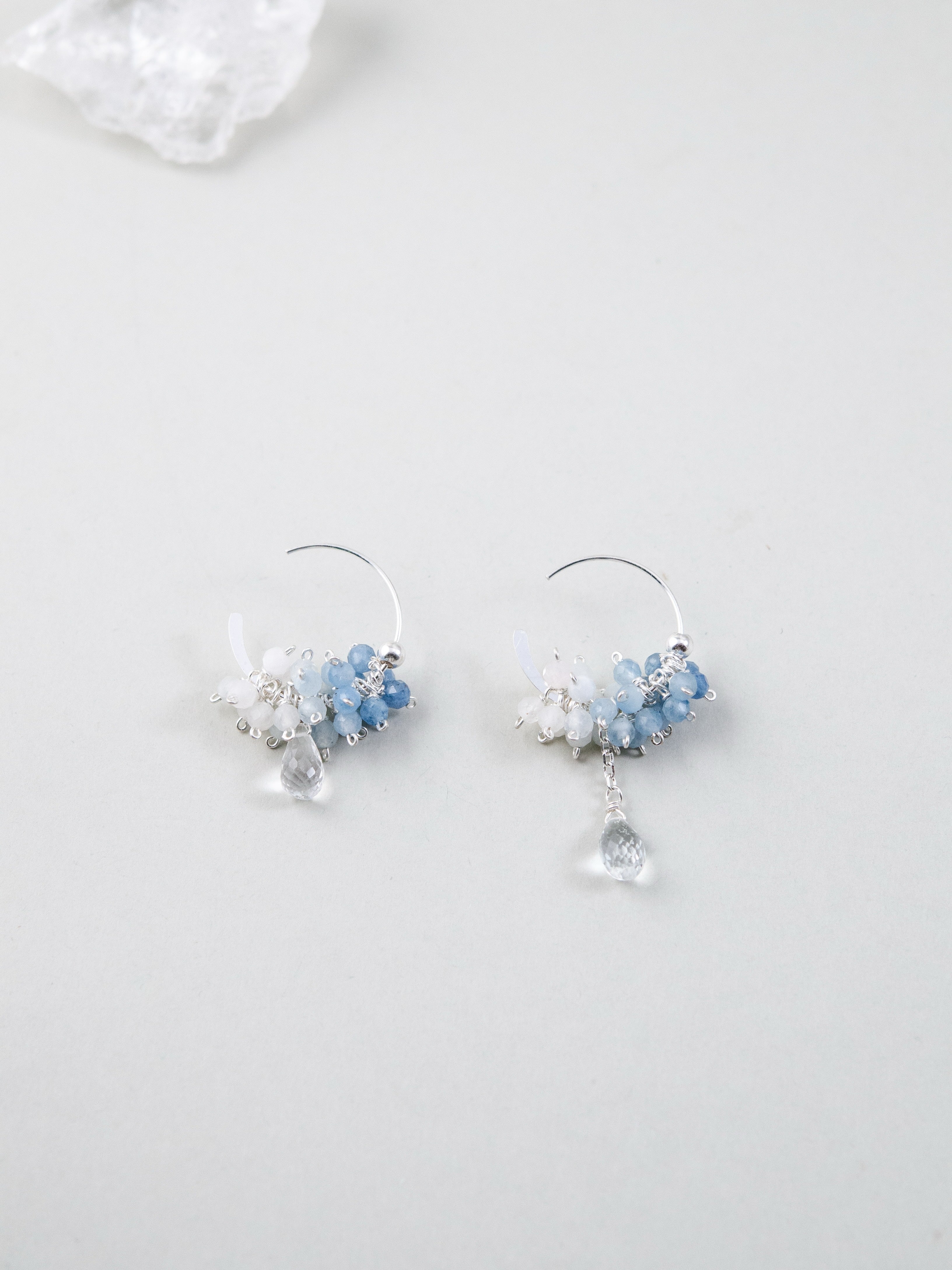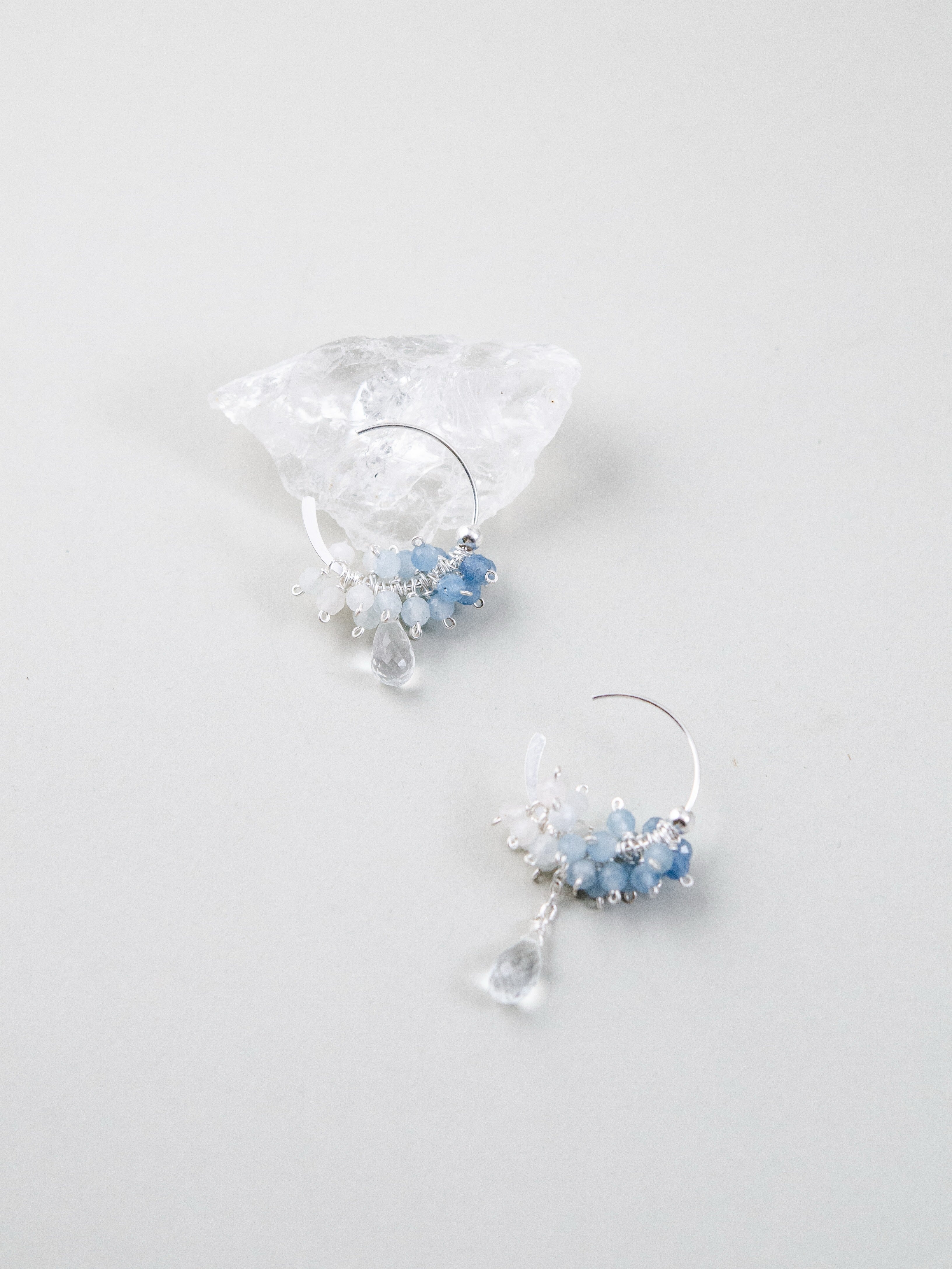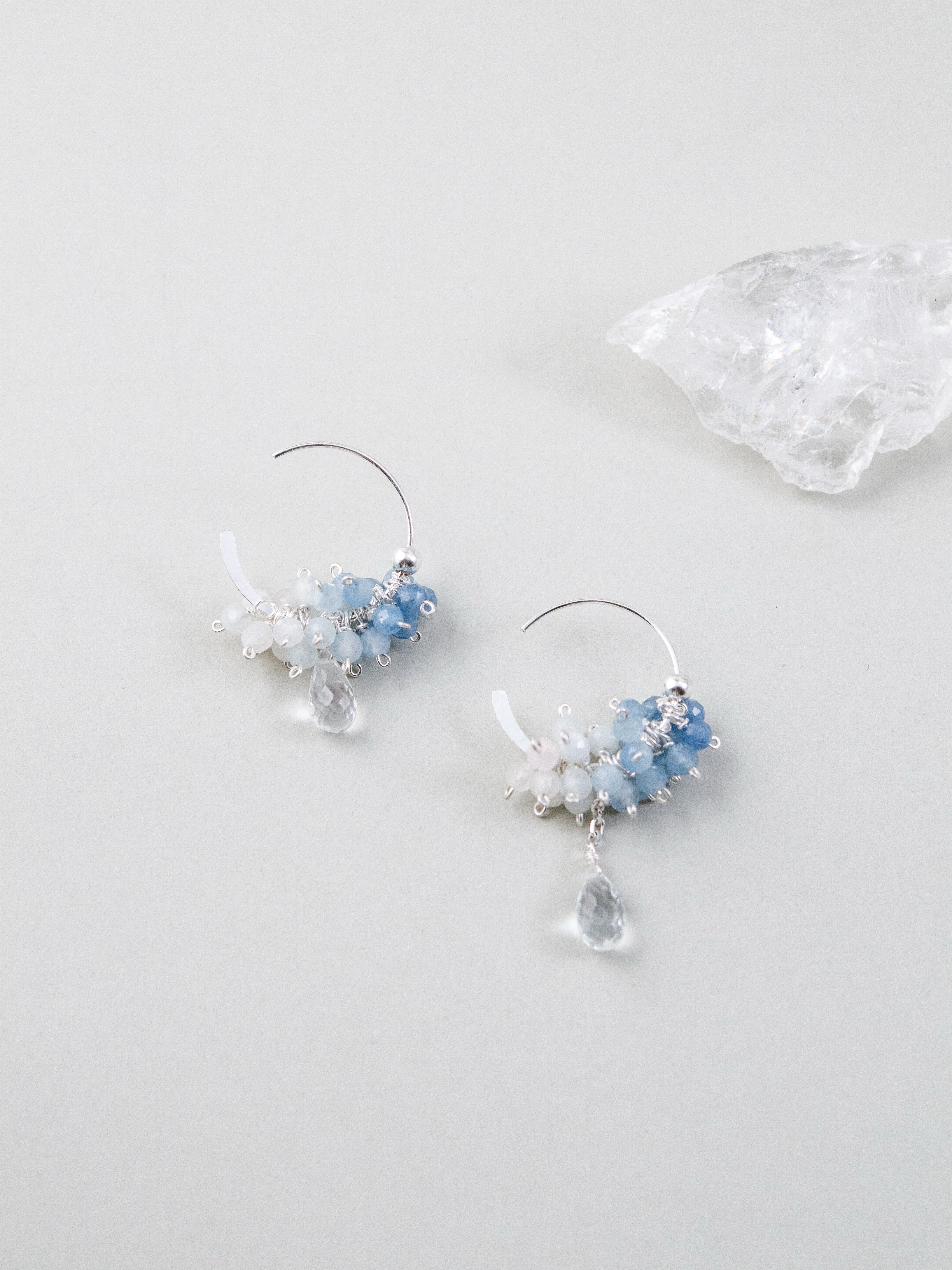「氷の静けさ」をテーマに、アクアマリンとロッククリスタルを組み合わせたロングピアス。雪解け水が一滴ずつ滴るように、耳元で透明感あふれる輝きを放ちます。凛としたブルーとクリアな煌めきが、知的で穏やかな印象を与えるデザインです。
