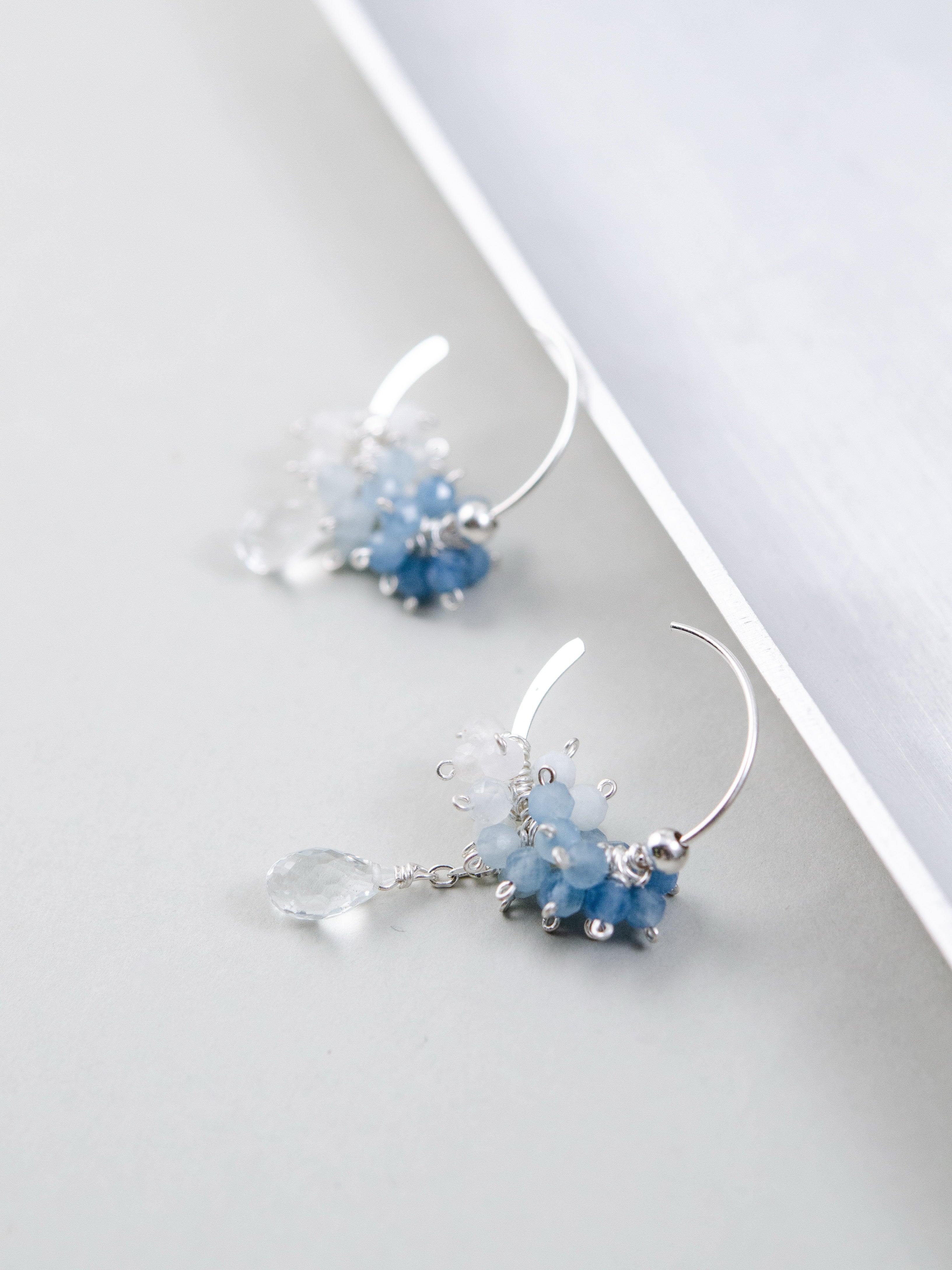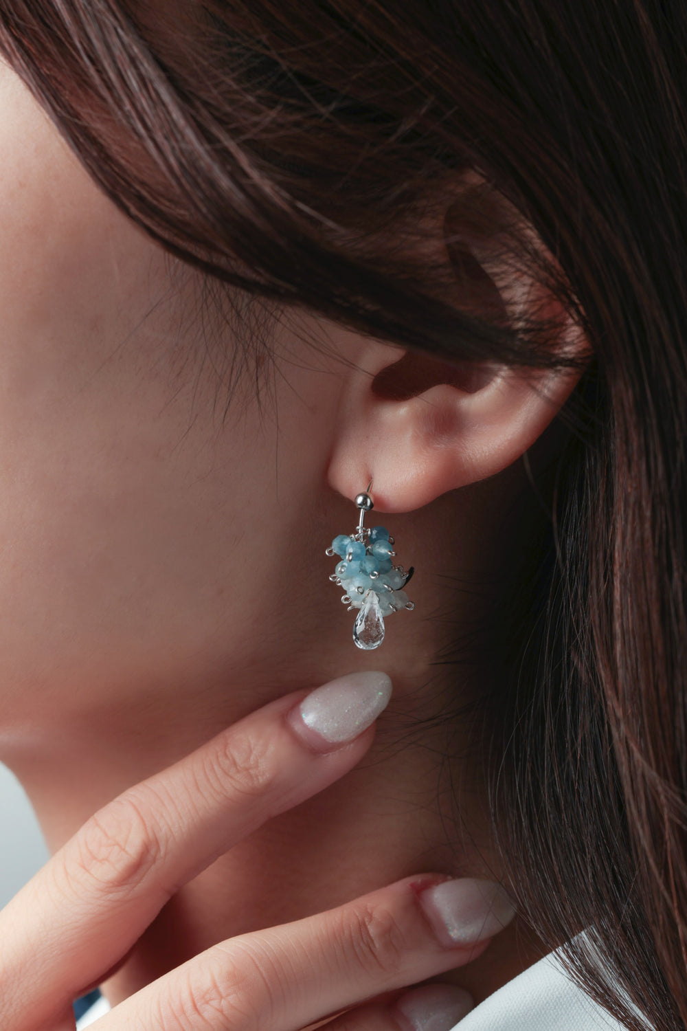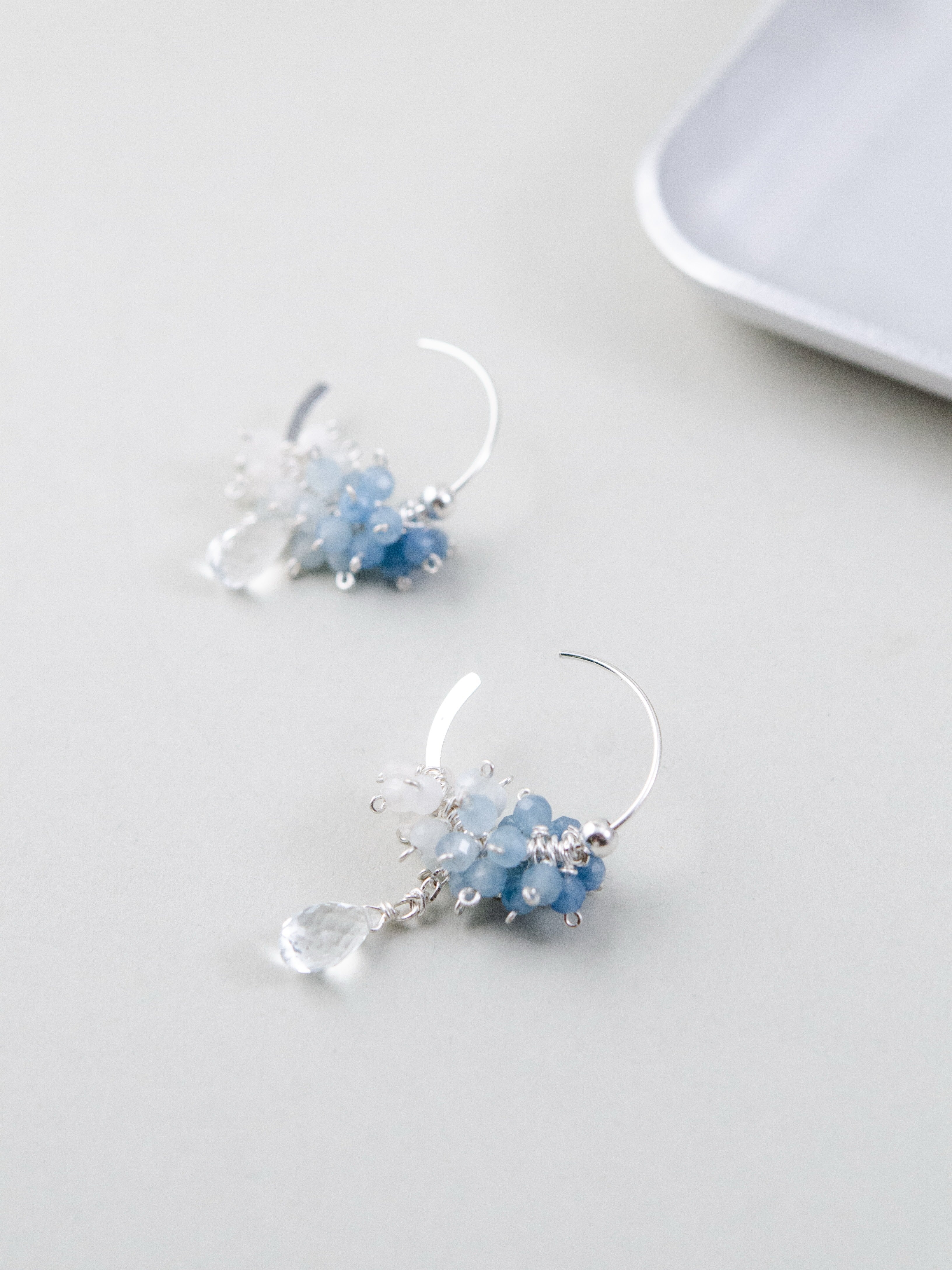 「氷の静けさ」をテーマに、アクアマリンとロッククリスタルを組み合わせたロングピアス。雪解け水が一滴ずつ滴るように、耳元で透明感あふれる輝きを放ちます。凛としたブルーとクリアな煌めきが、知的で穏やかな印象を与えるデザインです。