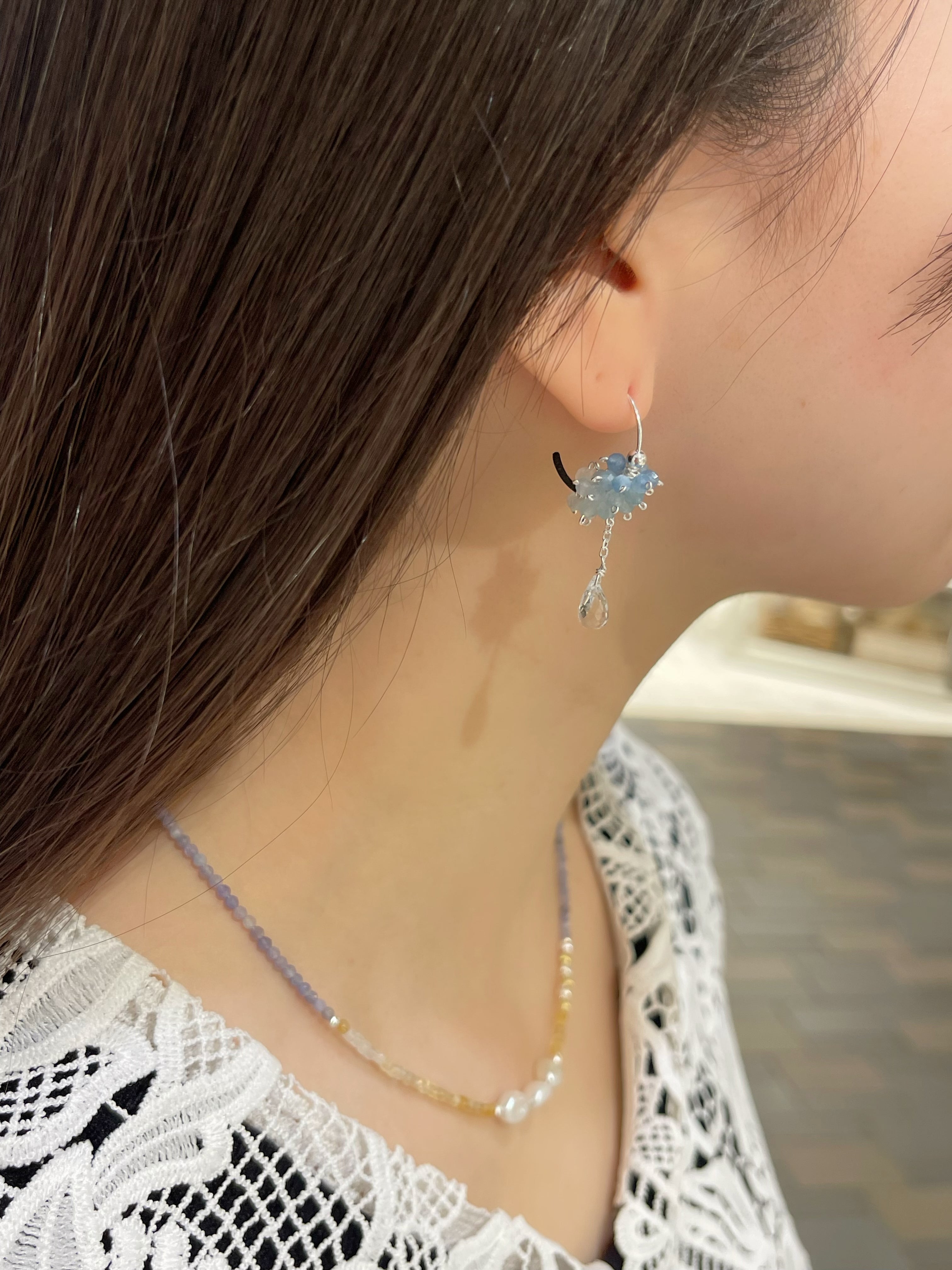 雫のように揺れるクリスタルが静かな美しさを添え、花びらを思わせる天然石の配置が可憐で清楚な雰囲気を演出。シルバー925金具使用で軽やかに着けられ、日常から特別なシーンまで自然に馴染むピアスです。