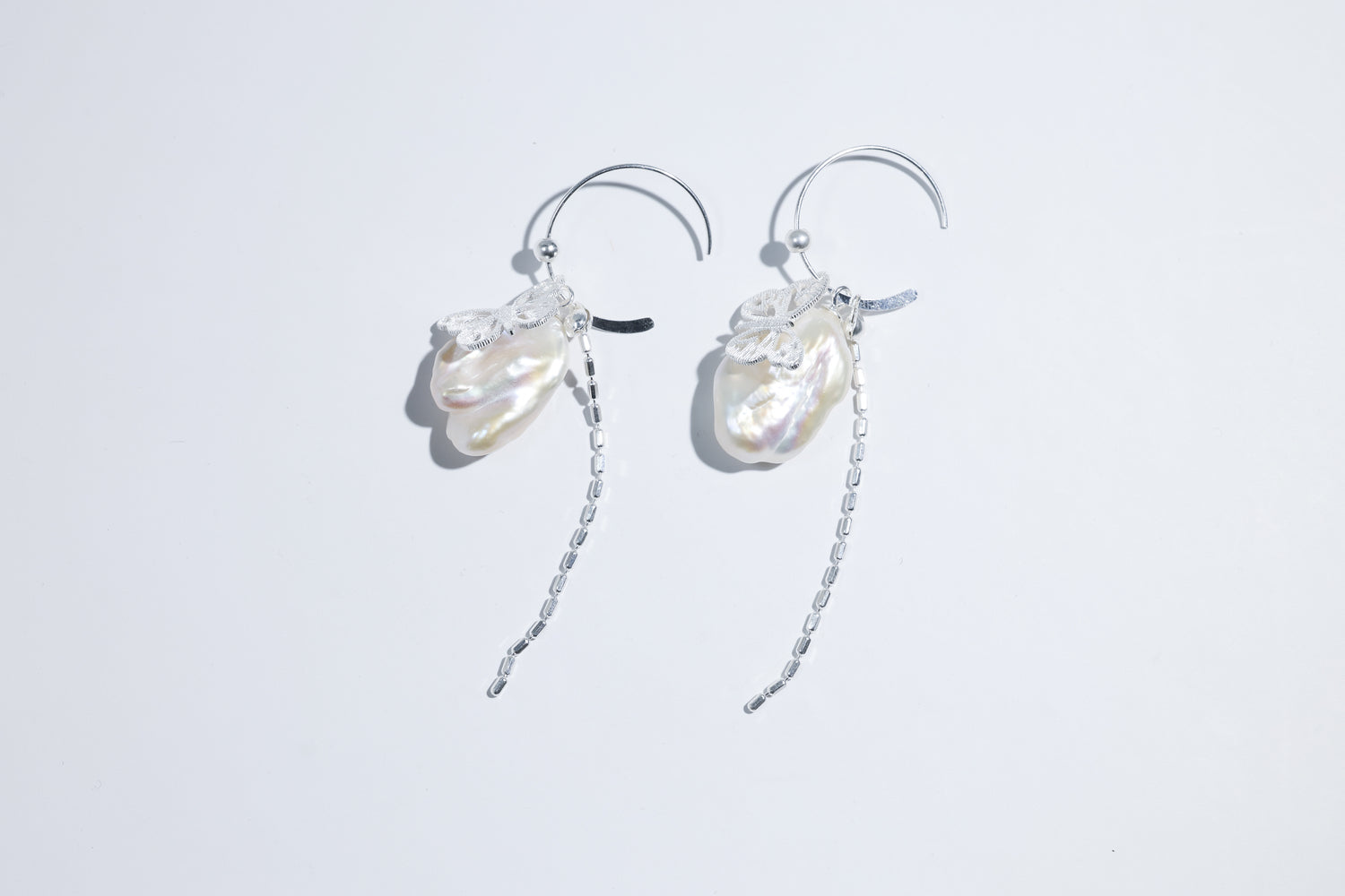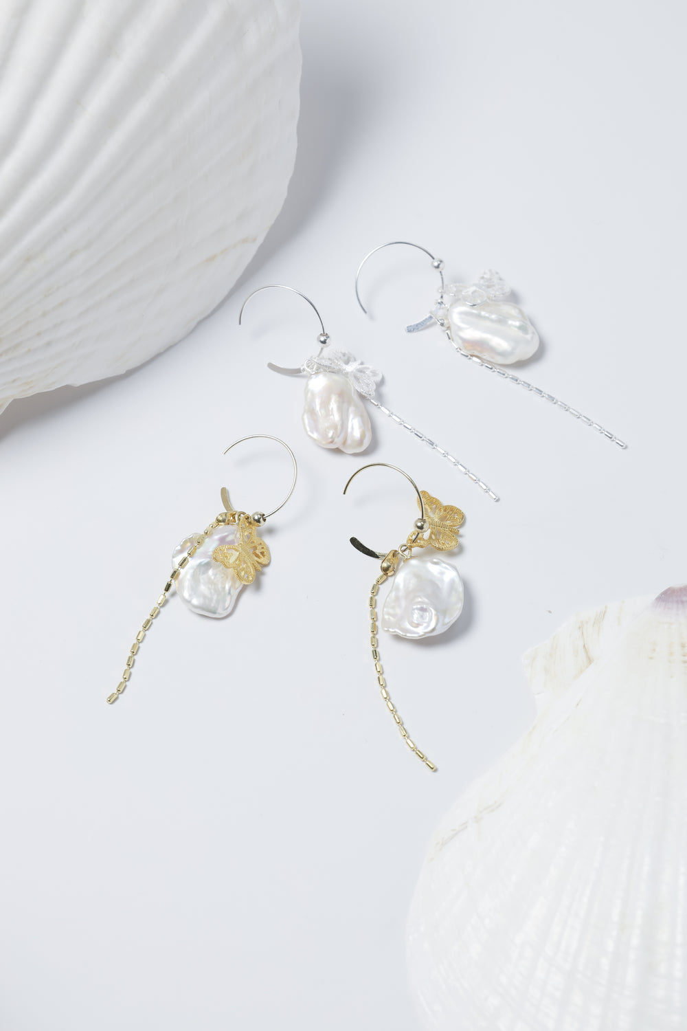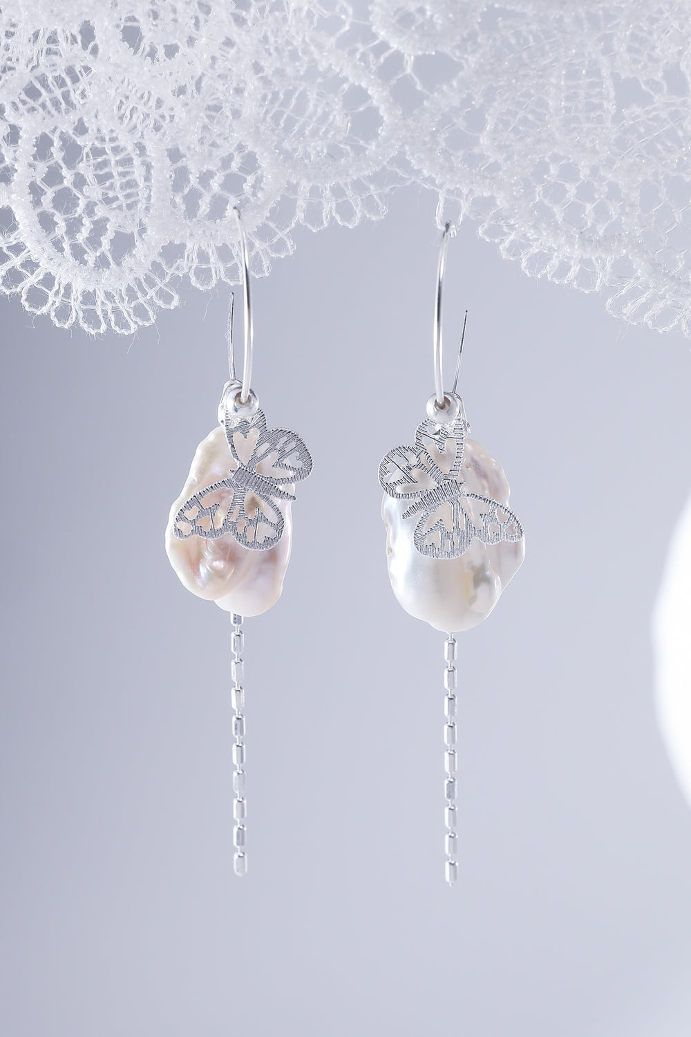 ひとつひとつ異なる天然バロックパールの個性が魅力。シルバーカラーの蝶モチーフとチェーンが涼しげで華やかさをプラスし、顔まわりをすっきり演出。
