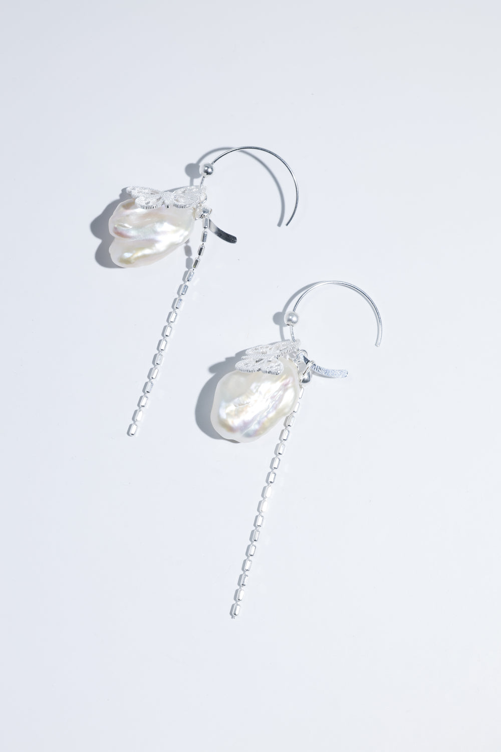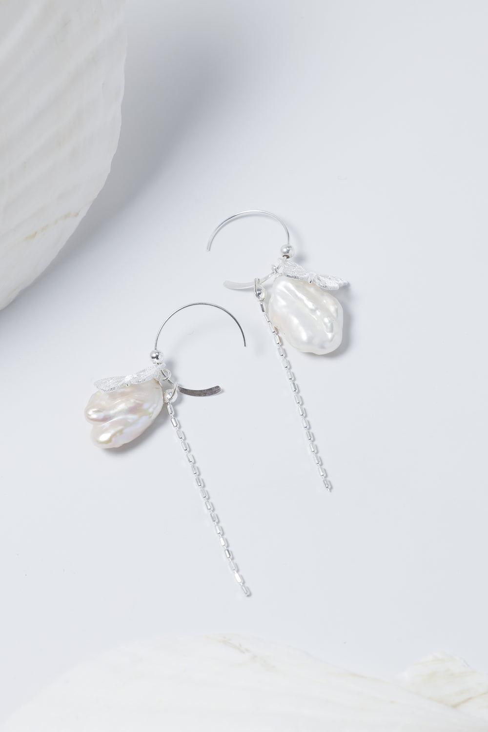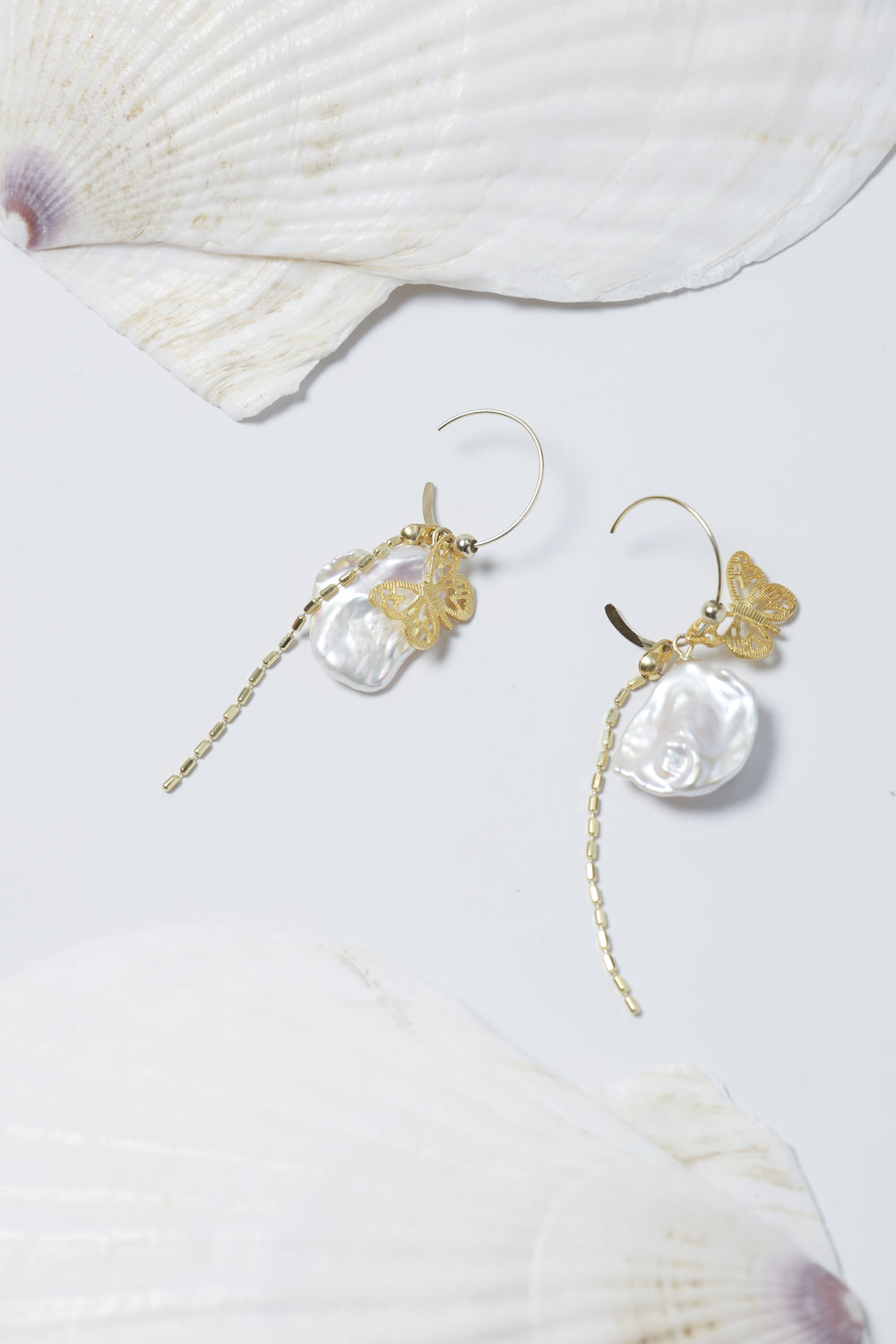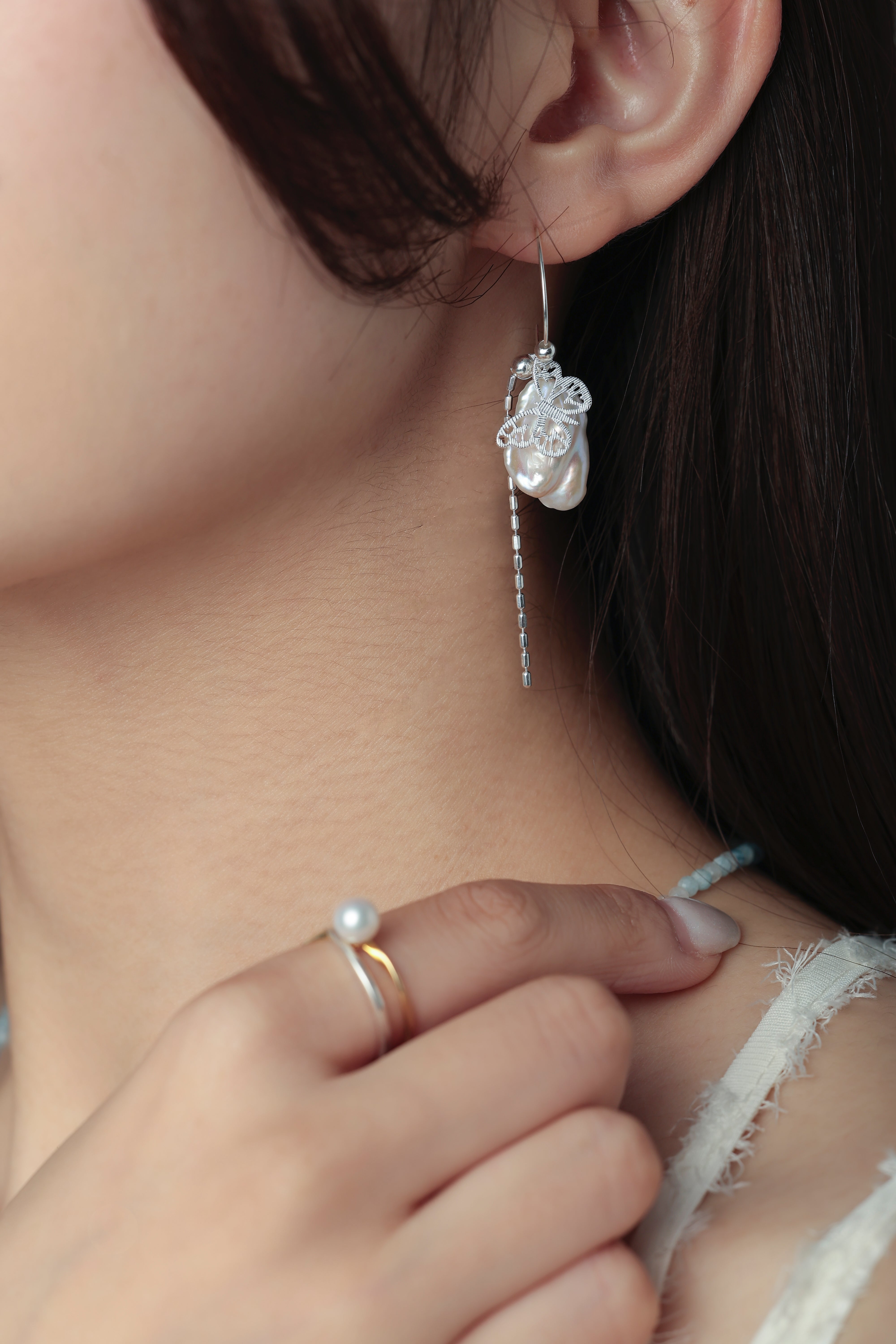 ひとつひとつ異なる天然バロックパールの個性が魅力。シルバーカラーの蝶モチーフとチェーンが涼しげで華やかさをプラスし、顔まわりをすっきり演出。