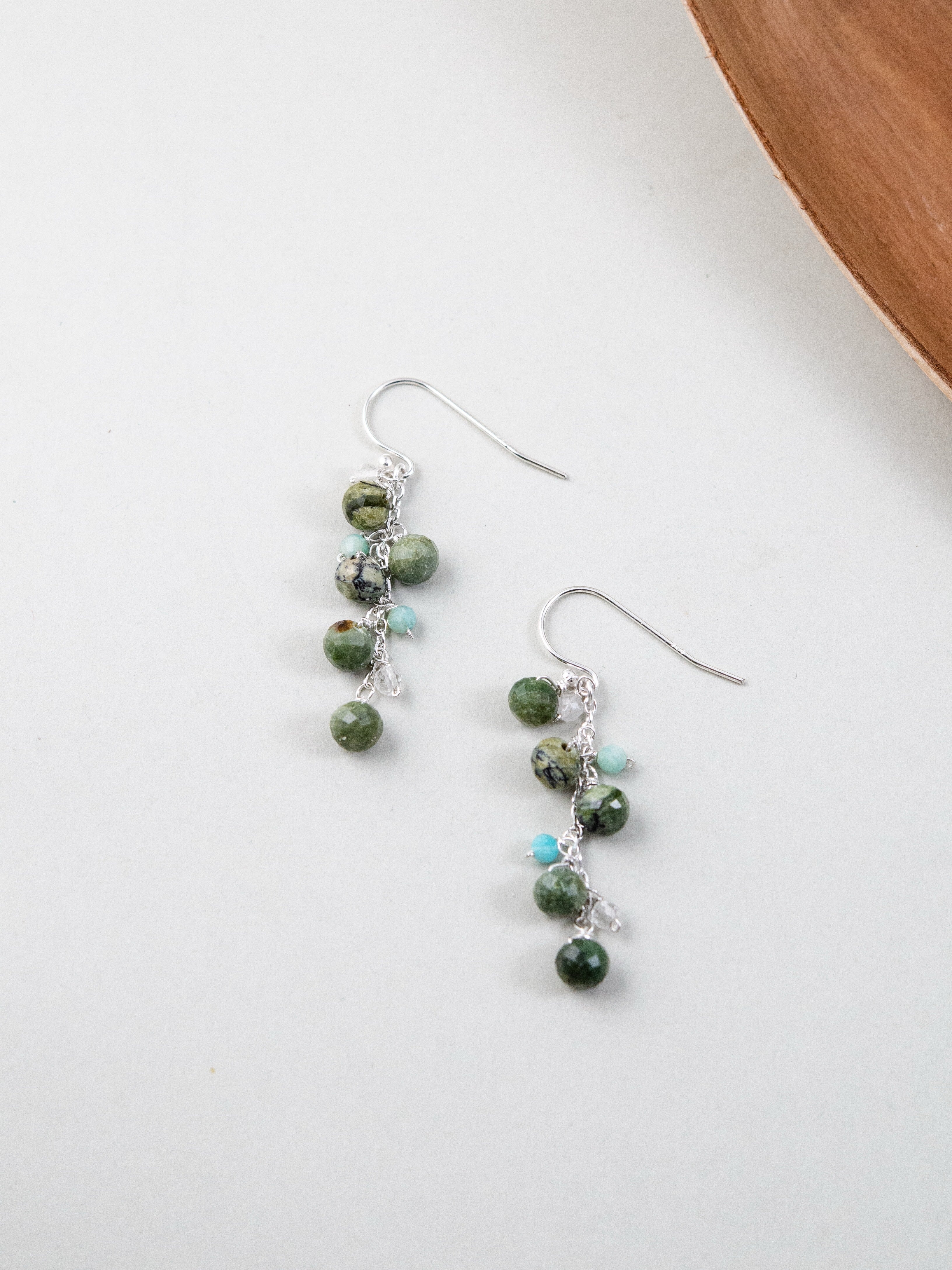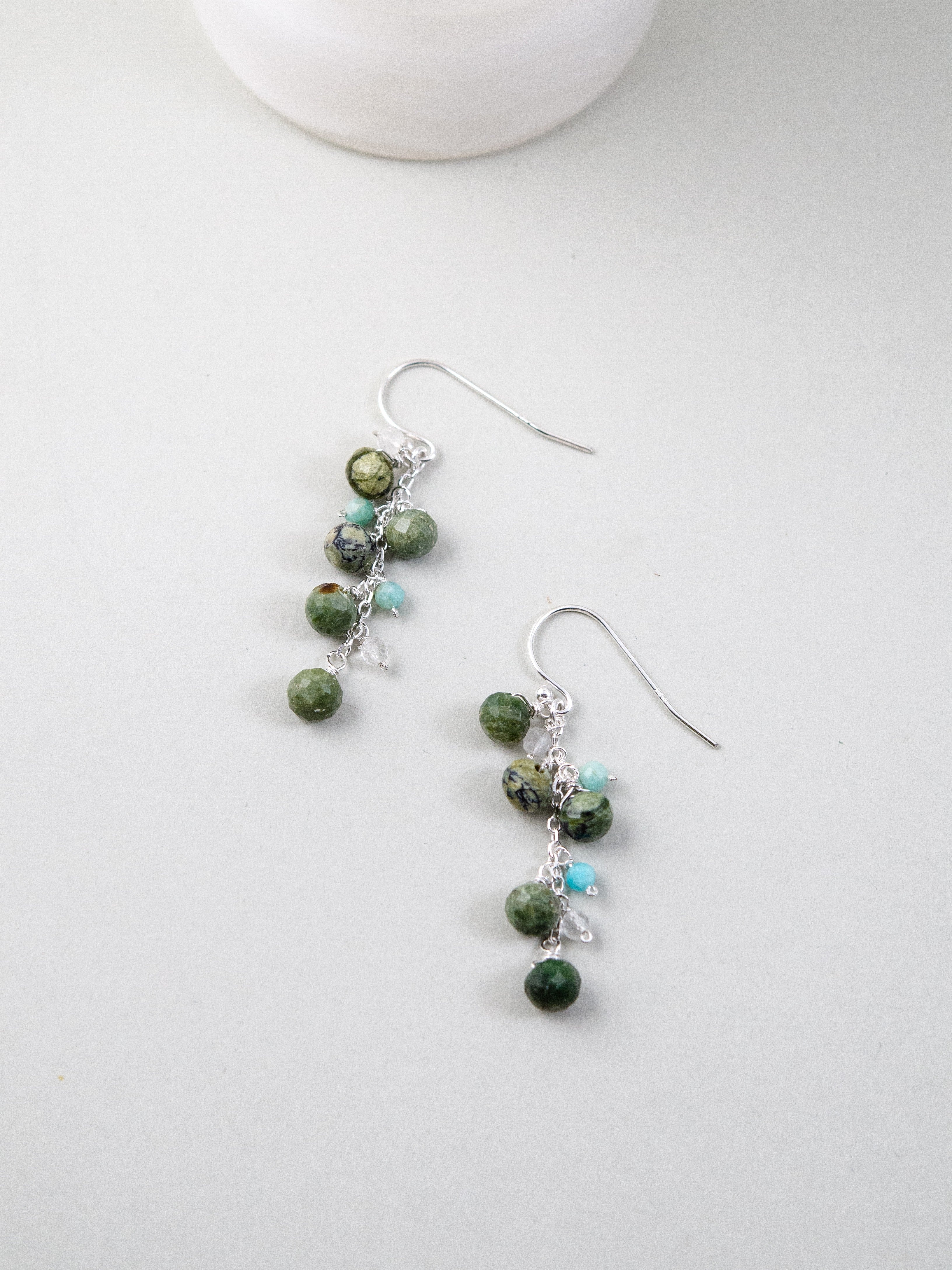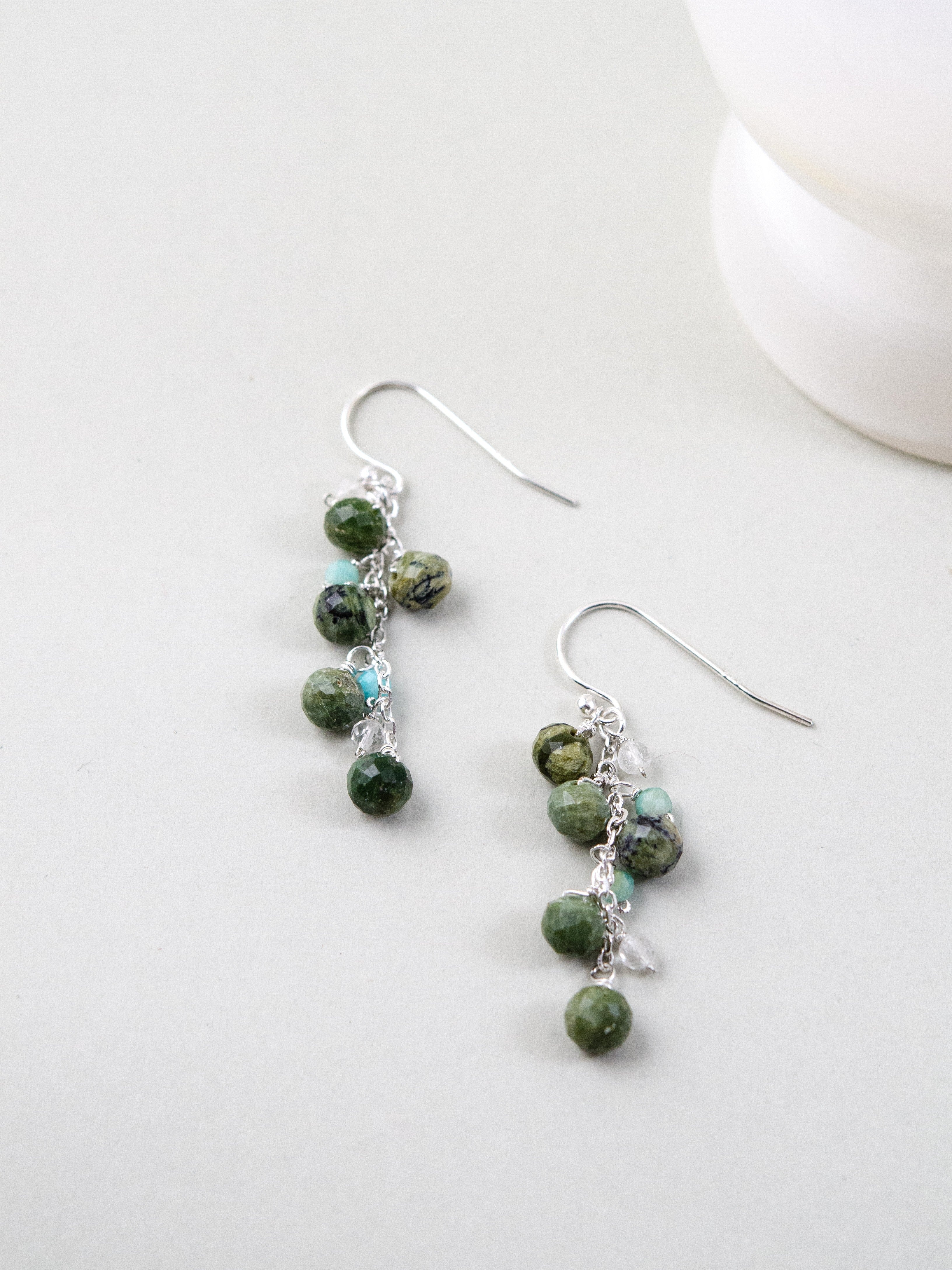 深緑の翡翠が大地のエネルギーを感じさせ、アマゾナイトが柔らかく爽やかな印象を添えます。軽やかに揺れる天然石と水晶の輝きが、日常の中でそっと癒しと華やかさをもたらすデザインです。