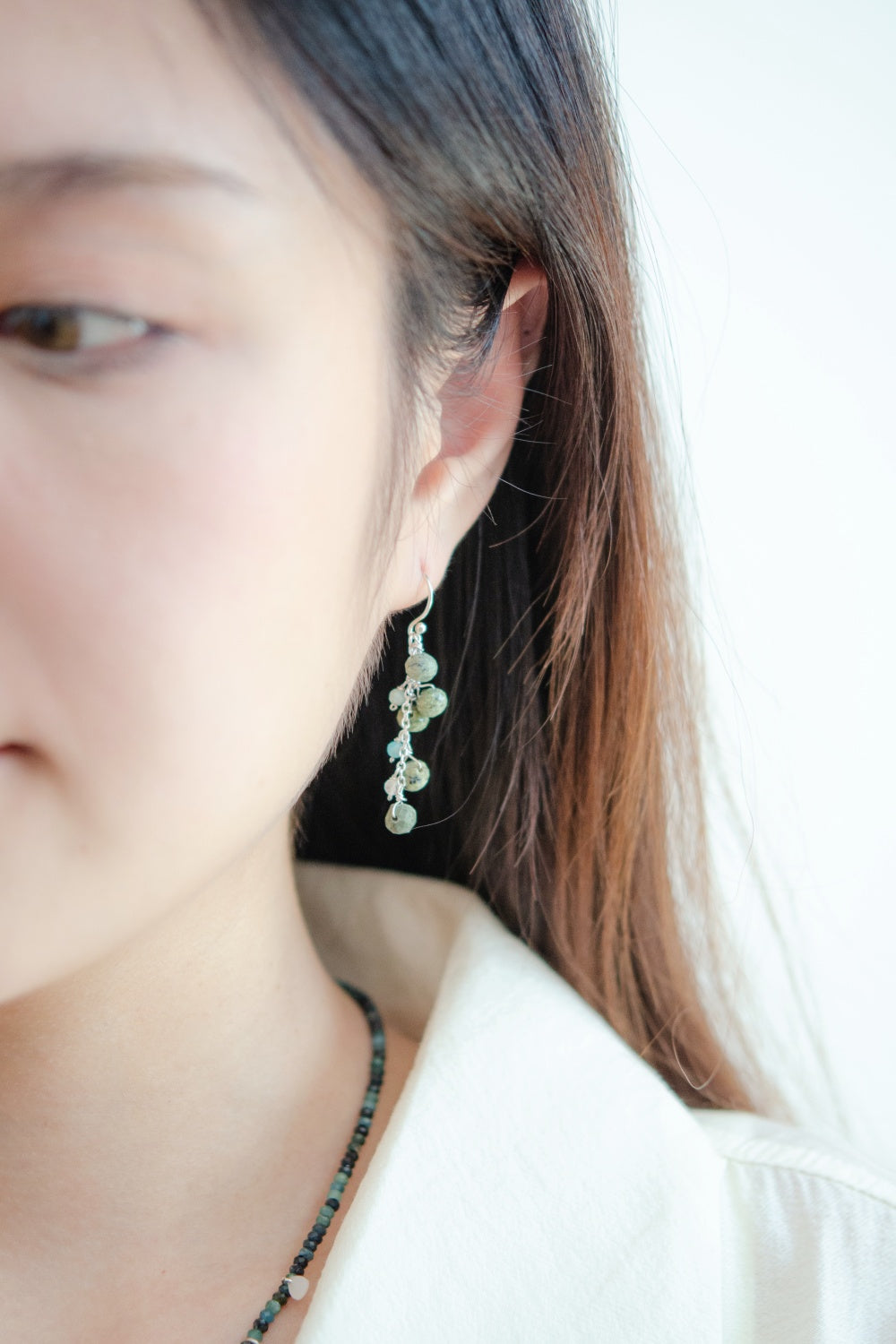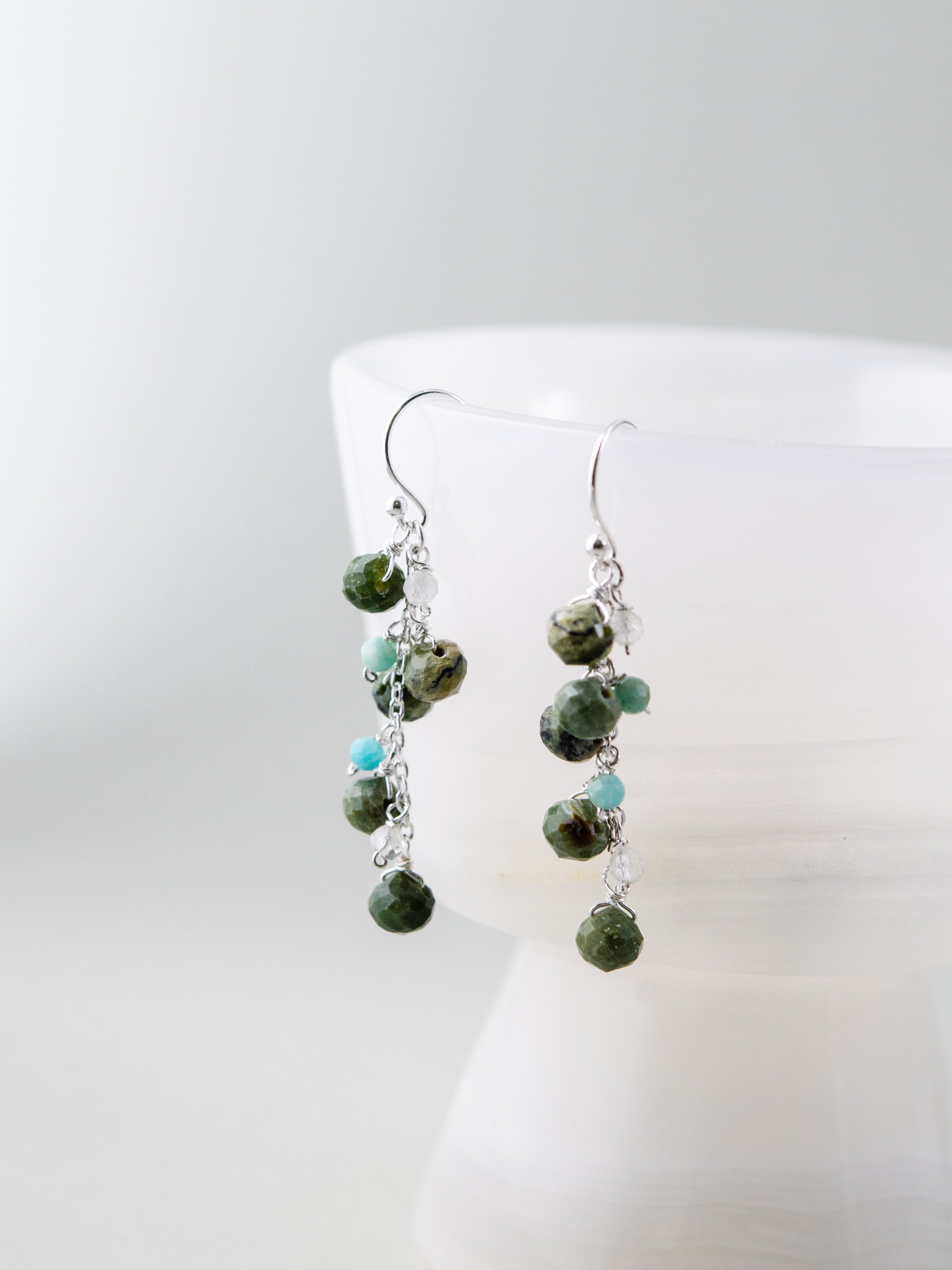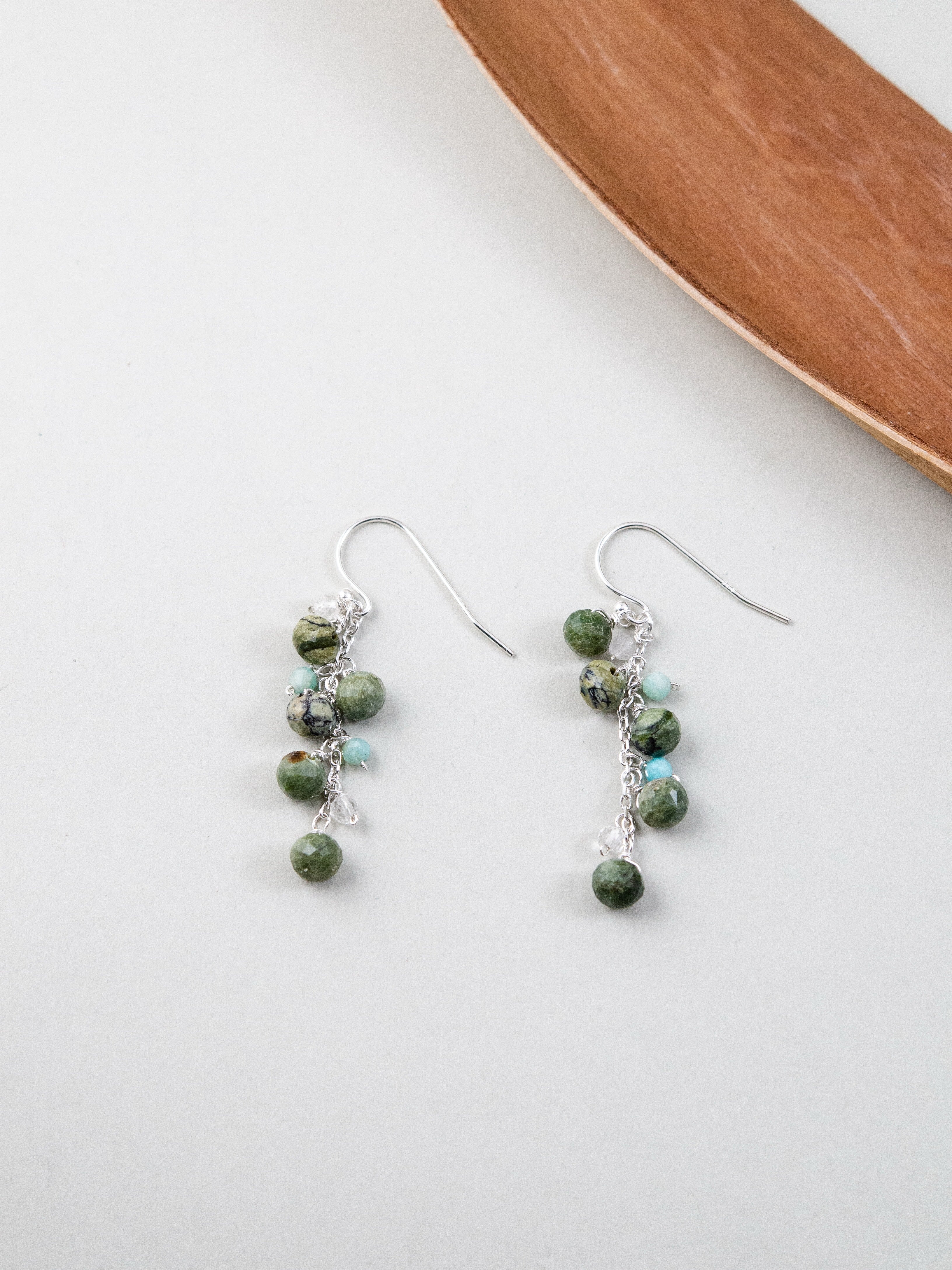 深緑の翡翠が大地のエネルギーを感じさせ、アマゾナイトが柔らかく爽やかな印象を添えます。軽やかに揺れる天然石と水晶の輝きが、日常の中でそっと癒しと華やかさをもたらすデザインです。