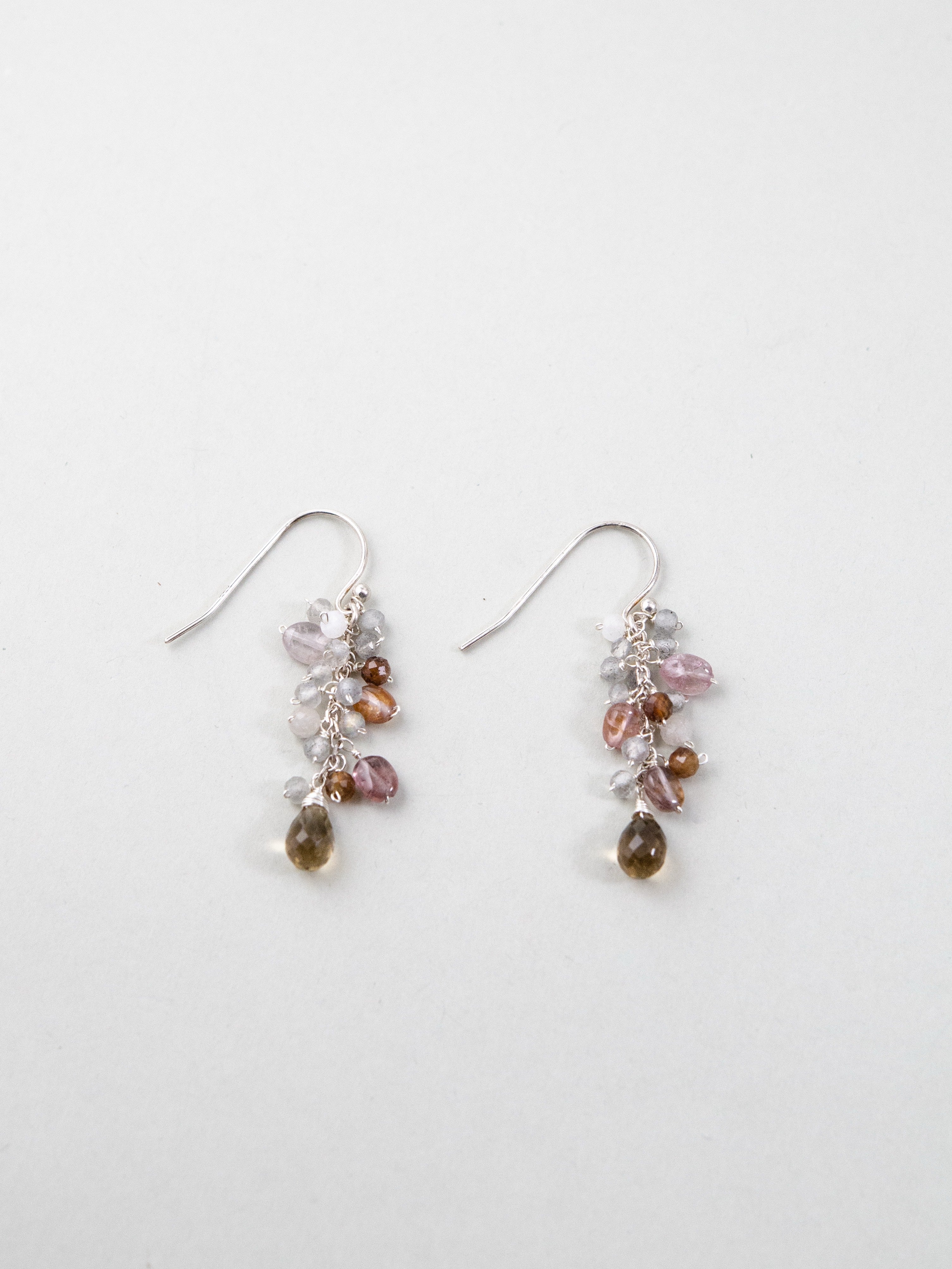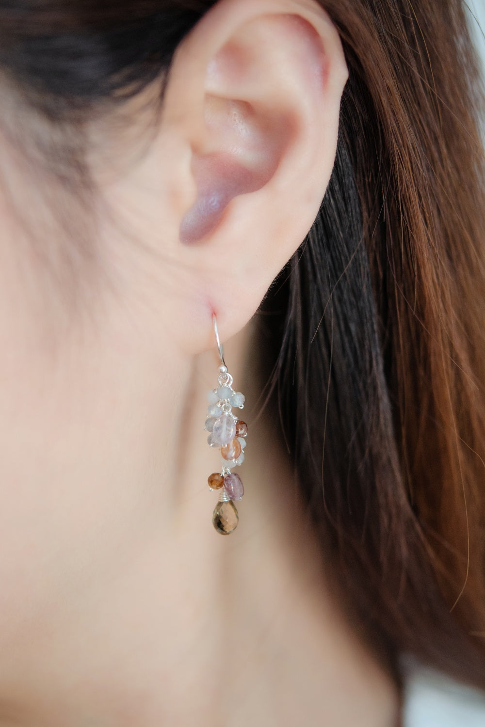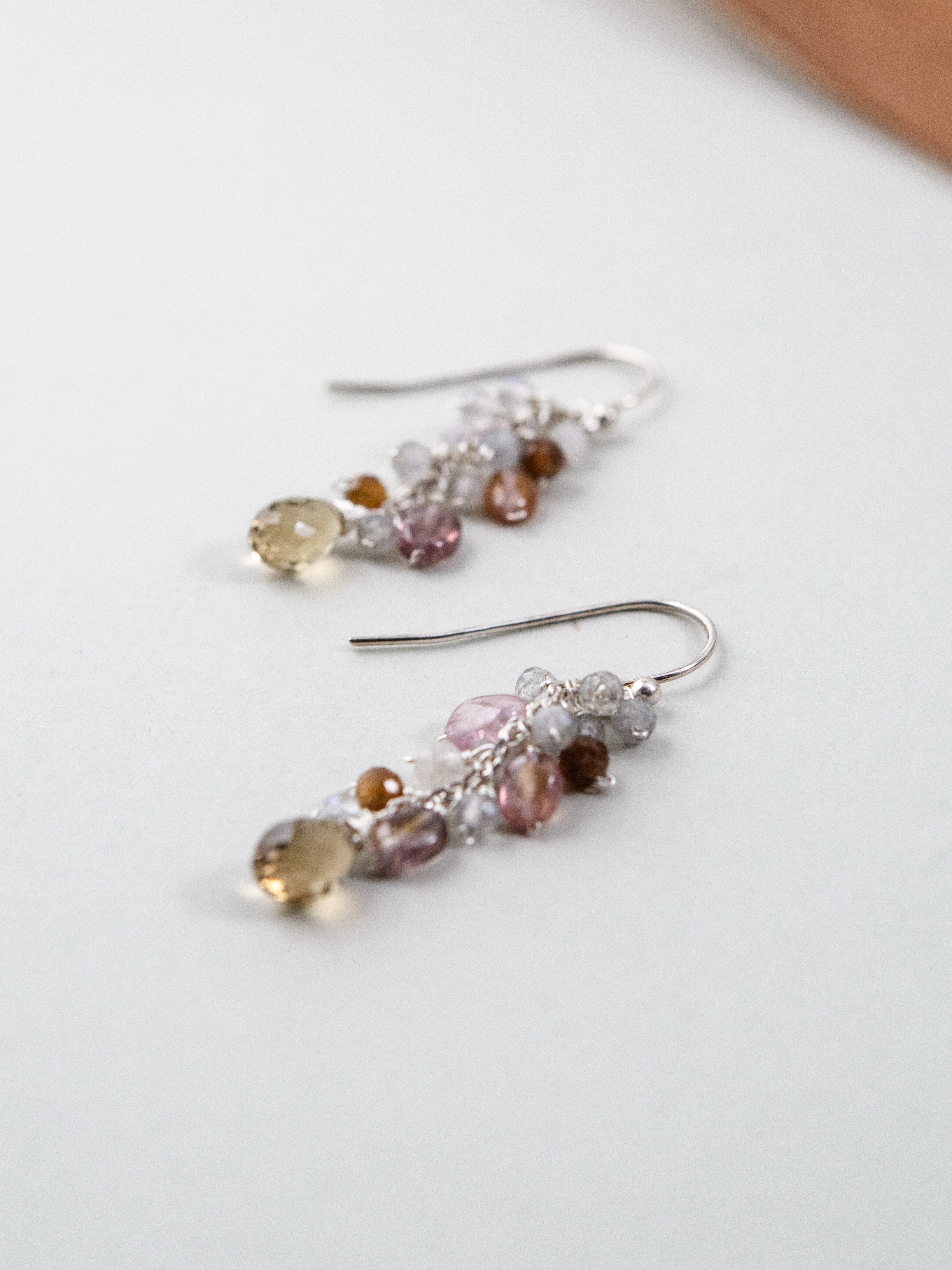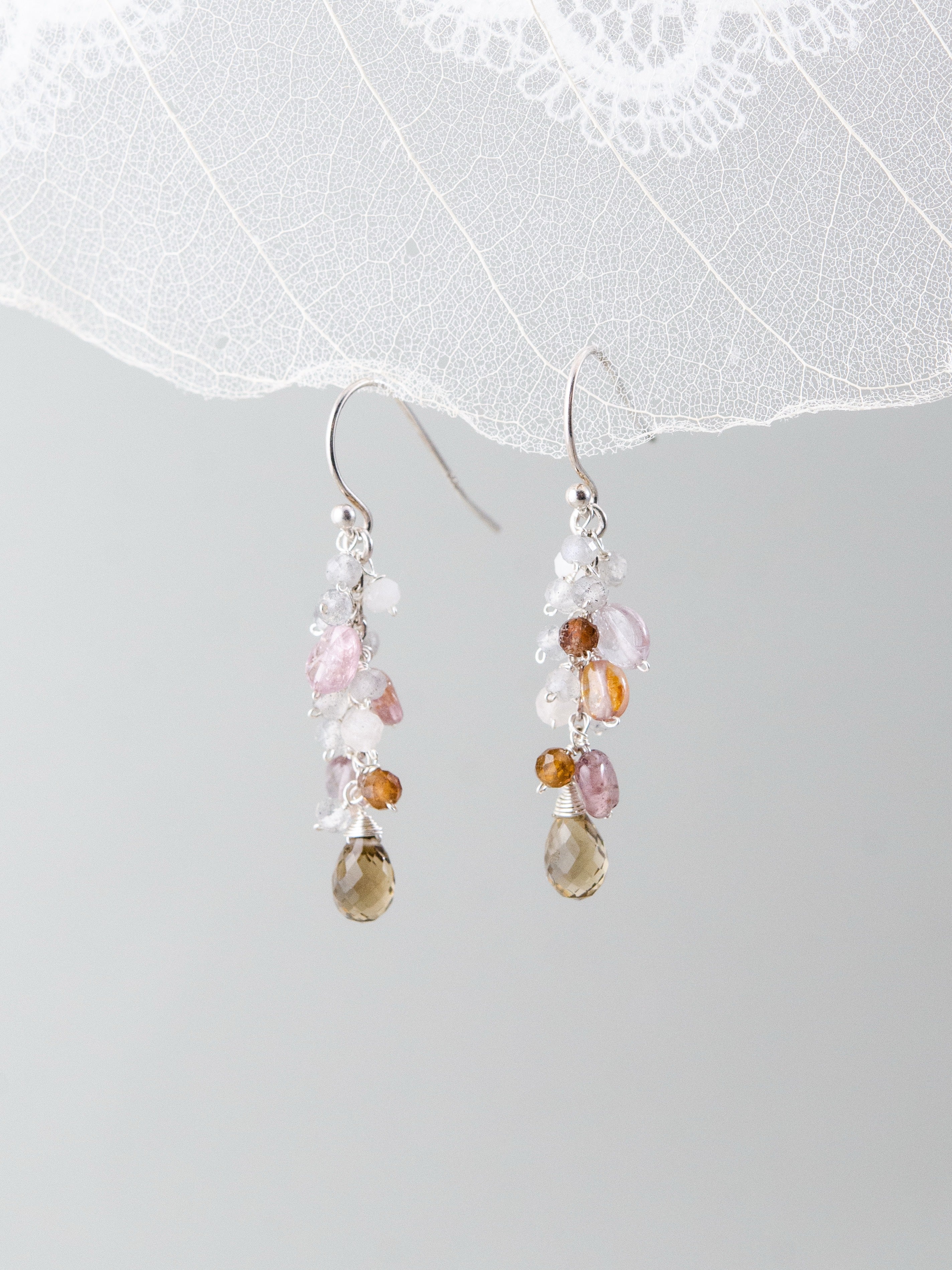 さまざまな色彩を宿すマルチスピネルを繊細なシルバーチェーンに束ねたピアスです。落ち着いたグレージュ、ローズ、キャラメルカラーが調和し、耳元でやさしく煌めきます。角度によって表情を変えるカラーストーンが、日常の装いにさりげない華やかさを添えます。一粒一粒異なる天然スピネルの輝きが、自然な立体感と上品さを演出。