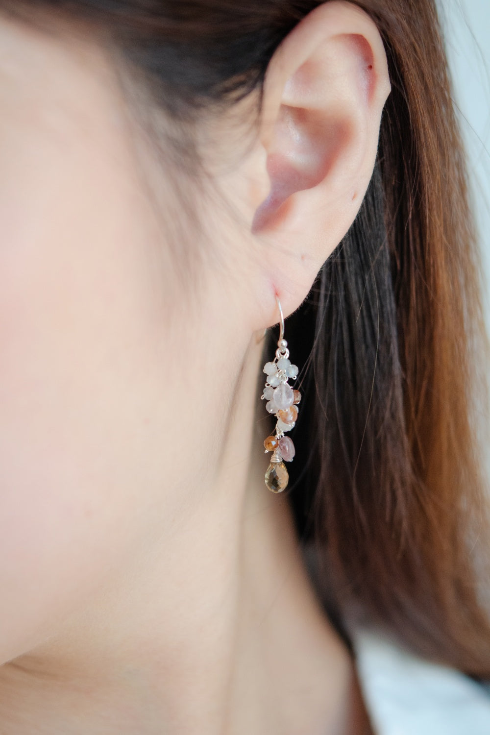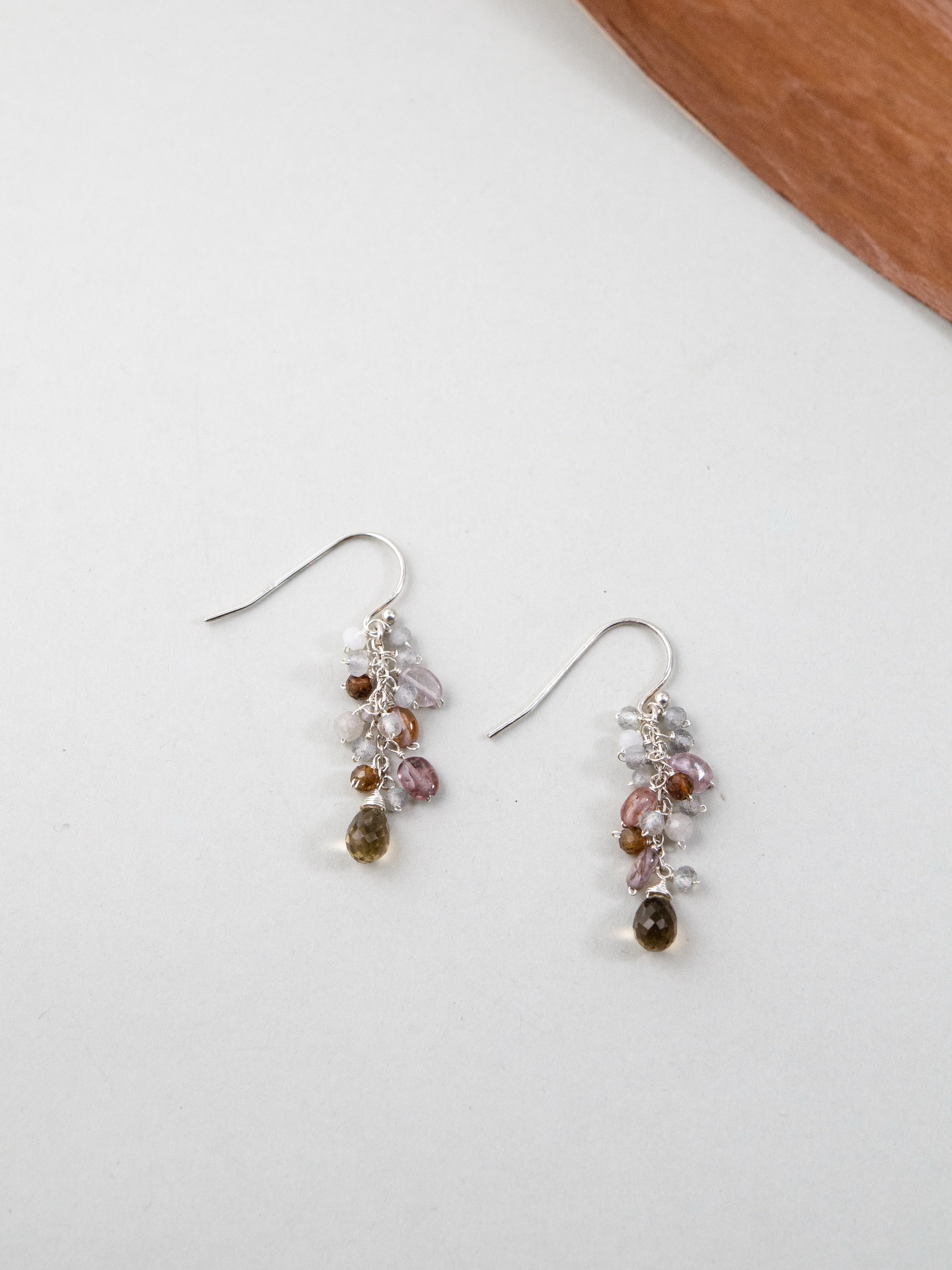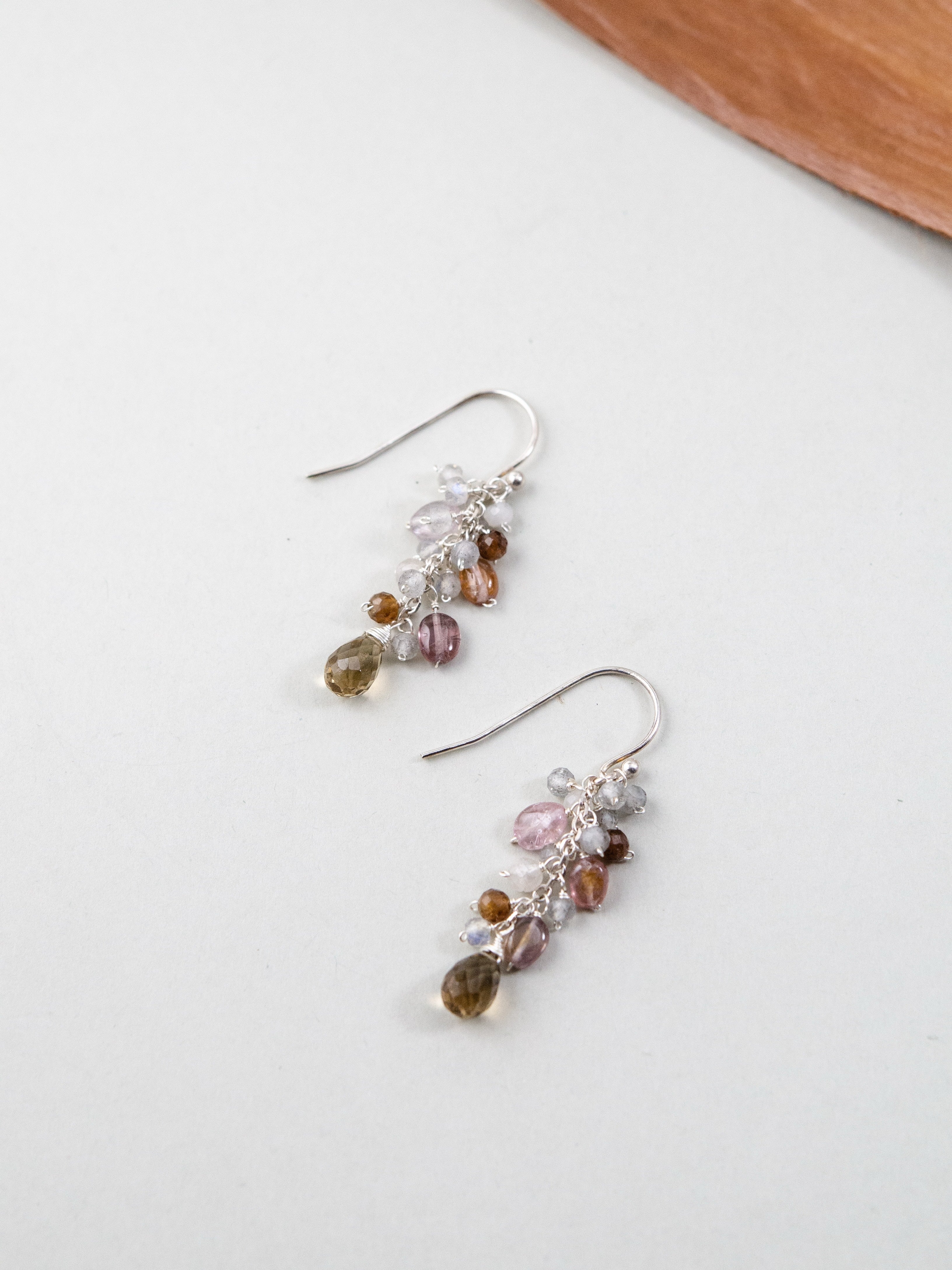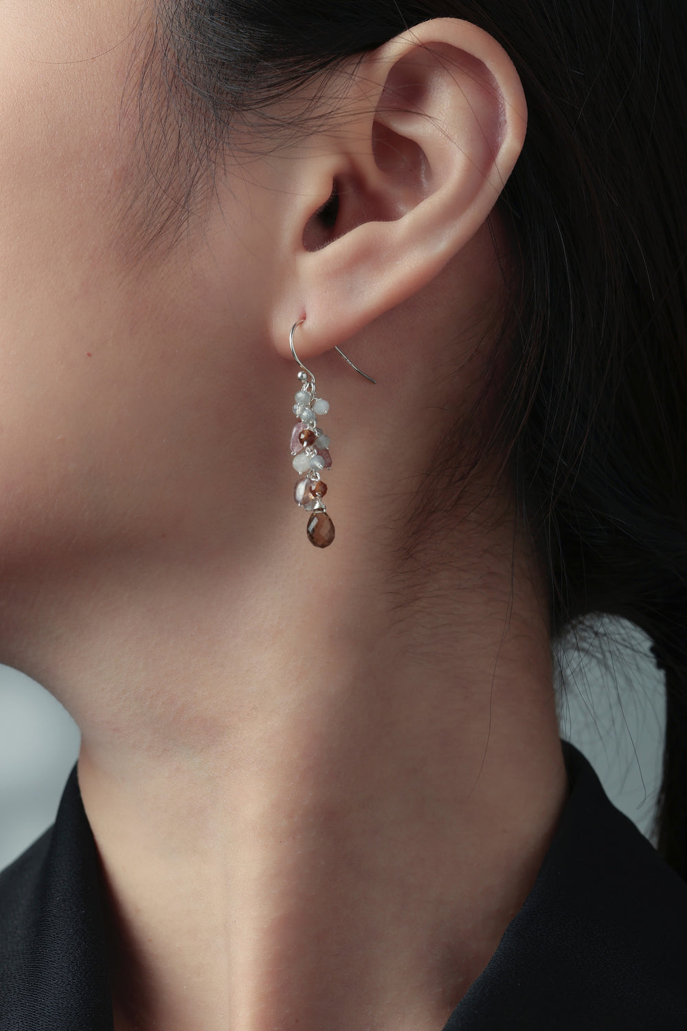 さまざまな色彩を宿すマルチスピネルを繊細なシルバーチェーンに束ねたピアスです。落ち着いたグレージュ、ローズ、キャラメルカラーが調和し、耳元でやさしく煌めきます。角度によって表情を変えるカラーストーンが、日常の装いにさりげない華やかさを添えます。一粒一粒異なる天然スピネルの輝きが、自然な立体感と上品さを演出。