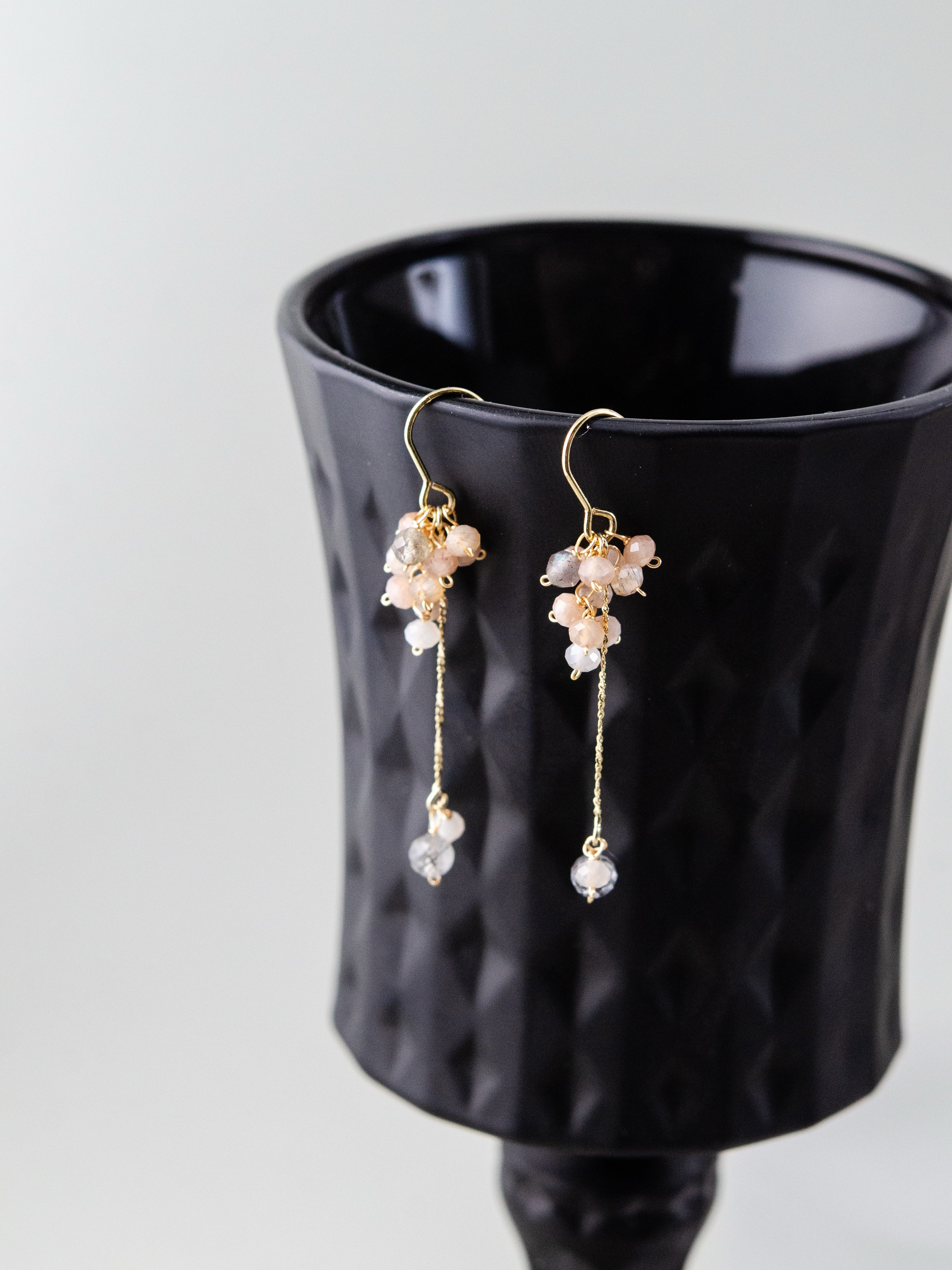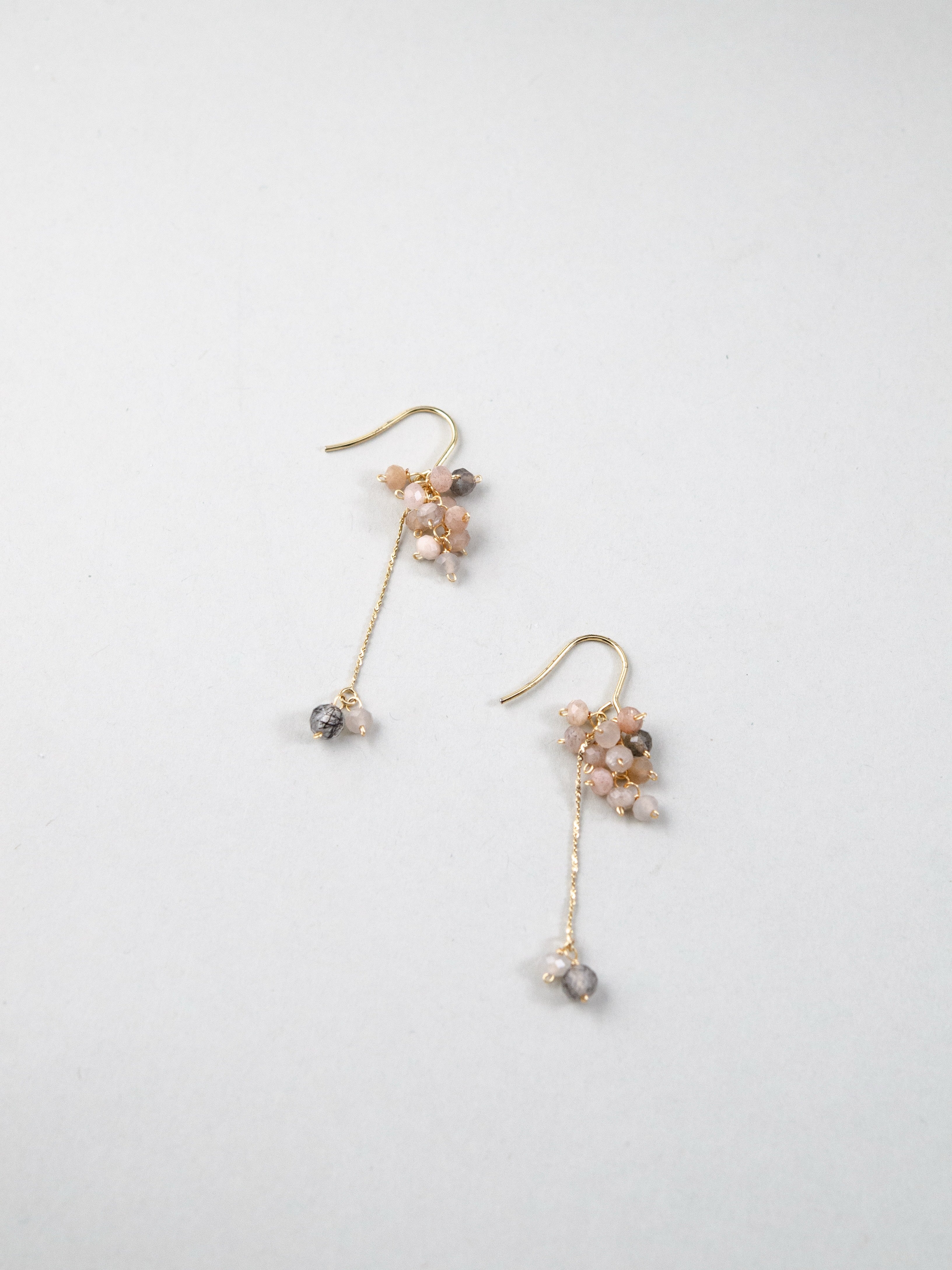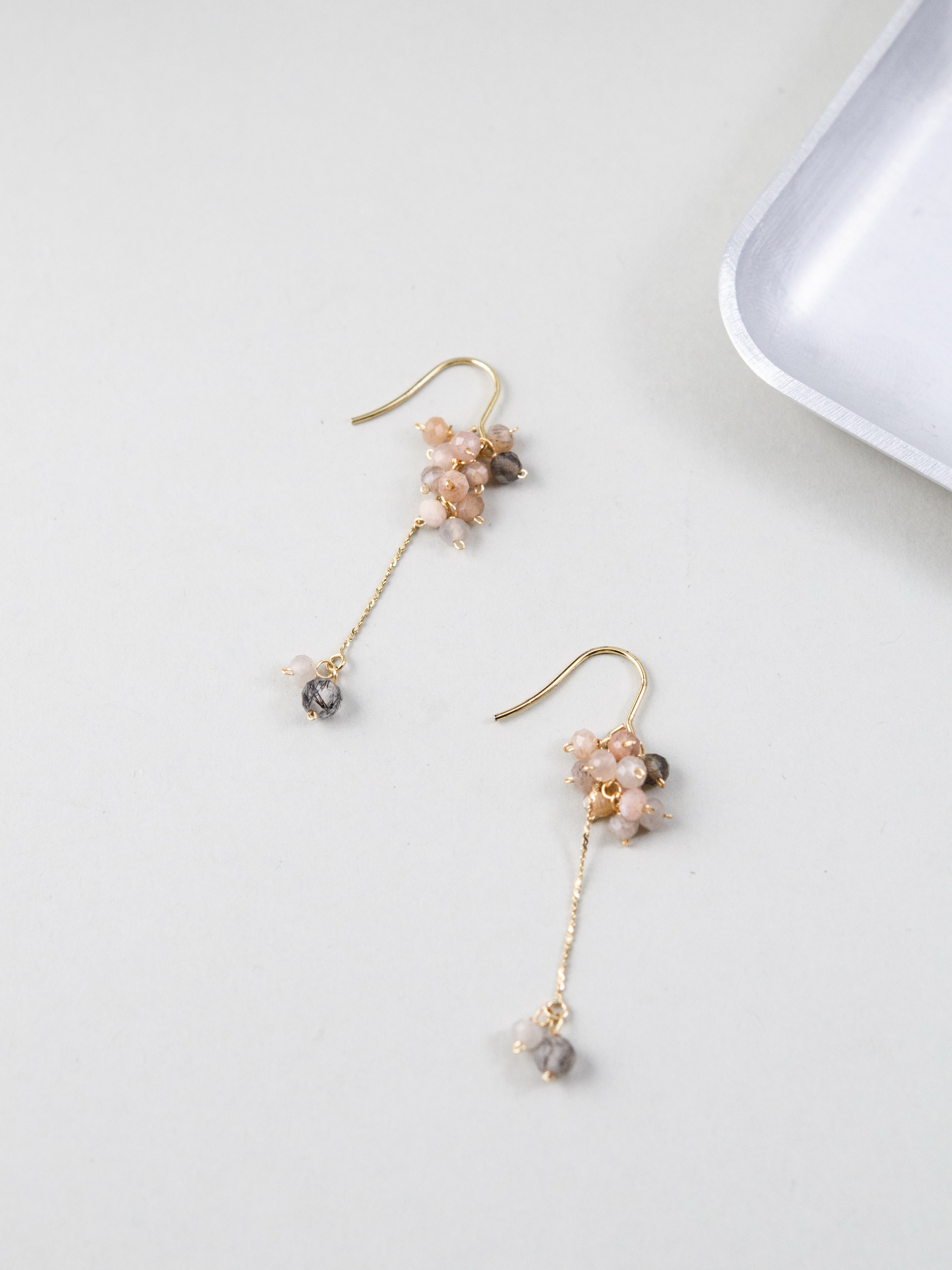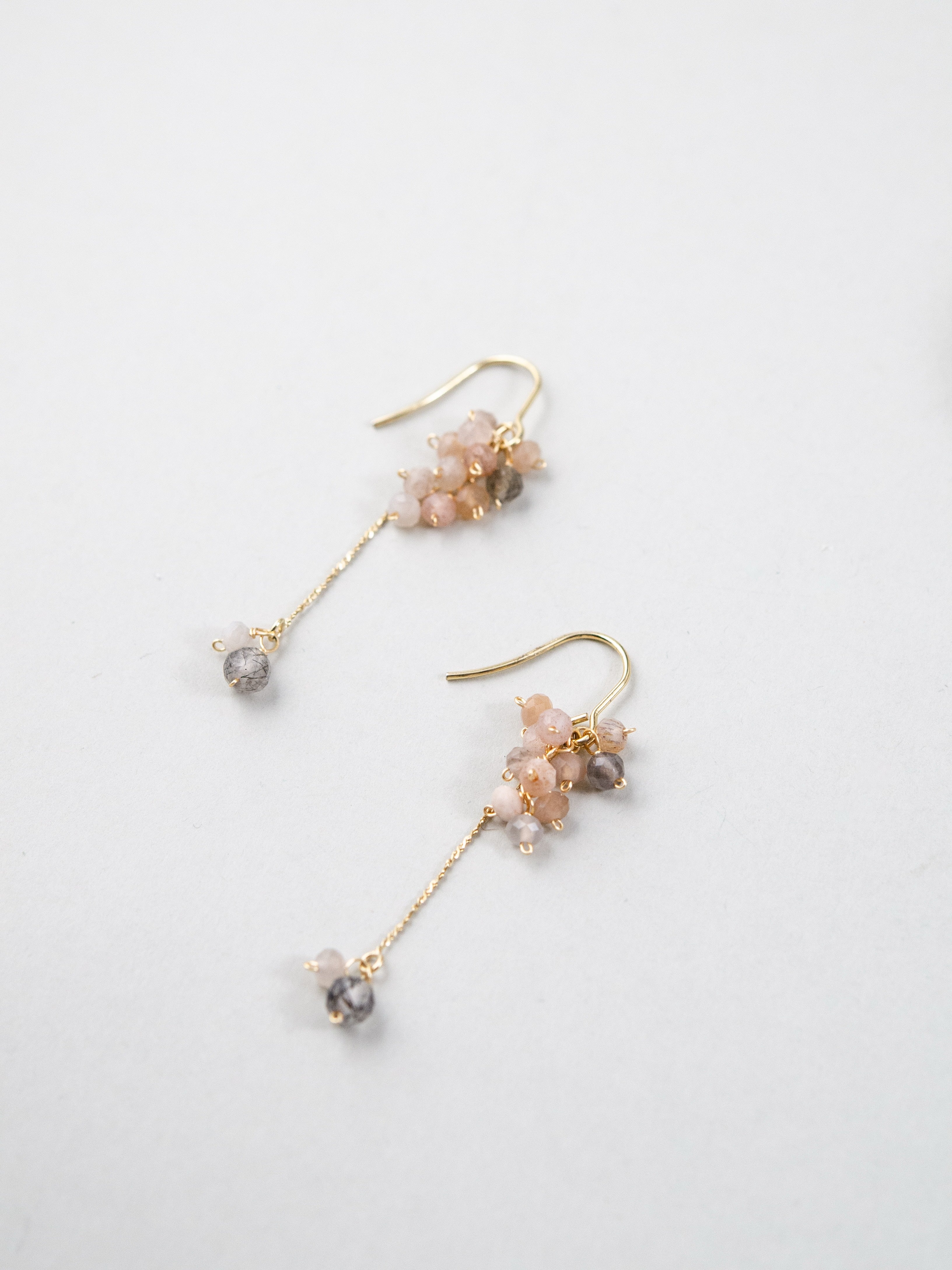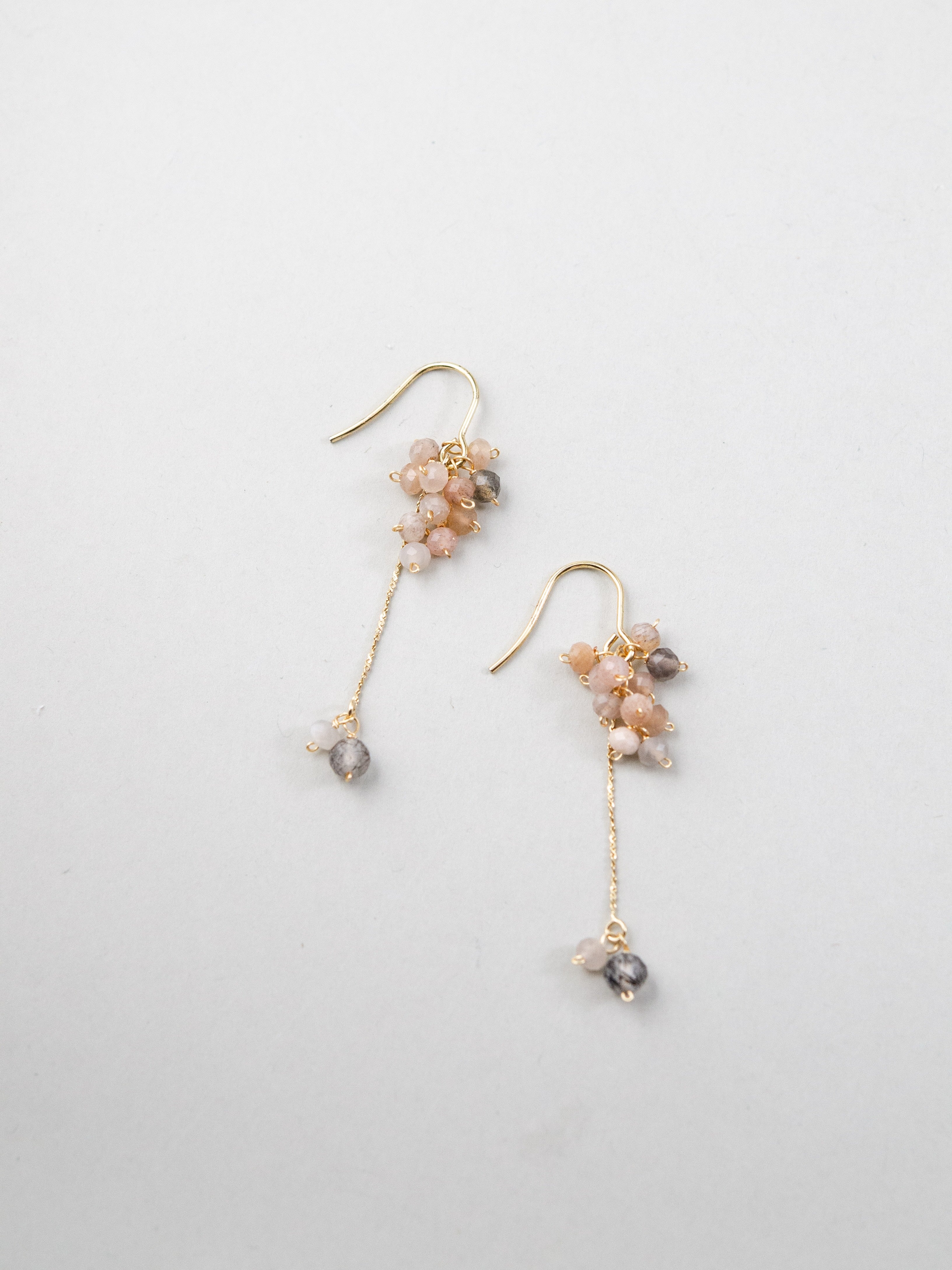 彩りの異なるムーンストーンを贅沢にあしらい、揺れ感のある華奢なチェーンと組み合わせたロングピアスです。光の角度によってふんわりと変化する天然石の表情が耳元でやさしく輝き、繊細でフェミニンな印象を演出します。感情を整えるとされるムーンストーンを使用し、肌なじみの良いピンク・グレーの柔らかなカラーでまとめました。
